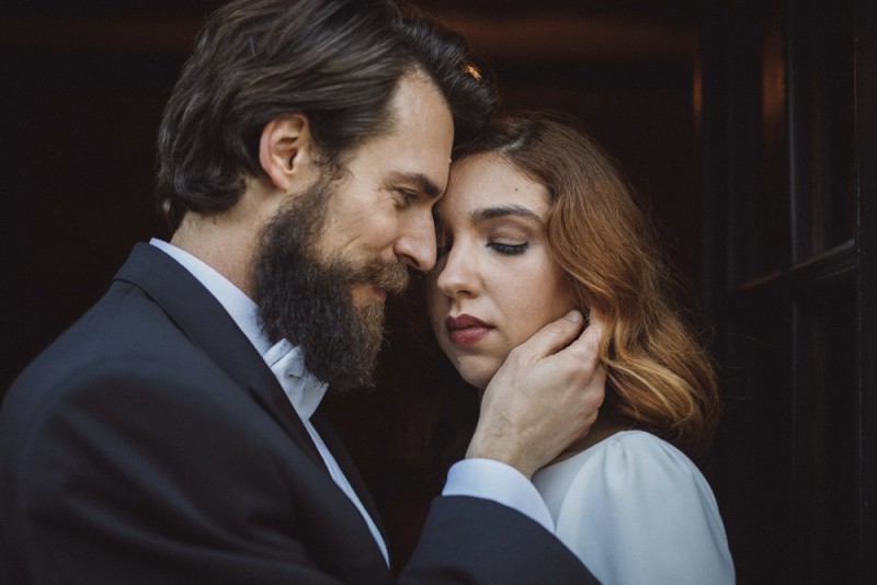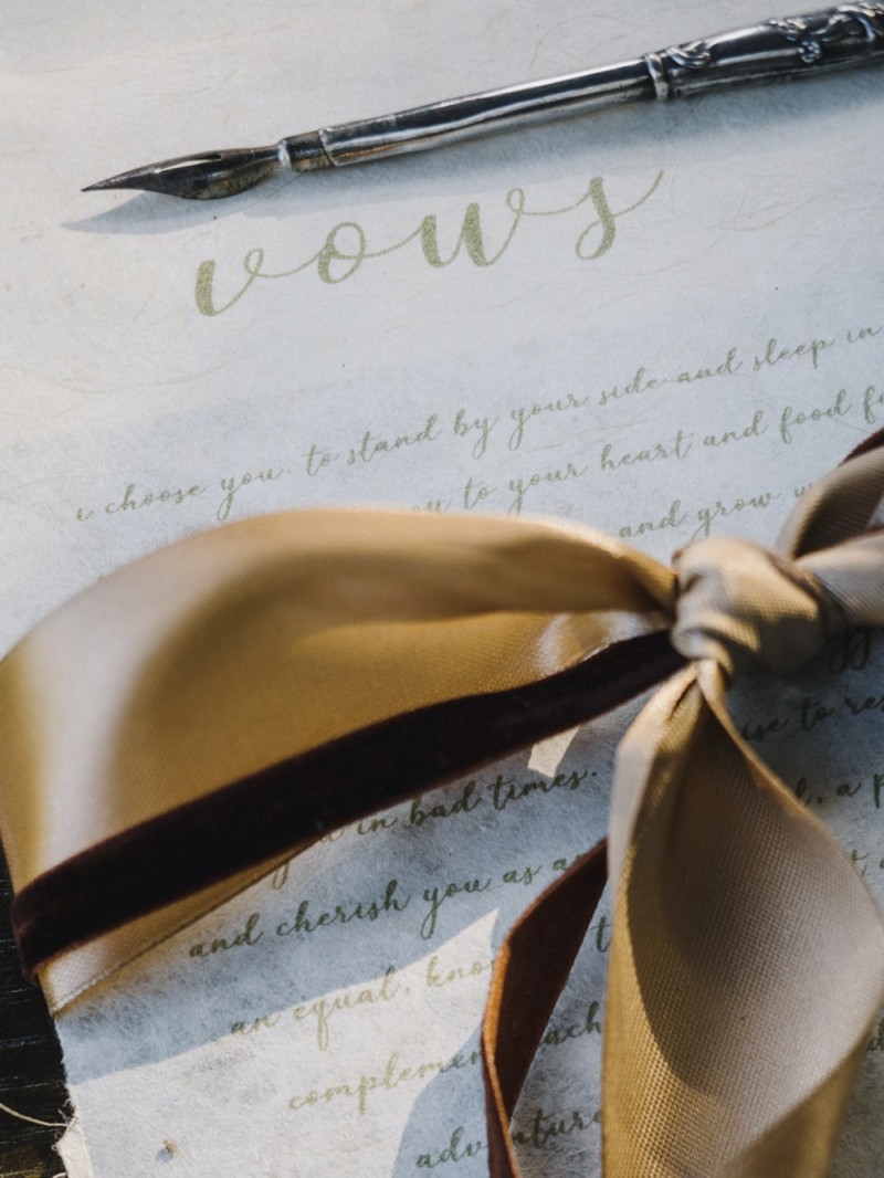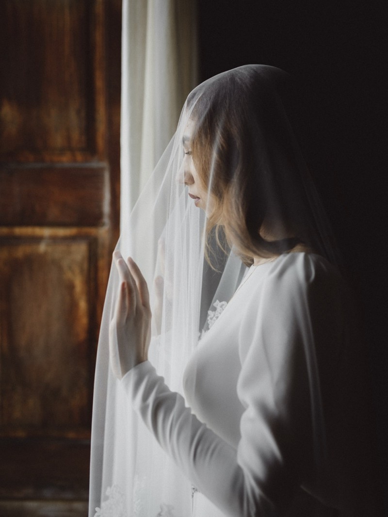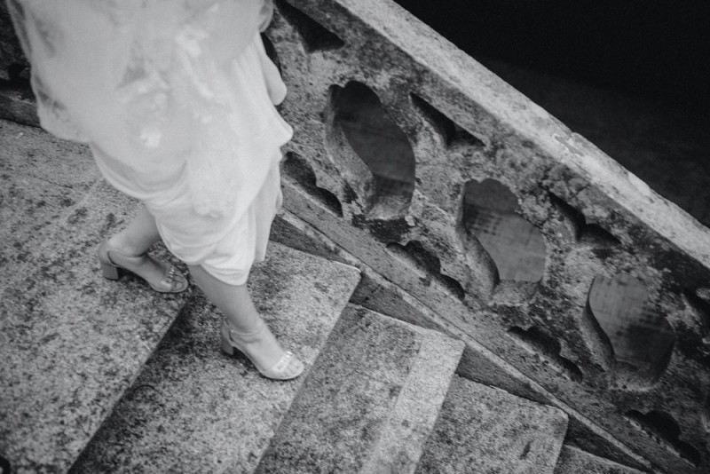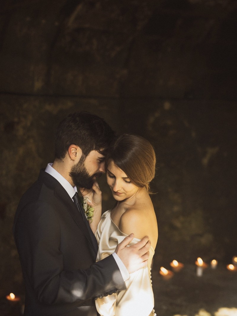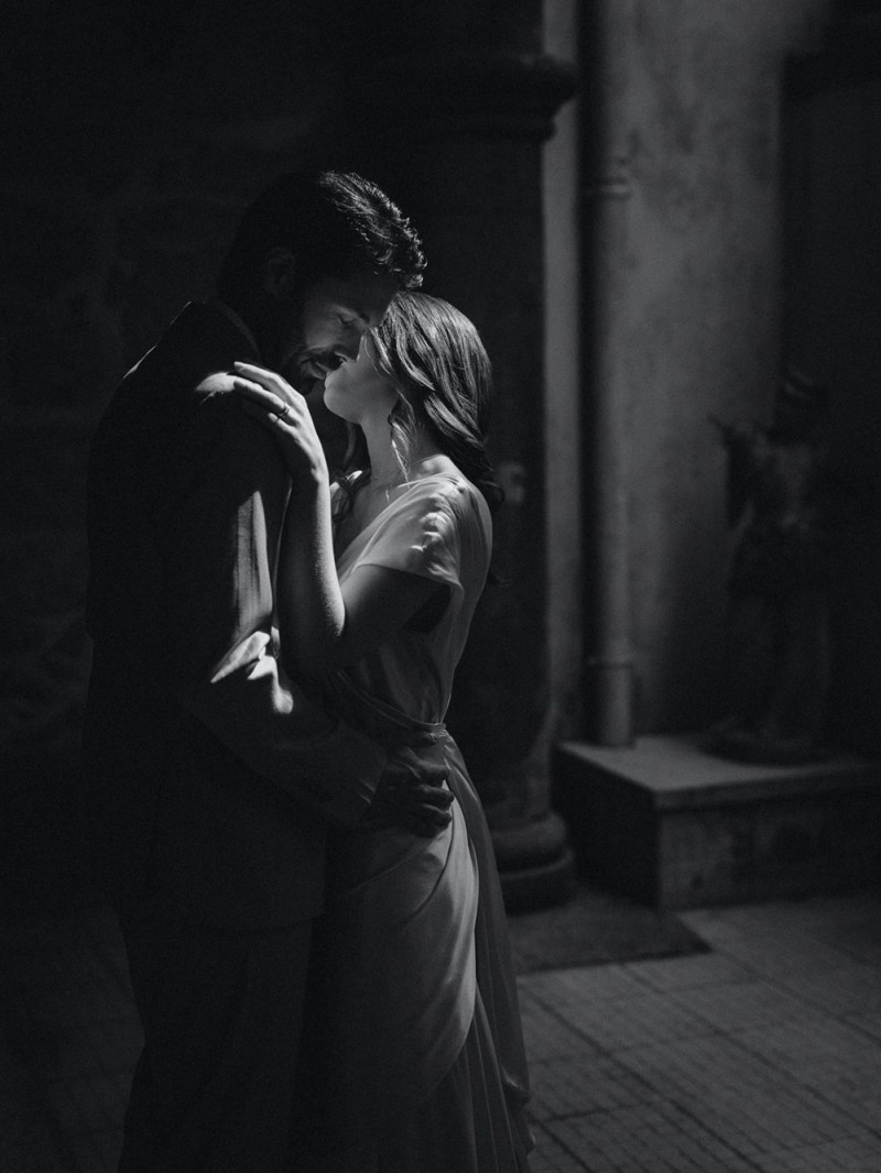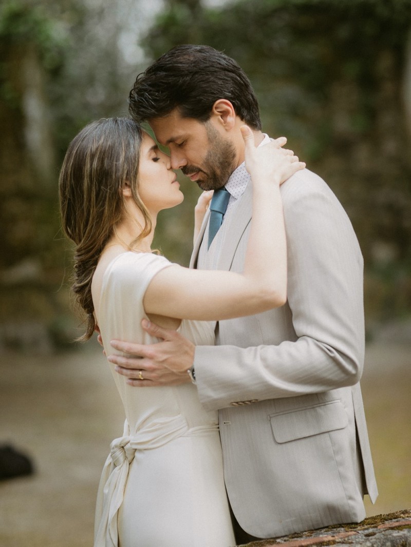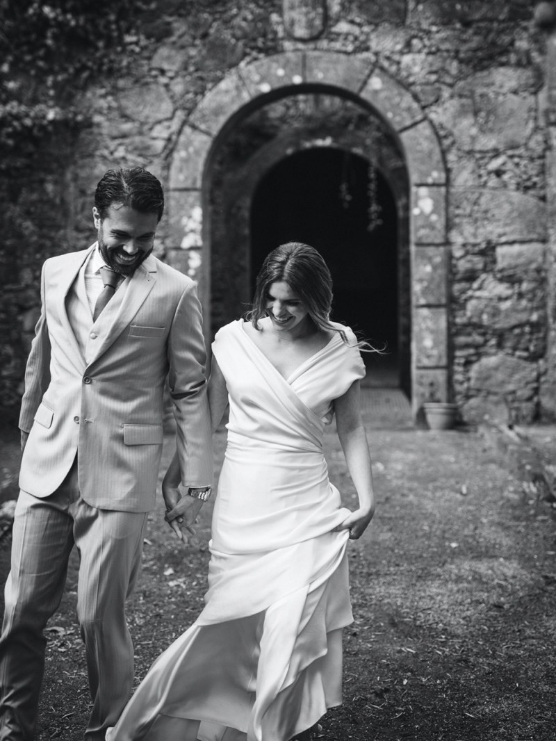 Eine kleine traditionell gepflasterte portugiesische Straße. Entlang hoher Steinmauern und Olivenhainen, führt uns der Weg zum Castelo de Portuzelo an kleinen Kapellen einer jeden Kreuzung vorbei. Schon aus der Ferne kann man den Wachturm des Schlosses erkennen. Der Manuelinische Stil, ein Mix aus Gothik und Renaissance, mit Elementen aus dem 12. bis 19. Jahrhundert, lässt erahnen, wie geschichtsträchtig dieser Ort ist. Diesen besonderen Stil der Location herauszukitzeln und den rustikalen Glamour in Szene zu setzen, das ist dem Hochzeitsplaner-Team der Cracha Wedding Agency, in dieser Hochzeitsinspiration im Norden Portugals, perfekt gelungen. Fotografiert wurde diese Hochzeitsinspiration vom Hochzeitsfotografenpaar Vivid Symphony. Sie haben das hübsche Brautpaar durch die hellen Hallen des Schlosses, entlang des verwachsenen Mauerwerks, einem Springbrunnen aus dem 16. Jahrhundert, und in den opulenten Garten, begleitet. Hier, umgeben von Zypressen, Palmen, Feigen, Zitronen, Orangen und Oliven, feierten sie eine intime glamourös-rustikale Landhochzeit, zu der wir uns nun träumen dürfen. Die Cracha Wedding Agency setze passend auf edles dunkles Holz und kombinierte es zu glänzendem Gold. Das feine Kristallgeschirr und das gravierte Besteck in Gold greift dabei den königlichen Charm auf, den auch das Schloss versprüht. Die zarte Hochzeitspapeterie, in gebrochenem Weiß, mit goldener Schrift und gerissenen Kanten vereint diesen mit zarter Romantik. Eukalyptus, Rosen in Gelb und zartem Lila, sowie weiße Astilben, gebleichter Ruscus und weiße Ranunkeln führen diesen Stil sowohl im Tischbouquet, als auch im Brautstrauß fort. Zuletzt sogar als Tortendekoration auf der wunderschönen goldenen Hochzeitstorte von Bakewell. Doch bevor das Brautpaar von dieser Torte kostete und an diesem gedeckten Tisch Platz nahm, genoss es die intimen Stunden in den verwinkelten Gängen und versteckten Gärten des Schlosses. Jedoch nur bis die Braut in ihr elegantes und zeitloses Brautkleid von Cortana via granvia3 schlüpfte, um ihrem Bräutigam, beim herabgehen der steinernen Stufen, den Atem zu rauben. Ihre Brautschuhe von Crème Caviar Shoes trugen sie dabei sicher hinab, während ihr Gesicht unter dem tollem Brautschleier verhüllt war. Ihr Hair & Makeup für diesen zeitlos schönen Brautlook kreierte Matilde Ribau. Ob in den lichtdurchfluteten Schlosshallen, dem weitläufigen Garten oder in einer der verwachsenen Hofecken – wer bleiben mag ist herzlich dazu eingeladen! Genießt es!
