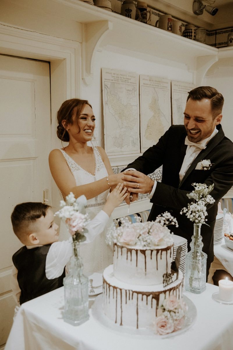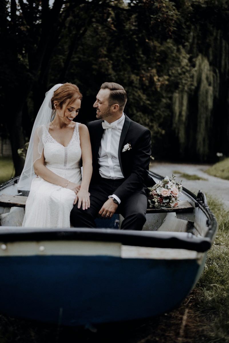 Die Bande: „In der Corona-Saison gab es 2020 auch einige außergewöhnliche Momente für uns – wie die Trauung von Lena und Malcolm. Die beiden haben sich beim Auslandssemester in Spanien kennengerlernt und verbinden wahnsinnig viel mit Barcelona. Sie haben auch sehr viele ehemalige Studienfreunde dort, die auf Grund von Corona nicht zu ihrer Hochzeit anreisen konnten. Für das Brautpaar ist eine Welt zusammengebrochen. Da haben wir uns mit ihren Trauzeugen eine Überraschung überlegt! Wir haben spontan ein Ritual in die Trauung eingebaut: einen hübschen Vintage-Briefkasten, in den jeder Gast eine Postkarte mit guten Wünschen für die Ehe einwerfen konnte – und auch aus Barcelona kamen Karten mit Herzenswünschen von ihren spanischen Freunden, die Lena und Malcolm dann sehr gerührt zu den anderen Wünschen in den Postkasten warfen!“