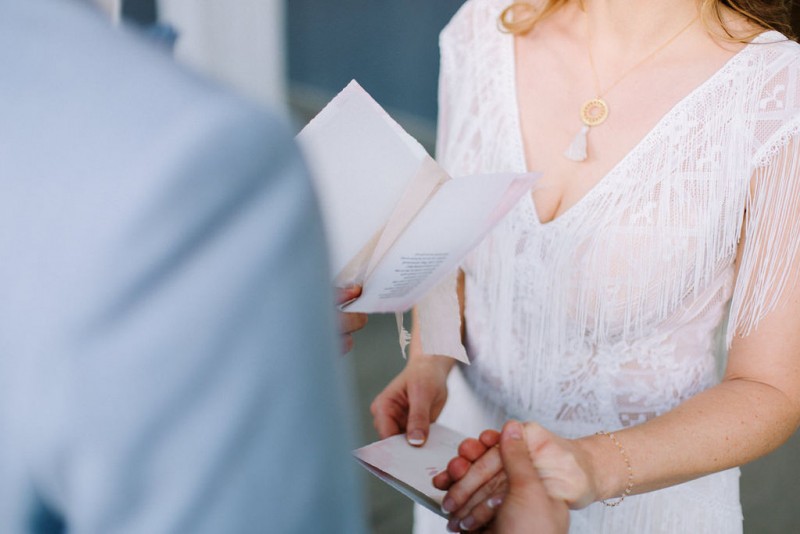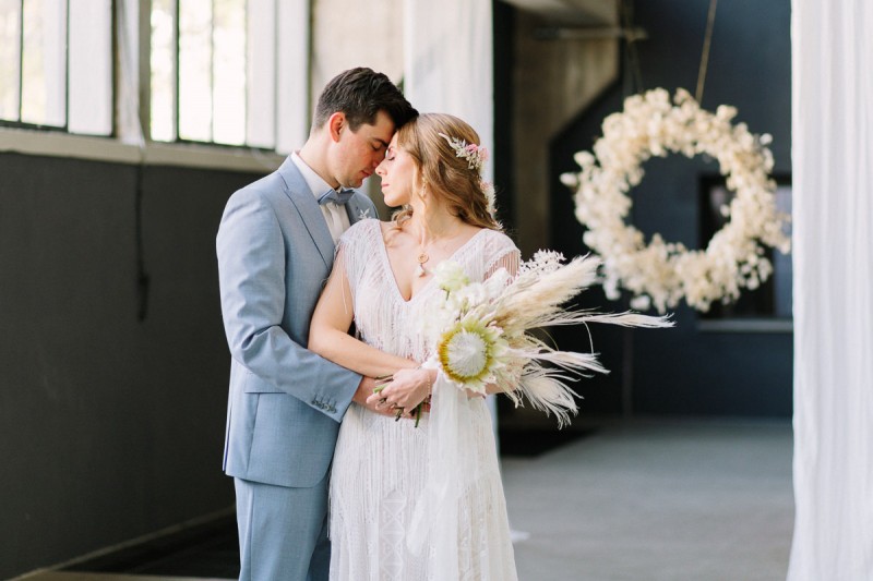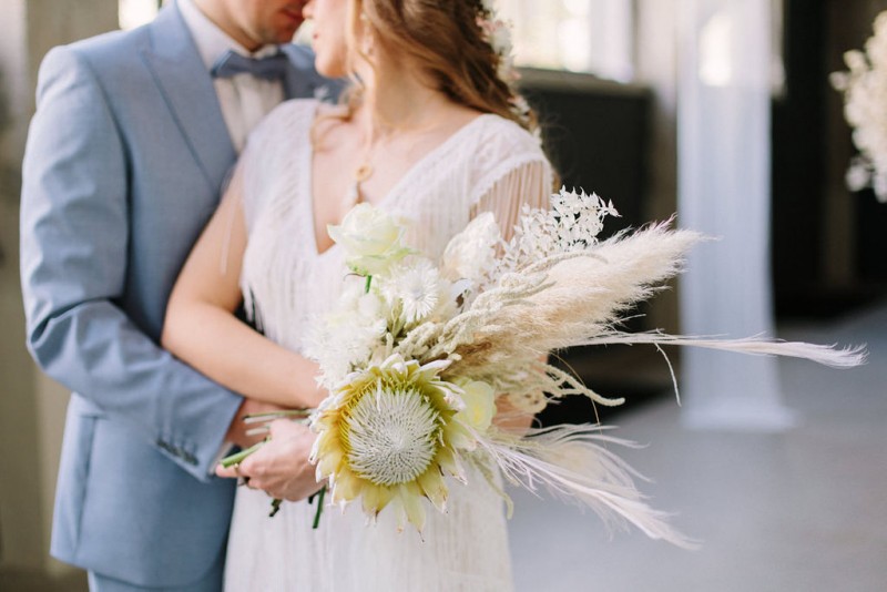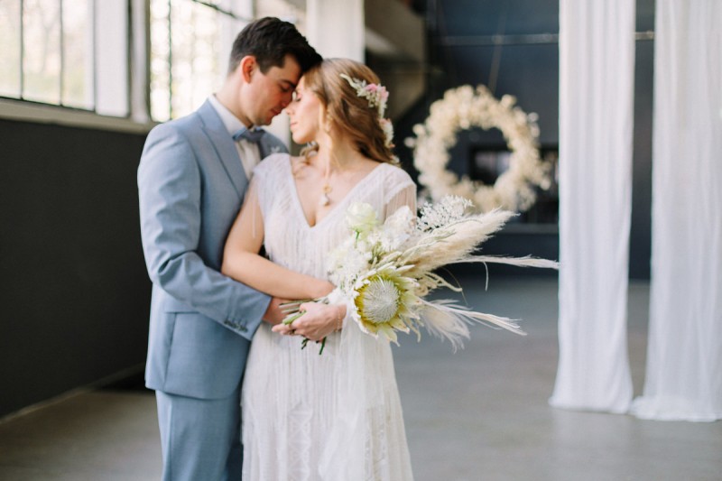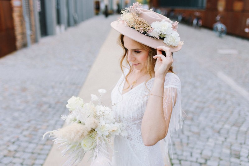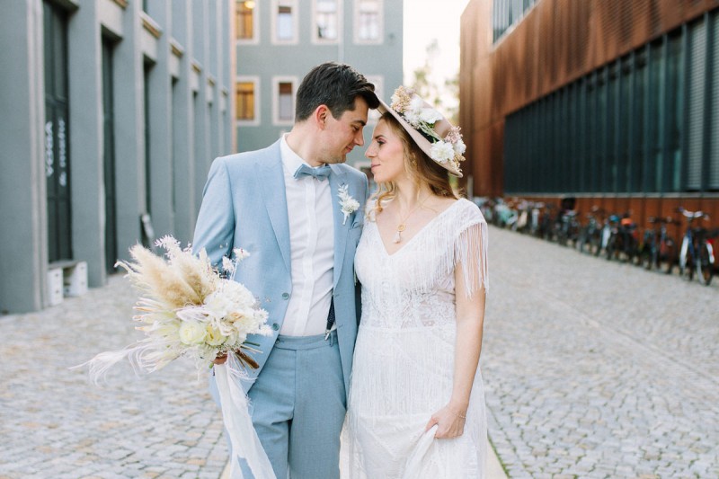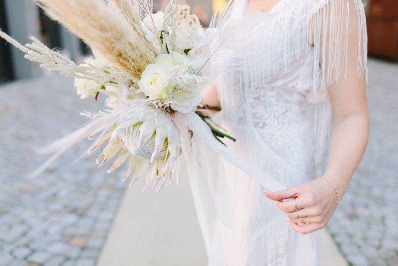 Wilde Bohovibes, puristischen Industrialzüge und die feine Inszenierung im Fine Art Wedding Stil. Genau das erwartet euch heute in dieser wunderschönen Hochzeitsinspiration. Fotografiert von Hochzeitsfotografin Julia Sloboda und geplant von marrylight wedding & events, findet ihr ein zuckersüßes Brautpaar vor, das in der Kunsthalle in Dresden einen romantischen Tag genießen durfte. In dieser rauen Industrial Location finden sich ganz viele feine Details in zartem Weiß, Gold und Creme. Fließend, pur und liebevoll inszeniert, entsteht ein einmaliger Kontrast, der im edlen Fine Art Wedding Stil gestylt und fotografisch festgehalten wurde. Die hübsche Braut Theresa trägt hier ein langes, zart fließendes Brautkleid mit feinen Stickereien und bezaubernden Fransendetails. Dieses ist ein Brautkleid vom polnischen Label Gala Suknie Ślubne, das das Brautmodenatelier JUNIKA gestellt hat. Dazu trägt sie goldene Brautschuhe von Rachel Simpson, ebenfalls zu finden bei JUNIKA. Ein zarter und zugleich edler Brautlook, der durch das wunderschöne Hair & Makeup, ebenfalls kreiert von JUNIKA, perfekt abgerundet wird. Ihre Augen werden durch die leichten Smokey Eyes in einem rot-blush Ton betont und verleihen ihr einen frischen aber dennoch natürlichen Look. Die Haare wurden locker nach hinten frisiert und geflochten. Durch kleine Blumendetails in diesem Flechtzoff wird ihr ein besonders frischer, leichter und romantischer Touch verliehen. Ihr schönes Brautschmuck-Set in Gold mit weißen Tasseln und sonnigen Details, kombiniert aus Schmuckstücken von Mia & Martha, Fleuriscoeur & Mignonne Handmade, passt dazu ebenfalls perfekt. In diesem wundervollen Brautlook genießet sie mit ihrem Bräutigam Eric diesen noch frischen und dennoch sonnigen Tag. Er trägt in dieser Inspiration einen hellblauen Anzug mit hellblauer Fliege – ein ebenso herrlich frischer Look. Neben diesen schönen Inspirationen erwartet euch in der Location ein besonderer Traubogen bzw. Trauhintergrund, aus weißen Stoffbahnen und einem großen Ring aus getrocknetem Lunaria, auch genannt Silberblatt. Vor diesem Dekorationshighlight kommt das süße Brautpaar zusammen und liest sich noch einmal das Eheglöbnis vor. Dieses haben sie in kleine Büchlein von Liebe ist Heiraten geschrieben. Und auch die zarte Hochzeitspapeterie in Beige- und Blushtönen kreierten sie. Natürlich gibt es noch einiges mehr zur schönen Floristik zu erzählen. Theresa trägt, neben ihren feinen Blumendetails im Haar, einen opulenten Brautstrauß der ganz in Weiß und Creme gehalten wurde. Natürliches Pampasgras, weiße Rosen, gebleichte Pfauenfedern und eine Königsprotea in Artic White kreieren diesen wilden und opulenten Look. Die gesamte Floristik sowie die Dekoration dieser Inspiration zauberte Die Blumenbinderei. Und es gibt noch ein kleines Highlight, das die Braut ebenfalls schmückt. Das dürft ihr aber selbst entdecken! Ganz viel Freude euch mit dieser tollen Hochzeitsinspiration im industrial Boholook!