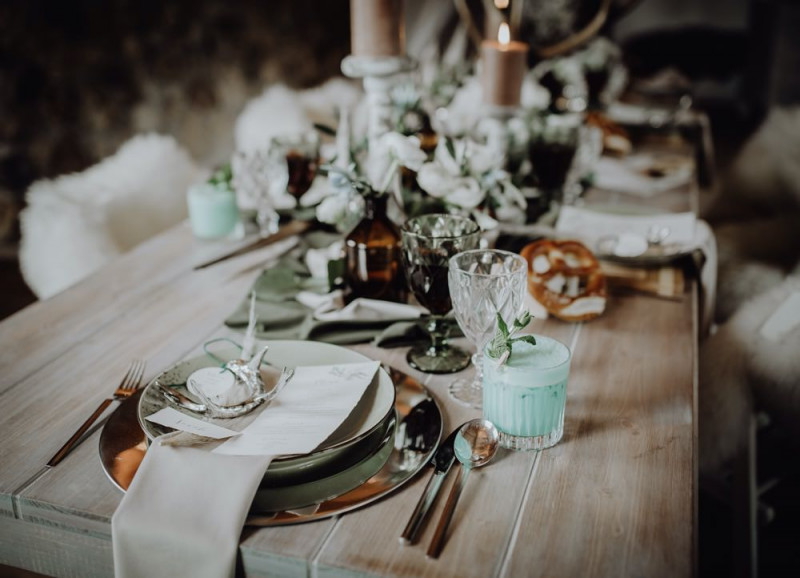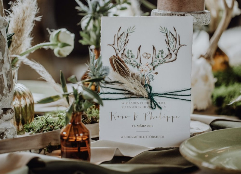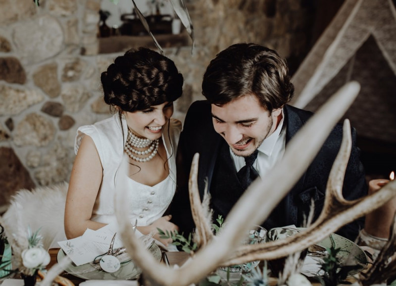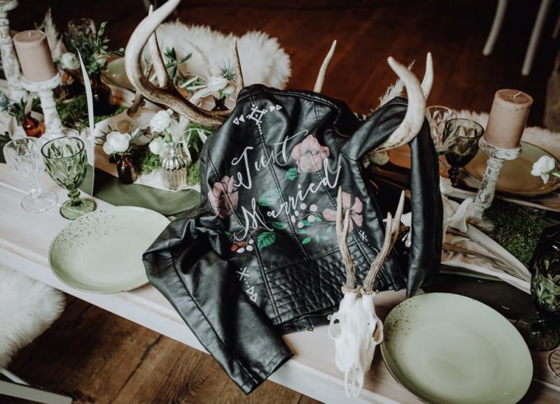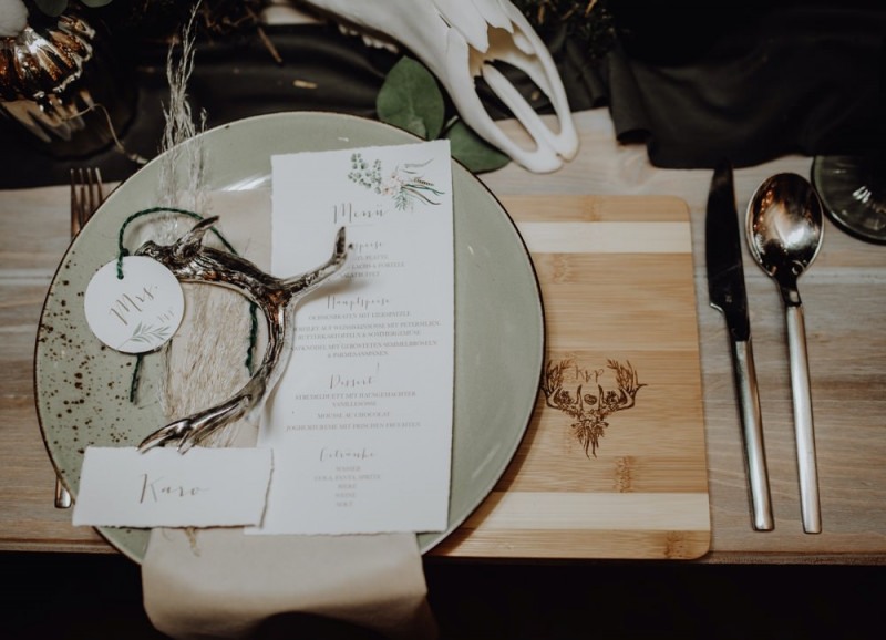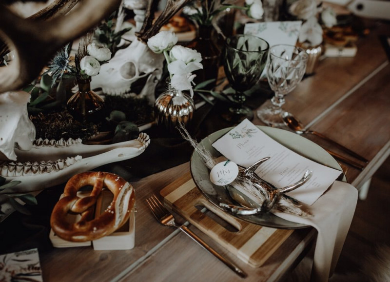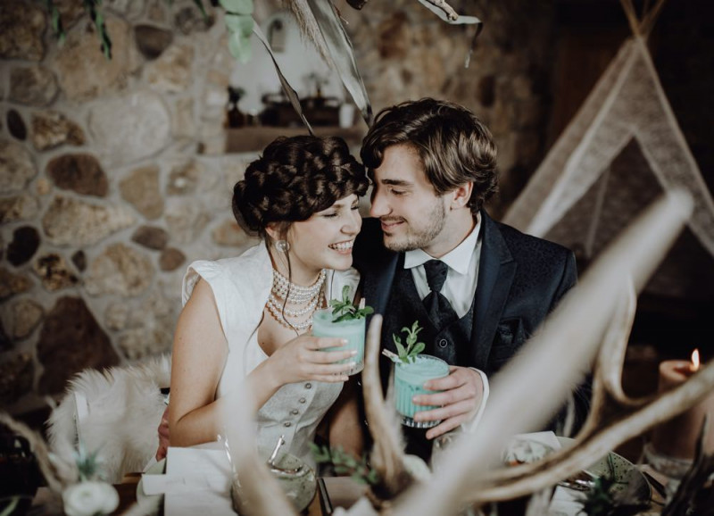 Iris stand bei dieser Trauung vor einem großen, runden, geschmückten Traubogen, der wirklich ein florales Highlight ist. Sagen wir, eines von vielen! Beata (4 Your Wedding) hat bei der Dekoration & Floristik auf wilde aber dennoch zarte Züge gesetzt, die unglaublich schön mit der rustikalen Stimmung der Location und des Mobiliars von der Vermieterei einhergehen. Und natürlich gibt es auch einige Jägerdetails zu entdecken, die hier nicht fehlen dürfen. Doch sind sie alles andere als schwer. Das Konzept verleiht ihnen Leichtigkeit und erzeugt Frische durch die hellen Farben. Die schöne Hochzeitspapeterie von Federgold, im Bohostil, unterstützt diese leichten Vibes perfekt. Und so durften Karo & Alex den Tag in dieser wundervollen Szenerie verbringen. Selbstverständlich in Tracht! Karo hat es mir dabei ganz besonders angetan. Ihr knielanges Dirndl, von Di Lommi, ist einfach ein Traum. Der Stehkragen, kombiniert zu einer mehrreihigen Vintage Perlenkette und den passenden Ohrringe verleihen ihr eine grazile und edle Attitüde. Ihr Styling, kreiert von Petra Sickenius, betont dabei durch rauchige Augen und eine kecke Hochsteckfrisur mit Flechtdetails, vor allem ihre Sinnlichkeit. Doch täuscht euch nicht! Die Kleine kann auch sehr cool in einer handbemalten Lederjacke von Federgold. Alex fängt in seinem klassischen schwarzen Anzug, von Trau dich EVIG, mit Brokatdetails und Schlips, die wilden Züge seiner Braut wieder ein und lässt ein harmonisches Zusammenspiel entstehen. Davon könnt ihr euch beim süßen Brautpaarshooting im Freien überzeugen. Mit von der Partie: Ein altes Käfer Cabrio, das King Oldtimer zur Verfügung gestellt hat. Und natürlich gibt es auch noch etwas für alle Zuckermäuler zu entdecken. Ein Sweet Table, samt Torten und Salty Pieces, der dem Süden Deutschlands mehr als gerecht wird. Diesen haben wir Viktoriana zu verdanken. Zum Anstoßen auf diesen schönen Tag gibt es on Top farbig passende Cocktails von Liquids & Cocktails. Und jetzt wünsche ich euch ganz viel Freude mit dieser Inspiration für moderne Trachtenhochzeiten! CHEERS!