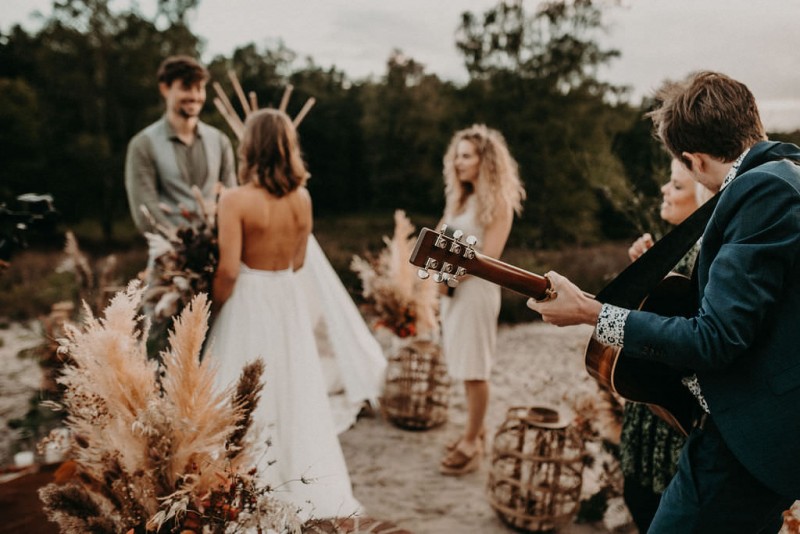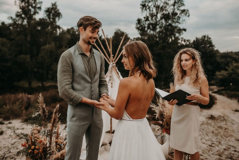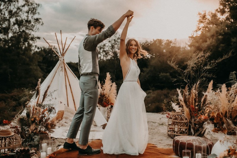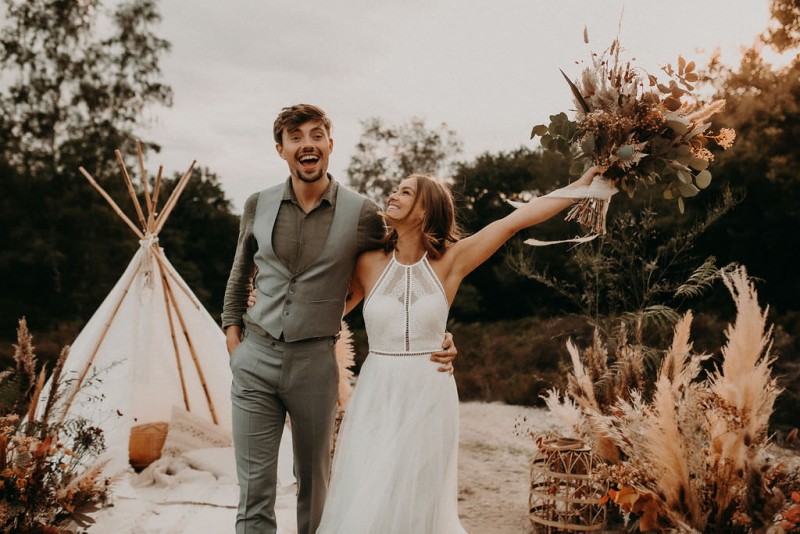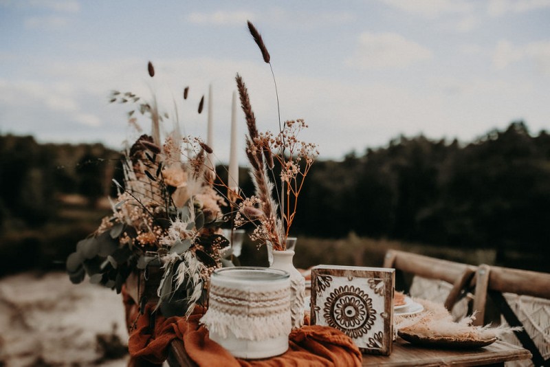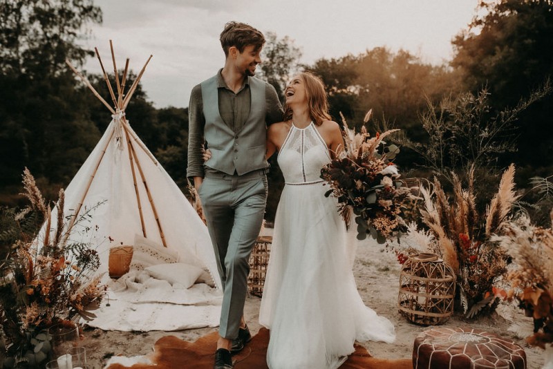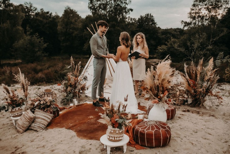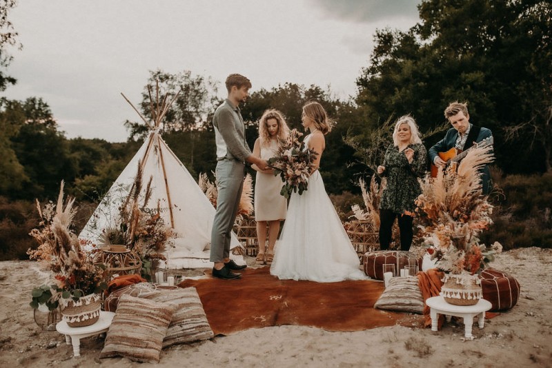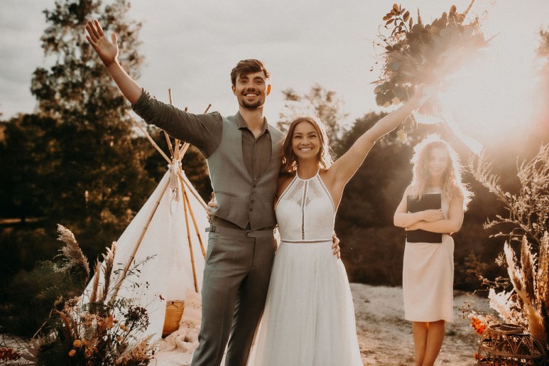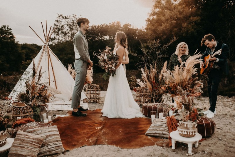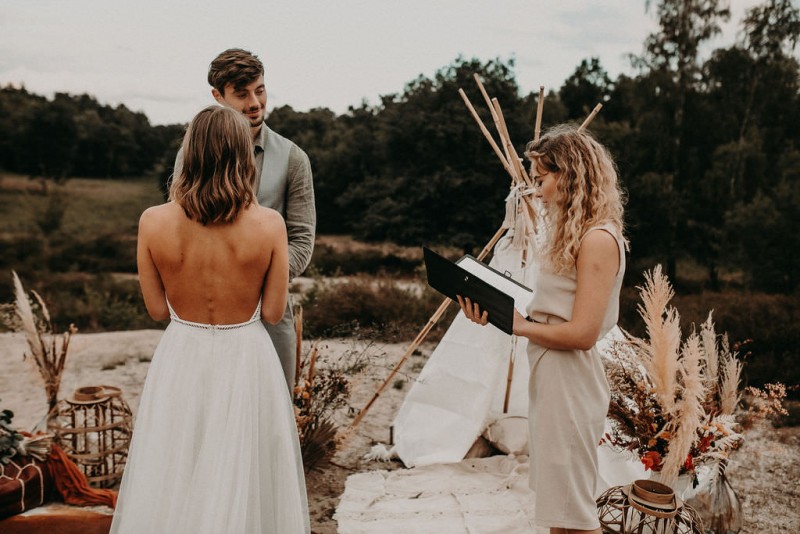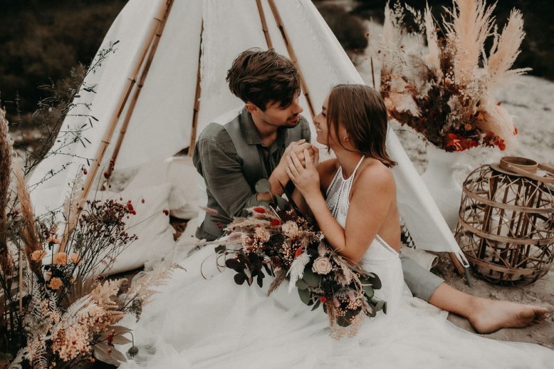 Heiraten unter freiem Himmel und zu später Stunde unter dem Sternenhimmel tanzen. Was für ein Traum! In dieser schönen Hochzeitsinspiration erwartet euch genau das, im Stil einer rustikalen Bohohochzeit. Fotografiert wurde diese wunderschöne Outdoor Hochzeit, in der ihr euch zudem über ein romantisches Elopement samt freier Trauung und Live Musik freuen dürft, von Hochzeitsfotografin Mel Ende Photography. Sie hat das wirklich besondere Setting und das zuckersüße und unglaublich bezaubernde Brautpaar für uns fotografisch festgehalten. Das Konzept zu dieser Inspiration, sowie die Planung, übernahm Hochzeitsplanerin Sophie von from Sophie with love. Sie hat dieses traumhaft schöne Elopement zudem als Traurednerin von it’s your story um eine wundervolle freien Trauung erweitert, die von Ina Krabes gesanglich und von David Ropertz musikalisch mit seiner Gitarre begleitet wurde. Das hübsche Brautpaar, Alena & Pipo, fand sich an diesem Tag, mit den Füßen im Sand und umgeben von der Natur, in einem romantischen Traum aus rustikalen Bohovibes wieder. the featherette kreierte die tolle Dekoration, die ein hübsches Tipi, lederne Sitzkissen, kuschelige Bohokissen und allerlei Vasen und Weidenkörbe beinhaltet. Ein Tischsetting zum Verlieben ist natürlich auch dabei. Passend zu der wundervollen Floristik von Blumen Brüning, die ein Meer aus wilden Blumengestecken sowie einen opulenten Brautstrauß für die Braut kreierten, finden sich überall feine Details in Rost und Braun. Makramee-Platzdeckchen, Makramee-Stuhlbehänge, weiße Vasen, hölzerne Schriftzüge und Leinenstoffe – zusammen mit der tollen Floristik, ein wahres Träumchen für alle Bohomädchen. Und in diesem Outdoor-Bohotraum durften zwei Personen ihre Liebe feiern. In einem zarten, fließenden Brautkleid mit einem Neckholderoberteil und einem tiefen Rückenausschnitt von AUDREY the wedding salon, sowie einem natürlich schönen Styling mit gold-braunen Akzenten und offenem Haar von Styling by Sweta, stand Alena mit ihrem Bräutigam Pipo, in einem elegant-lockeren Outfit, bestehend aus Anzughose sowie passender Weste und einem lockeren Leinenhemd, von The Bloke, zum Ja-Wort bereit. Der Wind wehte ihnen durch’s Haar und verlieh der Szenerie eine natürlich schöne Leichtigkeit. Es ging an diesem Tag einzig und allein um sie, in diesem Meer aus wilden Trockenblumen, all den rustikalen Bohodetails und der untergehenden Sonne.