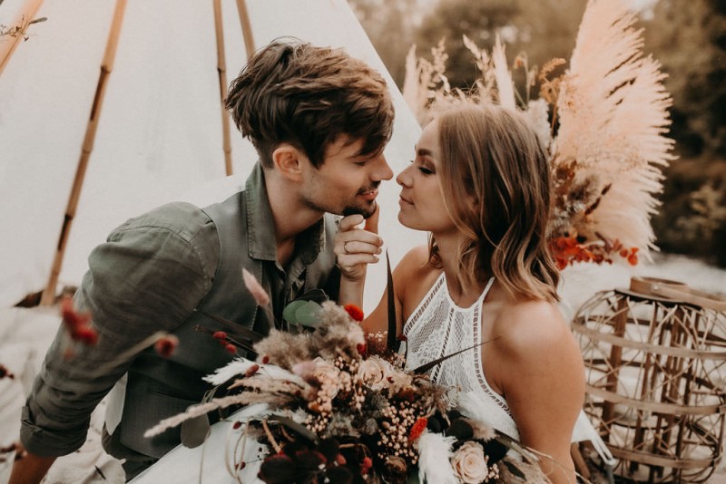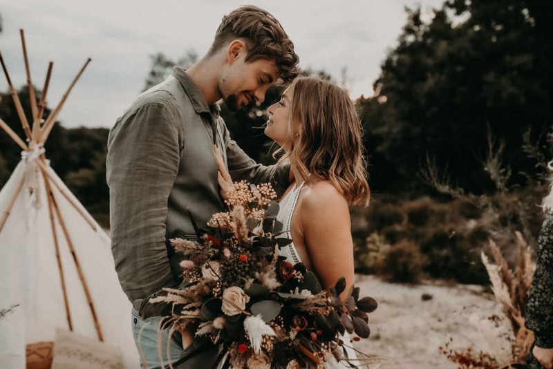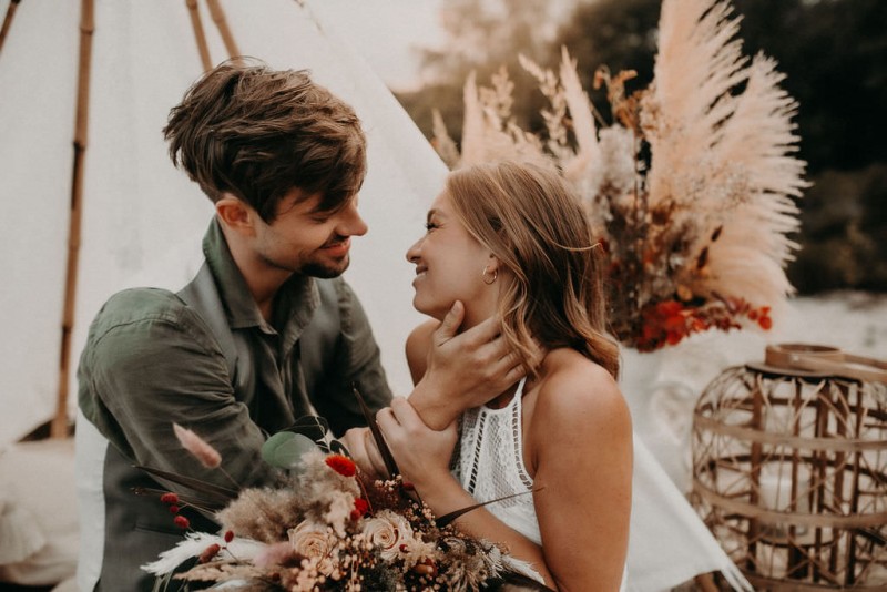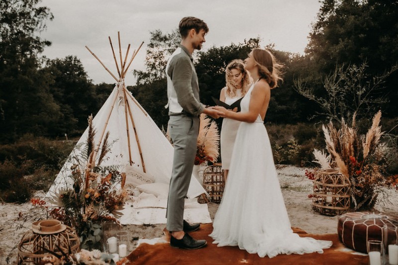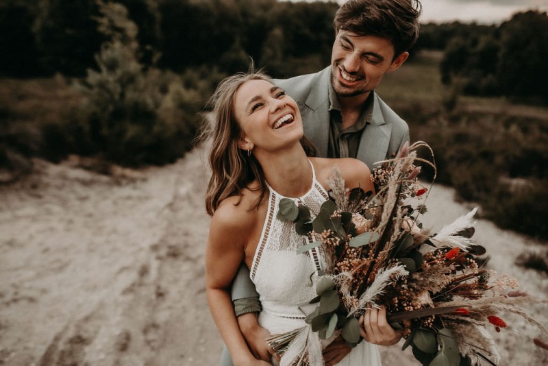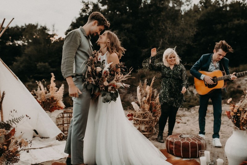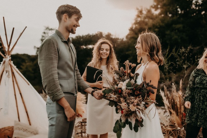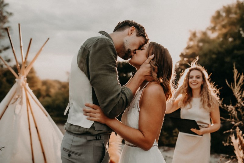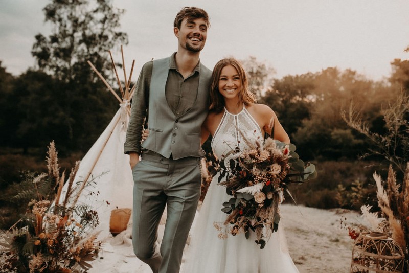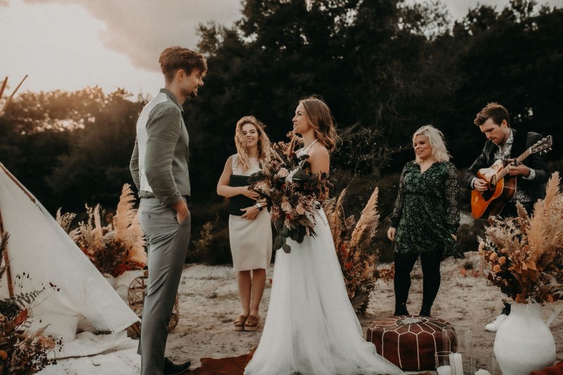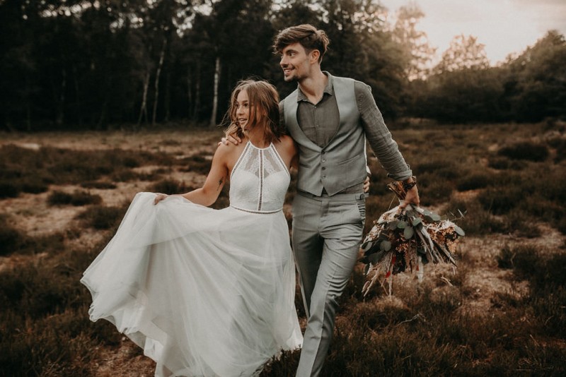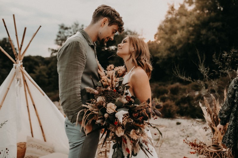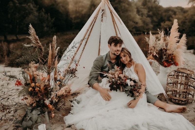 Heiraten unter freiem Himmel und zu später Stunde unter dem Sternenhimmel tanzen. Was für ein Traum! In dieser schönen Hochzeitsinspiration erwartet euch genau das, im Stil einer rustikalen Bohohochzeit. Fotografiert wurde diese wunderschöne Outdoor Hochzeit, in der ihr euch zudem über ein romantisches Elopement samt freier Trauung und Live Musik freuen dürft, von Hochzeitsfotografin Mel Ende Photography. Sie hat das wirklich besondere Setting und das zuckersüße und unglaublich bezaubernde Brautpaar für uns fotografisch festgehalten. Das Konzept zu dieser Inspiration, sowie die Planung, übernahm Hochzeitsplanerin Sophie von from Sophie with love. Sie hat dieses traumhaft schöne Elopement zudem als Traurednerin von it’s your story um eine wundervolle freien Trauung erweitert, die von Ina Krabes gesanglich und von David Ropertz musikalisch mit seiner Gitarre begleitet wurde. Das hübsche Brautpaar, Alena & Pipo, fand sich an diesem Tag, mit den Füßen im Sand und umgeben von der Natur, in einem romantischen Traum aus rustikalen Bohovibes wieder. the featherette kreierte die tolle Dekoration, die ein hübsches Tipi, lederne Sitzkissen, kuschelige Bohokissen und allerlei Vasen und Weidenkörbe beinhaltet. Ein Tischsetting zum Verlieben ist natürlich auch dabei. Passend zu der wundervollen Floristik von Blumen Brüning, die ein Meer aus wilden Blumengestecken sowie einen opulenten Brautstrauß für die Braut kreierten, finden sich überall feine Details in Rost und Braun. Makramee-Platzdeckchen, Makramee-Stuhlbehänge, weiße Vasen, hölzerne Schriftzüge und Leinenstoffe – zusammen mit der tollen Floristik, ein wahres Träumchen für alle Bohomädchen. Und in diesem Outdoor-Bohotraum durften zwei Personen ihre Liebe feiern. In einem zarten, fließenden Brautkleid mit einem Neckholderoberteil und einem tiefen Rückenausschnitt von AUDREY the wedding salon, sowie einem natürlich schönen Styling mit gold-braunen Akzenten und offenem Haar von Styling by Sweta, stand Alena mit ihrem Bräutigam Pipo, in einem elegant-lockeren Outfit, bestehend aus Anzughose sowie passender Weste und einem lockeren Leinenhemd, von The Bloke, zum Ja-Wort bereit. Der Wind wehte ihnen durch’s Haar und verlieh der Szenerie eine natürlich schöne Leichtigkeit. Es ging an diesem Tag einzig und allein um sie, in diesem Meer aus wilden Trockenblumen, all den rustikalen Bohodetails und der untergehenden Sonne.