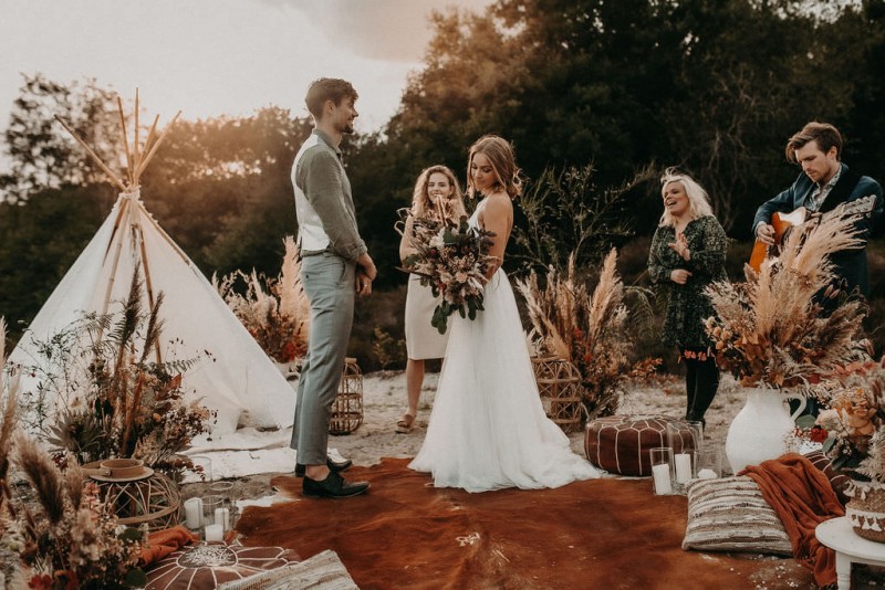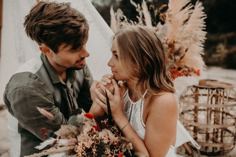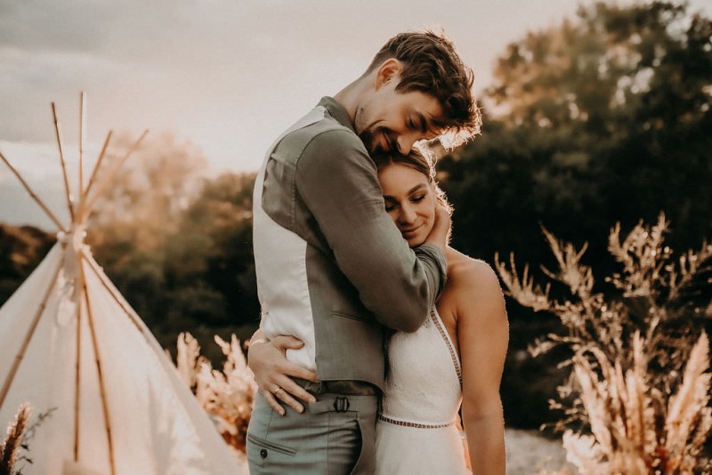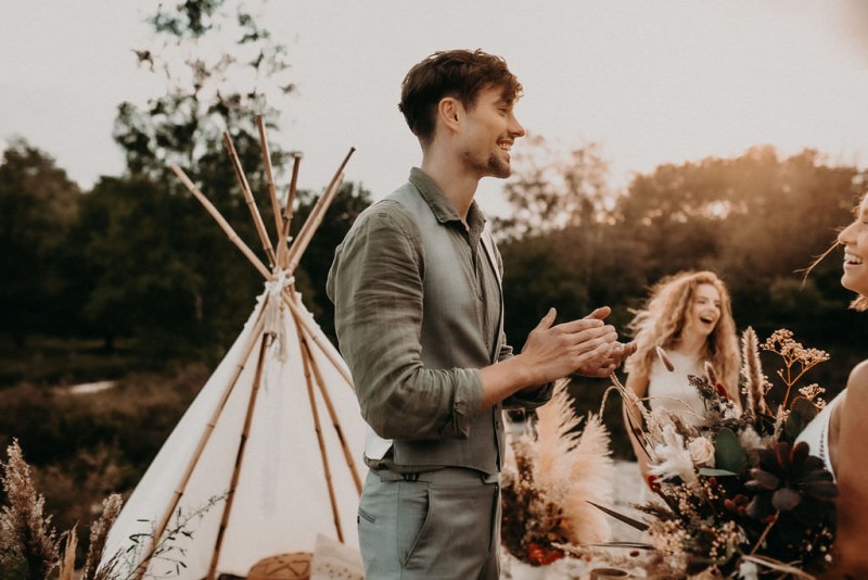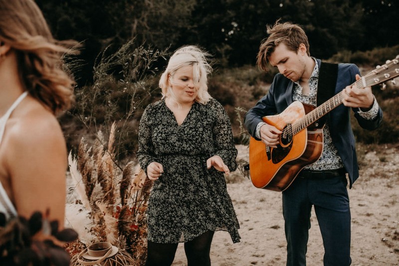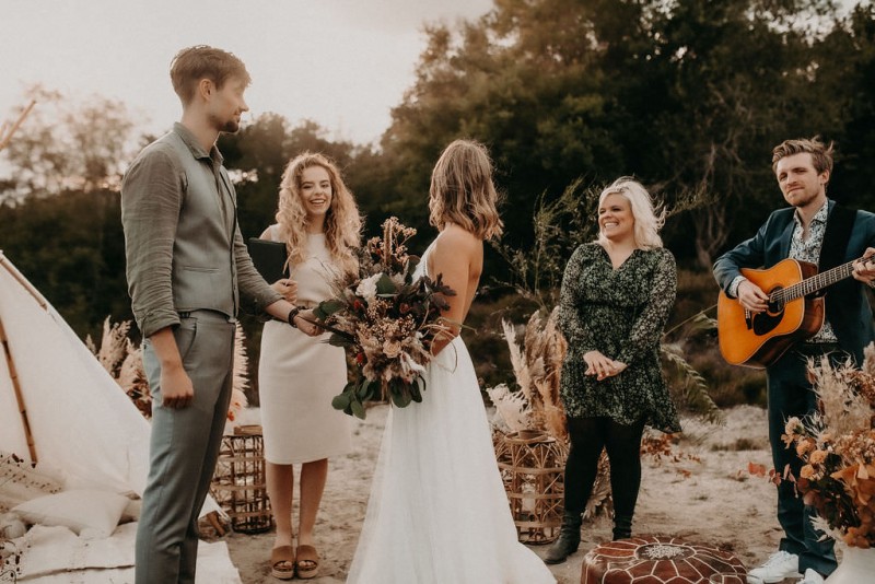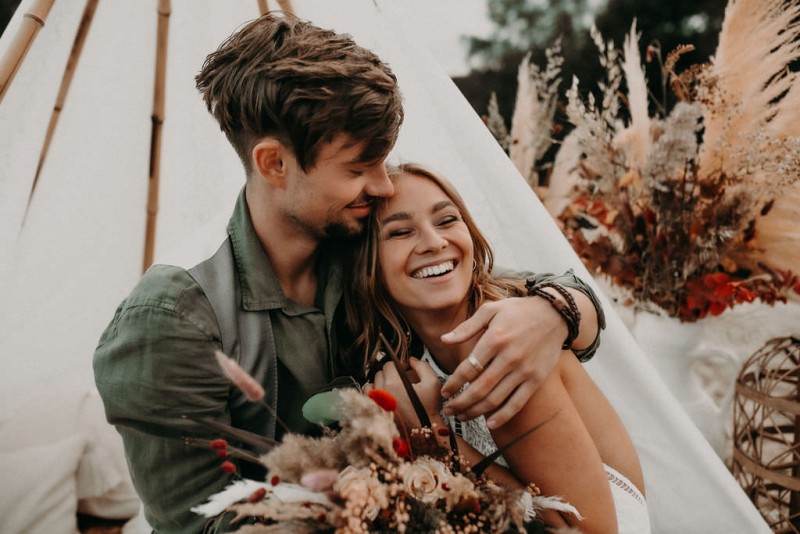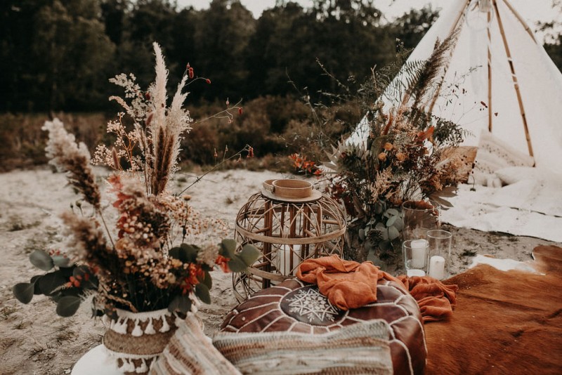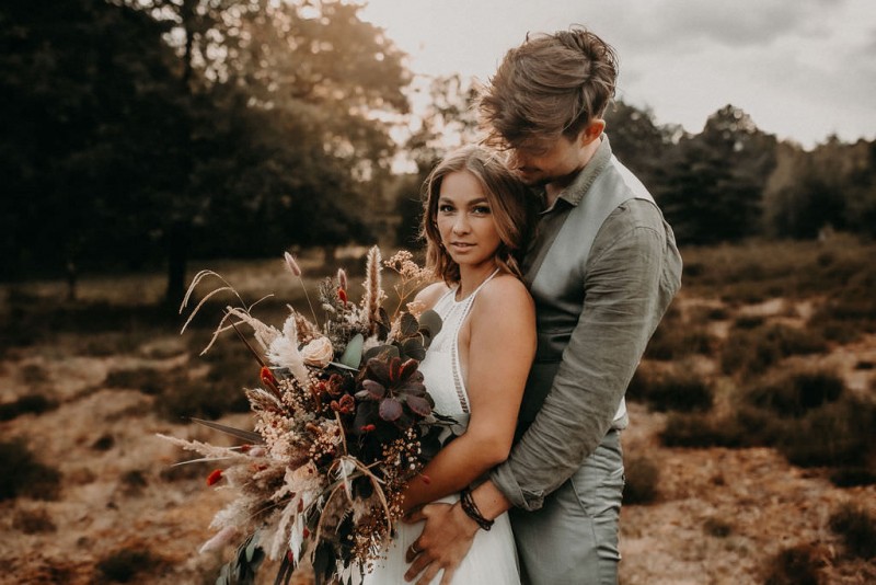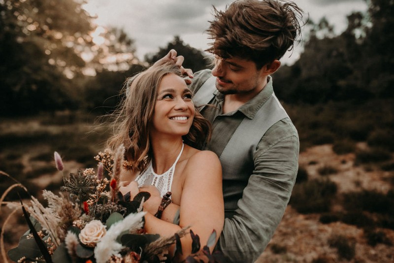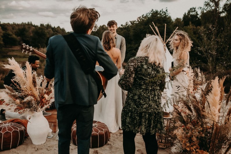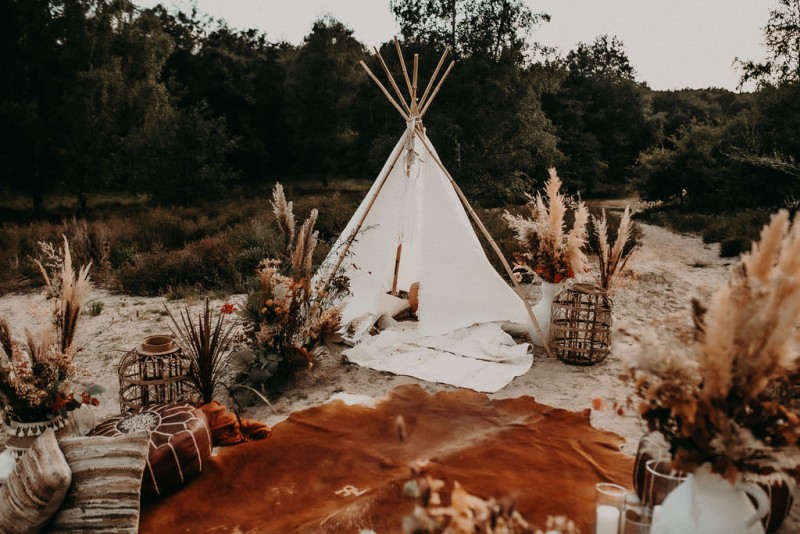 Heiraten unter freiem Himmel und zu später Stunde unter dem Sternenhimmel tanzen. Was für ein Traum! In dieser schönen Hochzeitsinspiration erwartet euch genau das, im Stil einer rustikalen Bohohochzeit. Fotografiert wurde diese wunderschöne Outdoor Hochzeit, in der ihr euch zudem über ein romantisches Elopement samt freier Trauung und Live Musik freuen dürft, von Hochzeitsfotografin Mel Ende Photography. Sie hat das wirklich besondere Setting und das zuckersüße und unglaublich bezaubernde Brautpaar für uns fotografisch festgehalten. Das Konzept zu dieser Inspiration, sowie die Planung, übernahm Hochzeitsplanerin Sophie von from Sophie with love. Sie hat dieses traumhaft schöne Elopement zudem als Traurednerin von it’s your story um eine wundervolle freien Trauung erweitert, die von Ina Krabes gesanglich und von David Ropertz musikalisch mit seiner Gitarre begleitet wurde. Das hübsche Brautpaar, Alena & Pipo, fand sich an diesem Tag, mit den Füßen im Sand und umgeben von der Natur, in einem romantischen Traum aus rustikalen Bohovibes wieder. the featherette kreierte die tolle Dekoration, die ein hübsches Tipi, lederne Sitzkissen, kuschelige Bohokissen und allerlei Vasen und Weidenkörbe beinhaltet. Ein Tischsetting zum Verlieben ist natürlich auch dabei. Passend zu der wundervollen Floristik von Blumen Brüning, die ein Meer aus wilden Blumengestecken sowie einen opulenten Brautstrauß für die Braut kreierten, finden sich überall feine Details in Rost und Braun. Makramee-Platzdeckchen, Makramee-Stuhlbehänge, weiße Vasen, hölzerne Schriftzüge und Leinenstoffe – zusammen mit der tollen Floristik, ein wahres Träumchen für alle Bohomädchen. Und in diesem Outdoor-Bohotraum durften zwei Personen ihre Liebe feiern. In einem zarten, fließenden Brautkleid mit einem Neckholderoberteil und einem tiefen Rückenausschnitt von AUDREY the wedding salon, sowie einem natürlich schönen Styling mit gold-braunen Akzenten und offenem Haar von Styling by Sweta, stand Alena mit ihrem Bräutigam Pipo, in einem elegant-lockeren Outfit, bestehend aus Anzughose sowie passender Weste und einem lockeren Leinenhemd, von The Bloke, zum Ja-Wort bereit. Der Wind wehte ihnen durch’s Haar und verlieh der Szenerie eine natürlich schöne Leichtigkeit. Es ging an diesem Tag einzig und allein um sie, in diesem Meer aus wilden Trockenblumen, all den rustikalen Bohodetails und der untergehenden Sonne.