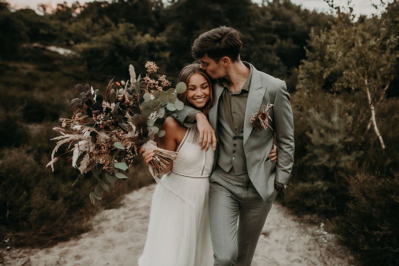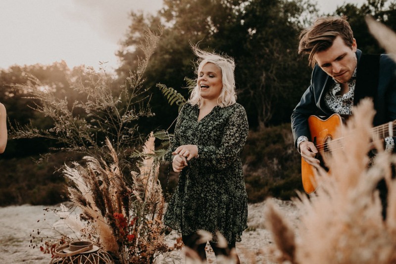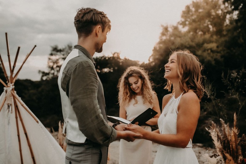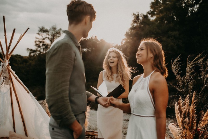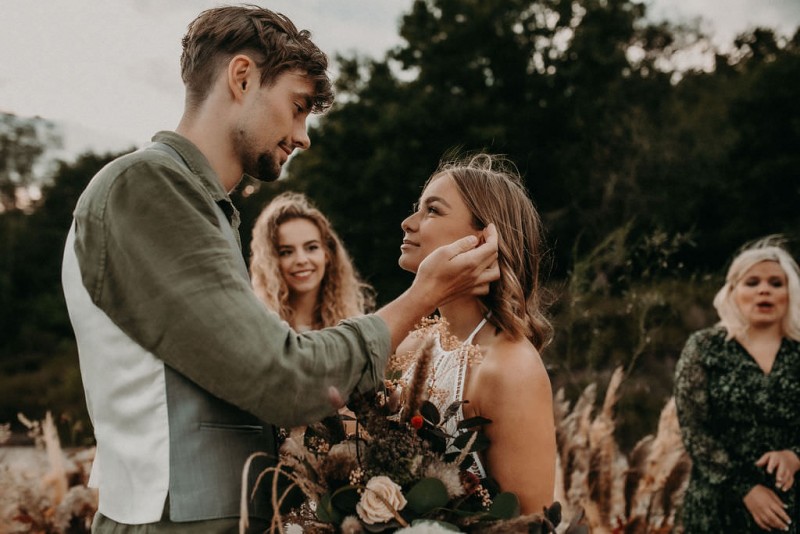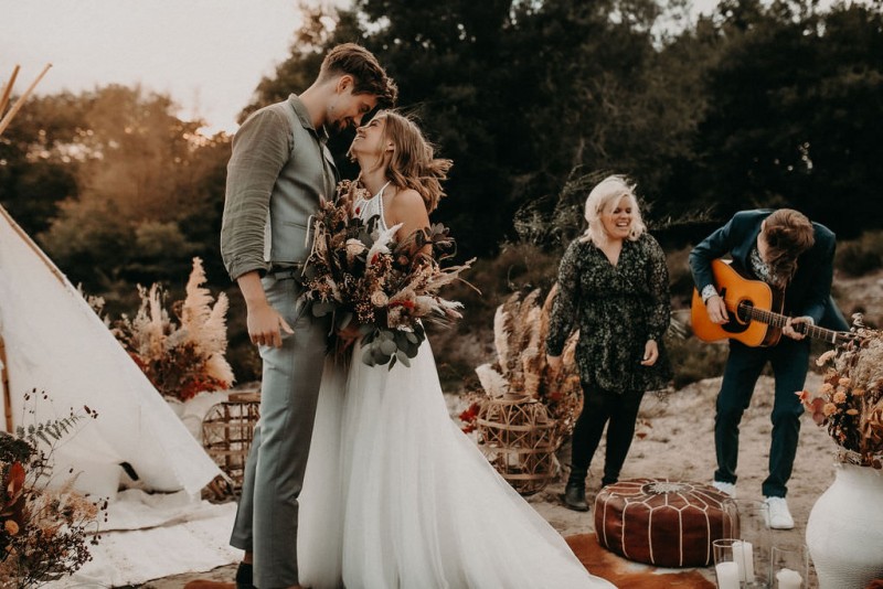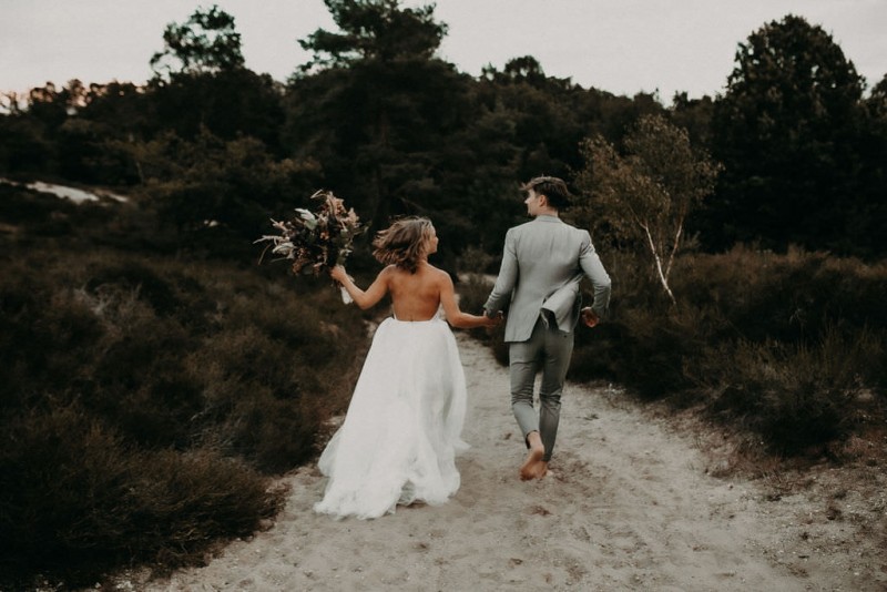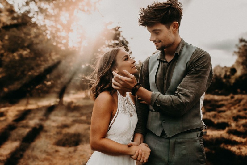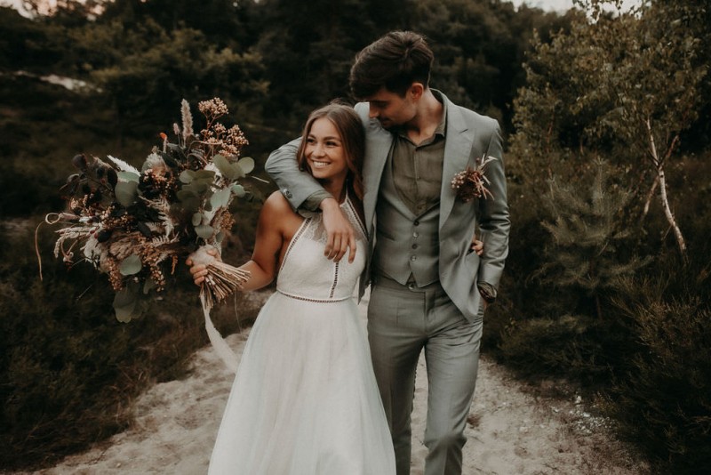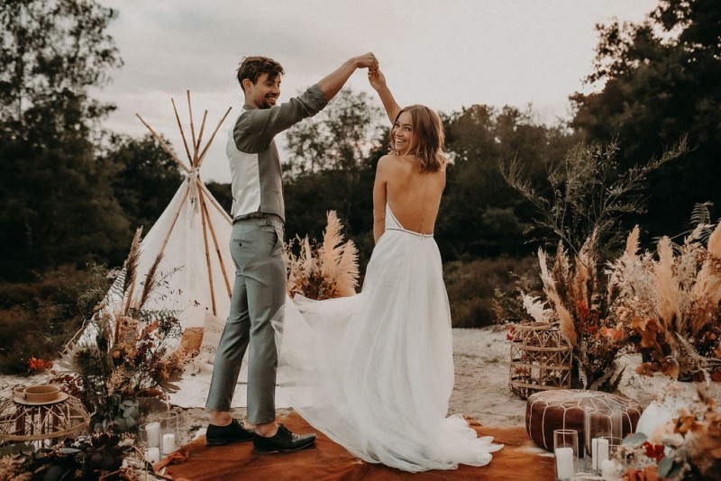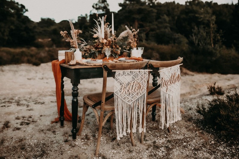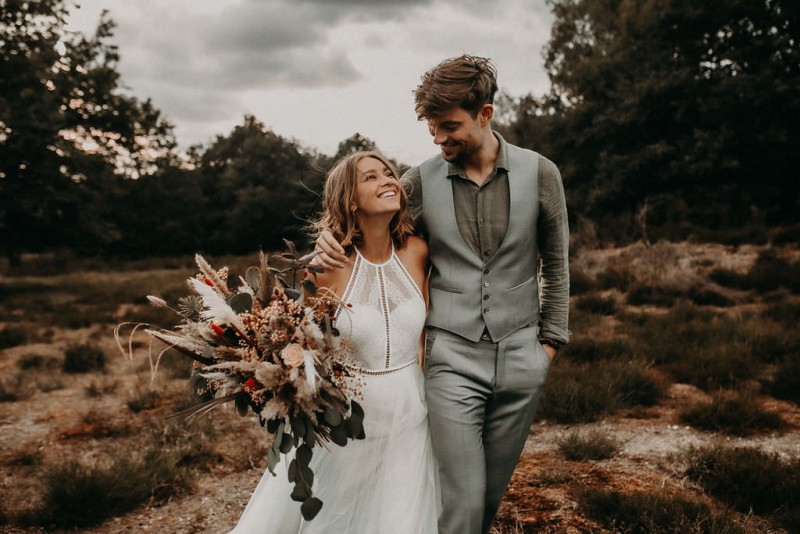 Heiraten unter freiem Himmel und zu später Stunde unter dem Sternenhimmel tanzen. Was für ein Traum! In dieser schönen Hochzeitsinspiration erwartet euch genau das, im Stil einer rustikalen Bohohochzeit. Fotografiert wurde diese wunderschöne Outdoor Hochzeit, in der ihr euch zudem über ein romantisches Elopement samt freier Trauung und Live Musik freuen dürft, von Hochzeitsfotografin Mel Ende Photography. Sie hat das wirklich besondere Setting und das zuckersüße und unglaublich bezaubernde Brautpaar für uns fotografisch festgehalten. Das Konzept zu dieser Inspiration, sowie die Planung, übernahm Hochzeitsplanerin Sophie von from Sophie with love. Sie hat dieses traumhaft schöne Elopement zudem als Traurednerin von it’s your story um eine wundervolle freien Trauung erweitert, die von Ina Krabes gesanglich und von David Ropertz musikalisch mit seiner Gitarre begleitet wurde. Das hübsche Brautpaar, Alena & Pipo, fand sich an diesem Tag, mit den Füßen im Sand und umgeben von der Natur, in einem romantischen Traum aus rustikalen Bohovibes wieder. the featherette kreierte die tolle Dekoration, die ein hübsches Tipi, lederne Sitzkissen, kuschelige Bohokissen und allerlei Vasen und Weidenkörbe beinhaltet. Ein Tischsetting zum Verlieben ist natürlich auch dabei. Passend zu der wundervollen Floristik von Blumen Brüning, die ein Meer aus wilden Blumengestecken sowie einen opulenten Brautstrauß für die Braut kreierten, finden sich überall feine Details in Rost und Braun. Makramee-Platzdeckchen, Makramee-Stuhlbehänge, weiße Vasen, hölzerne Schriftzüge und Leinenstoffe – zusammen mit der tollen Floristik, ein wahres Träumchen für alle Bohomädchen. Und in diesem Outdoor-Bohotraum durften zwei Personen ihre Liebe feiern. In einem zarten, fließenden Brautkleid mit einem Neckholderoberteil und einem tiefen Rückenausschnitt von AUDREY the wedding salon, sowie einem natürlich schönen Styling mit gold-braunen Akzenten und offenem Haar von Styling by Sweta, stand Alena mit ihrem Bräutigam Pipo, in einem elegant-lockeren Outfit, bestehend aus Anzughose sowie passender Weste und einem lockeren Leinenhemd, von The Bloke, zum Ja-Wort bereit. Der Wind wehte ihnen durch’s Haar und verlieh der Szenerie eine natürlich schöne Leichtigkeit. Es ging an diesem Tag einzig und allein um sie, in diesem Meer aus wilden Trockenblumen, all den rustikalen Bohodetails und der untergehenden Sonne.