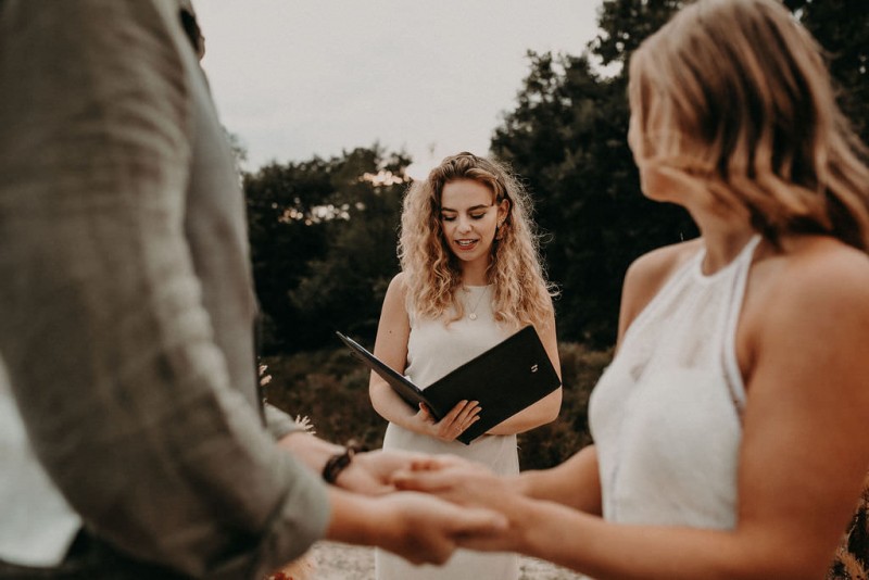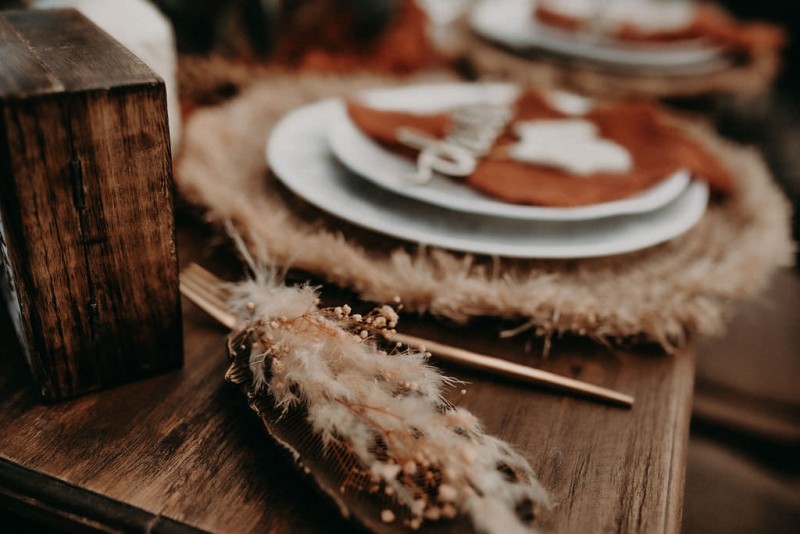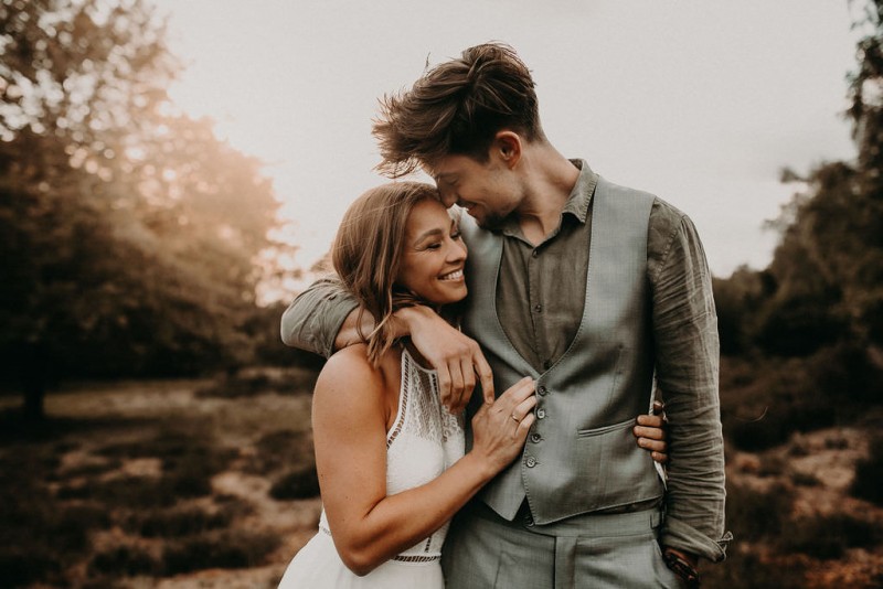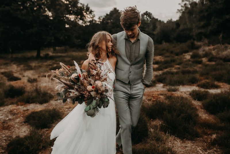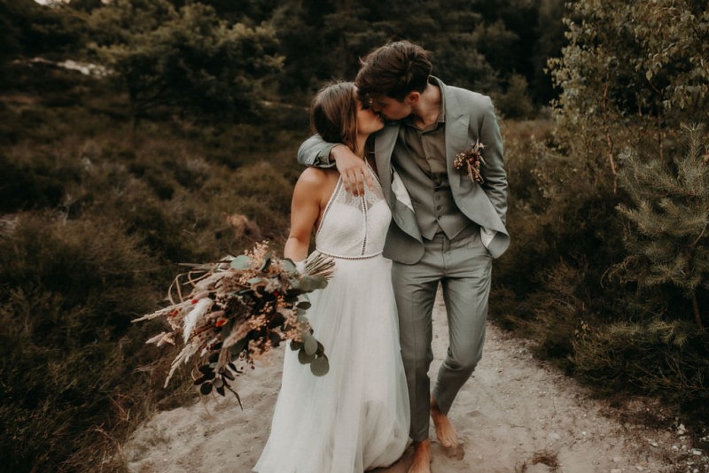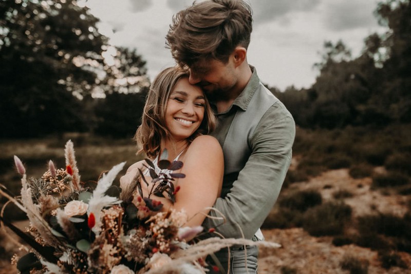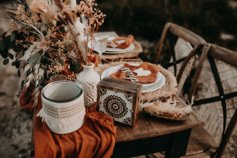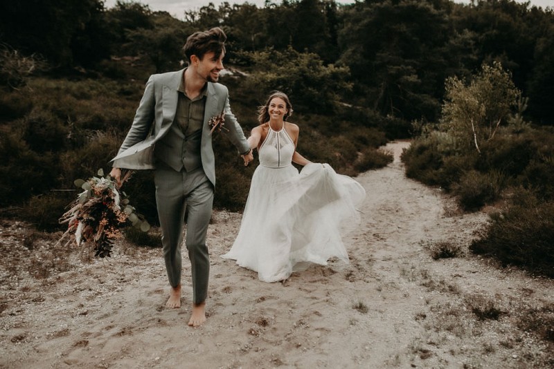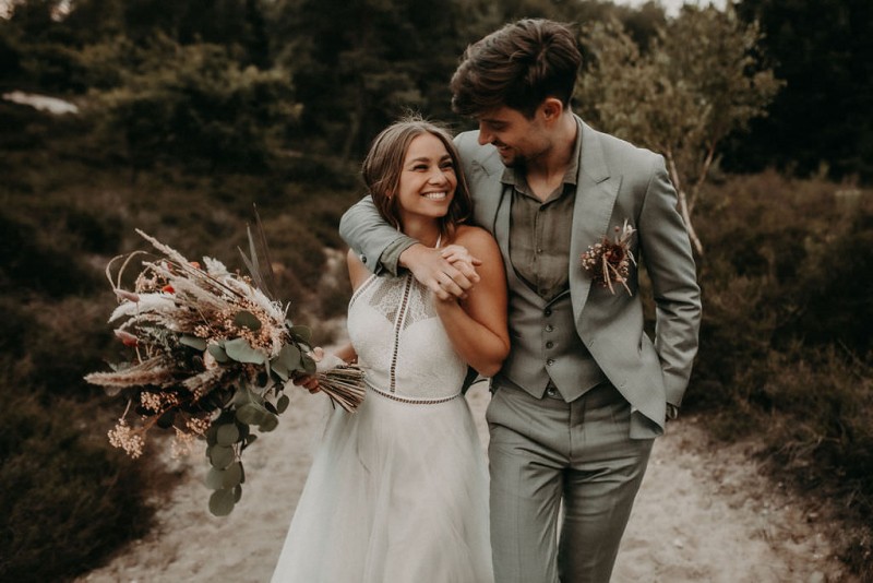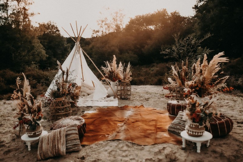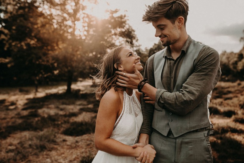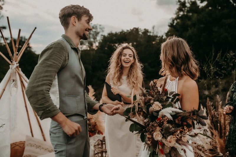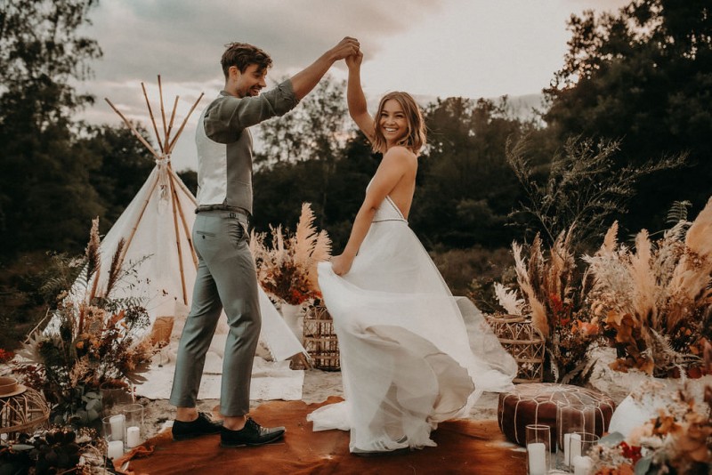 Heiraten unter freiem Himmel und zu später Stunde unter dem Sternenhimmel tanzen. Was für ein Traum! In dieser schönen Hochzeitsinspiration erwartet euch genau das, im Stil einer rustikalen Bohohochzeit. Fotografiert wurde diese wunderschöne Outdoor Hochzeit, in der ihr euch zudem über ein romantisches Elopement samt freier Trauung und Live Musik freuen dürft, von Hochzeitsfotografin Mel Ende Photography. Sie hat das wirklich besondere Setting und das zuckersüße und unglaublich bezaubernde Brautpaar für uns fotografisch festgehalten. Das Konzept zu dieser Inspiration, sowie die Planung, übernahm Hochzeitsplanerin Sophie von from Sophie with love. Sie hat dieses traumhaft schöne Elopement zudem als Traurednerin von it’s your story um eine wundervolle freien Trauung erweitert, die von Ina Krabes gesanglich und von David Ropertz musikalisch mit seiner Gitarre begleitet wurde. Das hübsche Brautpaar, Alena & Pipo, fand sich an diesem Tag, mit den Füßen im Sand und umgeben von der Natur, in einem romantischen Traum aus rustikalen Bohovibes wieder. the featherette kreierte die tolle Dekoration, die ein hübsches Tipi, lederne Sitzkissen, kuschelige Bohokissen und allerlei Vasen und Weidenkörbe beinhaltet. Ein Tischsetting zum Verlieben ist natürlich auch dabei. Passend zu der wundervollen Floristik von Blumen Brüning, die ein Meer aus wilden Blumengestecken sowie einen opulenten Brautstrauß für die Braut kreierten, finden sich überall feine Details in Rost und Braun. Makramee-Platzdeckchen, Makramee-Stuhlbehänge, weiße Vasen, hölzerne Schriftzüge und Leinenstoffe – zusammen mit der tollen Floristik, ein wahres Träumchen für alle Bohomädchen. Und in diesem Outdoor-Bohotraum durften zwei Personen ihre Liebe feiern. In einem zarten, fließenden Brautkleid mit einem Neckholderoberteil und einem tiefen Rückenausschnitt von AUDREY the wedding salon, sowie einem natürlich schönen Styling mit gold-braunen Akzenten und offenem Haar von Styling by Sweta, stand Alena mit ihrem Bräutigam Pipo, in einem elegant-lockeren Outfit, bestehend aus Anzughose sowie passender Weste und einem lockeren Leinenhemd, von The Bloke, zum Ja-Wort bereit. Der Wind wehte ihnen durch’s Haar und verlieh der Szenerie eine natürlich schöne Leichtigkeit. Es ging an diesem Tag einzig und allein um sie, in diesem Meer aus wilden Trockenblumen, all den rustikalen Bohodetails und der untergehenden Sonne.