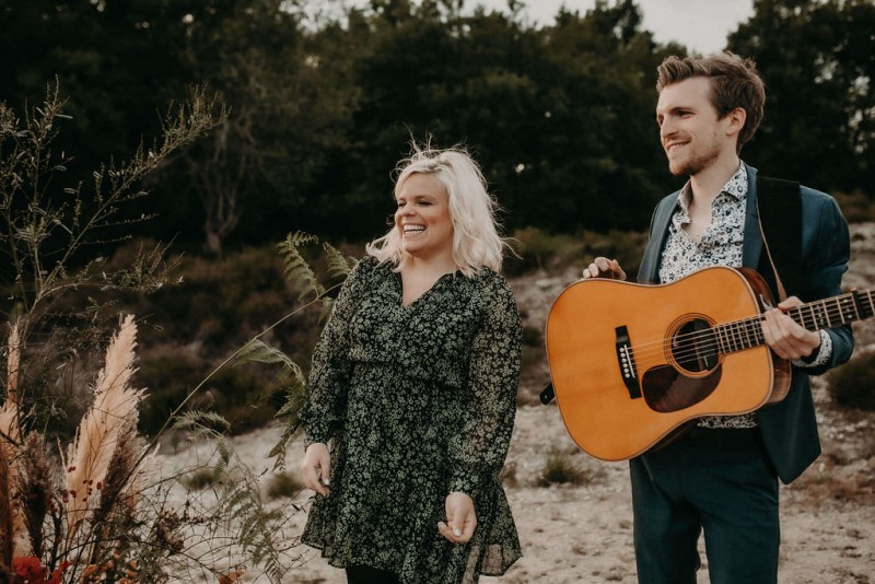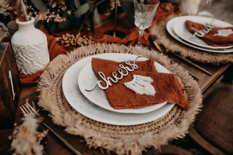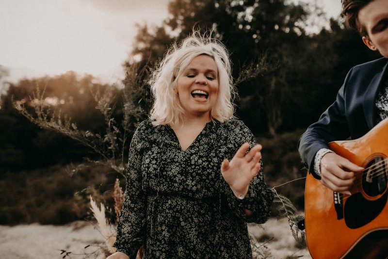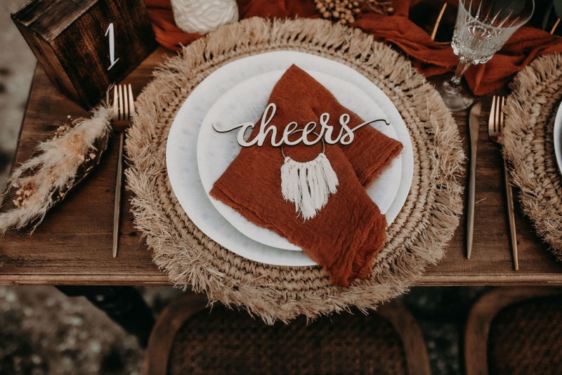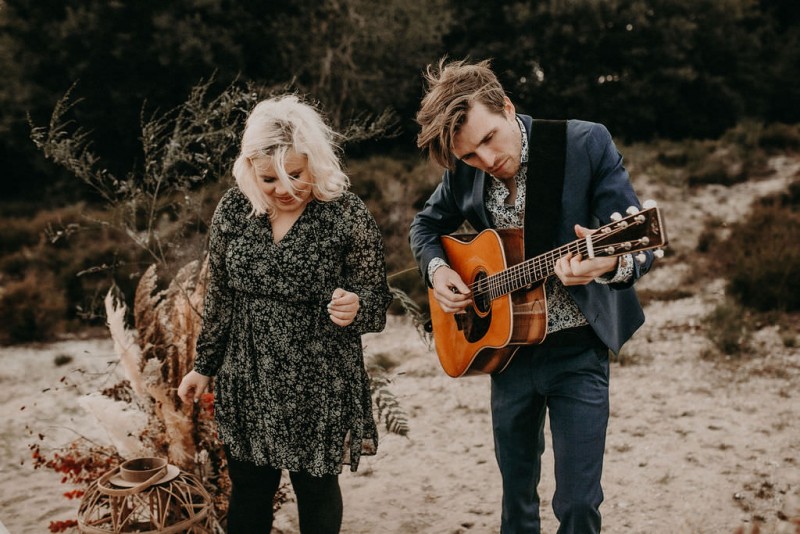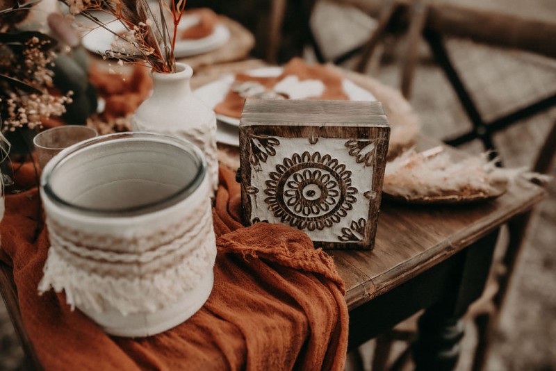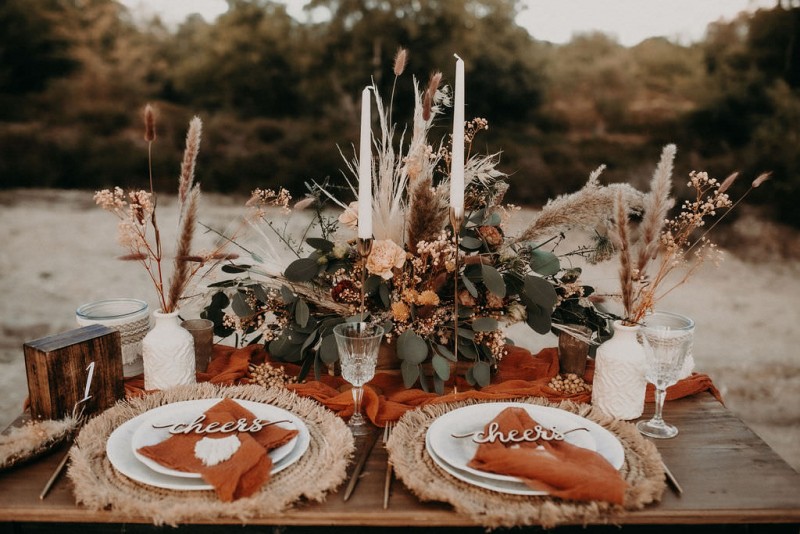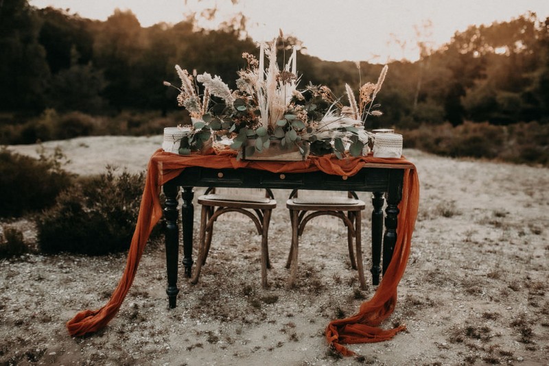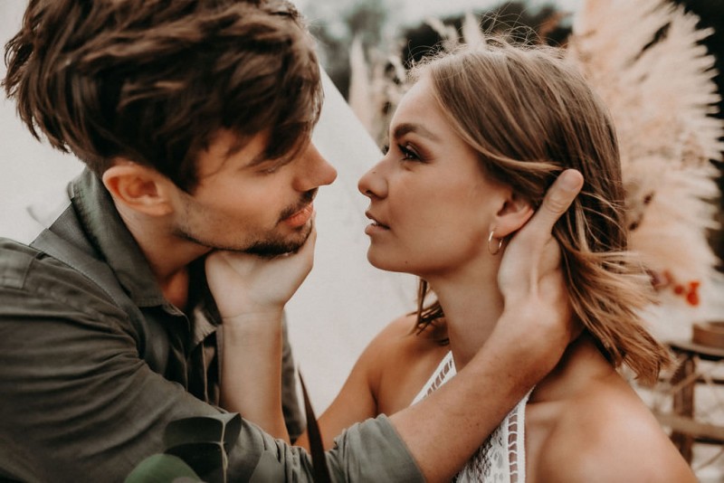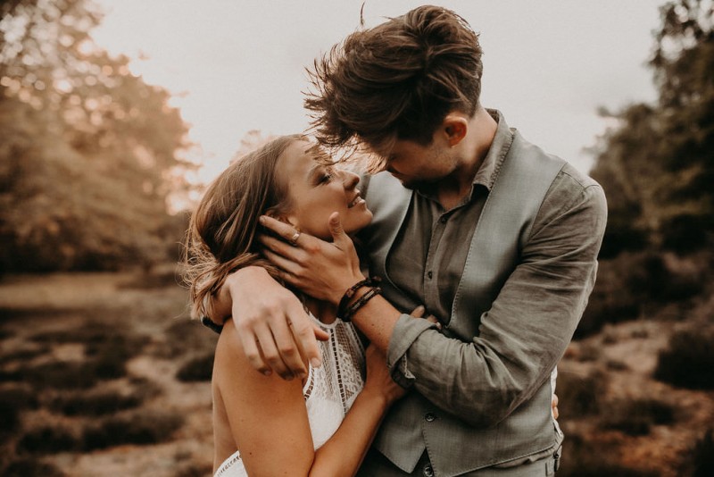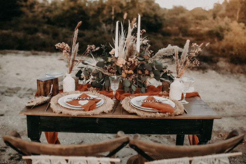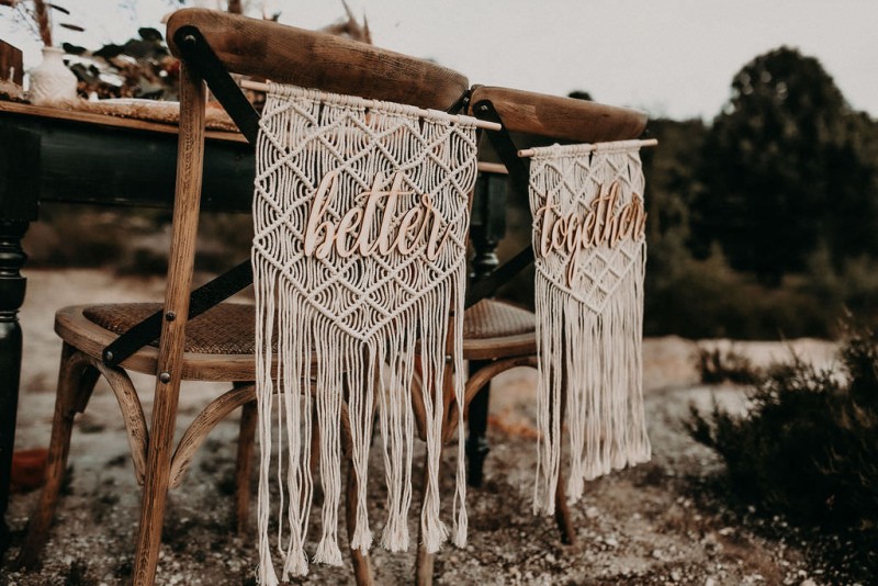 Heiraten unter freiem Himmel und zu später Stunde unter dem Sternenhimmel tanzen. Was für ein Traum! In dieser schönen Hochzeitsinspiration erwartet euch genau das, im Stil einer rustikalen Bohohochzeit. Fotografiert wurde diese wunderschöne Outdoor Hochzeit, in der ihr euch zudem über ein romantisches Elopement samt freier Trauung und Live Musik freuen dürft, von Hochzeitsfotografin Mel Ende Photography. Sie hat das wirklich besondere Setting und das zuckersüße und unglaublich bezaubernde Brautpaar für uns fotografisch festgehalten. Das Konzept zu dieser Inspiration, sowie die Planung, übernahm Hochzeitsplanerin Sophie von from Sophie with love. Sie hat dieses traumhaft schöne Elopement zudem als Traurednerin von it’s your story um eine wundervolle freien Trauung erweitert, die von Ina Krabes gesanglich und von David Ropertz musikalisch mit seiner Gitarre begleitet wurde. Das hübsche Brautpaar, Alena & Pipo, fand sich an diesem Tag, mit den Füßen im Sand und umgeben von der Natur, in einem romantischen Traum aus rustikalen Bohovibes wieder. the featherette kreierte die tolle Dekoration, die ein hübsches Tipi, lederne Sitzkissen, kuschelige Bohokissen und allerlei Vasen und Weidenkörbe beinhaltet. Ein Tischsetting zum Verlieben ist natürlich auch dabei. Passend zu der wundervollen Floristik von Blumen Brüning, die ein Meer aus wilden Blumengestecken sowie einen opulenten Brautstrauß für die Braut kreierten, finden sich überall feine Details in Rost und Braun. Makramee-Platzdeckchen, Makramee-Stuhlbehänge, weiße Vasen, hölzerne Schriftzüge und Leinenstoffe – zusammen mit der tollen Floristik, ein wahres Träumchen für alle Bohomädchen. Und in diesem Outdoor-Bohotraum durften zwei Personen ihre Liebe feiern. In einem zarten, fließenden Brautkleid mit einem Neckholderoberteil und einem tiefen Rückenausschnitt von AUDREY the wedding salon, sowie einem natürlich schönen Styling mit gold-braunen Akzenten und offenem Haar von Styling by Sweta, stand Alena mit ihrem Bräutigam Pipo, in einem elegant-lockeren Outfit, bestehend aus Anzughose sowie passender Weste und einem lockeren Leinenhemd, von The Bloke, zum Ja-Wort bereit. Der Wind wehte ihnen durch’s Haar und verlieh der Szenerie eine natürlich schöne Leichtigkeit. Es ging an diesem Tag einzig und allein um sie, in diesem Meer aus wilden Trockenblumen, all den rustikalen Bohodetails und der untergehenden Sonne.