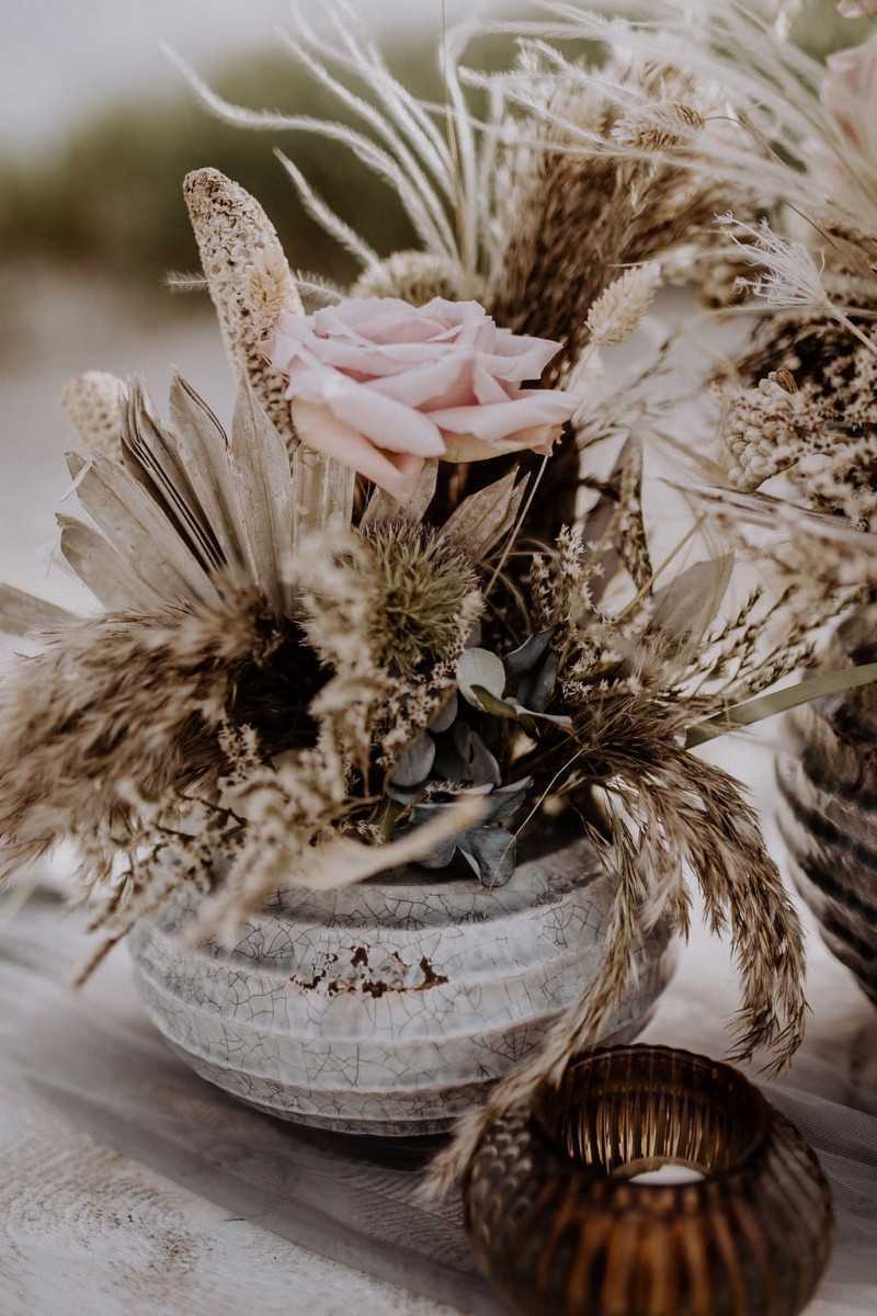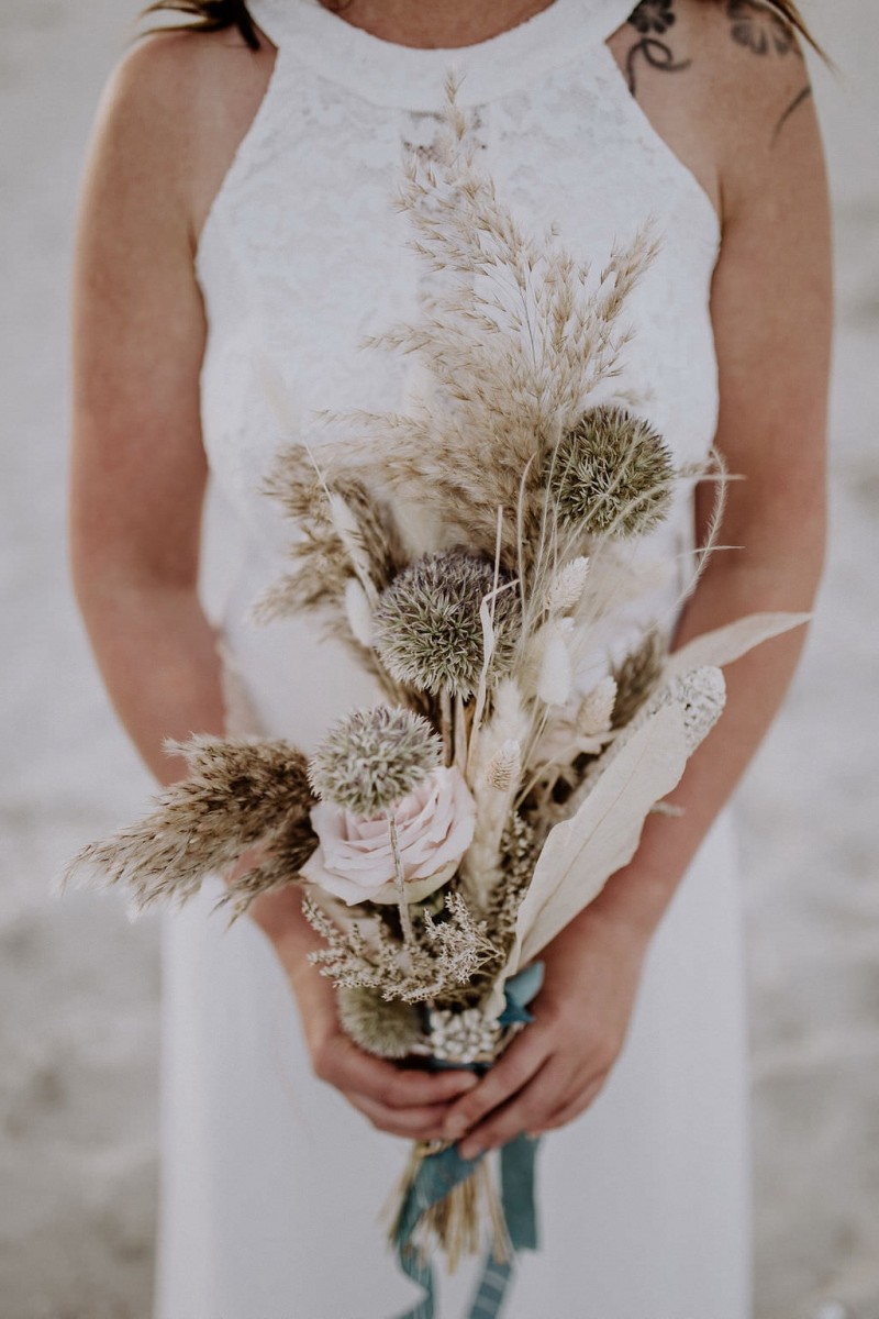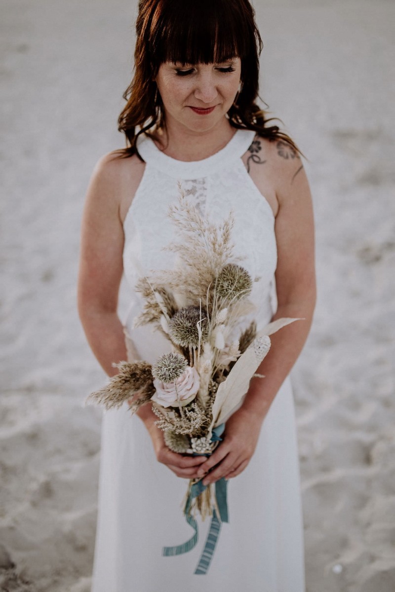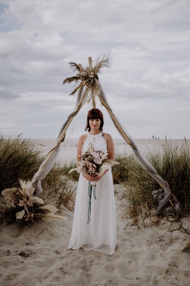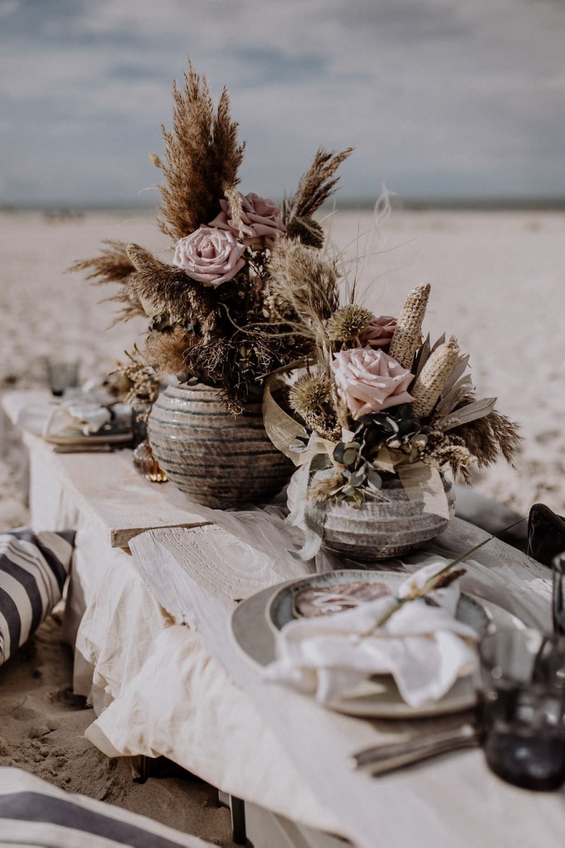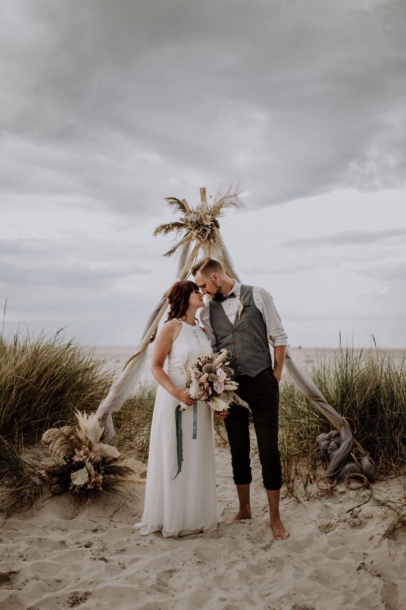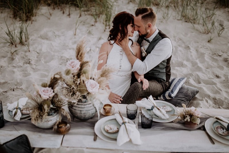 Und wieder geht es für uns Glückliche an den Strand. Für diese schöne Hochzeitsinspiration eines bohoinspirierten Elopements geht es an den Dünenstrand unserer Ostsee. Regenbogen Prerow ist eine Ferienanlage, die die liebe Hochzeitsplanerin Lisa von Time for Wedding für diese wundervolle Inspiration wählte. Lisa hat auch das Konzept dieser Inspiration entwickelt, geplant und umgesetzt, weshalb wir uns in all den schönen Strand- und Bohovibes suhlen dürfen. Während Hochzeitsfotografin Shelly von wild lights photography alles fotografisch für uns festgehalten hat, hat Hochzeitsvideograf Stephan von Spotlightcut ein Video für uns von diesem Tag gemacht. Dieses findet ihr ebenfalls in diesem Artikel, unter den wunderschönen Bildern. Doch kommen wir zur Inspiration selbst. Zwischen den, vom Wind bewegten, Sanddünen erwartet euch ein bezauberndes Table Setting im Stil eines romantischen Strandpicknicks. Kuschelige Kissen laden an die lange Tafel, die mit vielen Blumenarrangements aus naturbelassenen Trockenblumen und Rosen in zartem Rosé, dekoriert wurde. Große und kleine Keramikvasen, gemasertes Geschirr sowie kleine Teelichter geben der Tafel den wundervollen Bohovibe und einen leicht rauen Touch. Die feine Hochzeitspapeterie von Papeterie Berlin, platziert auf den Tellern neben den Leinenservietten, sorgt mit muschelinspirierten “Namensschildern“ und blauen Details für den harmonischen Feinschliff. Neben der Dekoration und Floristik dieses tollen Settings am Strand, kreierte Madelaine Eventfloristik auch noch eine Traulocation mit einem großen, blumenverzierten Traubogen. Auch für eine freie Trauung ein absoluter Hingucker, vor allem hier mit dem weitläufigen Blick aufs Meer! Sandra & Sven, das süße Brautpaar dieser Inspiration, durfte hier ihr intimes Elopement feiern. Gemeinsam mit ihrem süßen Vierbeiner genossen sie diese einmalige und romantische Zeit an diesem paradiesischen und liebevoll kreierten Bohostrand. Neben dem wundervoll natürlichen und dennoch eleganten Styling von Carolin Frixel und einem leichten Brautkleid für den Tanz durch den Sandstrand, könnt ihr bei Sandra gleich zwei bohoinspirierte Brautsträuße entdecken. Einen entwarf Madelaine Eventfloristik passend zum gesamten Setting, während sie den anderen etwas leichter, zarter und heller gestaltete. Als süßes Highlight erwartete die beiden noch eine wirklich bezaubernde Hochzeitstorte vom Tortenatelier Süße Flora. Franziska zauberte einen grandiosen Mix aus wilden Trockenblumen und der Schönheit des Meeres durch perfekt abgestimmte Blautöne. Eine wunderbar authentische und liebevolle Inspiration, die uns das Paradies direkt an den heimischen Strand bringt. Ganz viel Freude euch beim Hinwegträumen und Staunen!