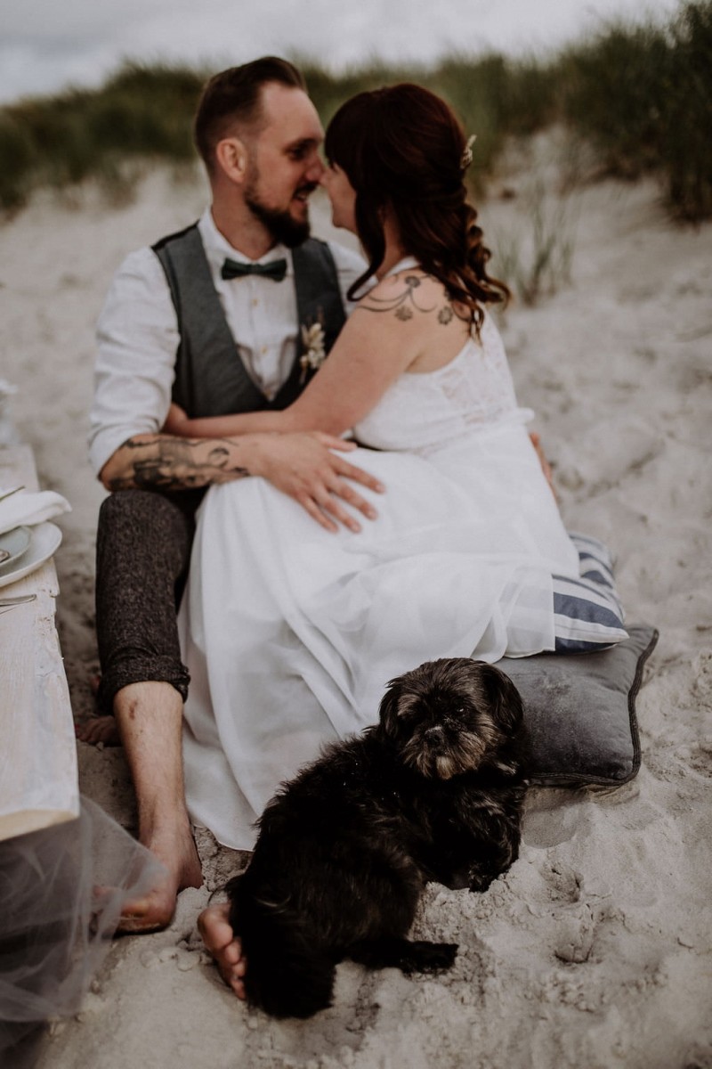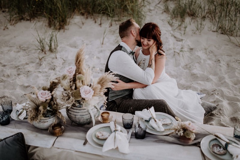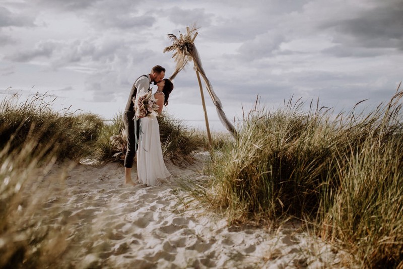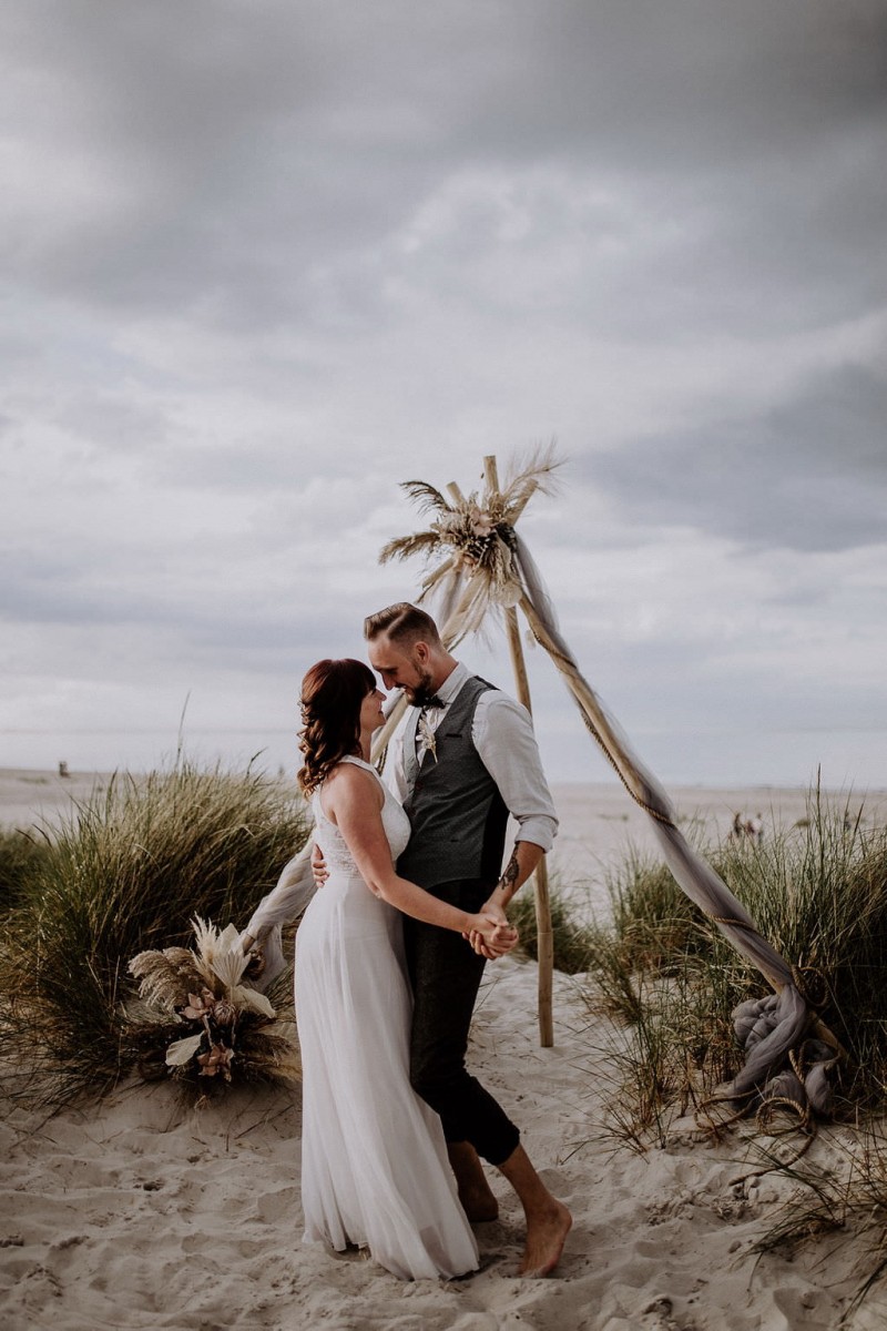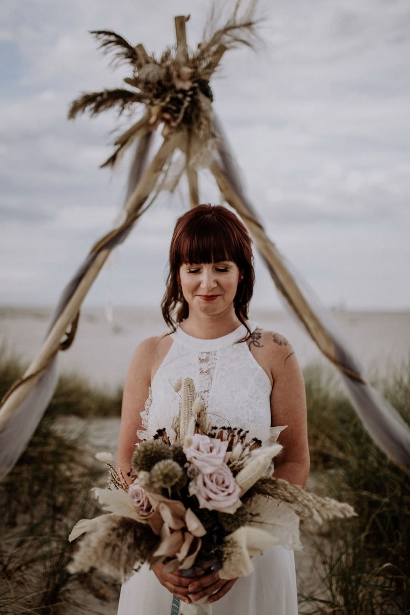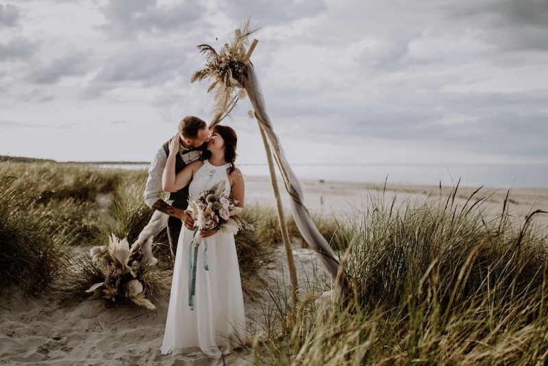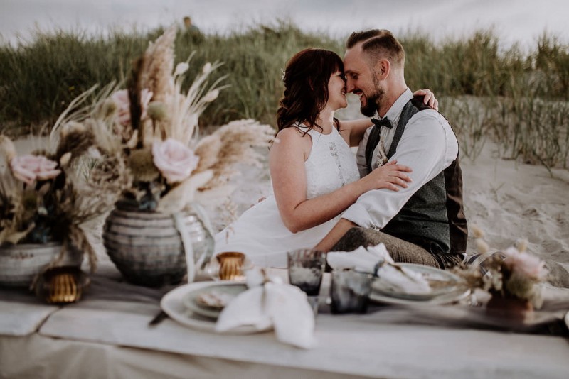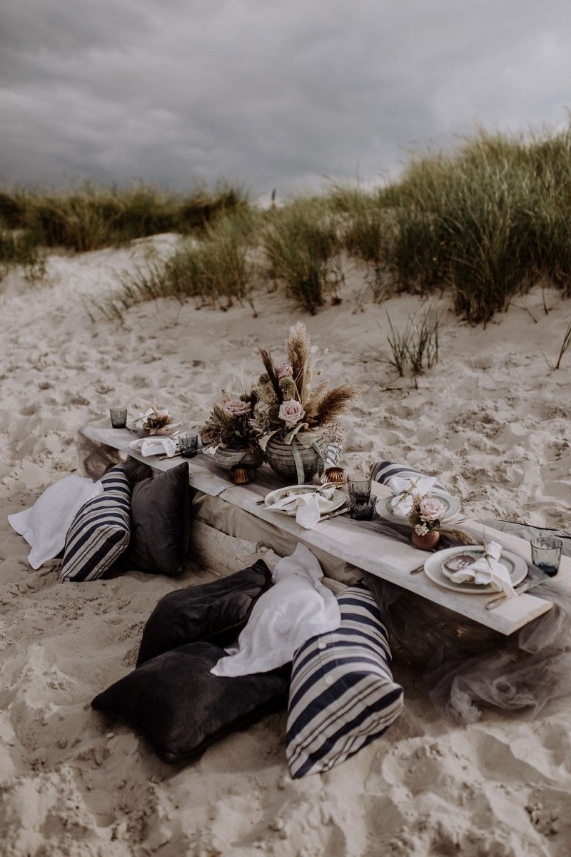 Und wieder geht es für uns Glückliche an den Strand. Für diese schöne Hochzeitsinspiration eines bohoinspirierten Elopements geht es an den Dünenstrand unserer Ostsee. Regenbogen Prerow ist eine Ferienanlage, die die liebe Hochzeitsplanerin Lisa von Time for Wedding für diese wundervolle Inspiration wählte. Lisa hat auch das Konzept dieser Inspiration entwickelt, geplant und umgesetzt, weshalb wir uns in all den schönen Strand- und Bohovibes suhlen dürfen. Während Hochzeitsfotografin Shelly von wild lights photography alles fotografisch für uns festgehalten hat, hat Hochzeitsvideograf Stephan von Spotlightcut ein Video für uns von diesem Tag gemacht. Dieses findet ihr ebenfalls in diesem Artikel, unter den wunderschönen Bildern. Doch kommen wir zur Inspiration selbst. Zwischen den, vom Wind bewegten, Sanddünen erwartet euch ein bezauberndes Table Setting im Stil eines romantischen Strandpicknicks. Kuschelige Kissen laden an die lange Tafel, die mit vielen Blumenarrangements aus naturbelassenen Trockenblumen und Rosen in zartem Rosé, dekoriert wurde. Große und kleine Keramikvasen, gemasertes Geschirr sowie kleine Teelichter geben der Tafel den wundervollen Bohovibe und einen leicht rauen Touch. Die feine Hochzeitspapeterie von Papeterie Berlin, platziert auf den Tellern neben den Leinenservietten, sorgt mit muschelinspirierten “Namensschildern“ und blauen Details für den harmonischen Feinschliff. Neben der Dekoration und Floristik dieses tollen Settings am Strand, kreierte Madelaine Eventfloristik auch noch eine Traulocation mit einem großen, blumenverzierten Traubogen. Auch für eine freie Trauung ein absoluter Hingucker, vor allem hier mit dem weitläufigen Blick aufs Meer! Sandra & Sven, das süße Brautpaar dieser Inspiration, durfte hier ihr intimes Elopement feiern. Gemeinsam mit ihrem süßen Vierbeiner genossen sie diese einmalige und romantische Zeit an diesem paradiesischen und liebevoll kreierten Bohostrand. Neben dem wundervoll natürlichen und dennoch eleganten Styling von Carolin Frixel und einem leichten Brautkleid für den Tanz durch den Sandstrand, könnt ihr bei Sandra gleich zwei bohoinspirierte Brautsträuße entdecken. Einen entwarf Madelaine Eventfloristik passend zum gesamten Setting, während sie den anderen etwas leichter, zarter und heller gestaltete. Als süßes Highlight erwartete die beiden noch eine wirklich bezaubernde Hochzeitstorte vom Tortenatelier Süße Flora. Franziska zauberte einen grandiosen Mix aus wilden Trockenblumen und der Schönheit des Meeres durch perfekt abgestimmte Blautöne. Eine wunderbar authentische und liebevolle Inspiration, die uns das Paradies direkt an den heimischen Strand bringt. Ganz viel Freude euch beim Hinwegträumen und Staunen!
