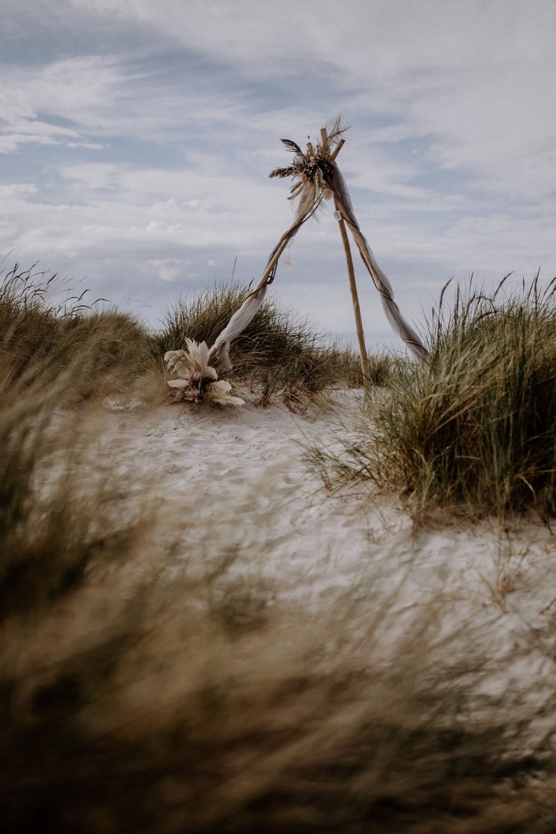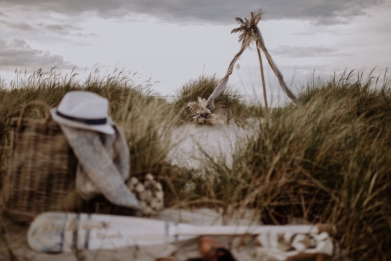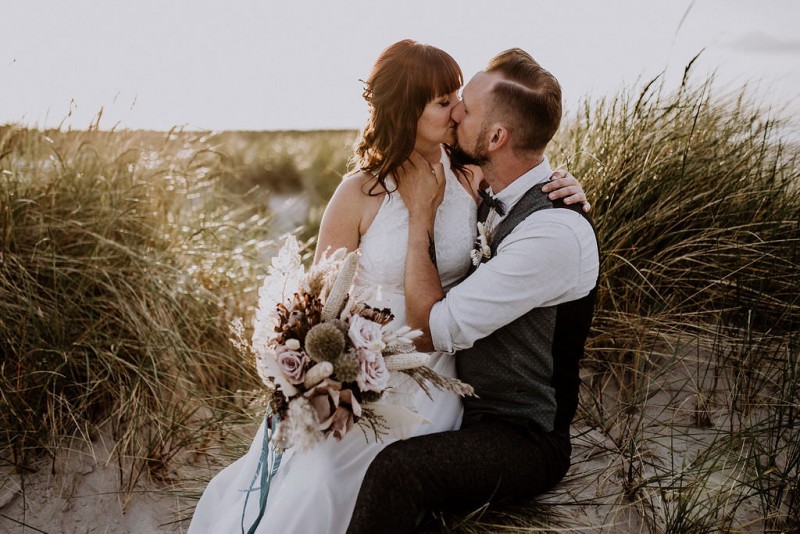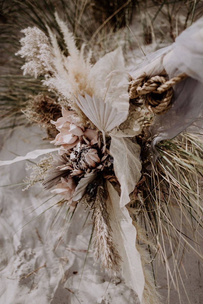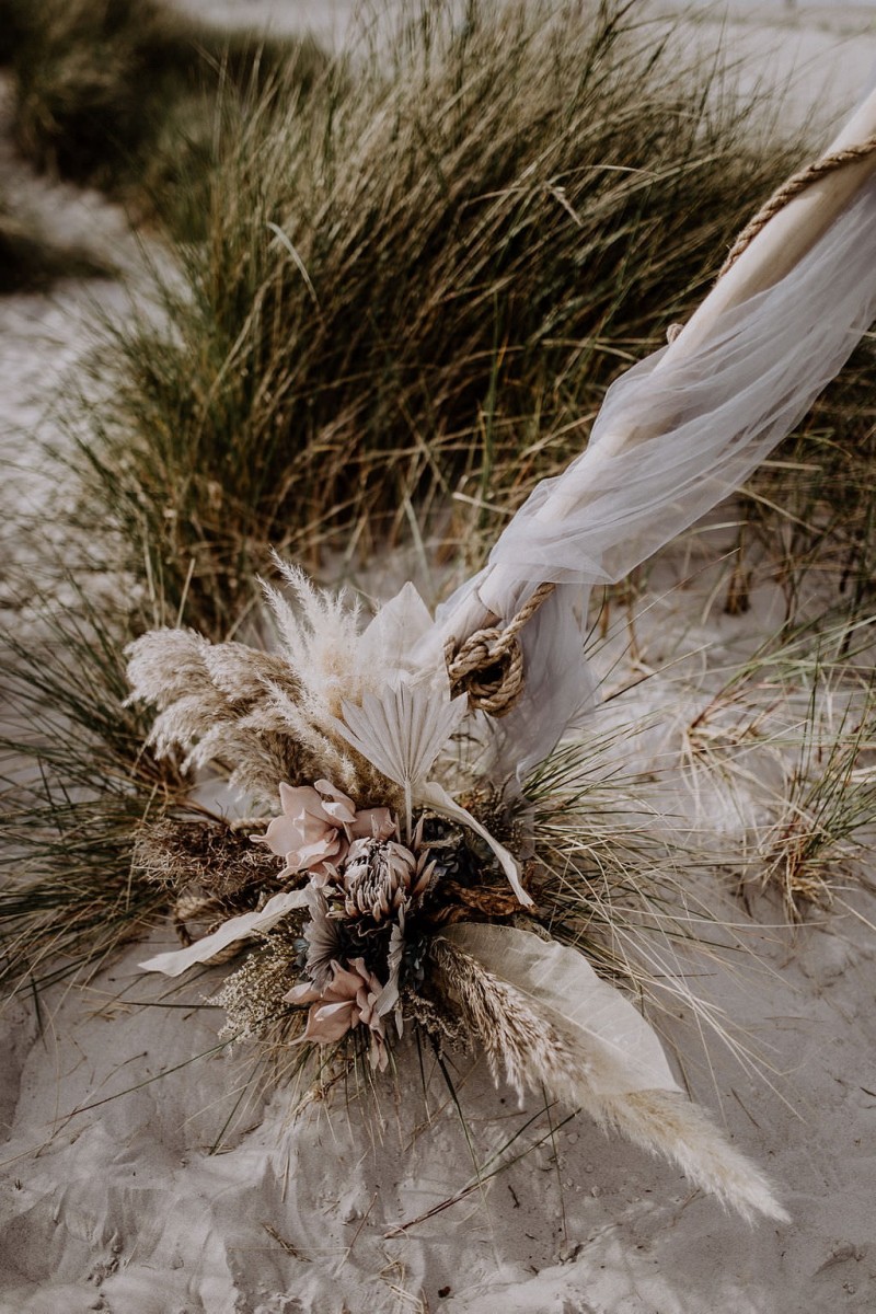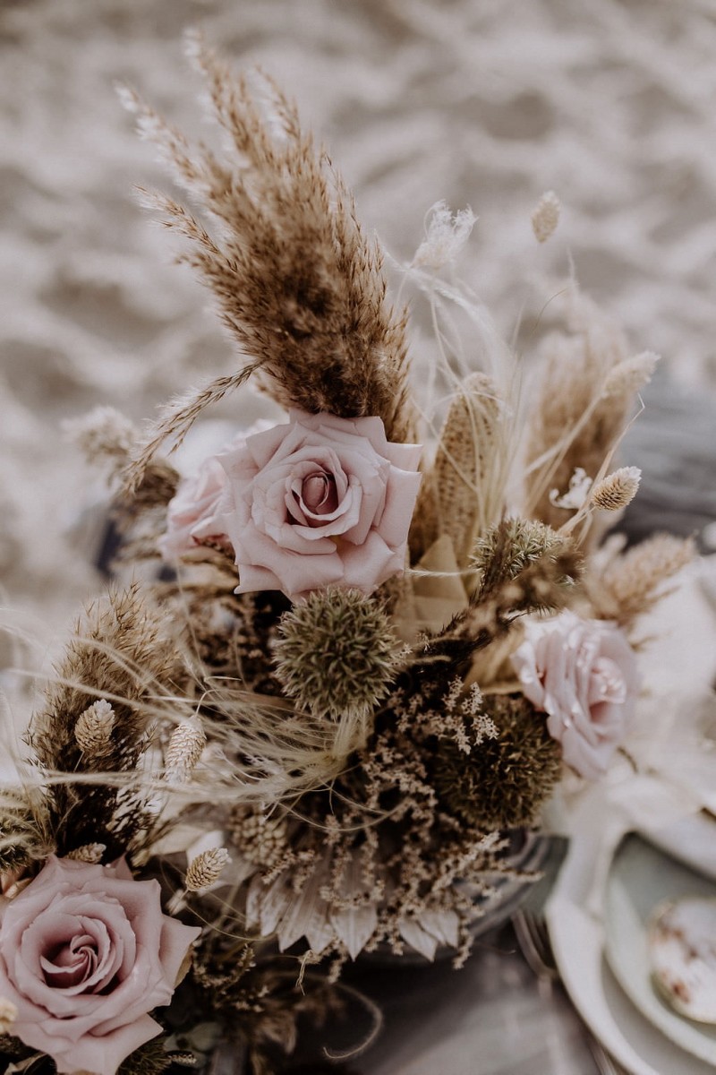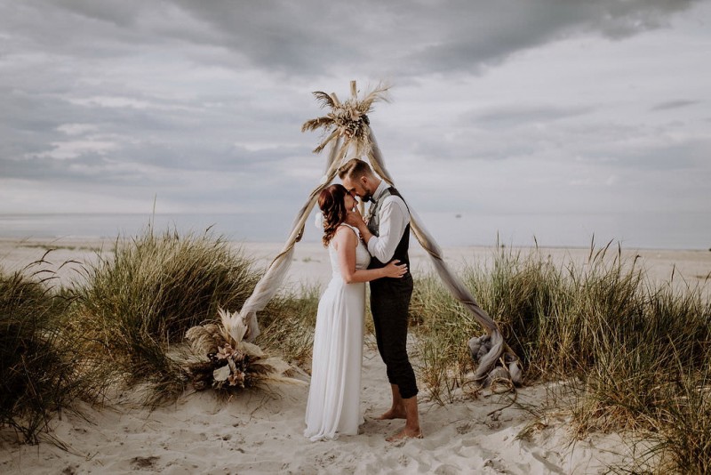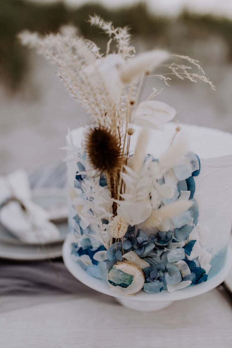 Und wieder geht es für uns Glückliche an den Strand. Für diese schöne Hochzeitsinspiration eines bohoinspirierten Elopements geht es an den Dünenstrand unserer Ostsee. Regenbogen Prerow ist eine Ferienanlage, die die liebe Hochzeitsplanerin Lisa von Time for Wedding für diese wundervolle Inspiration wählte. Lisa hat auch das Konzept dieser Inspiration entwickelt, geplant und umgesetzt, weshalb wir uns in all den schönen Strand- und Bohovibes suhlen dürfen. Während Hochzeitsfotografin Shelly von wild lights photography alles fotografisch für uns festgehalten hat, hat Hochzeitsvideograf Stephan von Spotlightcut ein Video für uns von diesem Tag gemacht. Dieses findet ihr ebenfalls in diesem Artikel, unter den wunderschönen Bildern. Doch kommen wir zur Inspiration selbst. Zwischen den, vom Wind bewegten, Sanddünen erwartet euch ein bezauberndes Table Setting im Stil eines romantischen Strandpicknicks. Kuschelige Kissen laden an die lange Tafel, die mit vielen Blumenarrangements aus naturbelassenen Trockenblumen und Rosen in zartem Rosé, dekoriert wurde. Große und kleine Keramikvasen, gemasertes Geschirr sowie kleine Teelichter geben der Tafel den wundervollen Bohovibe und einen leicht rauen Touch. Die feine Hochzeitspapeterie von Papeterie Berlin, platziert auf den Tellern neben den Leinenservietten, sorgt mit muschelinspirierten “Namensschildern“ und blauen Details für den harmonischen Feinschliff. Neben der Dekoration und Floristik dieses tollen Settings am Strand, kreierte Madelaine Eventfloristik auch noch eine Traulocation mit einem großen, blumenverzierten Traubogen. Auch für eine freie Trauung ein absoluter Hingucker, vor allem hier mit dem weitläufigen Blick aufs Meer! Sandra & Sven, das süße Brautpaar dieser Inspiration, durfte hier ihr intimes Elopement feiern. Gemeinsam mit ihrem süßen Vierbeiner genossen sie diese einmalige und romantische Zeit an diesem paradiesischen und liebevoll kreierten Bohostrand. Neben dem wundervoll natürlichen und dennoch eleganten Styling von Carolin Frixel und einem leichten Brautkleid für den Tanz durch den Sandstrand, könnt ihr bei Sandra gleich zwei bohoinspirierte Brautsträuße entdecken. Einen entwarf Madelaine Eventfloristik passend zum gesamten Setting, während sie den anderen etwas leichter, zarter und heller gestaltete. Als süßes Highlight erwartete die beiden noch eine wirklich bezaubernde Hochzeitstorte vom Tortenatelier Süße Flora. Franziska zauberte einen grandiosen Mix aus wilden Trockenblumen und der Schönheit des Meeres durch perfekt abgestimmte Blautöne. Eine wunderbar authentische und liebevolle Inspiration, die uns das Paradies direkt an den heimischen Strand bringt. Ganz viel Freude euch beim Hinwegträumen und Staunen!