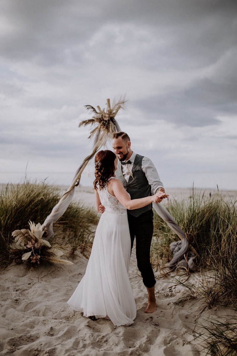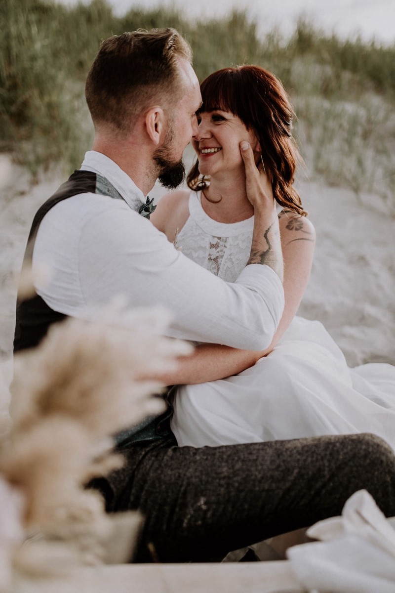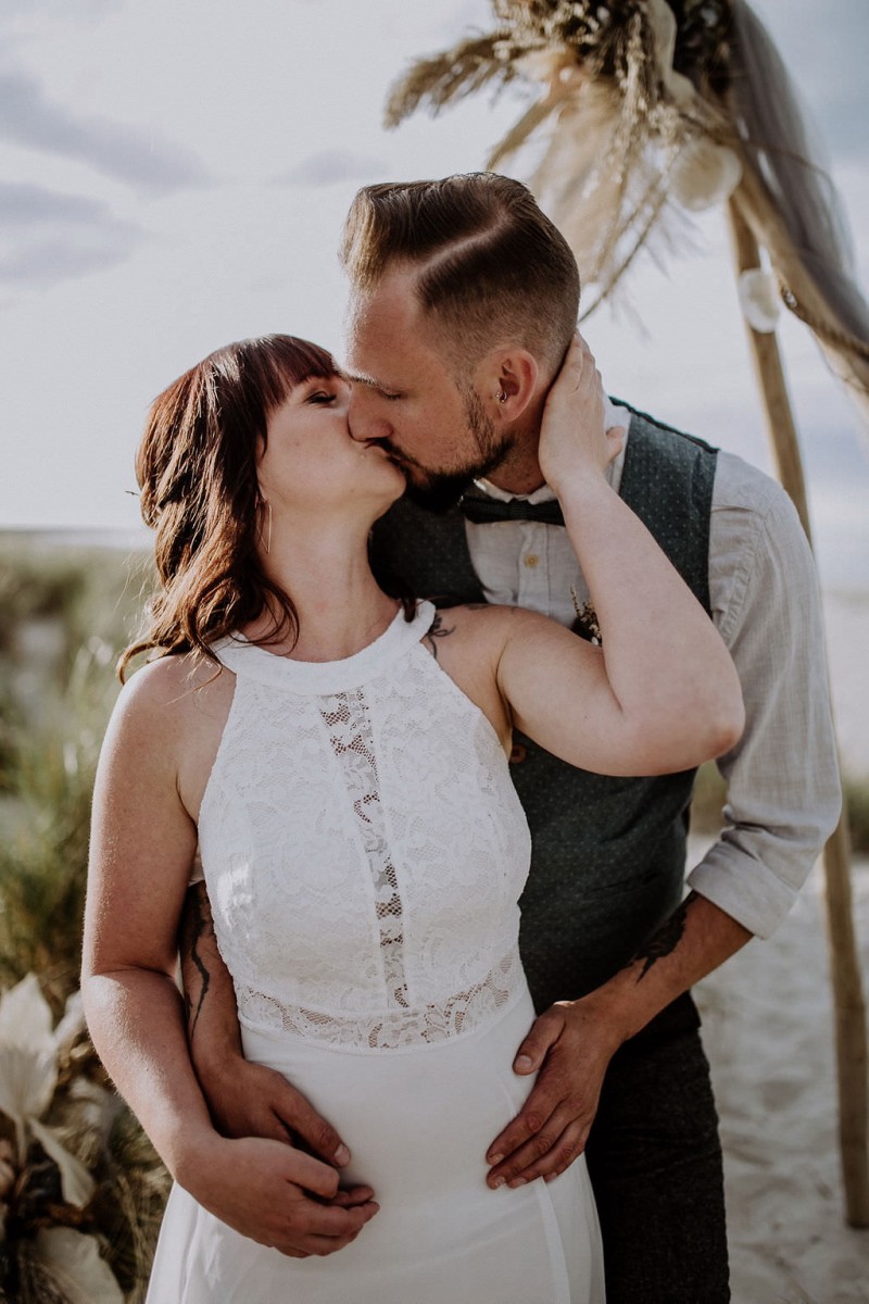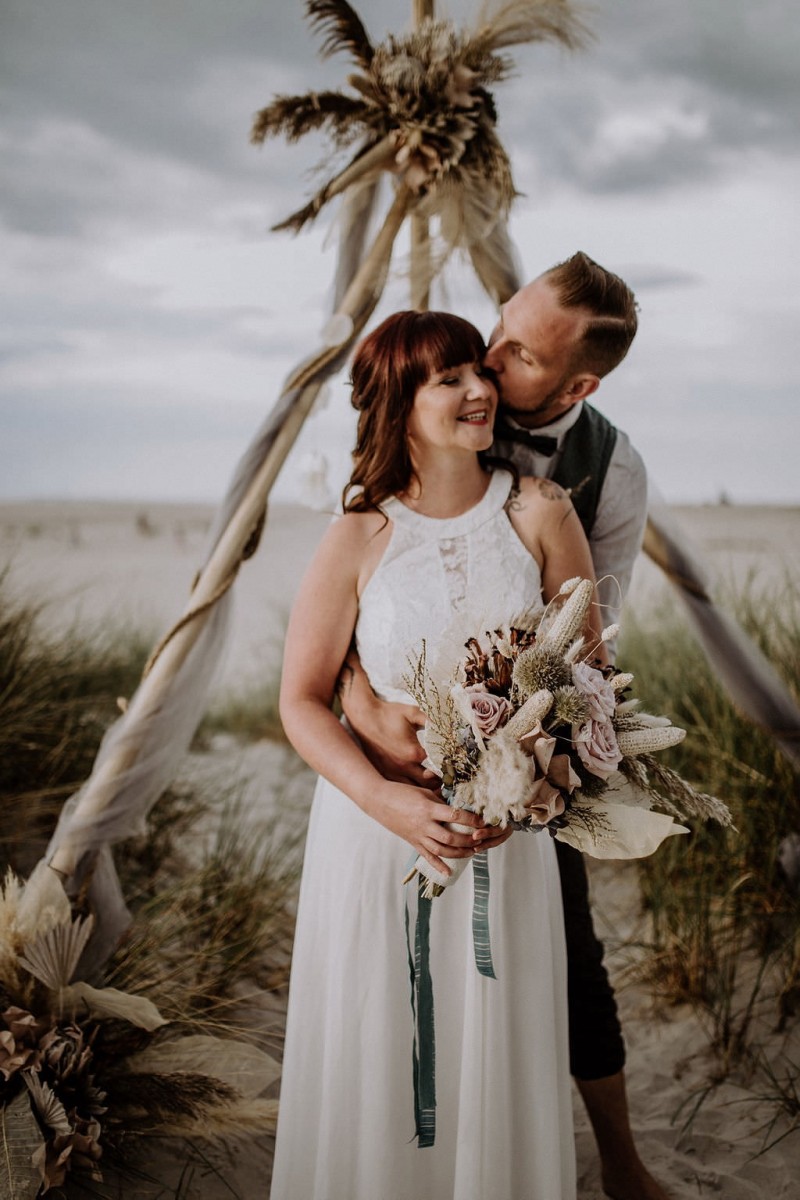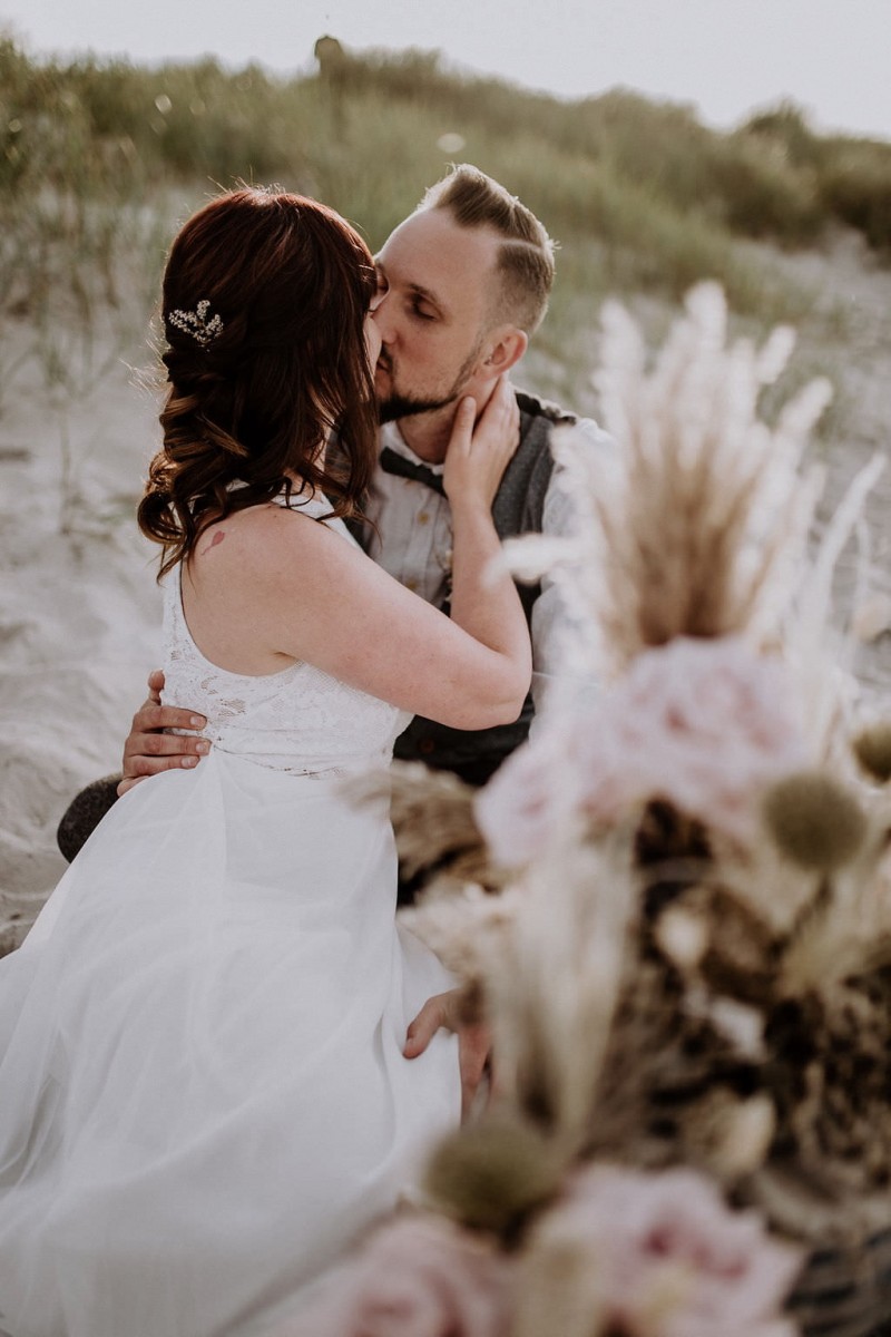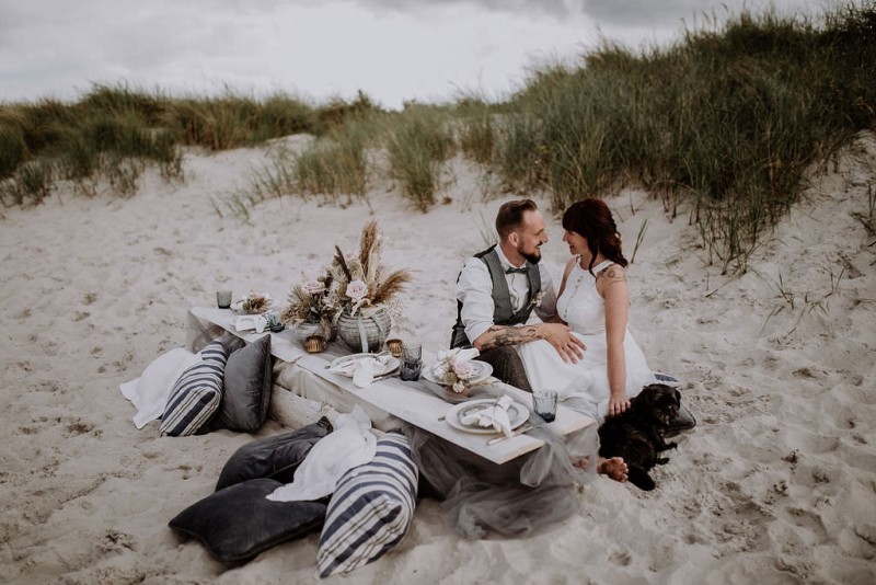 Und wieder geht es für uns Glückliche an den Strand. Für diese schöne Hochzeitsinspiration eines bohoinspirierten Elopements geht es an den Dünenstrand unserer Ostsee. Regenbogen Prerow ist eine Ferienanlage, die die liebe Hochzeitsplanerin Lisa von Time for Wedding für diese wundervolle Inspiration wählte. Lisa hat auch das Konzept dieser Inspiration entwickelt, geplant und umgesetzt, weshalb wir uns in all den schönen Strand- und Bohovibes suhlen dürfen. Während Hochzeitsfotografin Shelly von wild lights photography alles fotografisch für uns festgehalten hat, hat Hochzeitsvideograf Stephan von Spotlightcut ein Video für uns von diesem Tag gemacht. Dieses findet ihr ebenfalls in diesem Artikel, unter den wunderschönen Bildern. Doch kommen wir zur Inspiration selbst. Zwischen den, vom Wind bewegten, Sanddünen erwartet euch ein bezauberndes Table Setting im Stil eines romantischen Strandpicknicks. Kuschelige Kissen laden an die lange Tafel, die mit vielen Blumenarrangements aus naturbelassenen Trockenblumen und Rosen in zartem Rosé, dekoriert wurde. Große und kleine Keramikvasen, gemasertes Geschirr sowie kleine Teelichter geben der Tafel den wundervollen Bohovibe und einen leicht rauen Touch. Die feine Hochzeitspapeterie von Papeterie Berlin, platziert auf den Tellern neben den Leinenservietten, sorgt mit muschelinspirierten “Namensschildern“ und blauen Details für den harmonischen Feinschliff. Neben der Dekoration und Floristik dieses tollen Settings am Strand, kreierte Madelaine Eventfloristik auch noch eine Traulocation mit einem großen, blumenverzierten Traubogen. Auch für eine freie Trauung ein absoluter Hingucker, vor allem hier mit dem weitläufigen Blick aufs Meer! Sandra & Sven, das süße Brautpaar dieser Inspiration, durfte hier ihr intimes Elopement feiern. Gemeinsam mit ihrem süßen Vierbeiner genossen sie diese einmalige und romantische Zeit an diesem paradiesischen und liebevoll kreierten Bohostrand. Neben dem wundervoll natürlichen und dennoch eleganten Styling von Carolin Frixel und einem leichten Brautkleid für den Tanz durch den Sandstrand, könnt ihr bei Sandra gleich zwei bohoinspirierte Brautsträuße entdecken. Einen entwarf Madelaine Eventfloristik passend zum gesamten Setting, während sie den anderen etwas leichter, zarter und heller gestaltete. Als süßes Highlight erwartete die beiden noch eine wirklich bezaubernde Hochzeitstorte vom Tortenatelier Süße Flora. Franziska zauberte einen grandiosen Mix aus wilden Trockenblumen und der Schönheit des Meeres durch perfekt abgestimmte Blautöne. Eine wunderbar authentische und liebevolle Inspiration, die uns das Paradies direkt an den heimischen Strand bringt. Ganz viel Freude euch beim Hinwegträumen und Staunen!