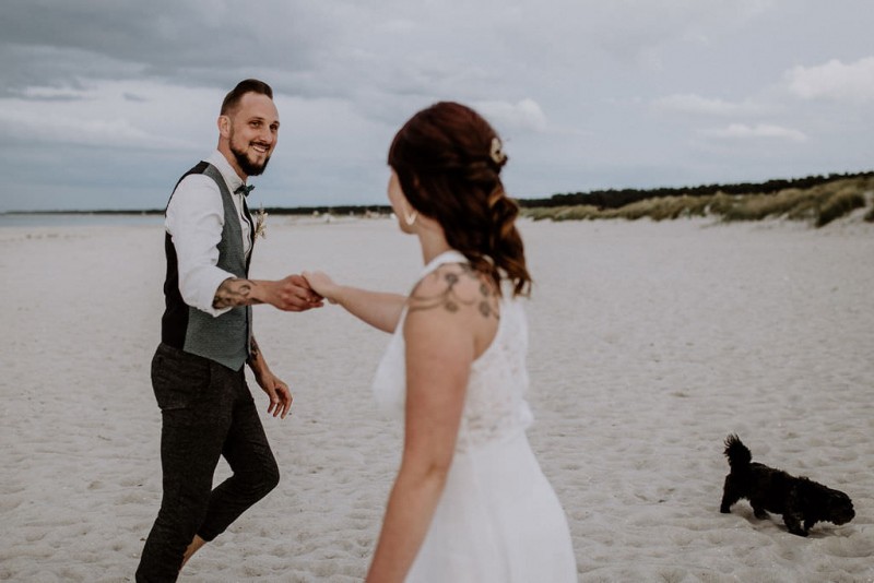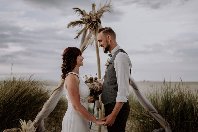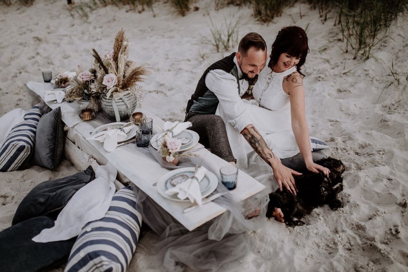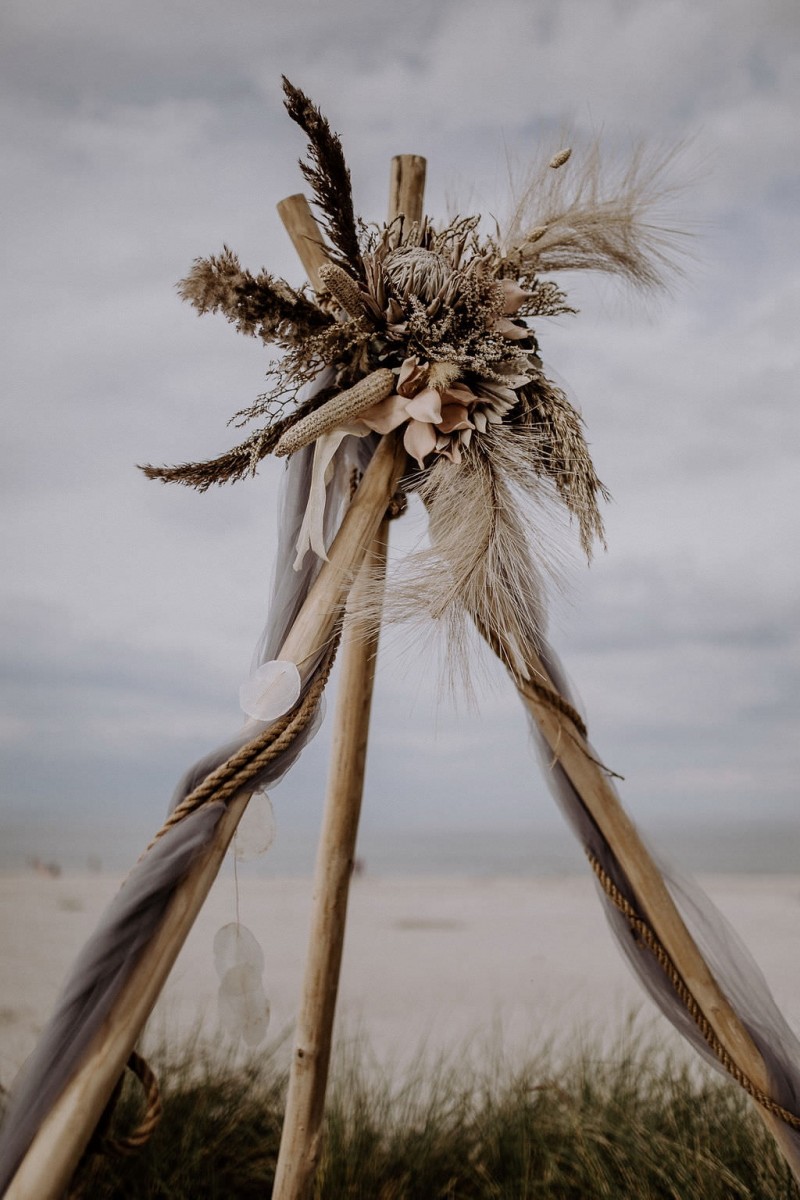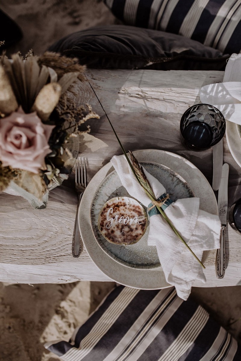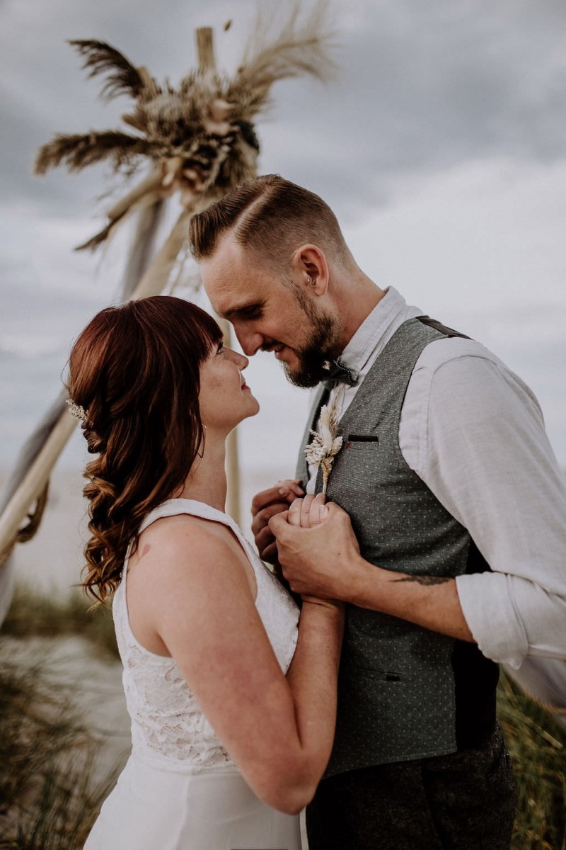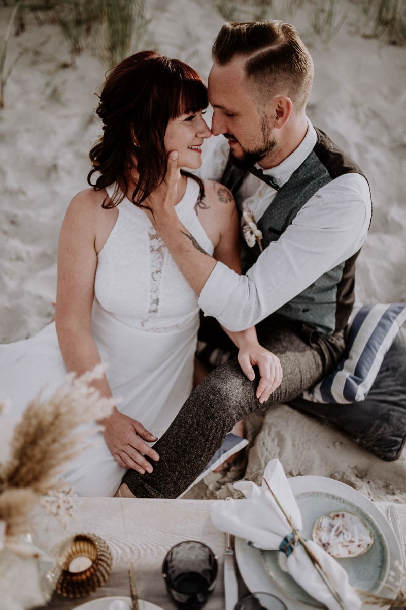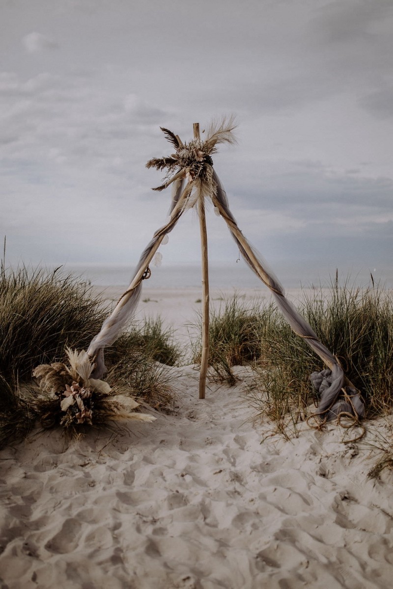 Und wieder geht es für uns Glückliche an den Strand. Für diese schöne Hochzeitsinspiration eines bohoinspirierten Elopements geht es an den Dünenstrand unserer Ostsee. Regenbogen Prerow ist eine Ferienanlage, die die liebe Hochzeitsplanerin Lisa von Time for Wedding für diese wundervolle Inspiration wählte. Lisa hat auch das Konzept dieser Inspiration entwickelt, geplant und umgesetzt, weshalb wir uns in all den schönen Strand- und Bohovibes suhlen dürfen. Während Hochzeitsfotografin Shelly von wild lights photography alles fotografisch für uns festgehalten hat, hat Hochzeitsvideograf Stephan von Spotlightcut ein Video für uns von diesem Tag gemacht. Dieses findet ihr ebenfalls in diesem Artikel, unter den wunderschönen Bildern. Doch kommen wir zur Inspiration selbst. Zwischen den, vom Wind bewegten, Sanddünen erwartet euch ein bezauberndes Table Setting im Stil eines romantischen Strandpicknicks. Kuschelige Kissen laden an die lange Tafel, die mit vielen Blumenarrangements aus naturbelassenen Trockenblumen und Rosen in zartem Rosé, dekoriert wurde. Große und kleine Keramikvasen, gemasertes Geschirr sowie kleine Teelichter geben der Tafel den wundervollen Bohovibe und einen leicht rauen Touch. Die feine Hochzeitspapeterie von Papeterie Berlin, platziert auf den Tellern neben den Leinenservietten, sorgt mit muschelinspirierten “Namensschildern“ und blauen Details für den harmonischen Feinschliff. Neben der Dekoration und Floristik dieses tollen Settings am Strand, kreierte Madelaine Eventfloristik auch noch eine Traulocation mit einem großen, blumenverzierten Traubogen. Auch für eine freie Trauung ein absoluter Hingucker, vor allem hier mit dem weitläufigen Blick aufs Meer! Sandra & Sven, das süße Brautpaar dieser Inspiration, durfte hier ihr intimes Elopement feiern. Gemeinsam mit ihrem süßen Vierbeiner genossen sie diese einmalige und romantische Zeit an diesem paradiesischen und liebevoll kreierten Bohostrand. Neben dem wundervoll natürlichen und dennoch eleganten Styling von Carolin Frixel und einem leichten Brautkleid für den Tanz durch den Sandstrand, könnt ihr bei Sandra gleich zwei bohoinspirierte Brautsträuße entdecken. Einen entwarf Madelaine Eventfloristik passend zum gesamten Setting, während sie den anderen etwas leichter, zarter und heller gestaltete. Als süßes Highlight erwartete die beiden noch eine wirklich bezaubernde Hochzeitstorte vom Tortenatelier Süße Flora. Franziska zauberte einen grandiosen Mix aus wilden Trockenblumen und der Schönheit des Meeres durch perfekt abgestimmte Blautöne. Eine wunderbar authentische und liebevolle Inspiration, die uns das Paradies direkt an den heimischen Strand bringt. Ganz viel Freude euch beim Hinwegträumen und Staunen!
