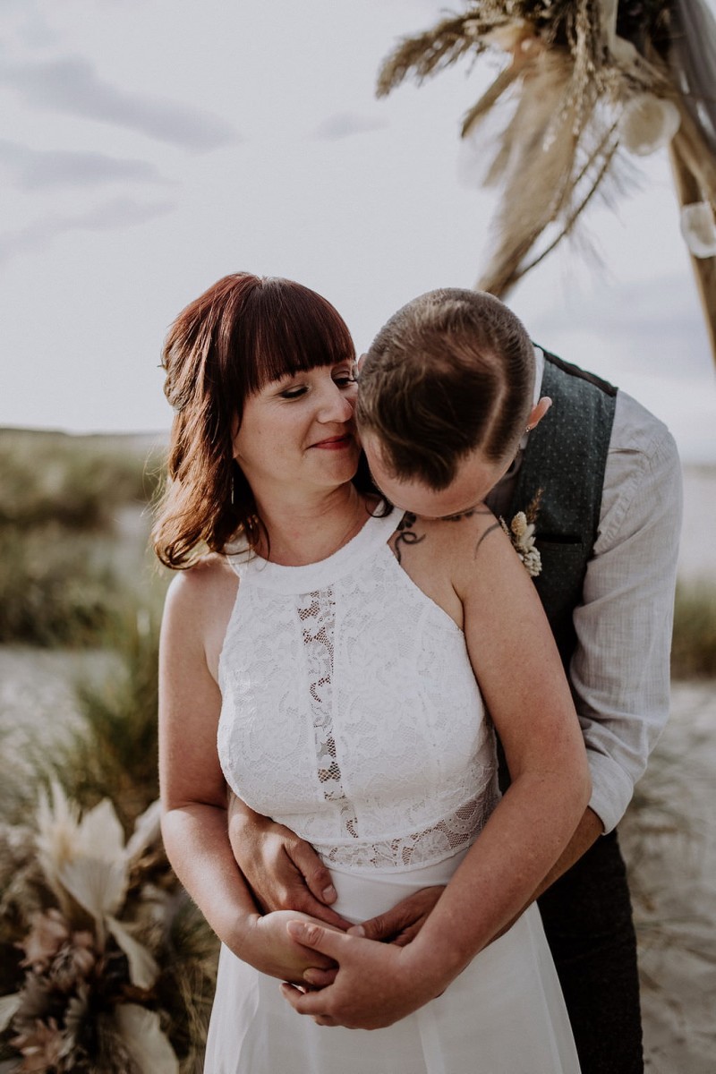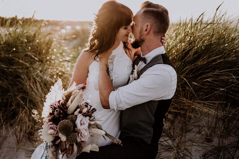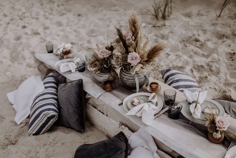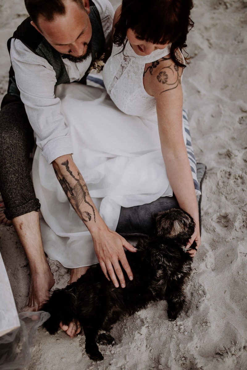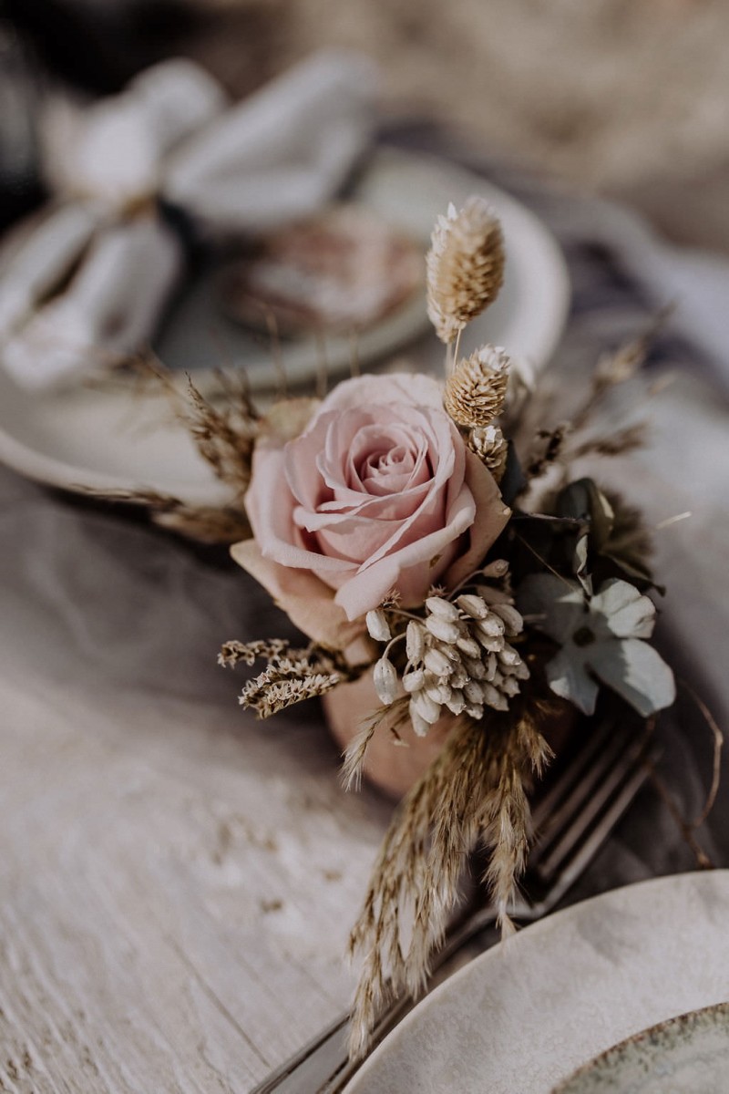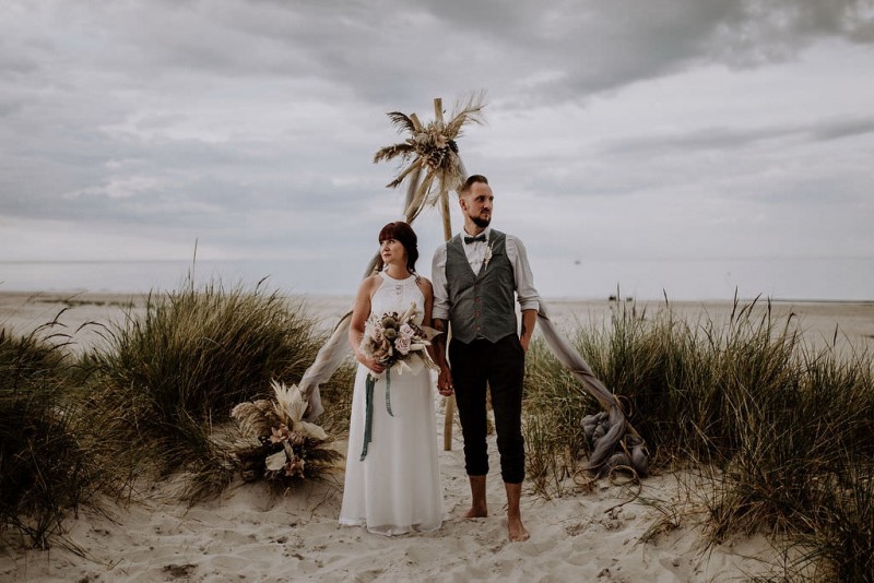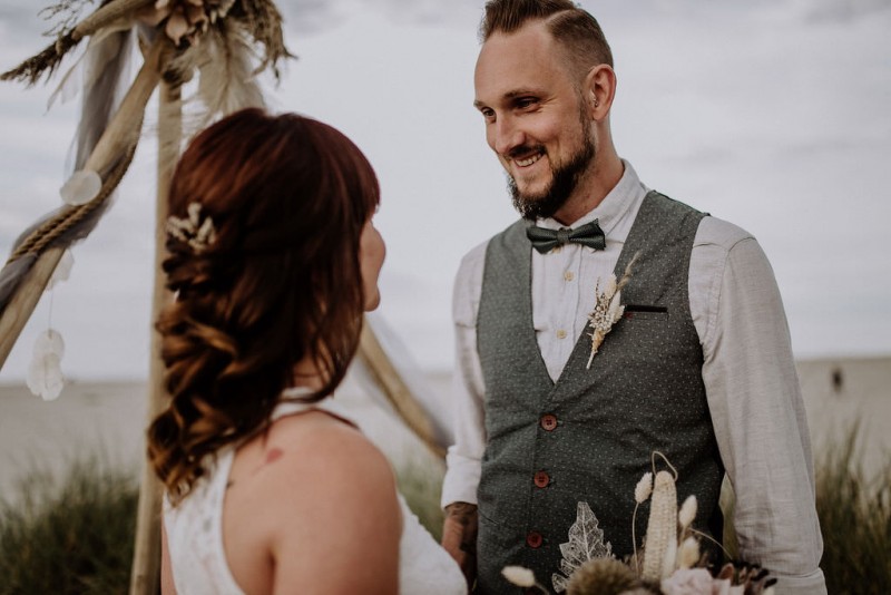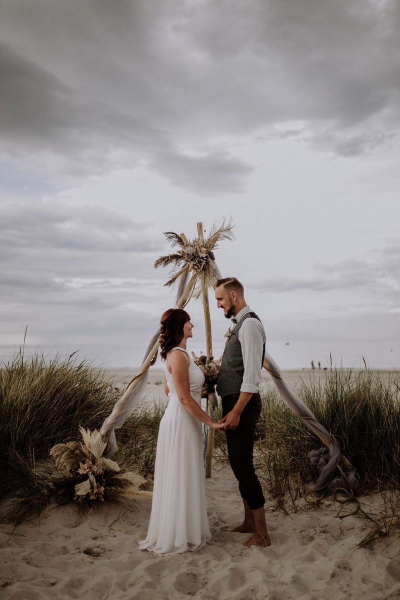 Und wieder geht es für uns Glückliche an den Strand. Für diese schöne Hochzeitsinspiration eines bohoinspirierten Elopements geht es an den Dünenstrand unserer Ostsee. Regenbogen Prerow ist eine Ferienanlage, die die liebe Hochzeitsplanerin Lisa von Time for Wedding für diese wundervolle Inspiration wählte. Lisa hat auch das Konzept dieser Inspiration entwickelt, geplant und umgesetzt, weshalb wir uns in all den schönen Strand- und Bohovibes suhlen dürfen. Während Hochzeitsfotografin Shelly von wild lights photography alles fotografisch für uns festgehalten hat, hat Hochzeitsvideograf Stephan von Spotlightcut ein Video für uns von diesem Tag gemacht. Dieses findet ihr ebenfalls in diesem Artikel, unter den wunderschönen Bildern. Doch kommen wir zur Inspiration selbst. Zwischen den, vom Wind bewegten, Sanddünen erwartet euch ein bezauberndes Table Setting im Stil eines romantischen Strandpicknicks. Kuschelige Kissen laden an die lange Tafel, die mit vielen Blumenarrangements aus naturbelassenen Trockenblumen und Rosen in zartem Rosé, dekoriert wurde. Große und kleine Keramikvasen, gemasertes Geschirr sowie kleine Teelichter geben der Tafel den wundervollen Bohovibe und einen leicht rauen Touch. Die feine Hochzeitspapeterie von Papeterie Berlin, platziert auf den Tellern neben den Leinenservietten, sorgt mit muschelinspirierten “Namensschildern“ und blauen Details für den harmonischen Feinschliff. Neben der Dekoration und Floristik dieses tollen Settings am Strand, kreierte Madelaine Eventfloristik auch noch eine Traulocation mit einem großen, blumenverzierten Traubogen. Auch für eine freie Trauung ein absoluter Hingucker, vor allem hier mit dem weitläufigen Blick aufs Meer! Sandra & Sven, das süße Brautpaar dieser Inspiration, durfte hier ihr intimes Elopement feiern. Gemeinsam mit ihrem süßen Vierbeiner genossen sie diese einmalige und romantische Zeit an diesem paradiesischen und liebevoll kreierten Bohostrand. Neben dem wundervoll natürlichen und dennoch eleganten Styling von Carolin Frixel und einem leichten Brautkleid für den Tanz durch den Sandstrand, könnt ihr bei Sandra gleich zwei bohoinspirierte Brautsträuße entdecken. Einen entwarf Madelaine Eventfloristik passend zum gesamten Setting, während sie den anderen etwas leichter, zarter und heller gestaltete. Als süßes Highlight erwartete die beiden noch eine wirklich bezaubernde Hochzeitstorte vom Tortenatelier Süße Flora. Franziska zauberte einen grandiosen Mix aus wilden Trockenblumen und der Schönheit des Meeres durch perfekt abgestimmte Blautöne. Eine wunderbar authentische und liebevolle Inspiration, die uns das Paradies direkt an den heimischen Strand bringt. Ganz viel Freude euch beim Hinwegträumen und Staunen!