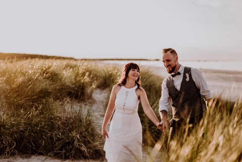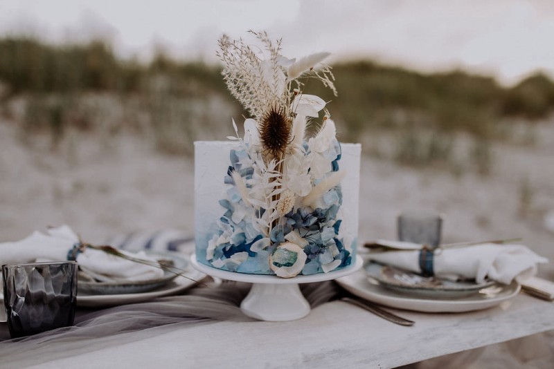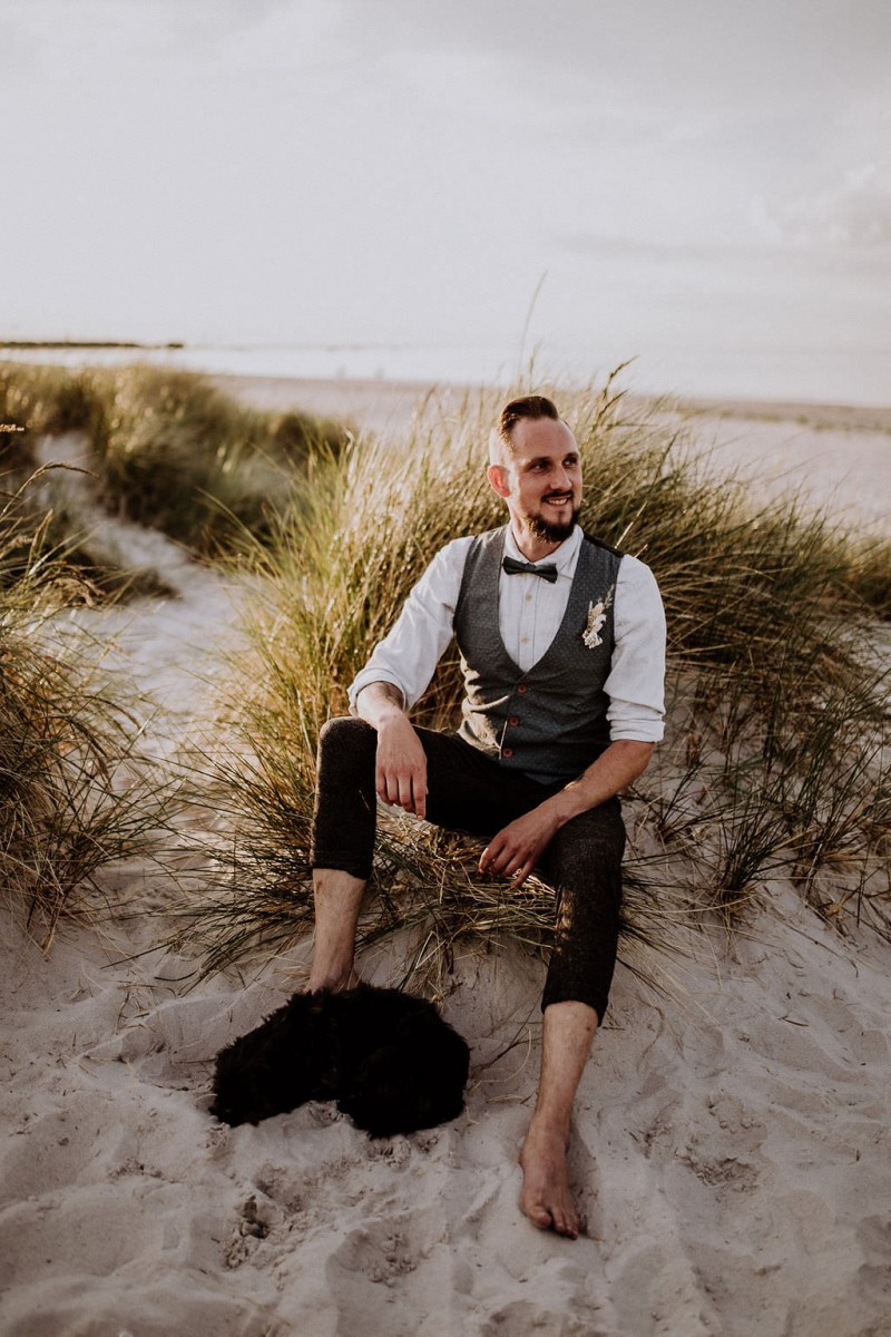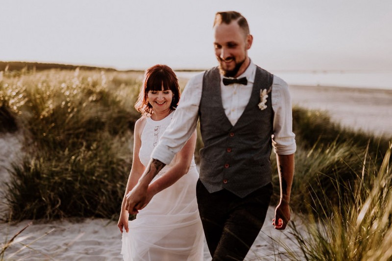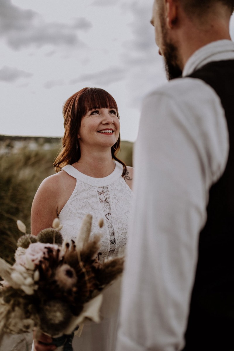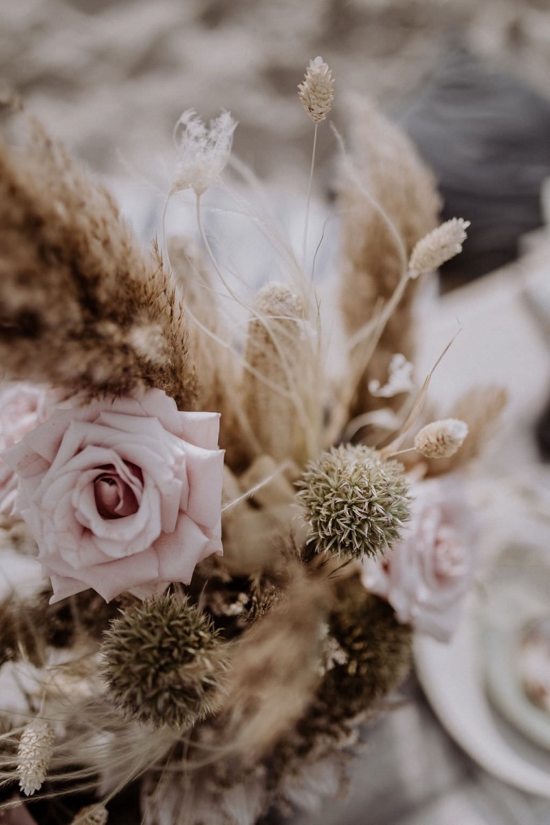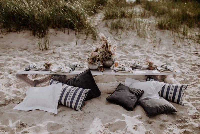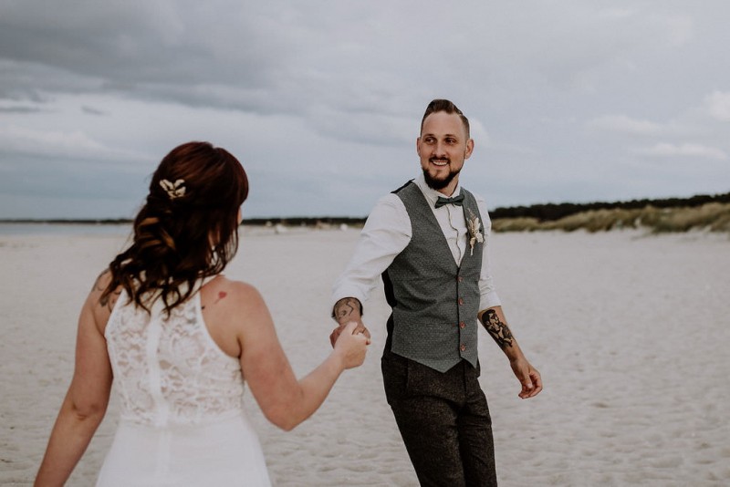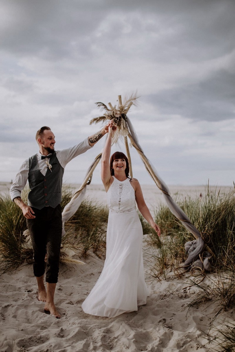 Und wieder geht es für uns Glückliche an den Strand. Für diese schöne Hochzeitsinspiration eines bohoinspirierten Elopements geht es an den Dünenstrand unserer Ostsee. Regenbogen Prerow ist eine Ferienanlage, die die liebe Hochzeitsplanerin Lisa von Time for Wedding für diese wundervolle Inspiration wählte. Lisa hat auch das Konzept dieser Inspiration entwickelt, geplant und umgesetzt, weshalb wir uns in all den schönen Strand- und Bohovibes suhlen dürfen. Während Hochzeitsfotografin Shelly von wild lights photography alles fotografisch für uns festgehalten hat, hat Hochzeitsvideograf Stephan von Spotlightcut ein Video für uns von diesem Tag gemacht. Dieses findet ihr ebenfalls in diesem Artikel, unter den wunderschönen Bildern. Doch kommen wir zur Inspiration selbst. Zwischen den, vom Wind bewegten, Sanddünen erwartet euch ein bezauberndes Table Setting im Stil eines romantischen Strandpicknicks. Kuschelige Kissen laden an die lange Tafel, die mit vielen Blumenarrangements aus naturbelassenen Trockenblumen und Rosen in zartem Rosé, dekoriert wurde. Große und kleine Keramikvasen, gemasertes Geschirr sowie kleine Teelichter geben der Tafel den wundervollen Bohovibe und einen leicht rauen Touch. Die feine Hochzeitspapeterie von Papeterie Berlin, platziert auf den Tellern neben den Leinenservietten, sorgt mit muschelinspirierten “Namensschildern“ und blauen Details für den harmonischen Feinschliff. Neben der Dekoration und Floristik dieses tollen Settings am Strand, kreierte Madelaine Eventfloristik auch noch eine Traulocation mit einem großen, blumenverzierten Traubogen. Auch für eine freie Trauung ein absoluter Hingucker, vor allem hier mit dem weitläufigen Blick aufs Meer! Sandra & Sven, das süße Brautpaar dieser Inspiration, durfte hier ihr intimes Elopement feiern. Gemeinsam mit ihrem süßen Vierbeiner genossen sie diese einmalige und romantische Zeit an diesem paradiesischen und liebevoll kreierten Bohostrand. Neben dem wundervoll natürlichen und dennoch eleganten Styling von Carolin Frixel und einem leichten Brautkleid für den Tanz durch den Sandstrand, könnt ihr bei Sandra gleich zwei bohoinspirierte Brautsträuße entdecken. Einen entwarf Madelaine Eventfloristik passend zum gesamten Setting, während sie den anderen etwas leichter, zarter und heller gestaltete. Als süßes Highlight erwartete die beiden noch eine wirklich bezaubernde Hochzeitstorte vom Tortenatelier Süße Flora. Franziska zauberte einen grandiosen Mix aus wilden Trockenblumen und der Schönheit des Meeres durch perfekt abgestimmte Blautöne. Eine wunderbar authentische und liebevolle Inspiration, die uns das Paradies direkt an den heimischen Strand bringt. Ganz viel Freude euch beim Hinwegträumen und Staunen!