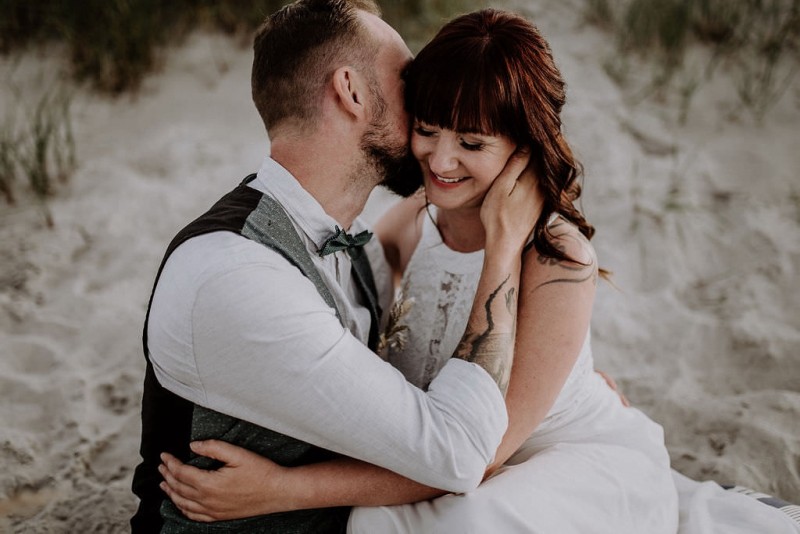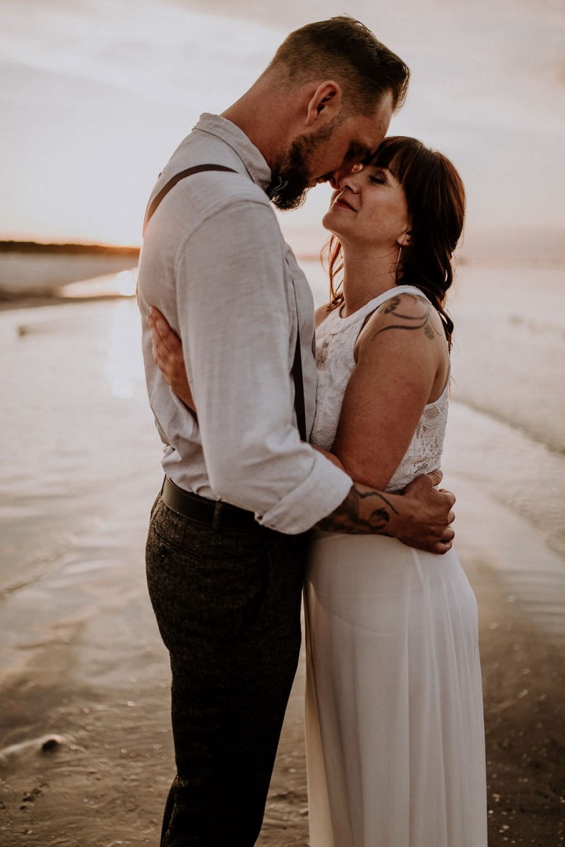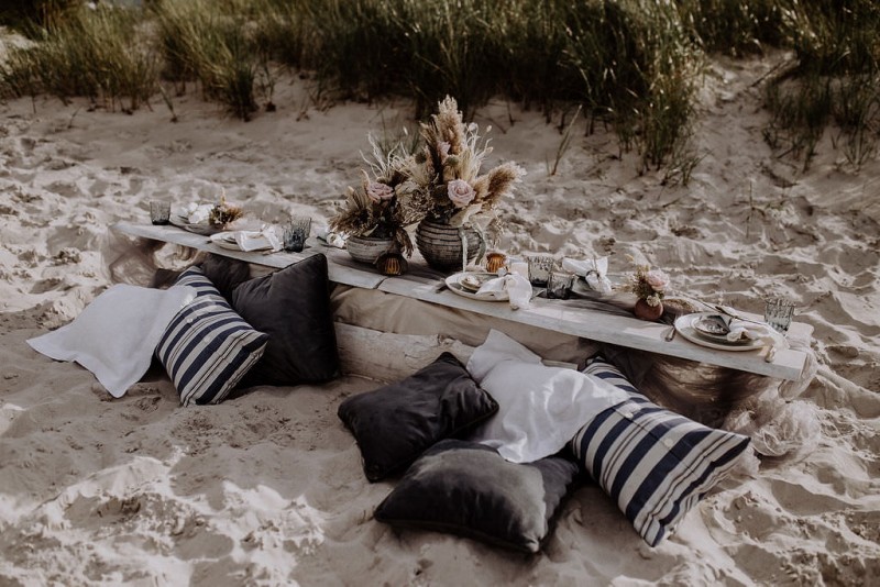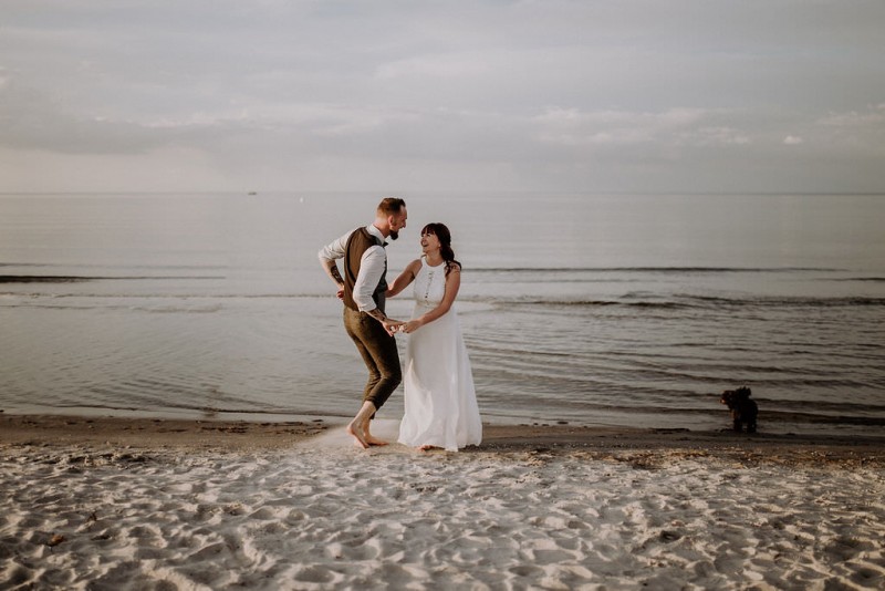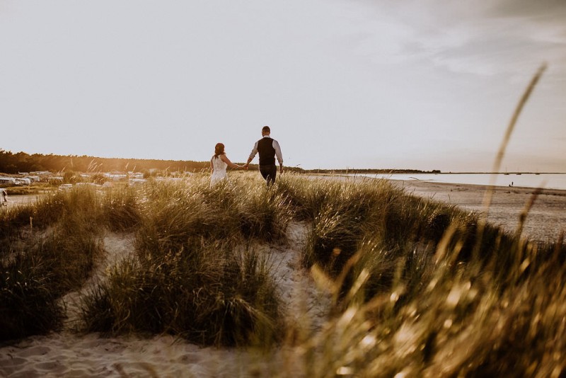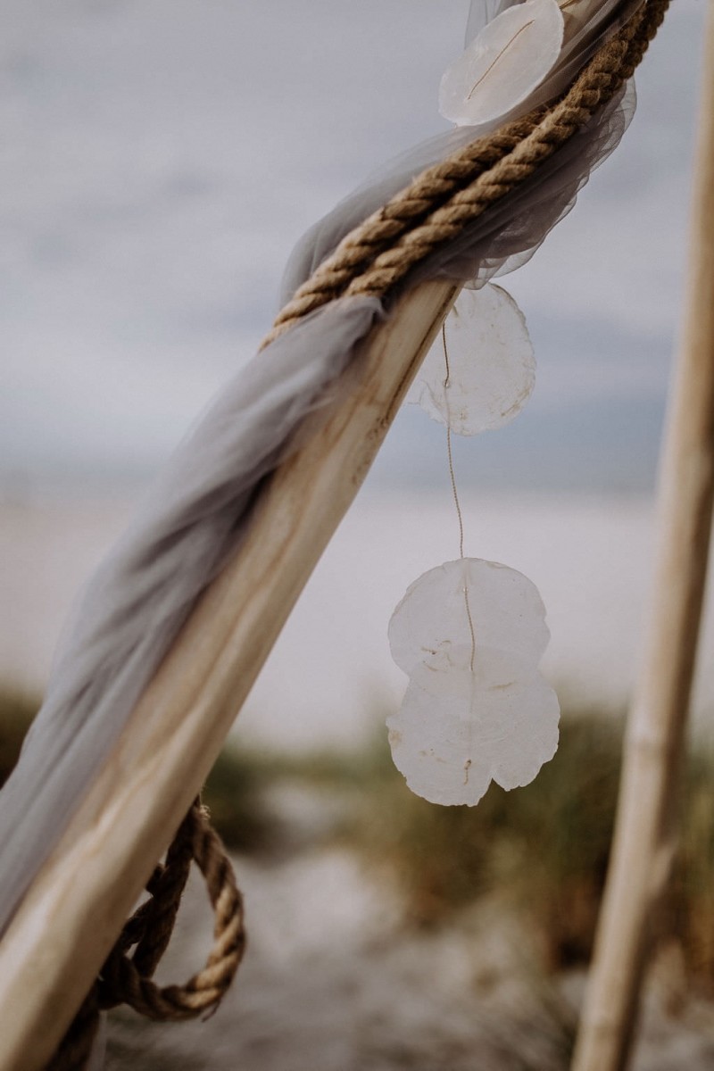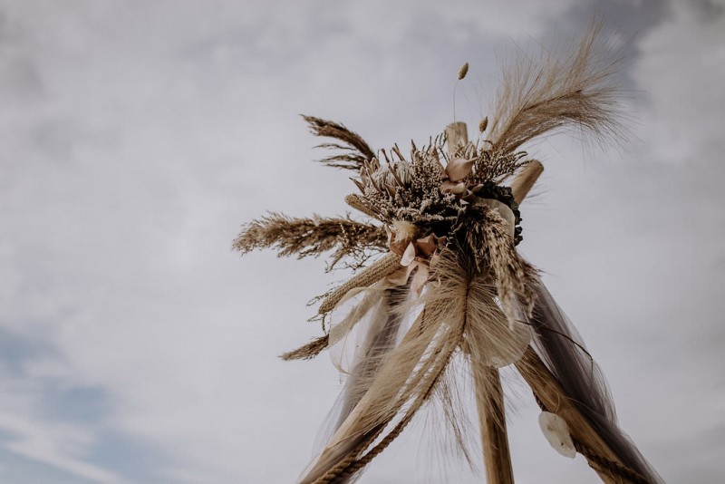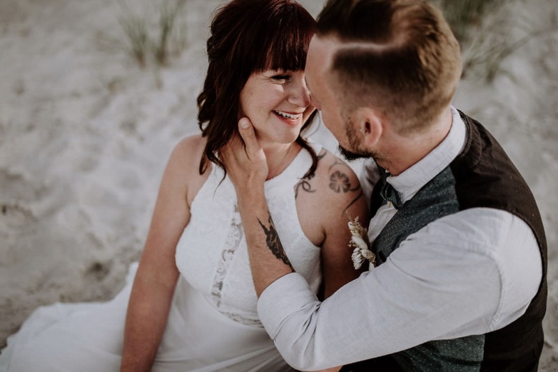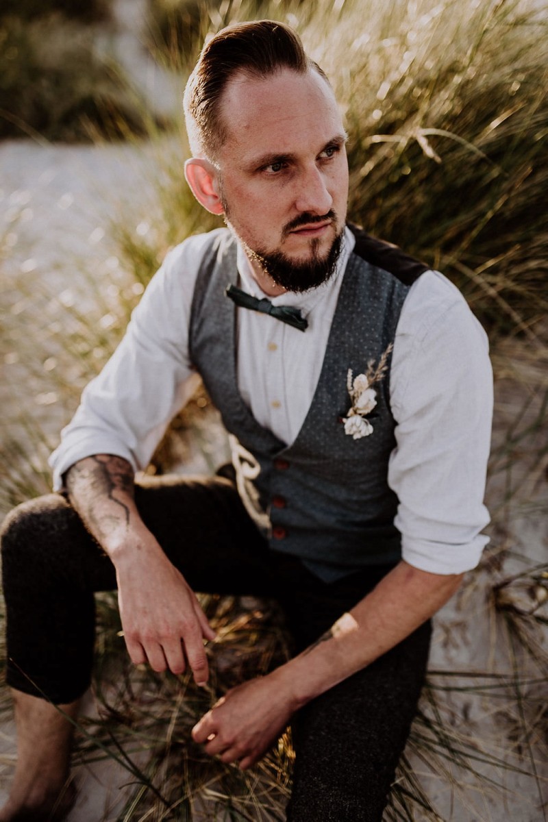 Und wieder geht es für uns Glückliche an den Strand. Für diese schöne Hochzeitsinspiration eines bohoinspirierten Elopements geht es an den Dünenstrand unserer Ostsee. Regenbogen Prerow ist eine Ferienanlage, die die liebe Hochzeitsplanerin Lisa von Time for Wedding für diese wundervolle Inspiration wählte. Lisa hat auch das Konzept dieser Inspiration entwickelt, geplant und umgesetzt, weshalb wir uns in all den schönen Strand- und Bohovibes suhlen dürfen. Während Hochzeitsfotografin Shelly von wild lights photography alles fotografisch für uns festgehalten hat, hat Hochzeitsvideograf Stephan von Spotlightcut ein Video für uns von diesem Tag gemacht. Dieses findet ihr ebenfalls in diesem Artikel, unter den wunderschönen Bildern. Doch kommen wir zur Inspiration selbst. Zwischen den, vom Wind bewegten, Sanddünen erwartet euch ein bezauberndes Table Setting im Stil eines romantischen Strandpicknicks. Kuschelige Kissen laden an die lange Tafel, die mit vielen Blumenarrangements aus naturbelassenen Trockenblumen und Rosen in zartem Rosé, dekoriert wurde. Große und kleine Keramikvasen, gemasertes Geschirr sowie kleine Teelichter geben der Tafel den wundervollen Bohovibe und einen leicht rauen Touch. Die feine Hochzeitspapeterie von Papeterie Berlin, platziert auf den Tellern neben den Leinenservietten, sorgt mit muschelinspirierten “Namensschildern“ und blauen Details für den harmonischen Feinschliff. Neben der Dekoration und Floristik dieses tollen Settings am Strand, kreierte Madelaine Eventfloristik auch noch eine Traulocation mit einem großen, blumenverzierten Traubogen. Auch für eine freie Trauung ein absoluter Hingucker, vor allem hier mit dem weitläufigen Blick aufs Meer! Sandra & Sven, das süße Brautpaar dieser Inspiration, durfte hier ihr intimes Elopement feiern. Gemeinsam mit ihrem süßen Vierbeiner genossen sie diese einmalige und romantische Zeit an diesem paradiesischen und liebevoll kreierten Bohostrand. Neben dem wundervoll natürlichen und dennoch eleganten Styling von Carolin Frixel und einem leichten Brautkleid für den Tanz durch den Sandstrand, könnt ihr bei Sandra gleich zwei bohoinspirierte Brautsträuße entdecken. Einen entwarf Madelaine Eventfloristik passend zum gesamten Setting, während sie den anderen etwas leichter, zarter und heller gestaltete. Als süßes Highlight erwartete die beiden noch eine wirklich bezaubernde Hochzeitstorte vom Tortenatelier Süße Flora. Franziska zauberte einen grandiosen Mix aus wilden Trockenblumen und der Schönheit des Meeres durch perfekt abgestimmte Blautöne. Eine wunderbar authentische und liebevolle Inspiration, die uns das Paradies direkt an den heimischen Strand bringt. Ganz viel Freude euch beim Hinwegträumen und Staunen!