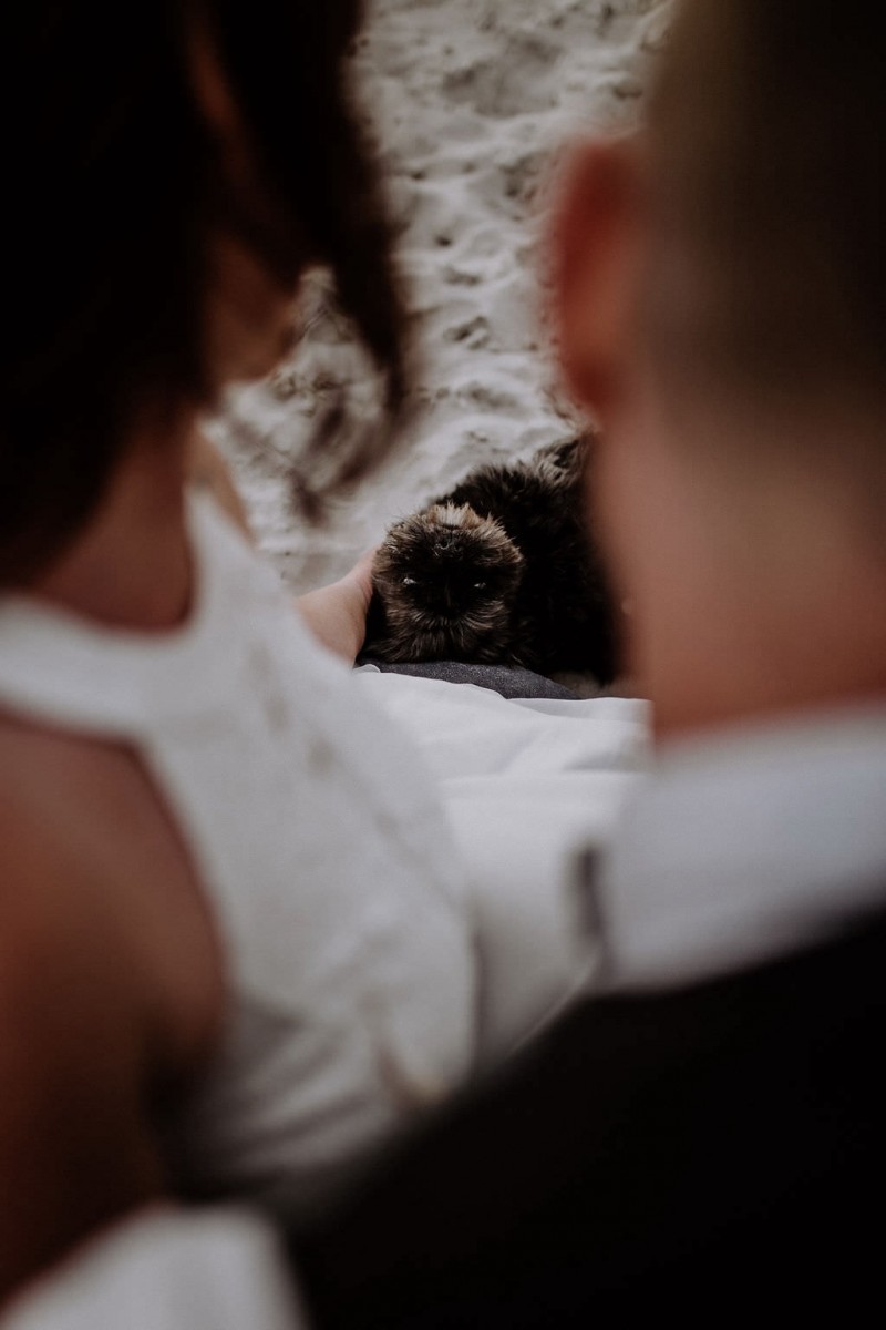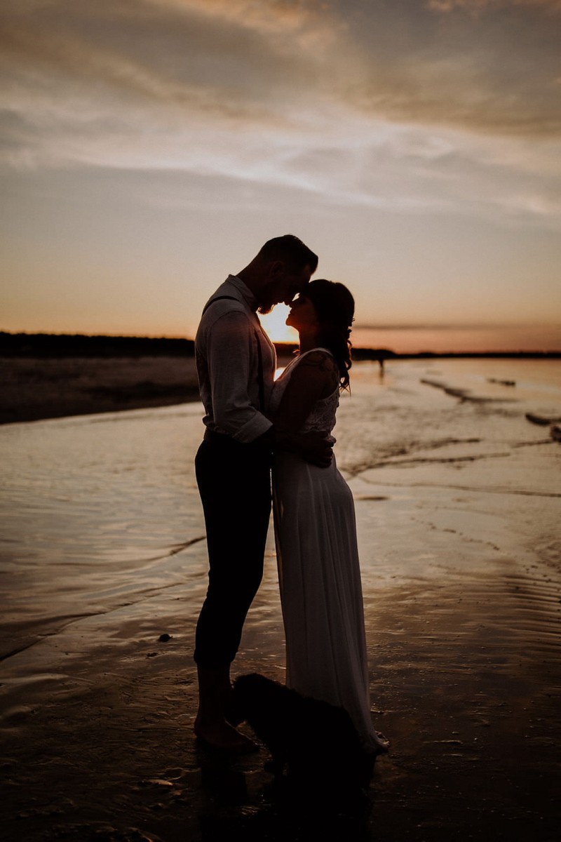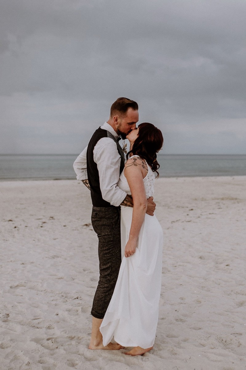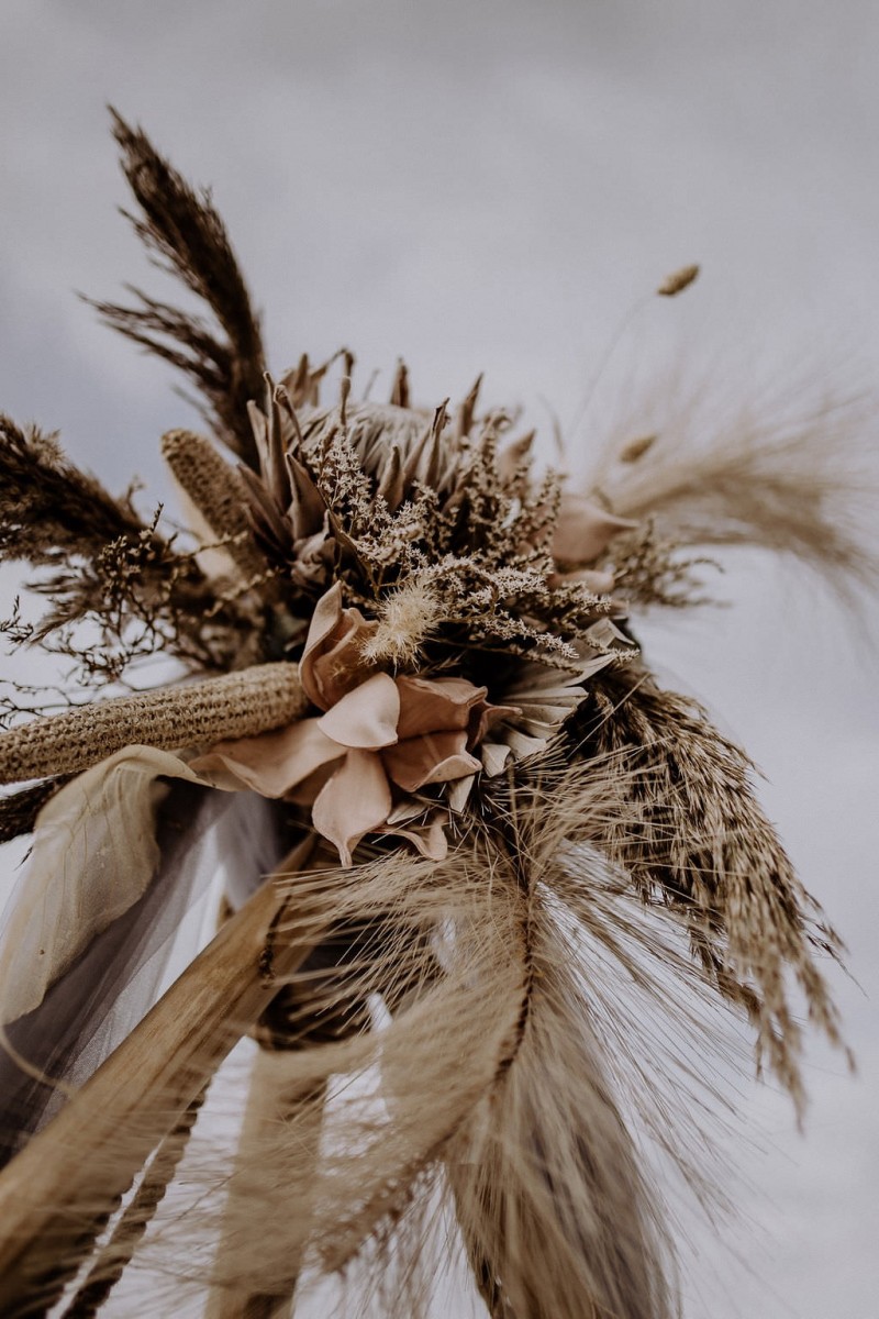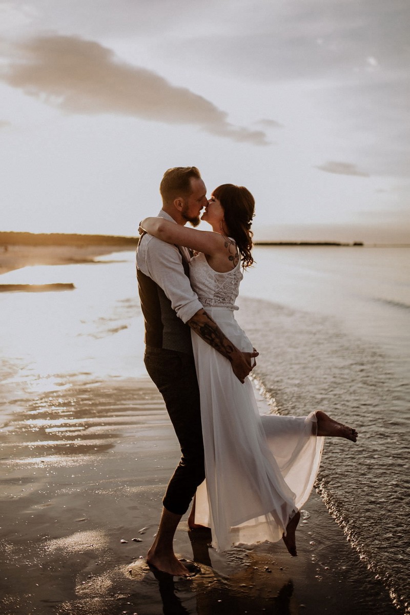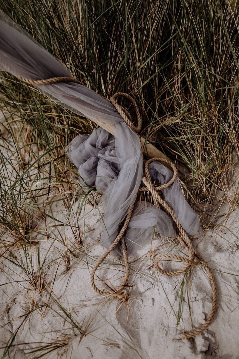 Und wieder geht es für uns Glückliche an den Strand. Für diese schöne Hochzeitsinspiration eines bohoinspirierten Elopements geht es an den Dünenstrand unserer Ostsee. Regenbogen Prerow ist eine Ferienanlage, die die liebe Hochzeitsplanerin Lisa von Time for Wedding für diese wundervolle Inspiration wählte. Lisa hat auch das Konzept dieser Inspiration entwickelt, geplant und umgesetzt, weshalb wir uns in all den schönen Strand- und Bohovibes suhlen dürfen. Während Hochzeitsfotografin Shelly von wild lights photography alles fotografisch für uns festgehalten hat, hat Hochzeitsvideograf Stephan von Spotlightcut ein Video für uns von diesem Tag gemacht. Dieses findet ihr ebenfalls in diesem Artikel, unter den wunderschönen Bildern. Doch kommen wir zur Inspiration selbst. Zwischen den, vom Wind bewegten, Sanddünen erwartet euch ein bezauberndes Table Setting im Stil eines romantischen Strandpicknicks. Kuschelige Kissen laden an die lange Tafel, die mit vielen Blumenarrangements aus naturbelassenen Trockenblumen und Rosen in zartem Rosé, dekoriert wurde. Große und kleine Keramikvasen, gemasertes Geschirr sowie kleine Teelichter geben der Tafel den wundervollen Bohovibe und einen leicht rauen Touch. Die feine Hochzeitspapeterie von Papeterie Berlin, platziert auf den Tellern neben den Leinenservietten, sorgt mit muschelinspirierten “Namensschildern“ und blauen Details für den harmonischen Feinschliff. Neben der Dekoration und Floristik dieses tollen Settings am Strand, kreierte Madelaine Eventfloristik auch noch eine Traulocation mit einem großen, blumenverzierten Traubogen. Auch für eine freie Trauung ein absoluter Hingucker, vor allem hier mit dem weitläufigen Blick aufs Meer! Sandra & Sven, das süße Brautpaar dieser Inspiration, durfte hier ihr intimes Elopement feiern. Gemeinsam mit ihrem süßen Vierbeiner genossen sie diese einmalige und romantische Zeit an diesem paradiesischen und liebevoll kreierten Bohostrand. Neben dem wundervoll natürlichen und dennoch eleganten Styling von Carolin Frixel und einem leichten Brautkleid für den Tanz durch den Sandstrand, könnt ihr bei Sandra gleich zwei bohoinspirierte Brautsträuße entdecken. Einen entwarf Madelaine Eventfloristik passend zum gesamten Setting, während sie den anderen etwas leichter, zarter und heller gestaltete. Als süßes Highlight erwartete die beiden noch eine wirklich bezaubernde Hochzeitstorte vom Tortenatelier Süße Flora. Franziska zauberte einen grandiosen Mix aus wilden Trockenblumen und der Schönheit des Meeres durch perfekt abgestimmte Blautöne. Eine wunderbar authentische und liebevolle Inspiration, die uns das Paradies direkt an den heimischen Strand bringt. Ganz viel Freude euch beim Hinwegträumen und Staunen!
