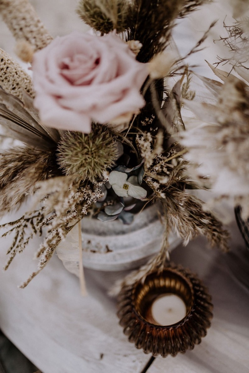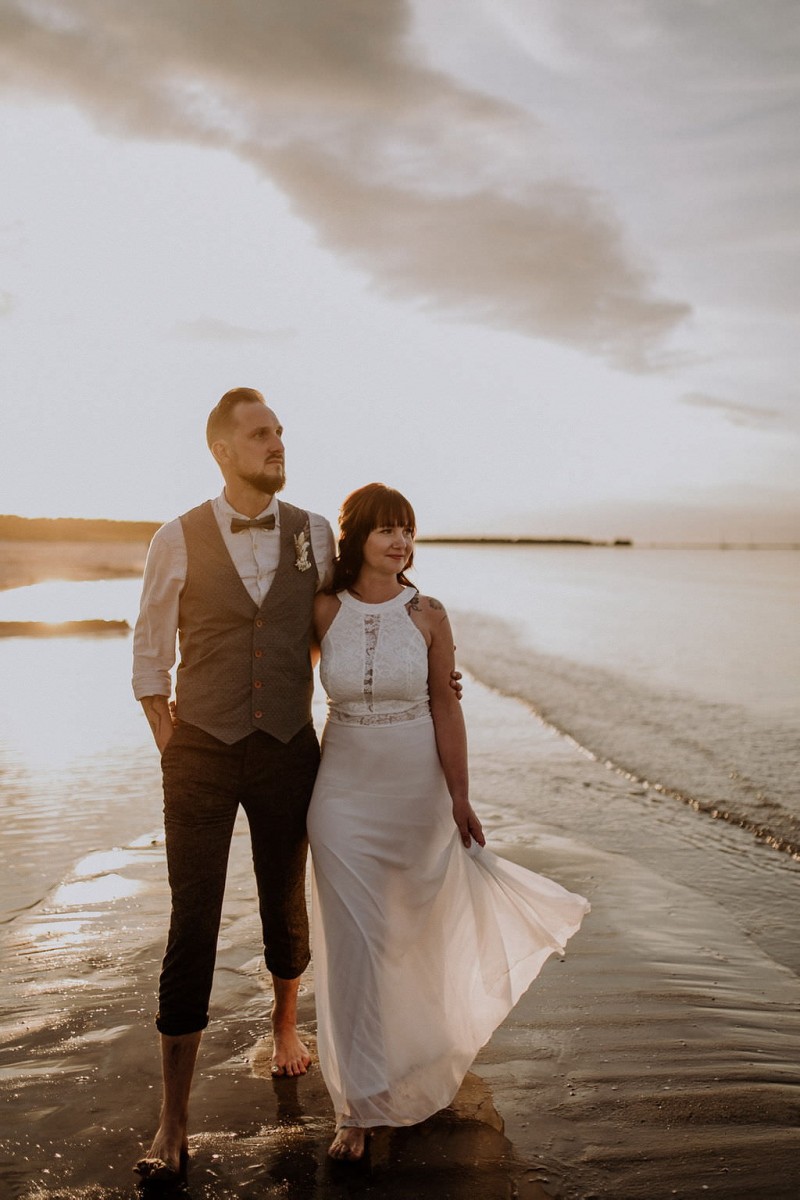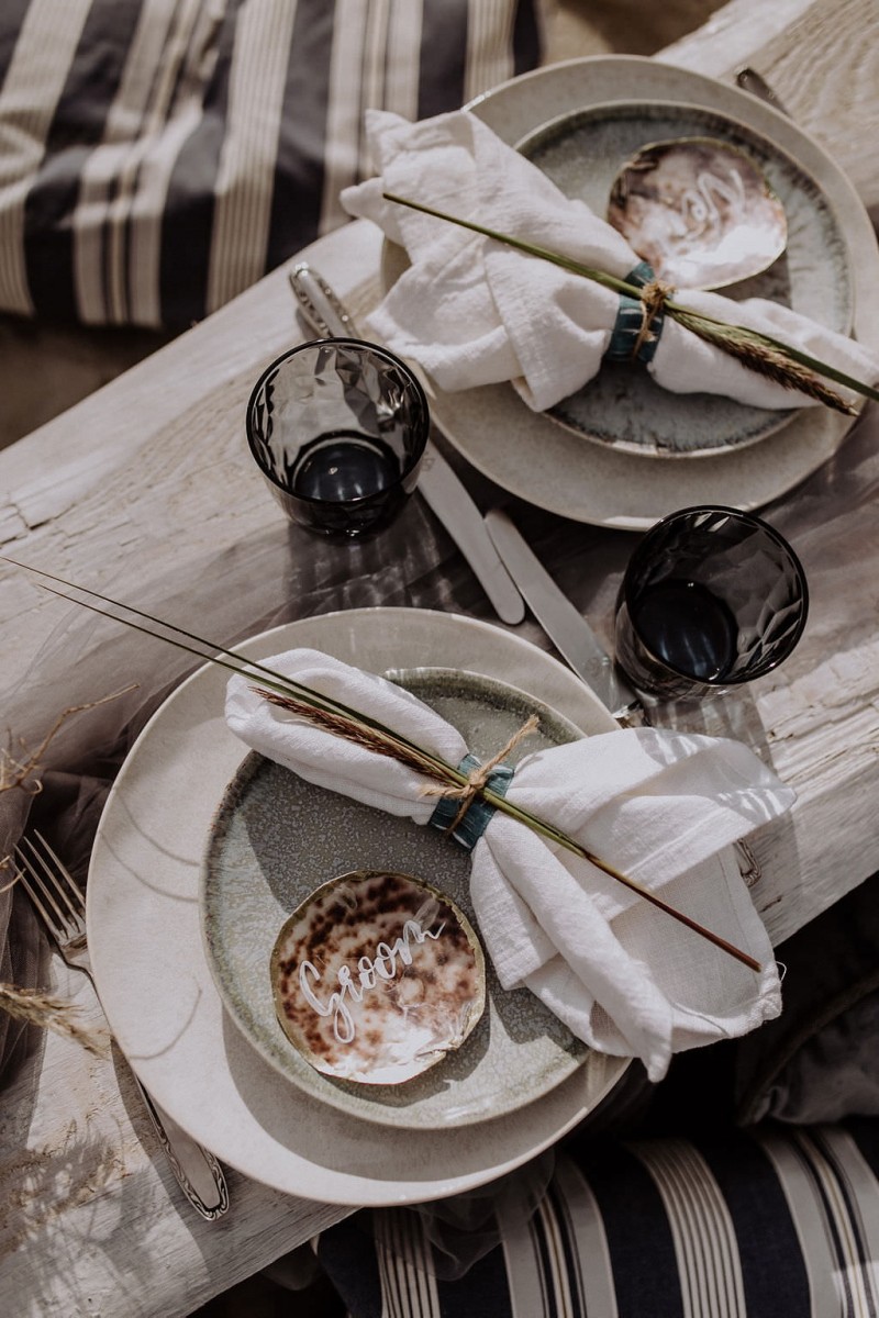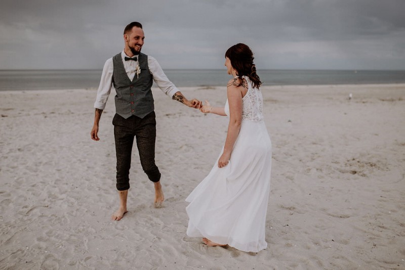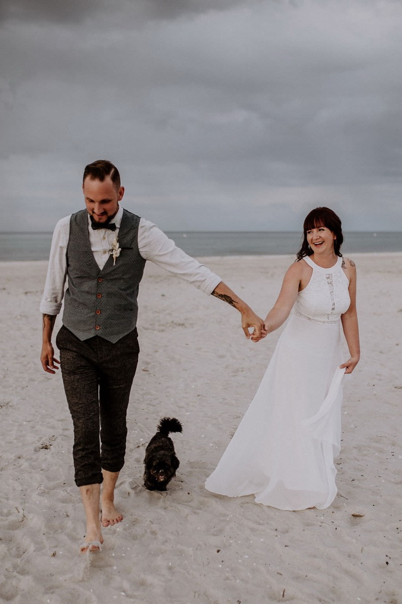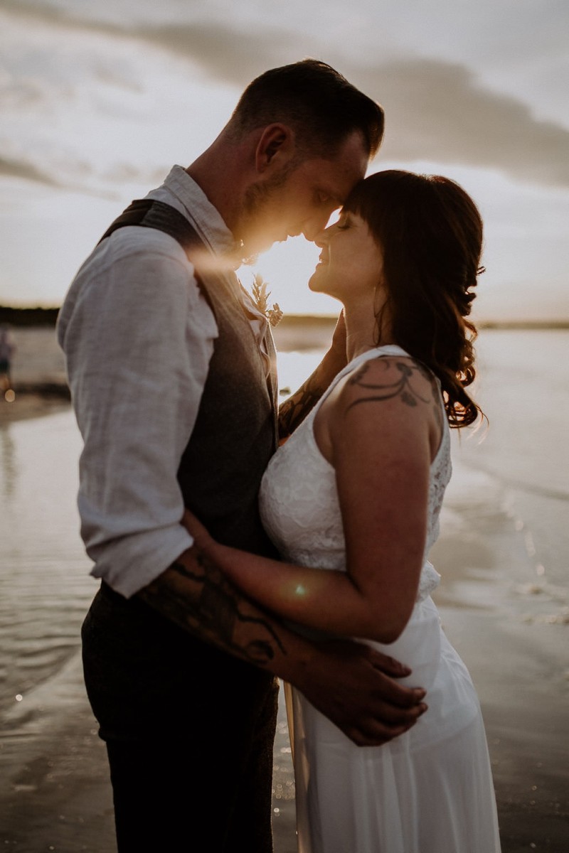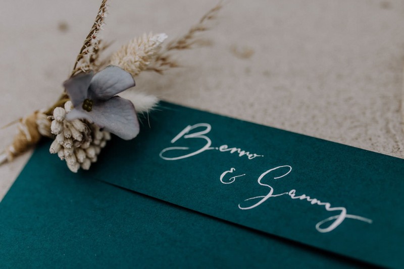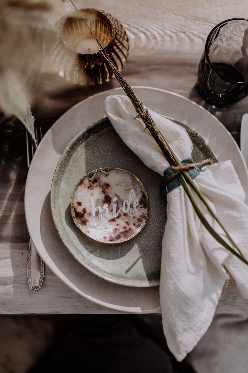 Und wieder geht es für uns Glückliche an den Strand. Für diese schöne Hochzeitsinspiration eines bohoinspirierten Elopements geht es an den Dünenstrand unserer Ostsee. Regenbogen Prerow ist eine Ferienanlage, die die liebe Hochzeitsplanerin Lisa von Time for Wedding für diese wundervolle Inspiration wählte. Lisa hat auch das Konzept dieser Inspiration entwickelt, geplant und umgesetzt, weshalb wir uns in all den schönen Strand- und Bohovibes suhlen dürfen. Während Hochzeitsfotografin Shelly von wild lights photography alles fotografisch für uns festgehalten hat, hat Hochzeitsvideograf Stephan von Spotlightcut ein Video für uns von diesem Tag gemacht. Dieses findet ihr ebenfalls in diesem Artikel, unter den wunderschönen Bildern. Doch kommen wir zur Inspiration selbst. Zwischen den, vom Wind bewegten, Sanddünen erwartet euch ein bezauberndes Table Setting im Stil eines romantischen Strandpicknicks. Kuschelige Kissen laden an die lange Tafel, die mit vielen Blumenarrangements aus naturbelassenen Trockenblumen und Rosen in zartem Rosé, dekoriert wurde. Große und kleine Keramikvasen, gemasertes Geschirr sowie kleine Teelichter geben der Tafel den wundervollen Bohovibe und einen leicht rauen Touch. Die feine Hochzeitspapeterie von Papeterie Berlin, platziert auf den Tellern neben den Leinenservietten, sorgt mit muschelinspirierten “Namensschildern“ und blauen Details für den harmonischen Feinschliff. Neben der Dekoration und Floristik dieses tollen Settings am Strand, kreierte Madelaine Eventfloristik auch noch eine Traulocation mit einem großen, blumenverzierten Traubogen. Auch für eine freie Trauung ein absoluter Hingucker, vor allem hier mit dem weitläufigen Blick aufs Meer! Sandra & Sven, das süße Brautpaar dieser Inspiration, durfte hier ihr intimes Elopement feiern. Gemeinsam mit ihrem süßen Vierbeiner genossen sie diese einmalige und romantische Zeit an diesem paradiesischen und liebevoll kreierten Bohostrand. Neben dem wundervoll natürlichen und dennoch eleganten Styling von Carolin Frixel und einem leichten Brautkleid für den Tanz durch den Sandstrand, könnt ihr bei Sandra gleich zwei bohoinspirierte Brautsträuße entdecken. Einen entwarf Madelaine Eventfloristik passend zum gesamten Setting, während sie den anderen etwas leichter, zarter und heller gestaltete. Als süßes Highlight erwartete die beiden noch eine wirklich bezaubernde Hochzeitstorte vom Tortenatelier Süße Flora. Franziska zauberte einen grandiosen Mix aus wilden Trockenblumen und der Schönheit des Meeres durch perfekt abgestimmte Blautöne. Eine wunderbar authentische und liebevolle Inspiration, die uns das Paradies direkt an den heimischen Strand bringt. Ganz viel Freude euch beim Hinwegträumen und Staunen!