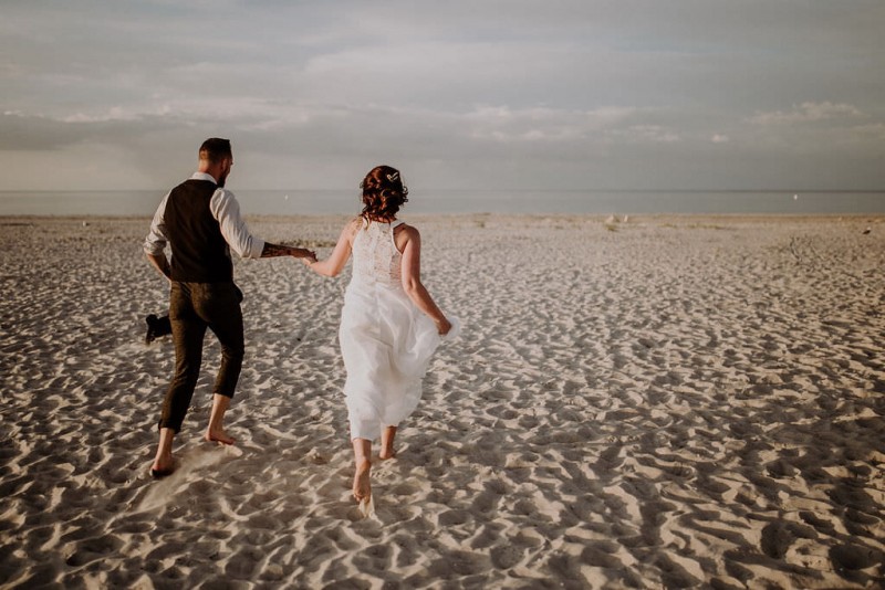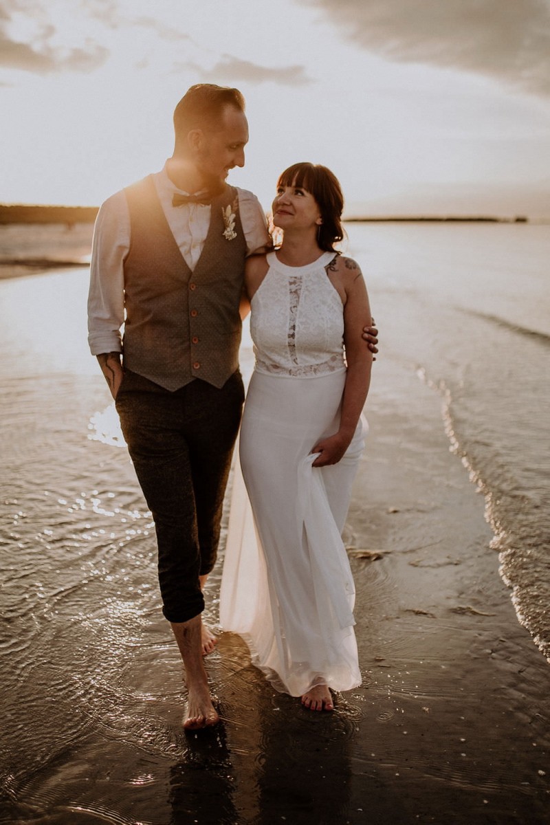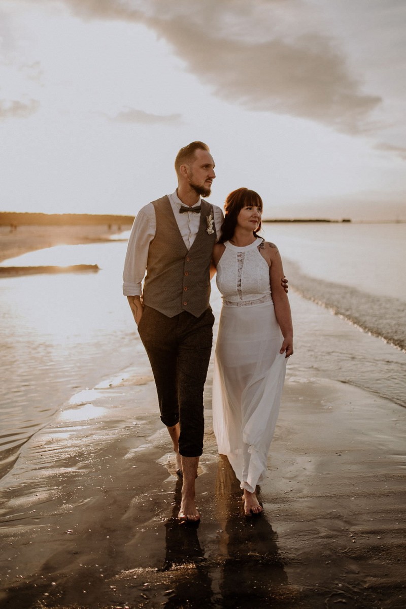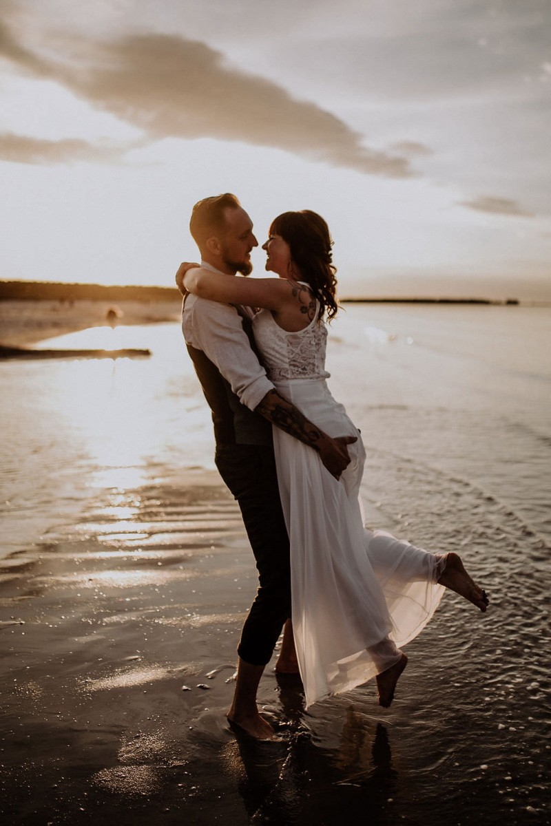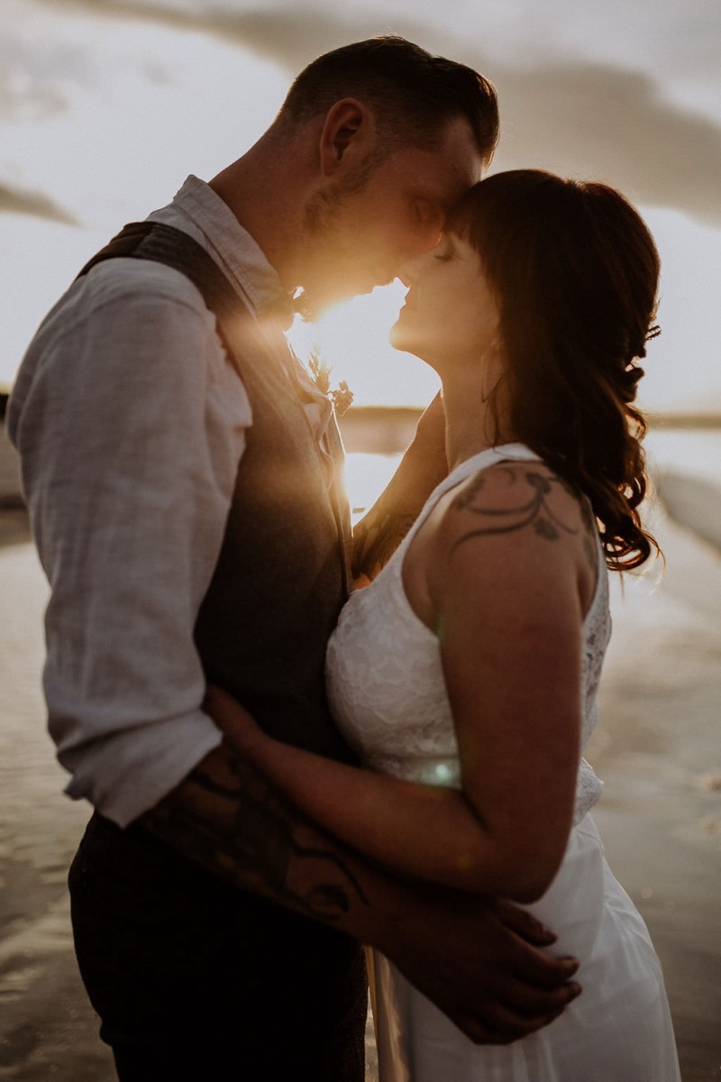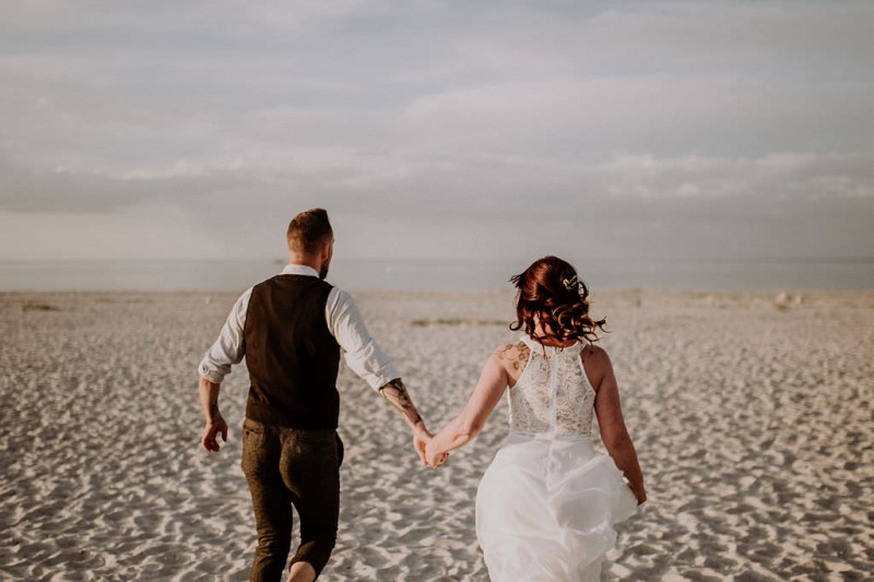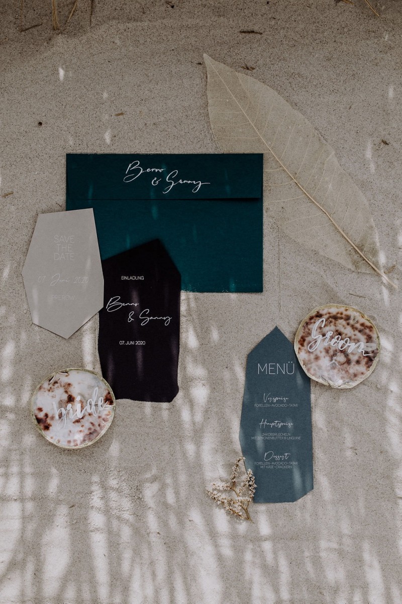 Und wieder geht es für uns Glückliche an den Strand. Für diese schöne Hochzeitsinspiration eines bohoinspirierten Elopements geht es an den Dünenstrand unserer Ostsee. Regenbogen Prerow ist eine Ferienanlage, die die liebe Hochzeitsplanerin Lisa von Time for Wedding für diese wundervolle Inspiration wählte. Lisa hat auch das Konzept dieser Inspiration entwickelt, geplant und umgesetzt, weshalb wir uns in all den schönen Strand- und Bohovibes suhlen dürfen. Während Hochzeitsfotografin Shelly von wild lights photography alles fotografisch für uns festgehalten hat, hat Hochzeitsvideograf Stephan von Spotlightcut ein Video für uns von diesem Tag gemacht. Dieses findet ihr ebenfalls in diesem Artikel, unter den wunderschönen Bildern. Doch kommen wir zur Inspiration selbst. Zwischen den, vom Wind bewegten, Sanddünen erwartet euch ein bezauberndes Table Setting im Stil eines romantischen Strandpicknicks. Kuschelige Kissen laden an die lange Tafel, die mit vielen Blumenarrangements aus naturbelassenen Trockenblumen und Rosen in zartem Rosé, dekoriert wurde. Große und kleine Keramikvasen, gemasertes Geschirr sowie kleine Teelichter geben der Tafel den wundervollen Bohovibe und einen leicht rauen Touch. Die feine Hochzeitspapeterie von Papeterie Berlin, platziert auf den Tellern neben den Leinenservietten, sorgt mit muschelinspirierten “Namensschildern“ und blauen Details für den harmonischen Feinschliff. Neben der Dekoration und Floristik dieses tollen Settings am Strand, kreierte Madelaine Eventfloristik auch noch eine Traulocation mit einem großen, blumenverzierten Traubogen. Auch für eine freie Trauung ein absoluter Hingucker, vor allem hier mit dem weitläufigen Blick aufs Meer! Sandra & Sven, das süße Brautpaar dieser Inspiration, durfte hier ihr intimes Elopement feiern. Gemeinsam mit ihrem süßen Vierbeiner genossen sie diese einmalige und romantische Zeit an diesem paradiesischen und liebevoll kreierten Bohostrand. Neben dem wundervoll natürlichen und dennoch eleganten Styling von Carolin Frixel und einem leichten Brautkleid für den Tanz durch den Sandstrand, könnt ihr bei Sandra gleich zwei bohoinspirierte Brautsträuße entdecken. Einen entwarf Madelaine Eventfloristik passend zum gesamten Setting, während sie den anderen etwas leichter, zarter und heller gestaltete. Als süßes Highlight erwartete die beiden noch eine wirklich bezaubernde Hochzeitstorte vom Tortenatelier Süße Flora. Franziska zauberte einen grandiosen Mix aus wilden Trockenblumen und der Schönheit des Meeres durch perfekt abgestimmte Blautöne. Eine wunderbar authentische und liebevolle Inspiration, die uns das Paradies direkt an den heimischen Strand bringt. Ganz viel Freude euch beim Hinwegträumen und Staunen!