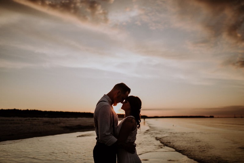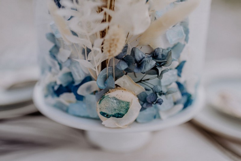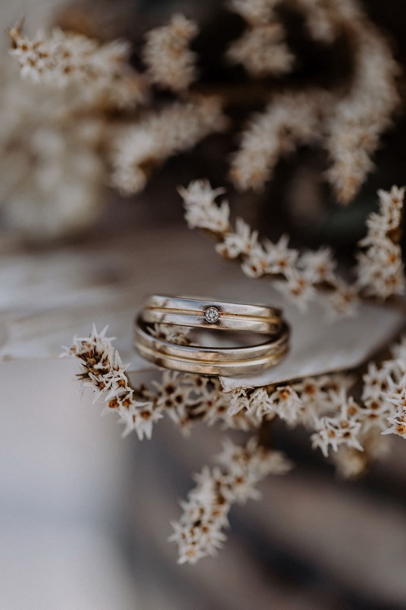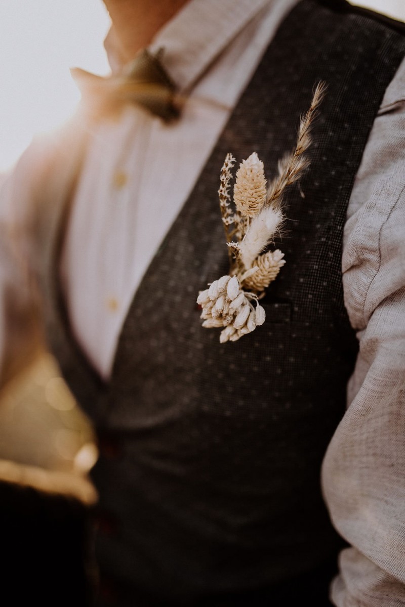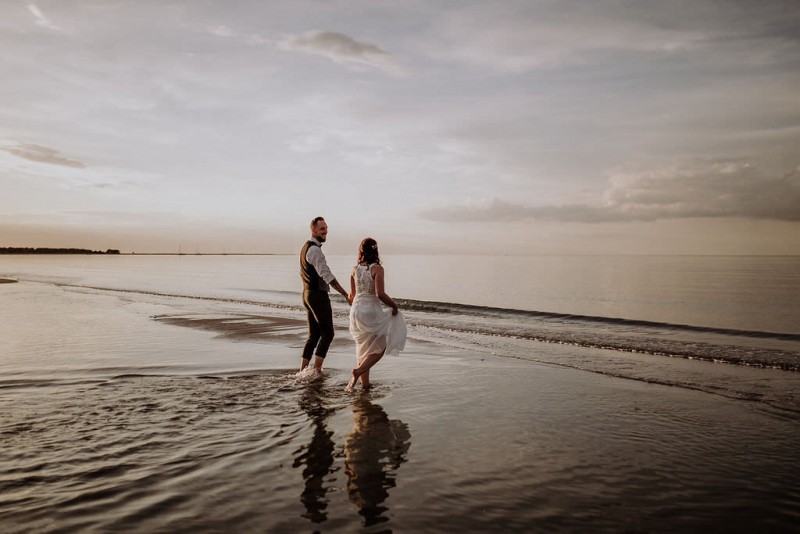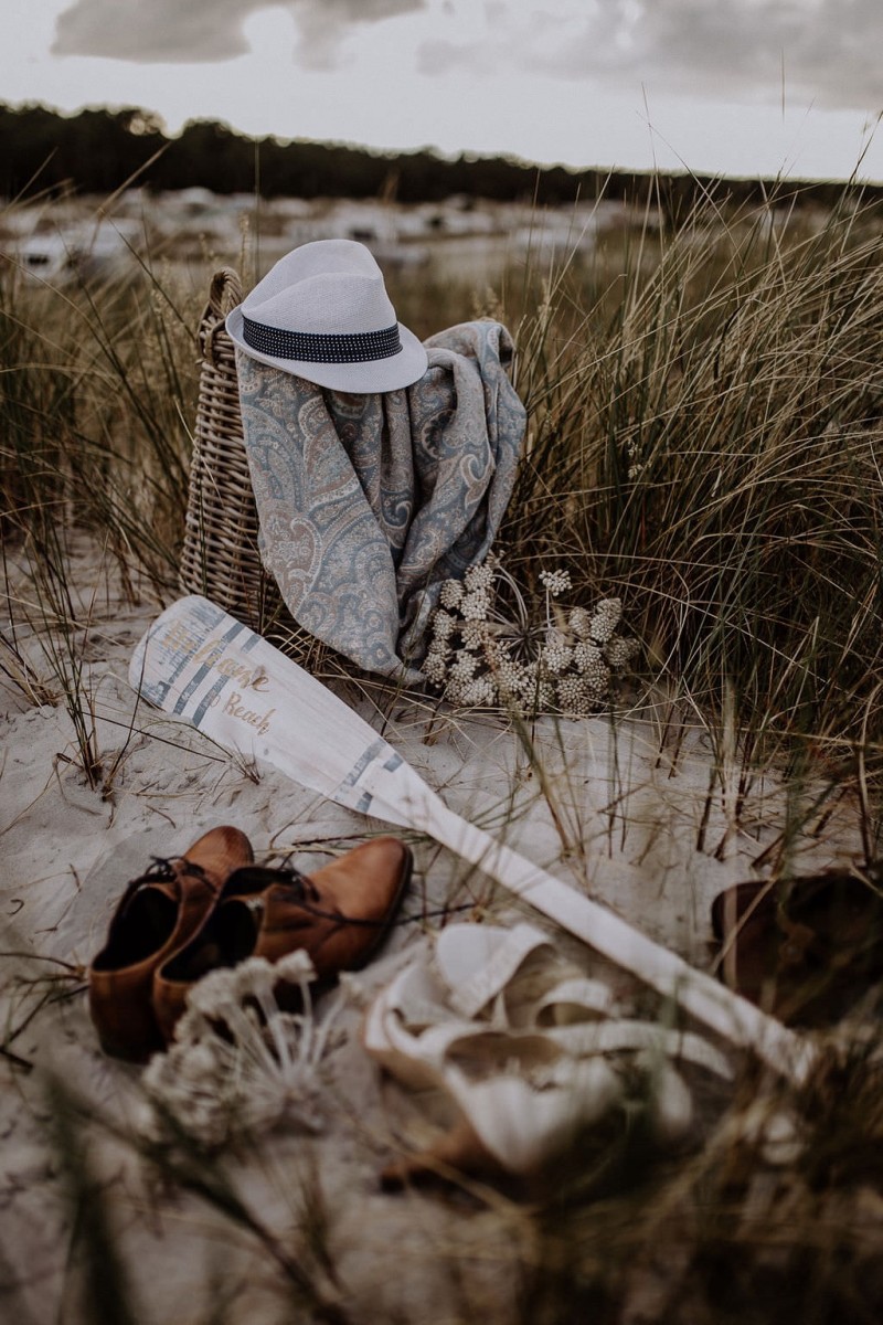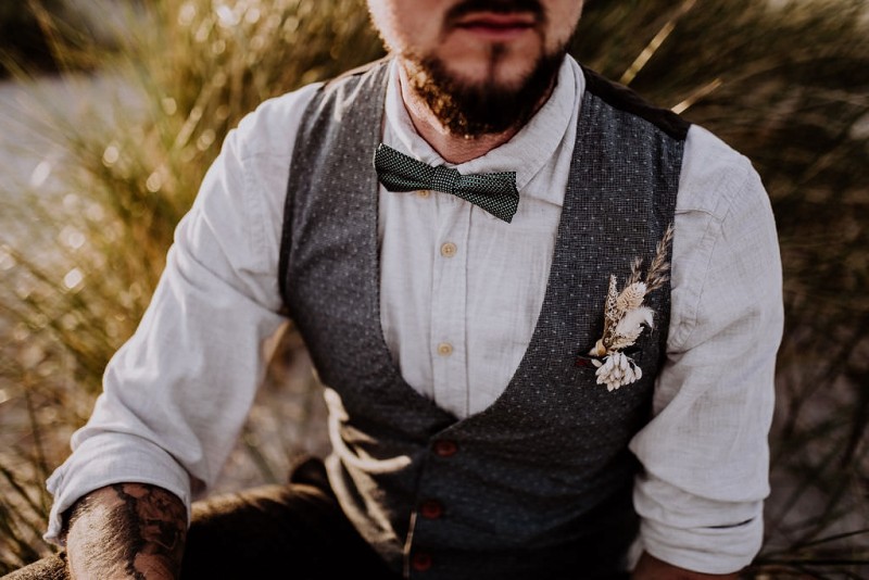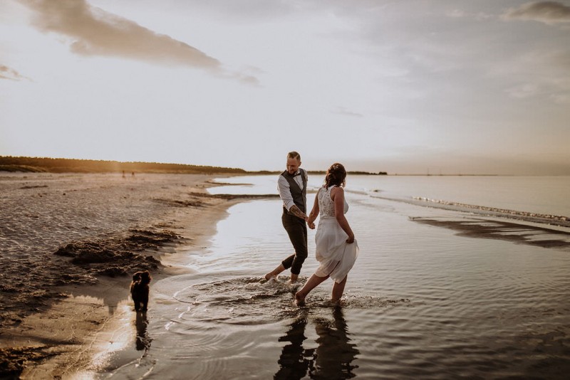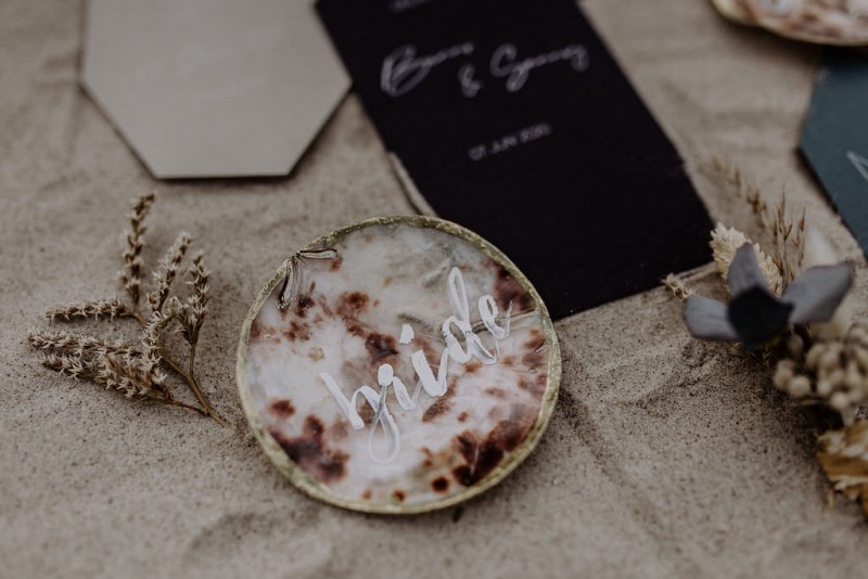 Und wieder geht es für uns Glückliche an den Strand. Für diese schöne Hochzeitsinspiration eines bohoinspirierten Elopements geht es an den Dünenstrand unserer Ostsee. Regenbogen Prerow ist eine Ferienanlage, die die liebe Hochzeitsplanerin Lisa von Time for Wedding für diese wundervolle Inspiration wählte. Lisa hat auch das Konzept dieser Inspiration entwickelt, geplant und umgesetzt, weshalb wir uns in all den schönen Strand- und Bohovibes suhlen dürfen. Während Hochzeitsfotografin Shelly von wild lights photography alles fotografisch für uns festgehalten hat, hat Hochzeitsvideograf Stephan von Spotlightcut ein Video für uns von diesem Tag gemacht. Dieses findet ihr ebenfalls in diesem Artikel, unter den wunderschönen Bildern. Doch kommen wir zur Inspiration selbst. Zwischen den, vom Wind bewegten, Sanddünen erwartet euch ein bezauberndes Table Setting im Stil eines romantischen Strandpicknicks. Kuschelige Kissen laden an die lange Tafel, die mit vielen Blumenarrangements aus naturbelassenen Trockenblumen und Rosen in zartem Rosé, dekoriert wurde. Große und kleine Keramikvasen, gemasertes Geschirr sowie kleine Teelichter geben der Tafel den wundervollen Bohovibe und einen leicht rauen Touch. Die feine Hochzeitspapeterie von Papeterie Berlin, platziert auf den Tellern neben den Leinenservietten, sorgt mit muschelinspirierten “Namensschildern“ und blauen Details für den harmonischen Feinschliff. Neben der Dekoration und Floristik dieses tollen Settings am Strand, kreierte Madelaine Eventfloristik auch noch eine Traulocation mit einem großen, blumenverzierten Traubogen. Auch für eine freie Trauung ein absoluter Hingucker, vor allem hier mit dem weitläufigen Blick aufs Meer! Sandra & Sven, das süße Brautpaar dieser Inspiration, durfte hier ihr intimes Elopement feiern. Gemeinsam mit ihrem süßen Vierbeiner genossen sie diese einmalige und romantische Zeit an diesem paradiesischen und liebevoll kreierten Bohostrand. Neben dem wundervoll natürlichen und dennoch eleganten Styling von Carolin Frixel und einem leichten Brautkleid für den Tanz durch den Sandstrand, könnt ihr bei Sandra gleich zwei bohoinspirierte Brautsträuße entdecken. Einen entwarf Madelaine Eventfloristik passend zum gesamten Setting, während sie den anderen etwas leichter, zarter und heller gestaltete. Als süßes Highlight erwartete die beiden noch eine wirklich bezaubernde Hochzeitstorte vom Tortenatelier Süße Flora. Franziska zauberte einen grandiosen Mix aus wilden Trockenblumen und der Schönheit des Meeres durch perfekt abgestimmte Blautöne. Eine wunderbar authentische und liebevolle Inspiration, die uns das Paradies direkt an den heimischen Strand bringt. Ganz viel Freude euch beim Hinwegträumen und Staunen!