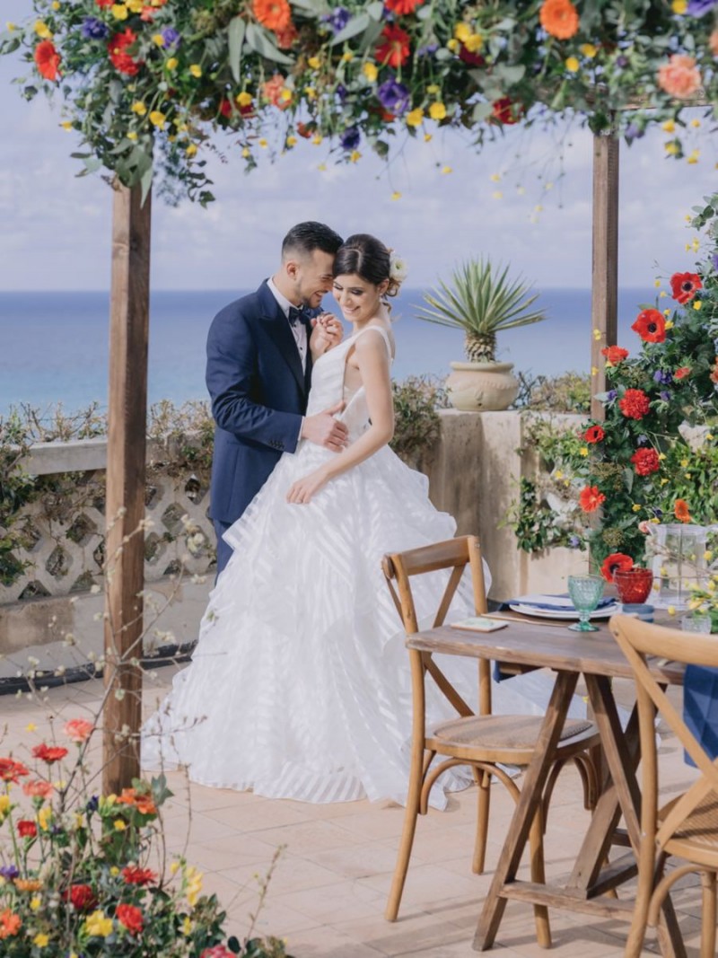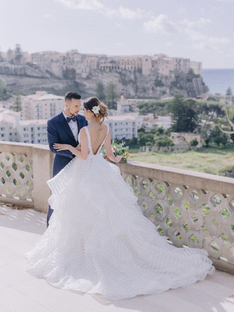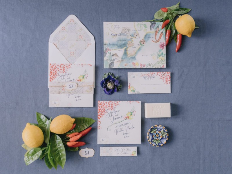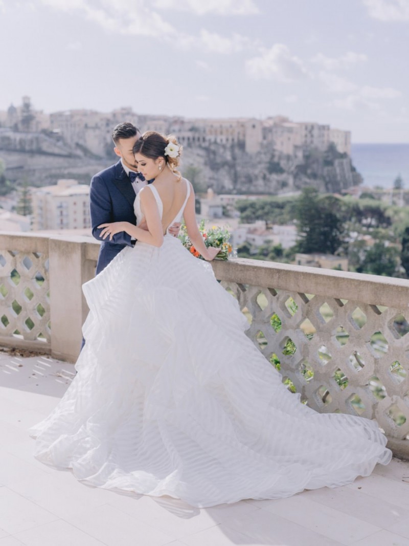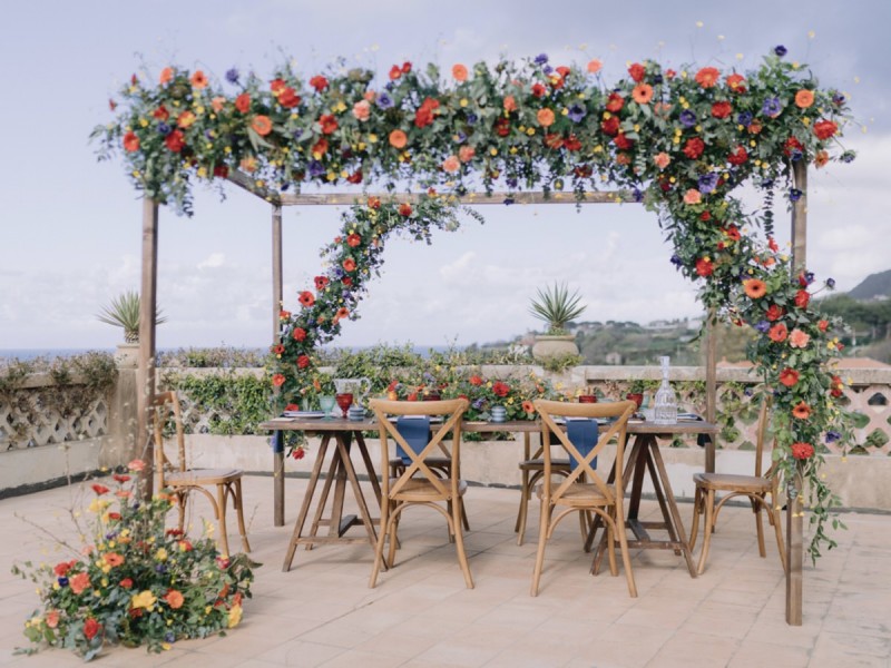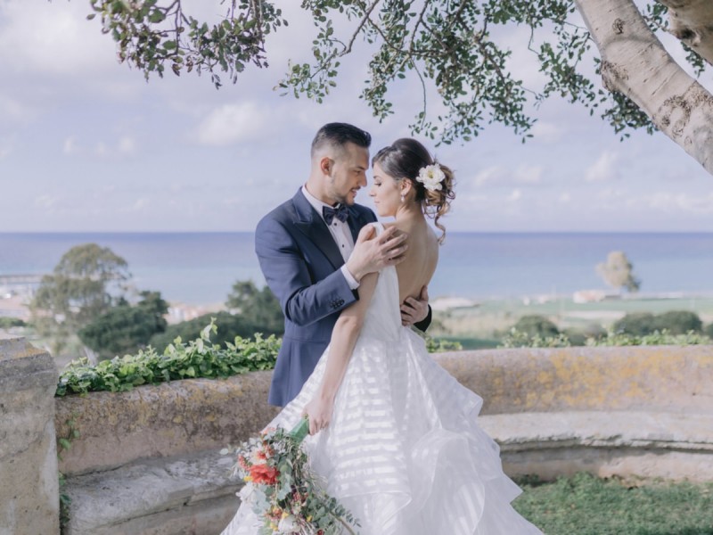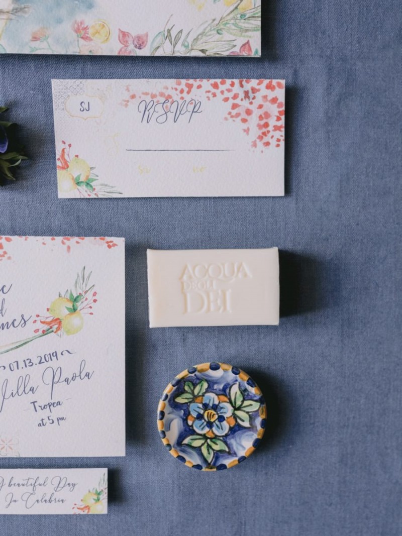 Ich darf euch heute an einen warmen, sonnenverwöhnten Ort entführen: Kalabrien. In dieser Inspiration einer Hochzeit in Italien, ist alles von dieser italienischen Region inspiriert. Bekannt für seine schroffen Berge, traditionellen Dörfer und abwechslungsreichen Küste, findet sich in dieser malerischen Kulisse eine moderne Interpretation dieser traditionsreichen Halbinsel. Elegant und luxuriös sollte es werden und den Charm einer typisch italienischen Hochzeit versprühen. Hochzeitsplanerin Rossella Arlia, unterstützt von Anastasia Event Designer, zeigt mit diesem Konzept ihrer geliebten Heimat eine Atmosphäre voller Leichtigkeit und Geselligkeit, die jeden sofort umschließt und in den Bann zieht. In der Villa Paola*, einer typisch italienischen Villa auf einem Hügel, mit Blick auf das Tyrrhenische Meer, erwartet uns diese einmalige Szenerie, die Karma Photo für uns fotografisch festgehalten hat. Schon die Hochzeitspapeterie, insziniert mit zartem Parfum und Seife von Acqua degli Dei, dieser Inspiration, kreiert von PoligoniLab, lässt erahnen mit wie viel Liebe zum Detail und zur Tradition diese Szenerie gefertigt wurde. Sowohl die Landschaft, als auch die, für diese südliche Region Italiens typischen, Geschmäcker und Gerüche wie Bergamotte, Zitrusfrüchte und Chilischoten, finden sich hier. In der Villa selbst empfängt uns auf der großen Terrasse mit traumhaftem Meer- und Bergblick, ein natürlich sowie antik gehaltenes Setting, dessen opulente Floristik wirkt, als hätte man eine ganze Wiese voller Wildblumen verwendet. Ranunkeln, Anemonen, Gerbera, englische Rosen, Nelken, Ruscus und Eukalyptus schlängeln sich sowohl über den Tisch, als auch die zauberhafte Holzkonstruktion. Diese Floristik, sowie auch die später folgenden Brautsträuße, wurde kreiert von Le Jardin, die so der Gesellschaft einen Abend unter einem Sternen- und Blumenhimmel schenkten. Natürlich sorgt auch das Table Setting selbst für schwärmende Gäste. Hier finden sich all die Farben und Symbole, die schon die Hochzeitspapeterie so liebevoll inszenierte. Ein harmonisches Konzept, das die Traditionen dieses Landes aus ganzem Herzen feiert. Inmitten dieser schönen Szenerie erwartet euch auch noch ein süßes Brautpaar, das perfekt zu diesen mediterranen Zügen passt. Sie durften diesen sonnigen Tag in dieser wunderschönen Villa gemeinsam genießen. Und noch mehr. Sie beide zeigen uns einen Look für den Tag und einen für die Nacht. Für den Hochzeitstag trug der Bräutigam einen klassischen Anzug in Blau mit passender Fliege. Die Braut verzaubert uns in einem ärmellosen Brautkleid mit tiefem V-Ausschnitt und einem Rock aus Volants. Für den Abend zeigt sich unser Bräutigam schick in einem weißen Jacket mit schwarzen Nähten und einer schwarz-silbernen Fliege. Sie trägt ein fließendes Chiffonkleid mit zarten Applikationen und einem geflochtenen Rücken. Ihr Hair & Makeup zu diesen Looks kreierten Marco Quintiero & Valeb Makeup. Ihr Brautschmuck ist von Scintille Montesanto und ist ebenso, wie ihre Brautschuhe von Mazzini Calzature, auf beide Looks abgestimmt. Wer sich jetzt fragt, ob ich nicht etwas vergessen hätte: Kein Sorge, selbstverständlich gibt es auch einen Sweet Table zu entdecken. Und was für einen! Mehrere, bezaubernd mediterran gestaltete Hochzeitstorten von Artisan Pastry Vianda, künstlerisch gestaltete Kekse, wie sie auch am Tisch zu finden sind, von Art Biscotti, sowie farblich passende Macarons von Il Bergamotto und leckeres Konfekt von Confetti Tortora lassen hier keine Wünsche offen! Und mir bleibt an dieser Stelle nur euch ganz viel Freude mit dieser bezaubernden Hochzeitsinspiration aus Kalabrien zu wünschen!