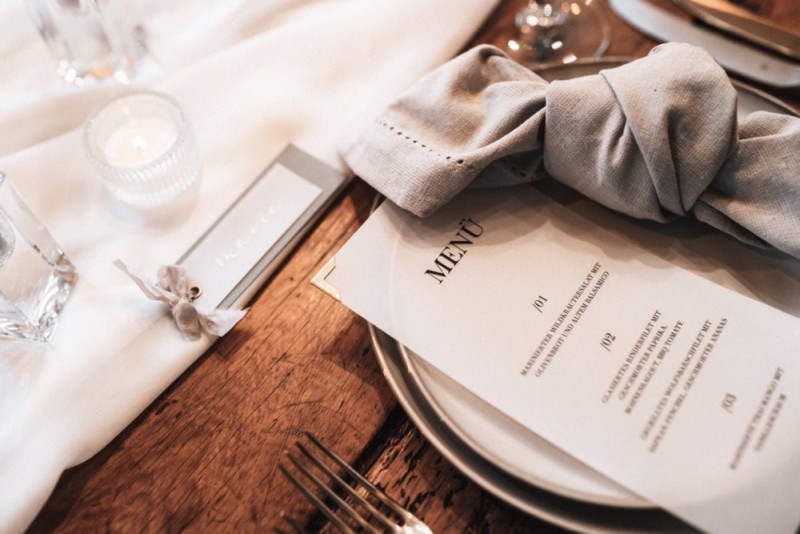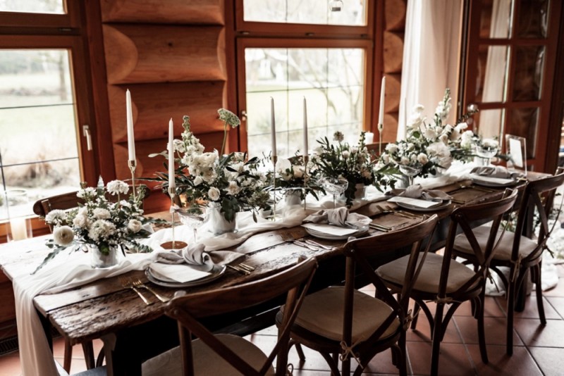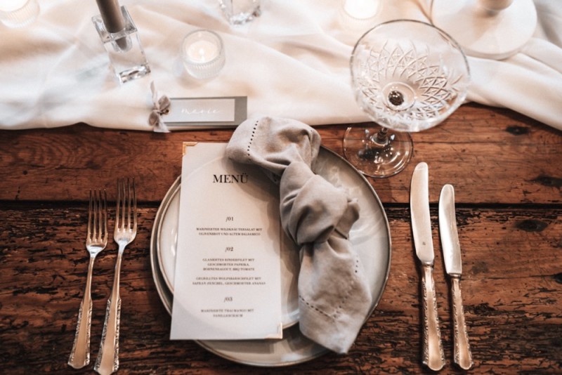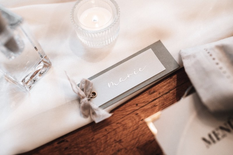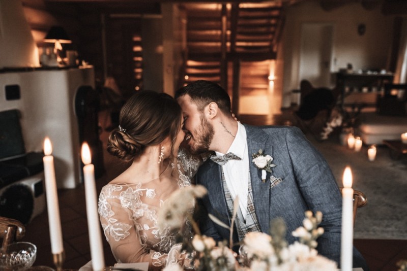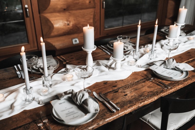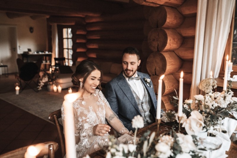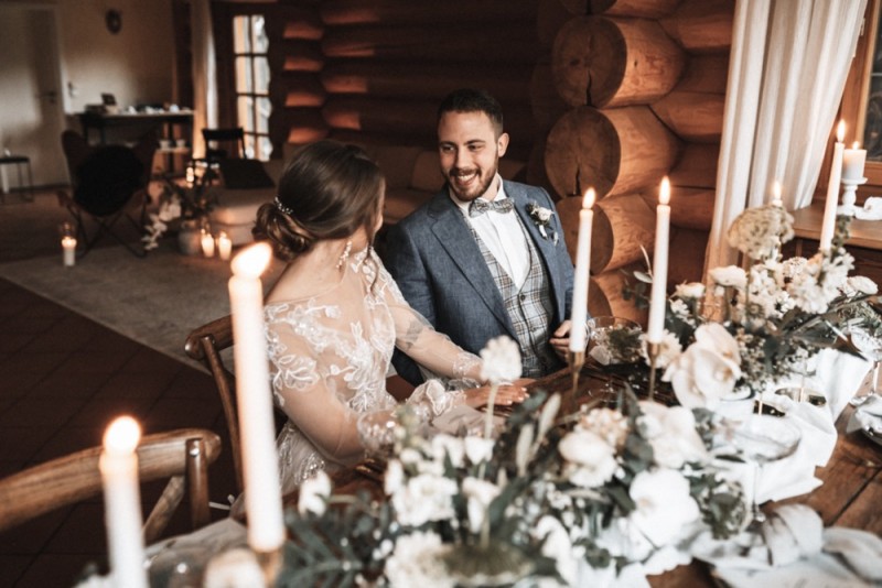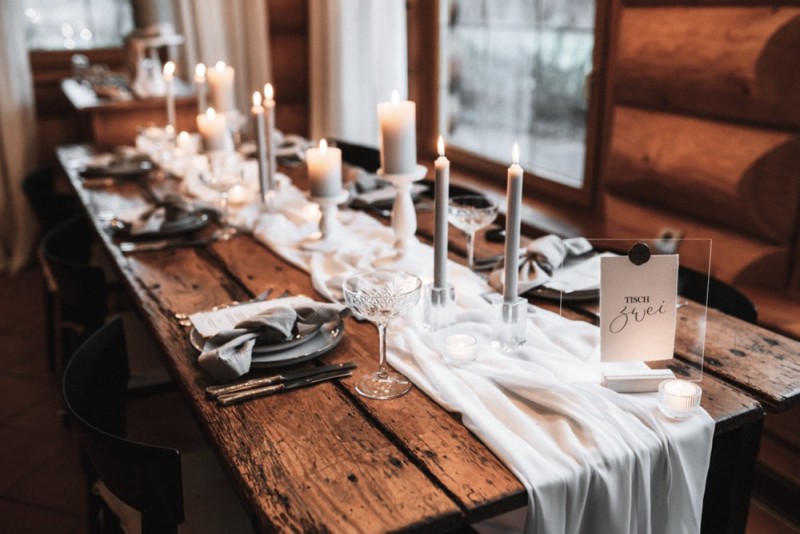 Passend zur zeitlos schönen Hochzeitspapeterie in grauen, weißen und schwarzen Zügen, voller kleiner liebevoller Details, von Julezlettering, erwarten uns hier gleich zwei tolle Settings für die Hochzeitsfeier. Coole Grüntöne und strahlendes Weiß erhellen, in der Floristik auf dem Dinner Table, den ganzen Raum des Chalets, der mit seinem warmen Holz und flackerndem Kerzenschein, pure Gemütlichkeit ausstrahlt. Etwas reduzierter und eleganter ist das zweite Setting, das vor allem auf Kerzenschein und die Wirkung der modernen Farbakzente setzt. Doch bevor das süße Brautpaar hier Platz nahm und von den Barmännern im Quadrat mit leckerem Gin von Paul Gin und feinem Prossecco von SCAVI & RAY verwöhnt wurde, feierten sie eine wunderschöne freie Trauung im großzügigen Außenbereich des Guts, inmitten eines Naturschutzgebiets.