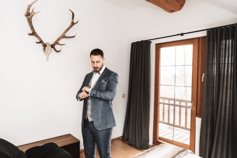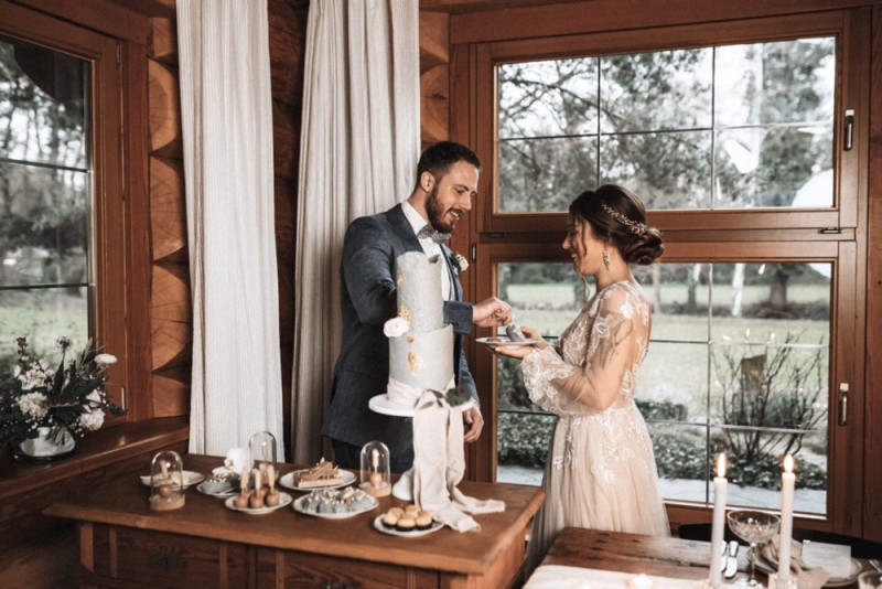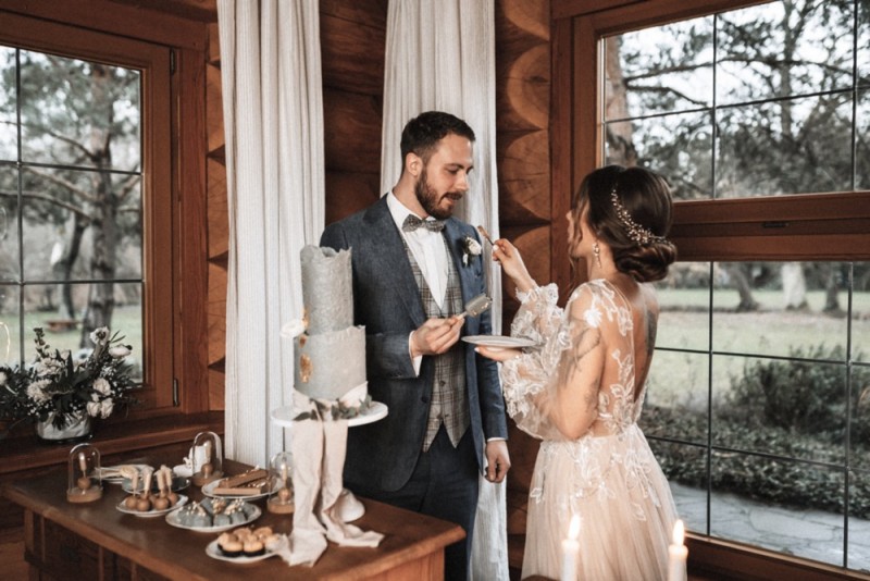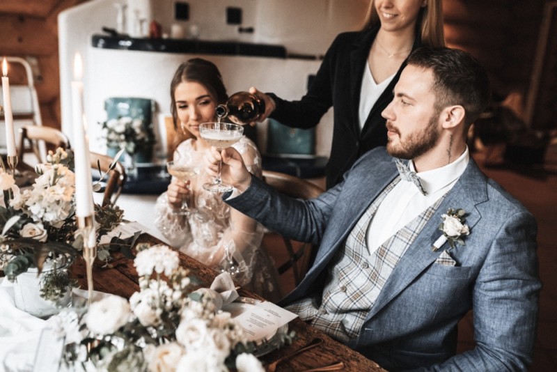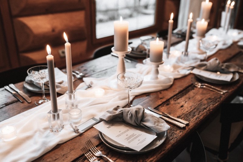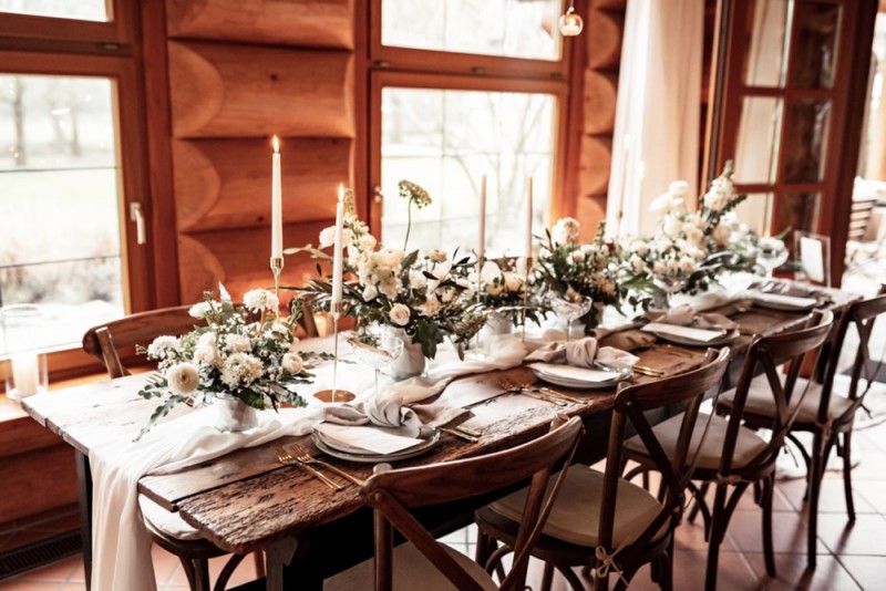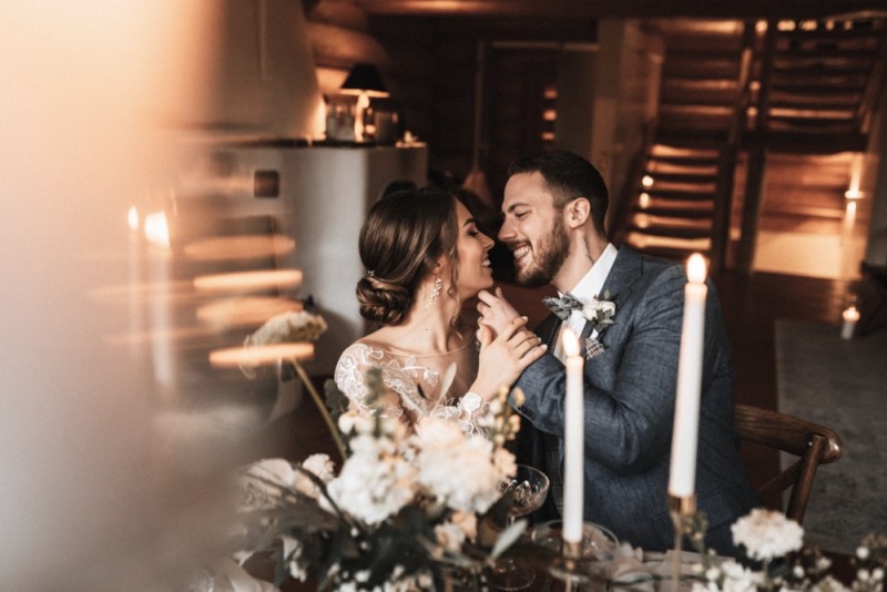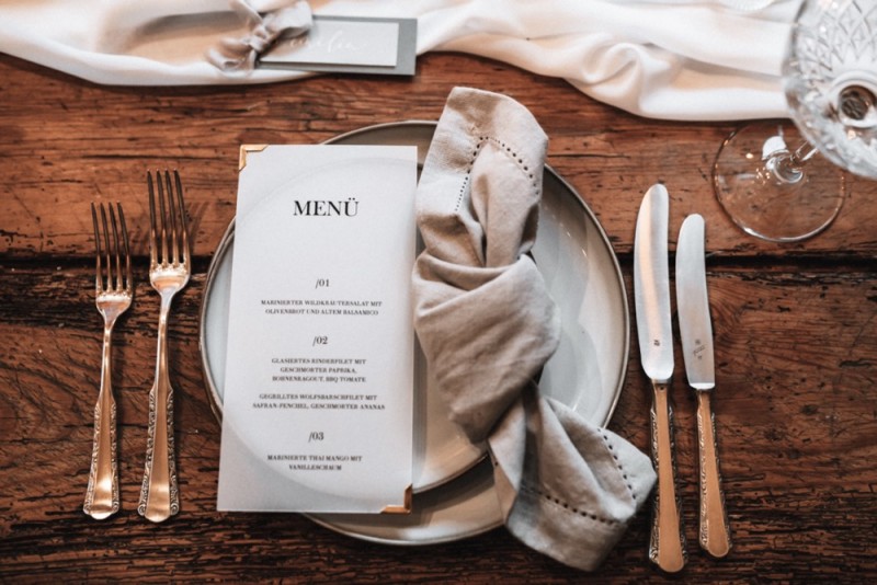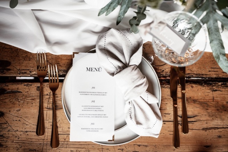 Passend zur zeitlos schönen Hochzeitspapeterie in grauen, weißen und schwarzen Zügen, voller kleiner liebevoller Details, von Julezlettering, erwarten uns hier gleich zwei tolle Settings für die Hochzeitsfeier. Coole Grüntöne und strahlendes Weiß erhellen, in der Floristik auf dem Dinner Table, den ganzen Raum des Chalets, der mit seinem warmen Holz und flackerndem Kerzenschein, pure Gemütlichkeit ausstrahlt. Etwas reduzierter und eleganter ist das zweite Setting, das vor allem auf Kerzenschein und die Wirkung der modernen Farbakzente setzt. Doch bevor das süße Brautpaar hier Platz nahm und von den Barmännern im Quadrat mit leckerem Gin von Paul Gin und feinem Prossecco von SCAVI & RAY verwöhnt wurde, feierten sie eine wunderschöne freie Trauung im großzügigen Außenbereich des Guts, inmitten eines Naturschutzgebiets.