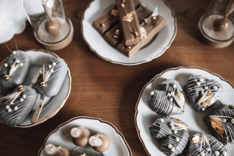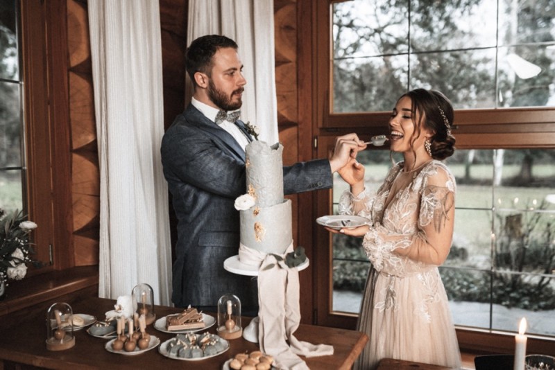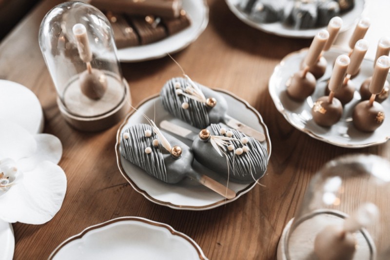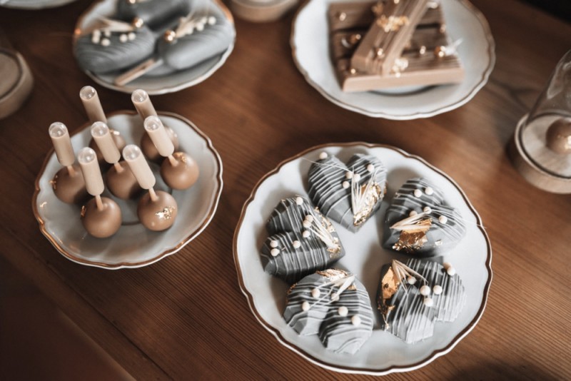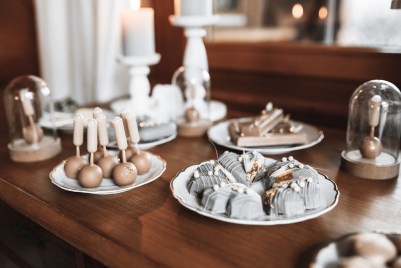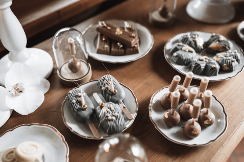 Nach der schönen Trauzeremonie im Grünen dürfen sich die beiden über den opulenten Sweet Table hermachen, den ihnen Anna Bremer von Törtlichkeit kreierte. Eine große zweistöckige Hochzeitstorte in moderner Folientechnik ist das Centerpiece dieses vielfältigen Sweet Tables in eleganten Grautönen. Aufwendige Köstlichkeiten und detailverliebte Cake Popsicle runden den luxuriösen Sweet Table perfekt ab.