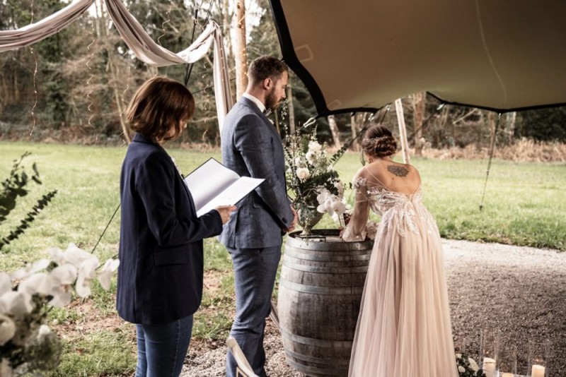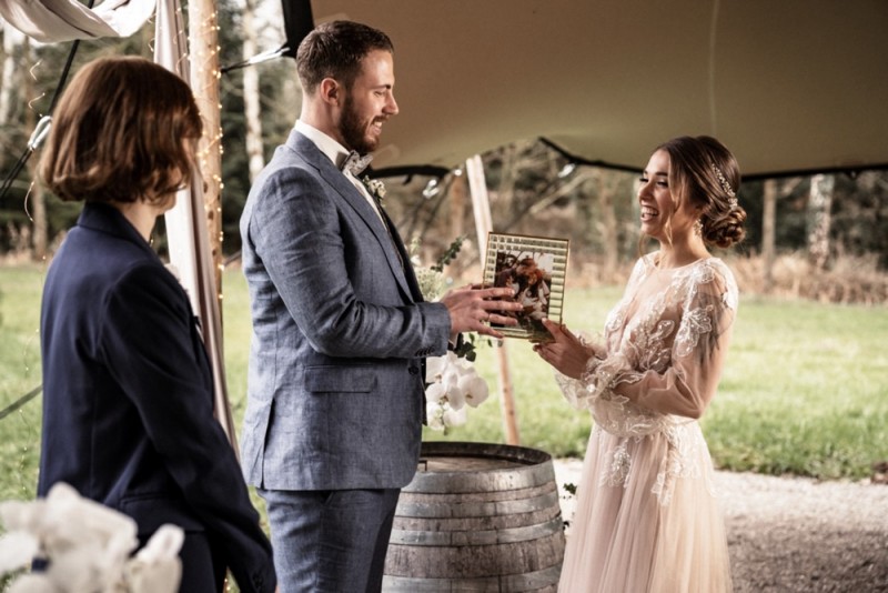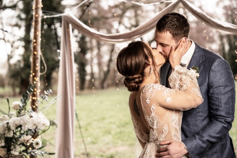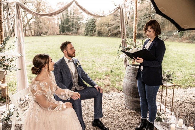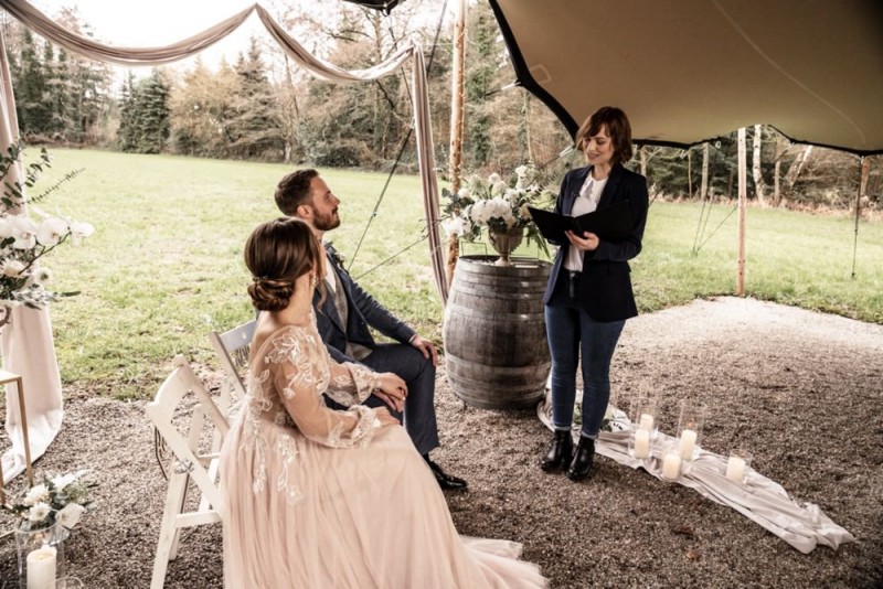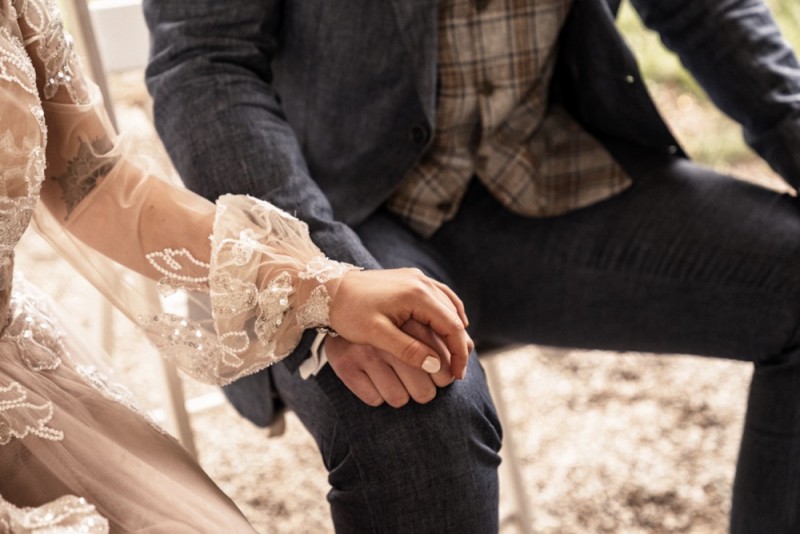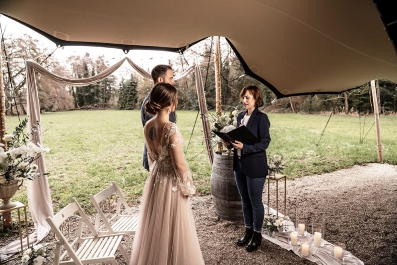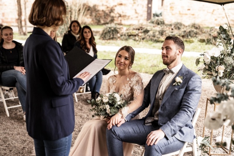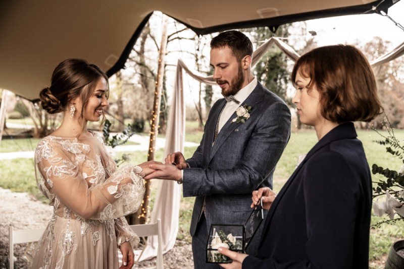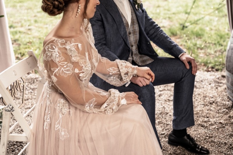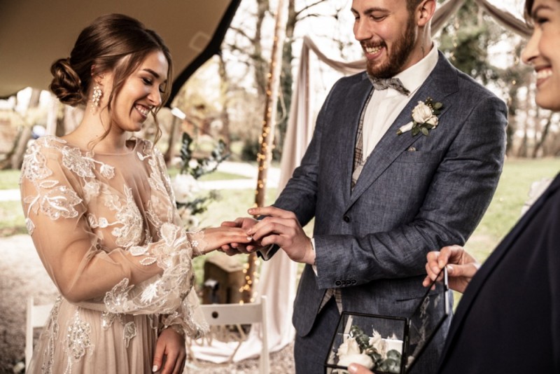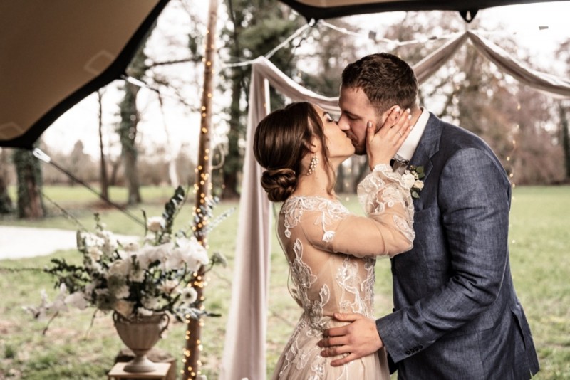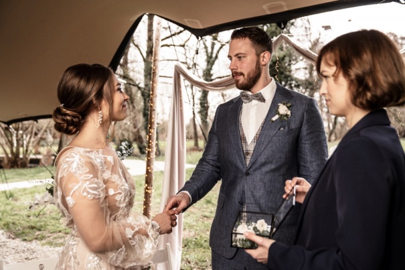 In einem atemberaubenden, beige-blushfarbenen Brautkleid mit langen transparenten Ärmeln von Mara Madi, dessen florale Details am semitransparenten Oberteil mit Pailletten und Perlen bestickt sind, und einem traumhaft schönen Styling mit perfektem Updo und elegantem Makeup, kreiert von Hair & Makeup Artist Maria Doukali, tritt die hübsche Braut Joya in dieser Inspiration vor ihren Bräutigam. Ihr zarter Schmuck von Perlenbräute und das edle Headpiece von Novalee Headpieces, strahlen mit ihren Augen um die Wette, als sie im Grünen unter einem geschmückten Zelt auf ihren Bräutigam trifft. Gemeinsam schreiten sie vor die liebe Iris von Vertraute Worte, die ihnen eine romantische freie Trauung hält. In einem eleganten Hochzeitsanzug von Amabilis Wedding, in stylischem Blau und zu Weste und Fliege im Checked Pattern kombiniert, legt der hübsche Bräutigam Pat seiner Braut den Hochzeitsring von Juwelier Otto Parr an. Die beiden können diesen besonderen Moment, im intimen Kreis und mit Traurednerin Iris, in vollen Zügen genießen, da ihr wunderschön geschmücktes und zugleich modernes Zelt, behangen mit eleganten Soffen und leuchtenden Lichterketten, eine Trauung im Freien bei jedem Wetter möglich macht. Gemütlichkeit garantiert!