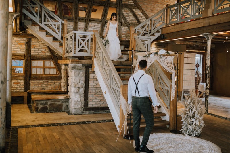 Wo bedingungslose Liebe ist, da wird nie Kälte herrschen. Bei dieser schönen Hochzeitsinspiration für Bohohochzeiten ist genau das in jeder Aufnahme zu spüren. Denn obwohl dies eine Inspiration einer Winterhochzeit ist, scheint sie völlig frei von Zeit und Temperaturen zu sein. Wundervoll fotografiert von Hochzeitsfotografin Laura Belo und detailverliebt geplant von Stefeliz Wedding & Events ist diese Bohoinspiration für Bohoherzen entstanden. Im schönen G2 Events Gottmadingen, einer rustikalen und dennoch herrlich hellen Hochzeitslocation, fand dieses besondere Shooting statt. Das helle Holz in den lichtdurchfluteten Räumen und die hohen Decken schaffen ein warmes und gemütliches Flair, in dem Kerzenschein für Wärme und Romantik sorgt. Weiße Kerzen in verschiedenen Größen und in goldenen Kerzenständern, große sowie kleine Vasen gefüllt mit prächtiger und wilder Floristik in Weiß-, Creme- und Grüntönen, sowie feine Makramees machen den schönen Boholook perfekt. An den steinernen Wänden finden sich zarte Blumenkränze und goldene Spiegel – und mittendrin ein liebendes Brautpaar, Dilek & Alperen, die von der Galerie über die einmalig schöne Treppe hinabgeschritten kommen. Durch einen geschmückten Traubogen hindurch, zu ihrer Trauzeremonie. Diese bezaubernde Szenerie kreierte BLOOMERY by JUDY durch die liebevolle Dekoration und Floristik, zu der natürlich auch ein grandioser Brautstrauß gehört. Unten angekommen, in einem zart fließenden Brautkleid mit einem semitransparenten Spitzentop, von Angelex Princess, erwartet die hübsche Braut die Trauzeremonie mit ihrem Bräutigam. Ihr langes Haar wurde von Thanh Thanh Neziri zu einem Fischgrätenzopf nach hinten geflochten und fällt ihr nun halboffen in zarten Locken den Rücken und die Schultern hinunter. Gekrönt durch zarten Haarschmuck, mit feinen Ohrringen von Hushed Commotion via KLOSTER Festfein Boutique geschmückt und ihren wilden Brautstrauß haltend, lauscht sie gemeinsam mit ihrem Bräutigam der emotionalen Traurede von Traurednerin Catherine Heinzelmann. Nach dem Ja-Wort und dem Ringtausch ihrer Eheringe, von Anna Russo, lassen uns die beiden bei einem romantischen Brautpaarshooting an ihrer Liebe teilhaben. Die Aufnahmen davon sind einfach zu schön! Abgerundet wird diese magische Inspiration durch den spektakulären Sweet Table, den Babobaker für das Paar kreierte. Zwei wirklich außergewöhnliche Hochzeitstorten, aufwendig verzierte Kekse und bemalte Cupcakes im floralen Design warten nur darauf, von euch bestaunt zu werden. Den tollen Caketopper findet ihr übrigens bei meiner lieben Kollegin Barbara in ihrem The Little Wedding Corner Shop.