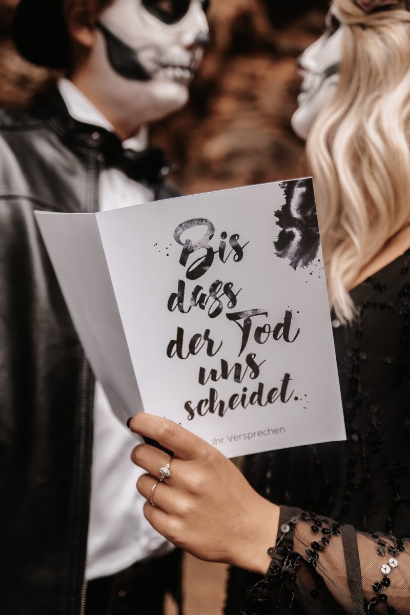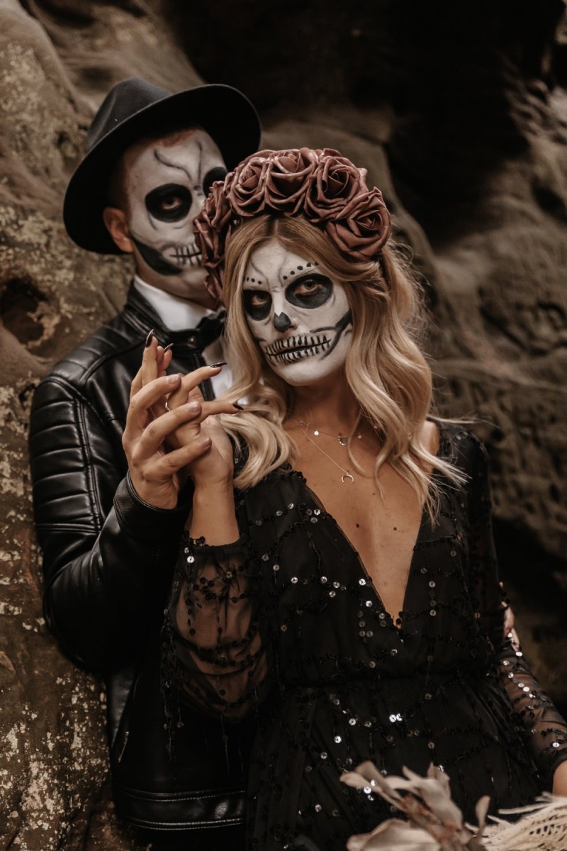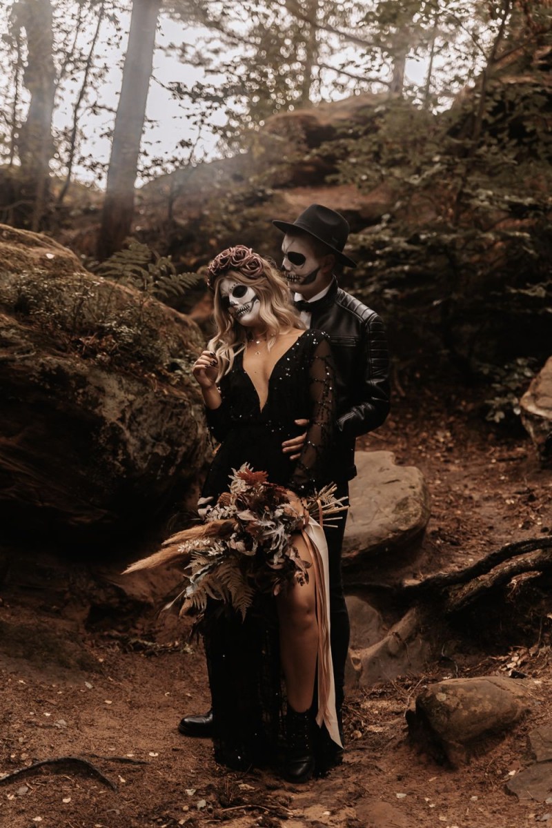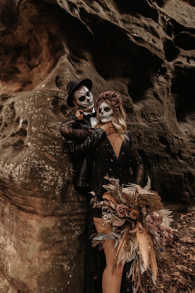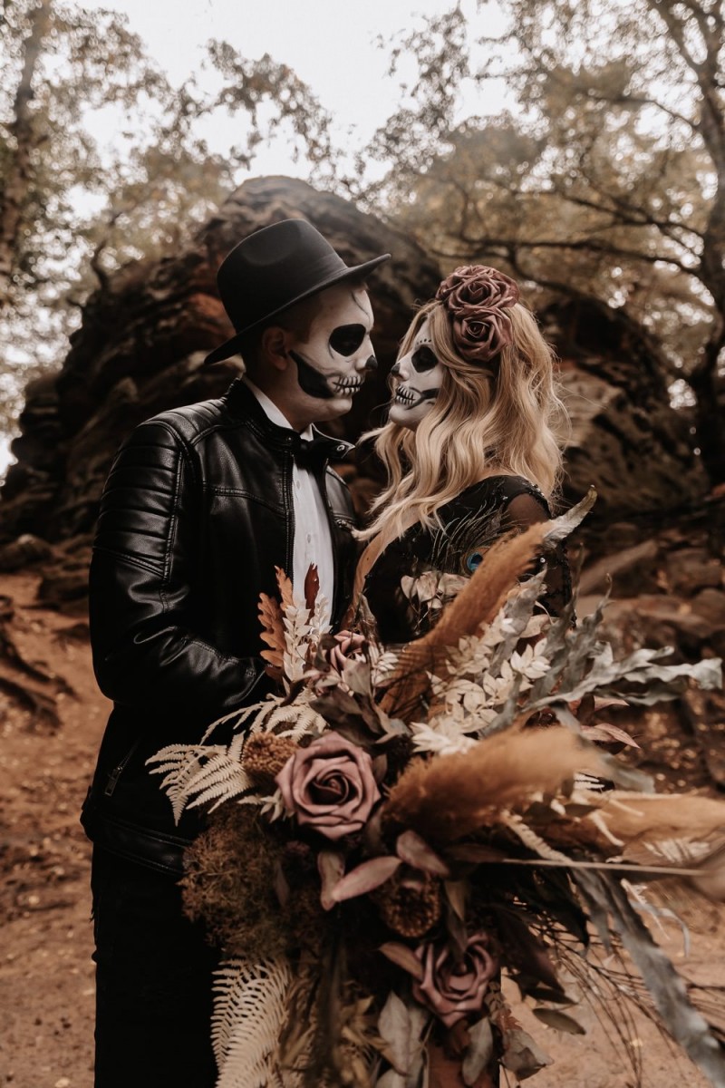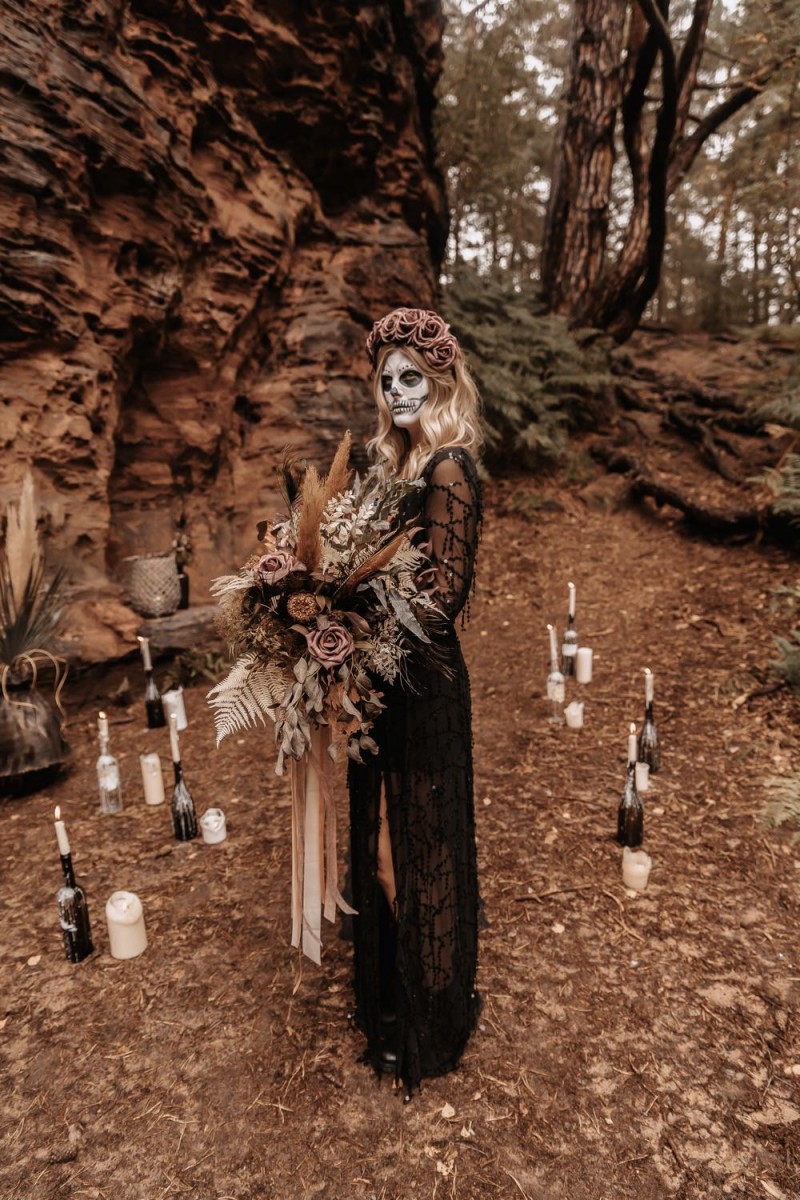 Hochzeitsfotografin Cathy Kohlenberg schnappte sich für diese Halloween Hochzeitsinspiration Natalie & Marcel, die als reisebegeistertes Paar bekannt sind, und führte sie in einen abgelegenen Wald. Dieser erinnert mit seinem lehmigen Felsgestein und den herbstlichen Brauntönen jedoch viel mehr an eine trockene Wüstenlandschaft. Und in dieser tollen Location begann das düstere Spektakel! Ganz im Brauch des mexikanischen Dia de los Muertos schminkte Hair & Makeup Artist Verena Kolks von Puderglück den beiden den angesagten Sugar Skull. Natalie bekam dazu einen opulenten Blumenhaarreif mit großblütigen Edelrosen im Farbton Lila-Flieder, der ihr gewelltes blondes Haar krönte. Mystisch und etwas düster zugleich – herrlich! Ein elegantes schwarzes Kleid mit transparentem Stoff, feinen Pailletten und hohem Schlitz über dem kurzen Unterkleid, ihre langen schwarzen Nägel sowie die derben schwarzen Boots machten ihren Halloween-Look einfach perfekt. Passend zu ihrer tollen Flowercrown zauberte Sandra Jonas von Flores ihr einen wilden, ausladenden Brautstrauß mit Rosen in Lila-Flieder, Pampasgras, gebleichtem Farn und Ruscus, Laub, Pfauenfedern und Banksia. Marcel trägt zu seinem Skelett-Makeup eine zerrissene Jeans in Schwarz, ebenfalls derbe schwarze Boots, ein weißes Hemd mit schwarzer Fliege und eine coole Lederjacke sowie einen schwarzen Hut. Ein geniales und ziemlich heißes Halloween-Brautpaar wie ich finde! Romantisch wurde es bei dieser Inspiration aber auch! Bei einem kleinen Elopement-Setting, bestehend aus großen Stumpenkerzen, hohen Kerzenständern und heruntergebrannten Stabkerzen in Weinflaschen, sowie großen schwarzen Bodenvasen, gefüllt mit Trockenblumen, feierten die beiden unter freiem Himmel ihre Liebe und lasen sich ihre Ehegelübde vor. „Bis dass der Tod uns scheidet“ – sowohl die Ehegelübde als auch die ganze Hochzeitspapeterie im Halloweenstil, kreiert von Miss Evangeline Hochzeitspapeterie, ist mit weißen, grau-braunen und orangenen Details ein absoluter Hingucker! Neben dem feinen Setting für das Elopement, kreierte Stefanie Dahmen eine große Hochzeitstafel, dessen Dekoration in der Farbkombination aus Grau, Schwarz-Braun und Weiß jeden Moodyfan zum Strahlen bringen dürfte. Herbstliche Züge durch getrocknete und schwarzgefärbte Hortensien und Eukalyptus, schwarz-weiß bemalte Kürbisse und allerlei Kerzen und Teelichter in Schwarz, Silber und dunklem Grau treffen auf eine schwarze Hochzeitstorte im Halloween-Look, die mit herbstlichen Trockenblumen geschmückt und von verzierten Macarons in einem zarten Orange umgeben ist. Diese sowie die schwarzen Cupcakes, die auf dem feinen schwarzen Geschirr samt schwarzen Platztellern neben den bemalten Kürbissen glänzten, zauberte The Baker’s Wife.