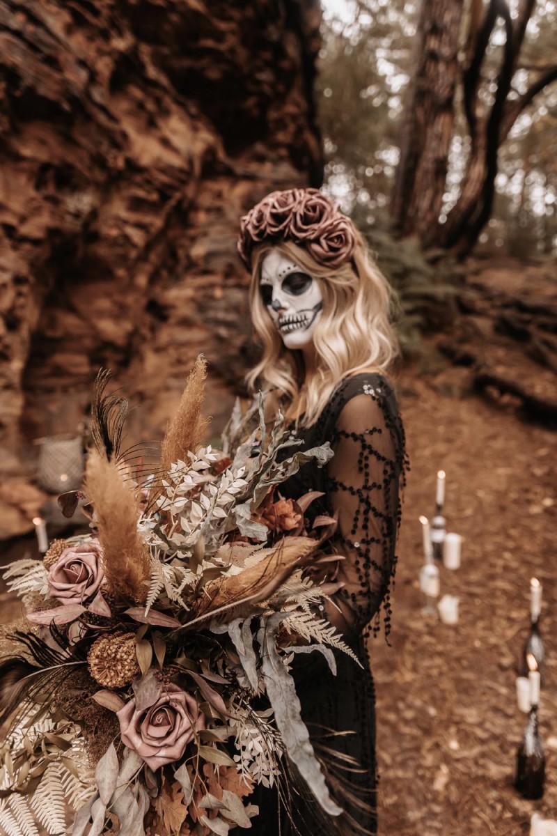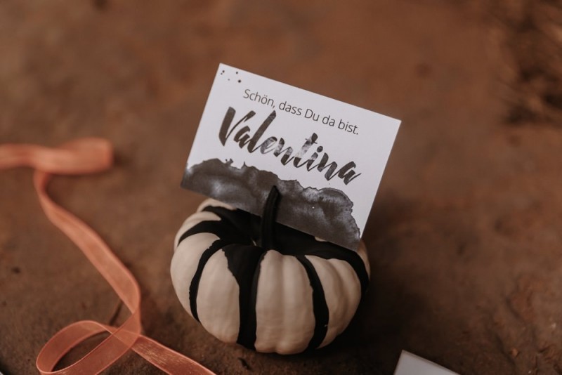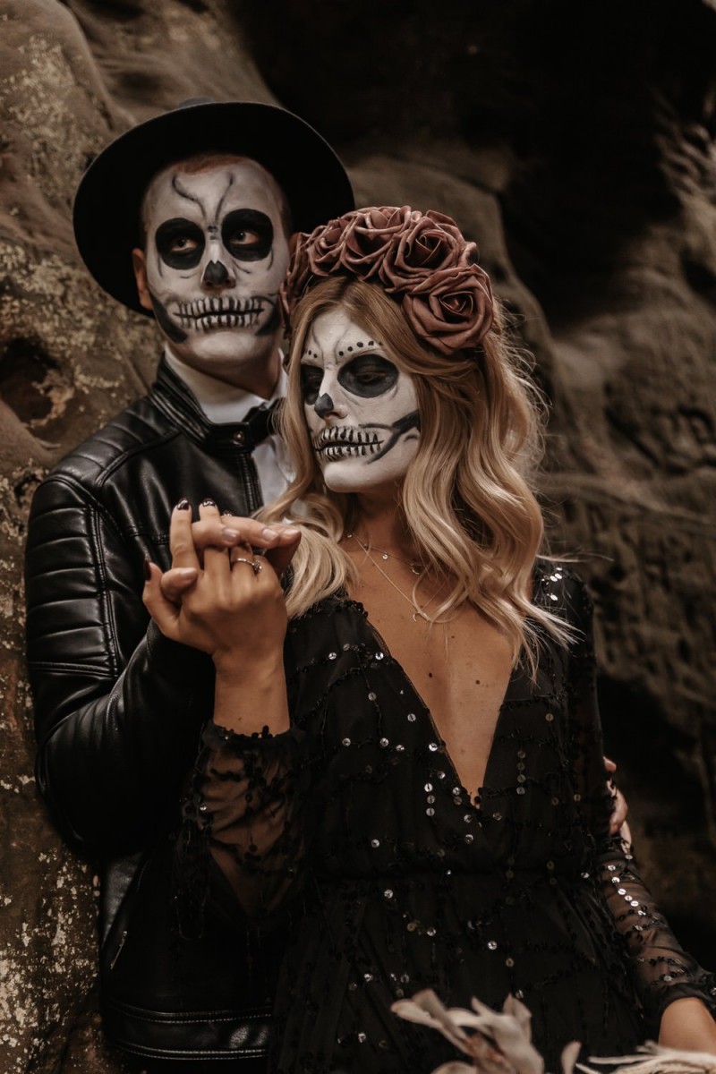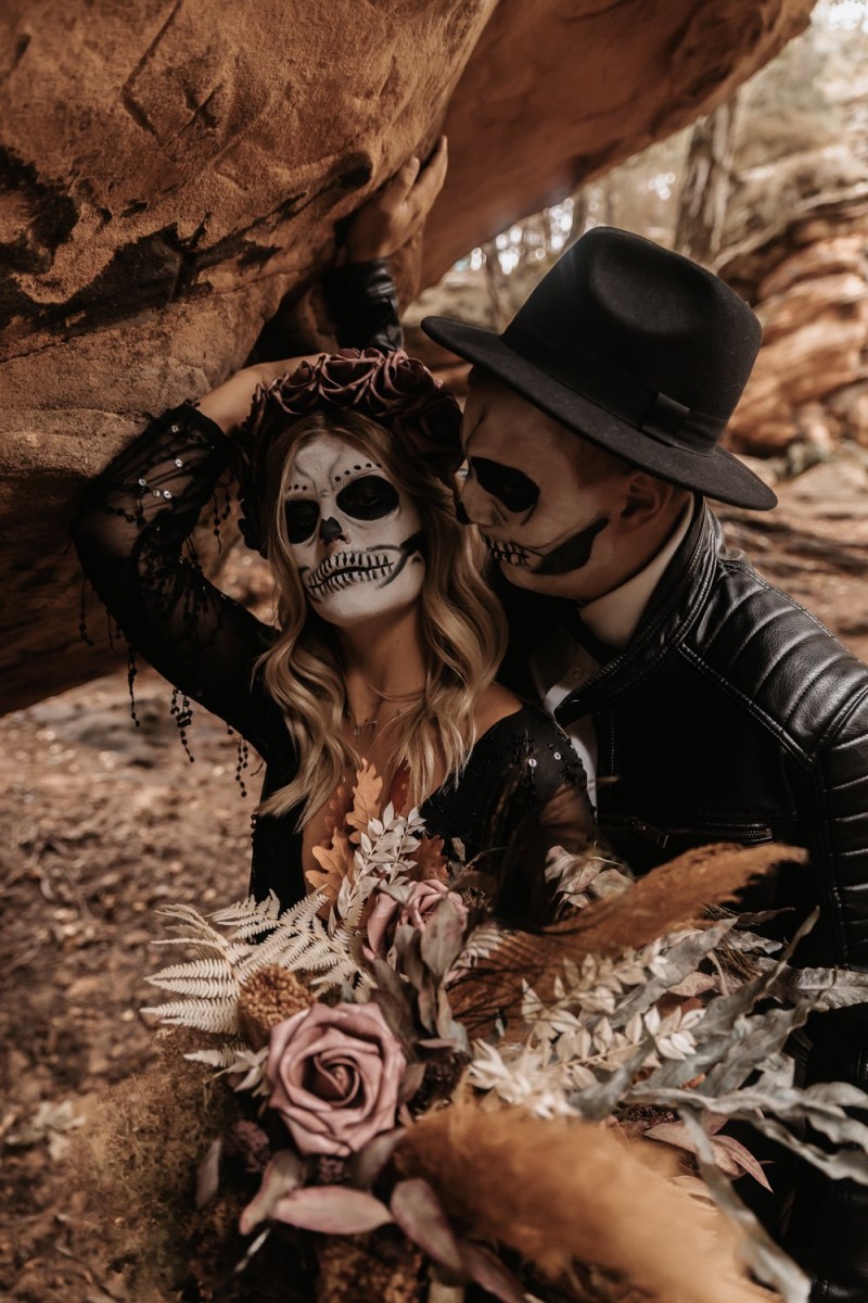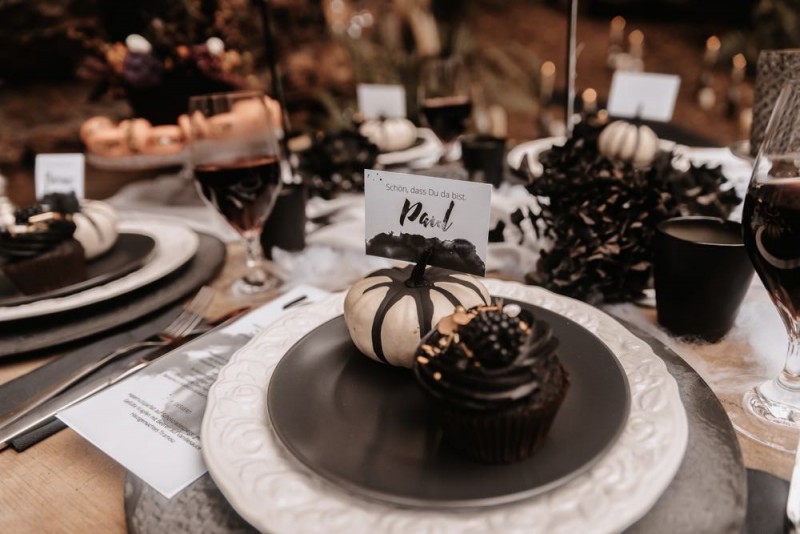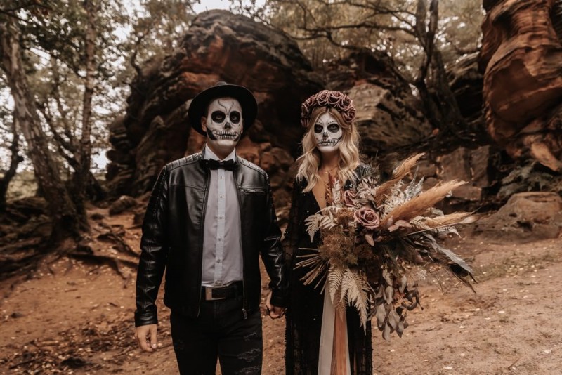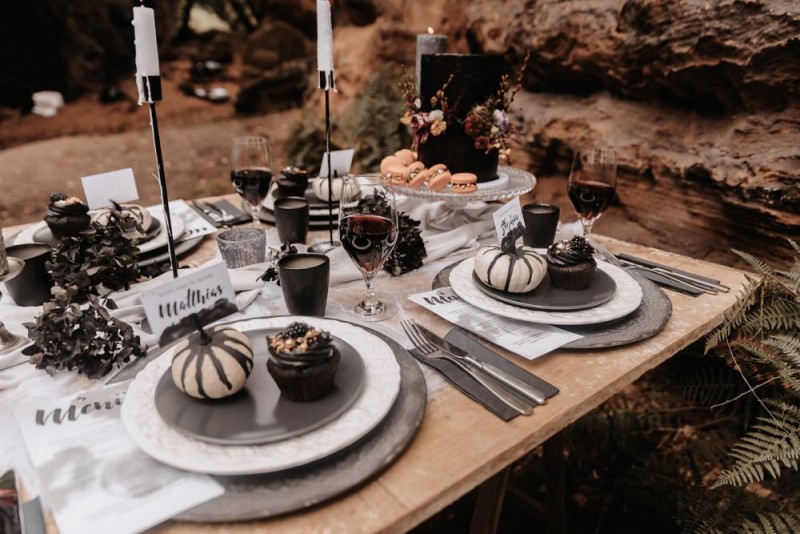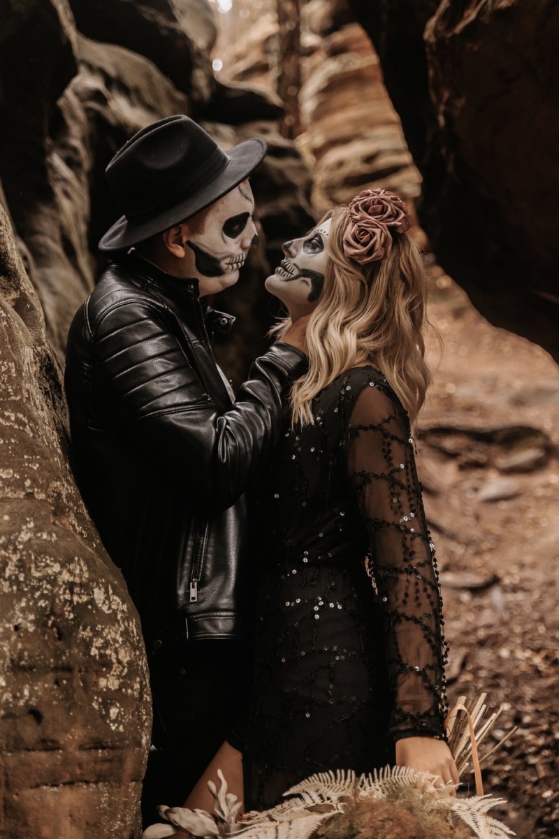 Hochzeitsfotografin Cathy Kohlenberg schnappte sich für diese Halloween Hochzeitsinspiration Natalie & Marcel, die als reisebegeistertes Paar bekannt sind, und führte sie in einen abgelegenen Wald. Dieser erinnert mit seinem lehmigen Felsgestein und den herbstlichen Brauntönen jedoch viel mehr an eine trockene Wüstenlandschaft. Und in dieser tollen Location begann das düstere Spektakel! Ganz im Brauch des mexikanischen Dia de los Muertos schminkte Hair & Makeup Artist Verena Kolks von Puderglück den beiden den angesagten Sugar Skull. Natalie bekam dazu einen opulenten Blumenhaarreif mit großblütigen Edelrosen im Farbton Lila-Flieder, der ihr gewelltes blondes Haar krönte. Mystisch und etwas düster zugleich – herrlich! Ein elegantes schwarzes Kleid mit transparentem Stoff, feinen Pailletten und hohem Schlitz über dem kurzen Unterkleid, ihre langen schwarzen Nägel sowie die derben schwarzen Boots machten ihren Halloween-Look einfach perfekt. Passend zu ihrer tollen Flowercrown zauberte Sandra Jonas von Flores ihr einen wilden, ausladenden Brautstrauß mit Rosen in Lila-Flieder, Pampasgras, gebleichtem Farn und Ruscus, Laub, Pfauenfedern und Banksia. Marcel trägt zu seinem Skelett-Makeup eine zerrissene Jeans in Schwarz, ebenfalls derbe schwarze Boots, ein weißes Hemd mit schwarzer Fliege und eine coole Lederjacke sowie einen schwarzen Hut. Ein geniales und ziemlich heißes Halloween-Brautpaar wie ich finde! Romantisch wurde es bei dieser Inspiration aber auch! Bei einem kleinen Elopement-Setting, bestehend aus großen Stumpenkerzen, hohen Kerzenständern und heruntergebrannten Stabkerzen in Weinflaschen, sowie großen schwarzen Bodenvasen, gefüllt mit Trockenblumen, feierten die beiden unter freiem Himmel ihre Liebe und lasen sich ihre Ehegelübde vor. „Bis dass der Tod uns scheidet“ – sowohl die Ehegelübde als auch die ganze Hochzeitspapeterie im Halloweenstil, kreiert von Miss Evangeline Hochzeitspapeterie, ist mit weißen, grau-braunen und orangenen Details ein absoluter Hingucker! Neben dem feinen Setting für das Elopement, kreierte Stefanie Dahmen eine große Hochzeitstafel, dessen Dekoration in der Farbkombination aus Grau, Schwarz-Braun und Weiß jeden Moodyfan zum Strahlen bringen dürfte. Herbstliche Züge durch getrocknete und schwarzgefärbte Hortensien und Eukalyptus, schwarz-weiß bemalte Kürbisse und allerlei Kerzen und Teelichter in Schwarz, Silber und dunklem Grau treffen auf eine schwarze Hochzeitstorte im Halloween-Look, die mit herbstlichen Trockenblumen geschmückt und von verzierten Macarons in einem zarten Orange umgeben ist. Diese sowie die schwarzen Cupcakes, die auf dem feinen schwarzen Geschirr samt schwarzen Platztellern neben den bemalten Kürbissen glänzten, zauberte The Baker’s Wife.