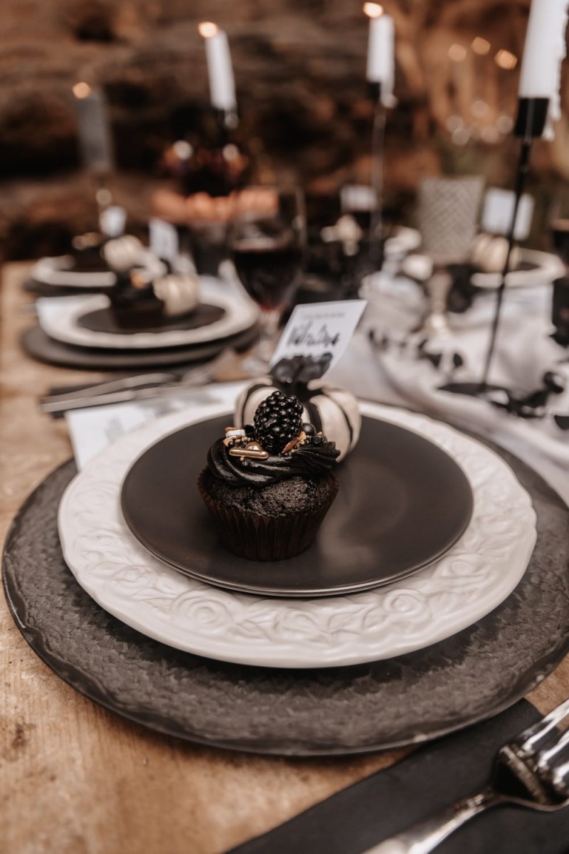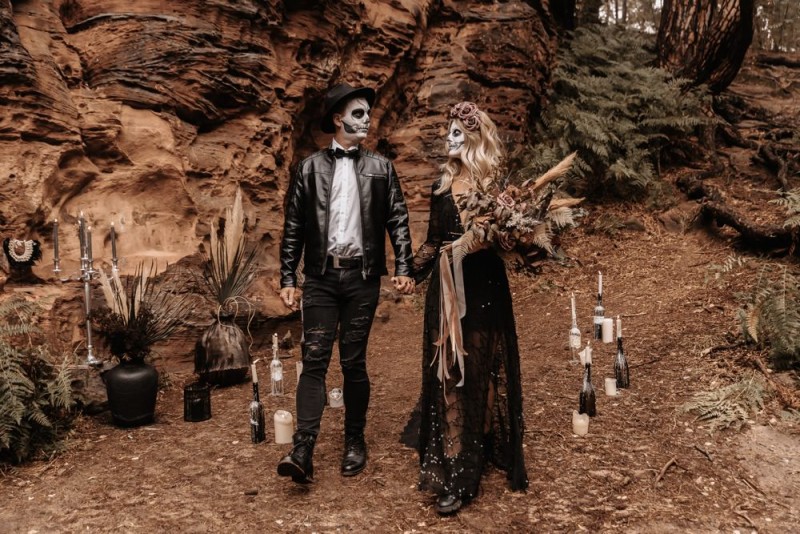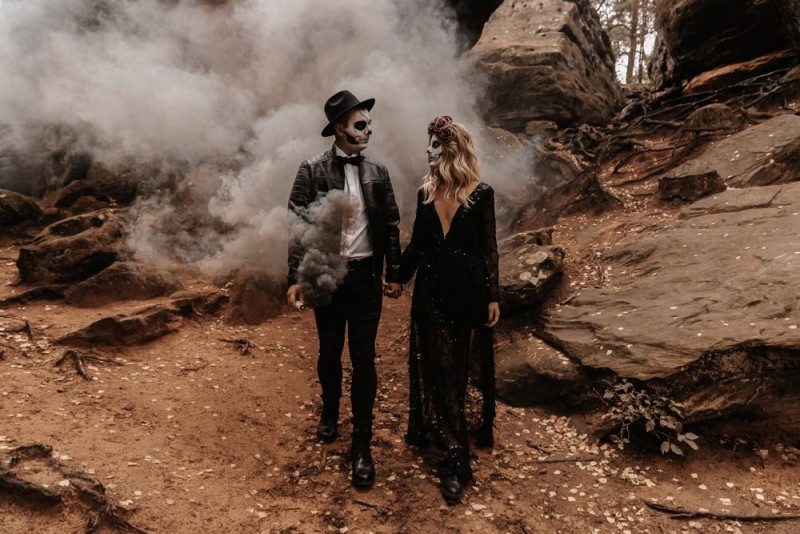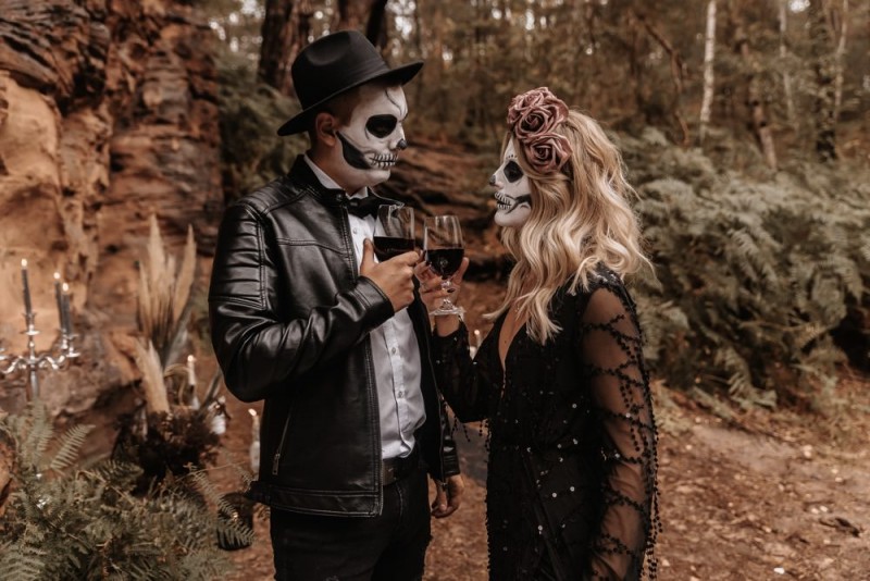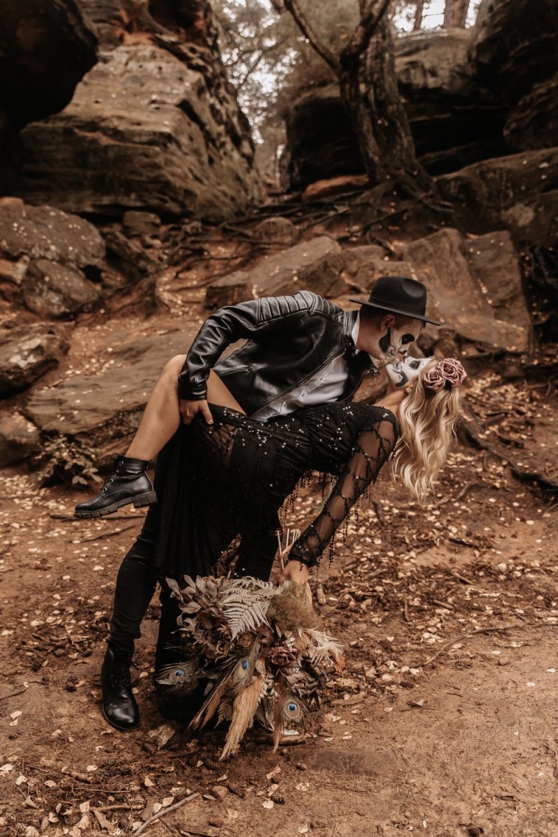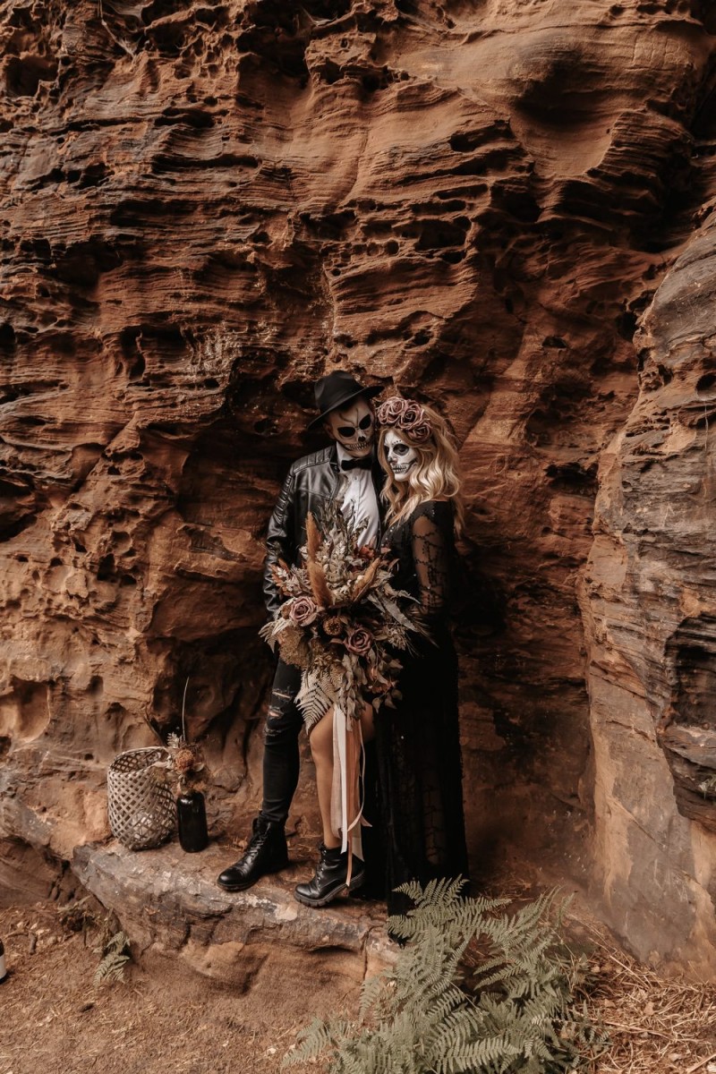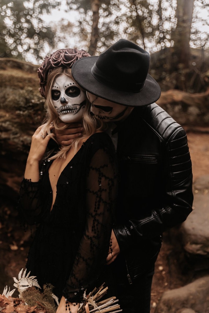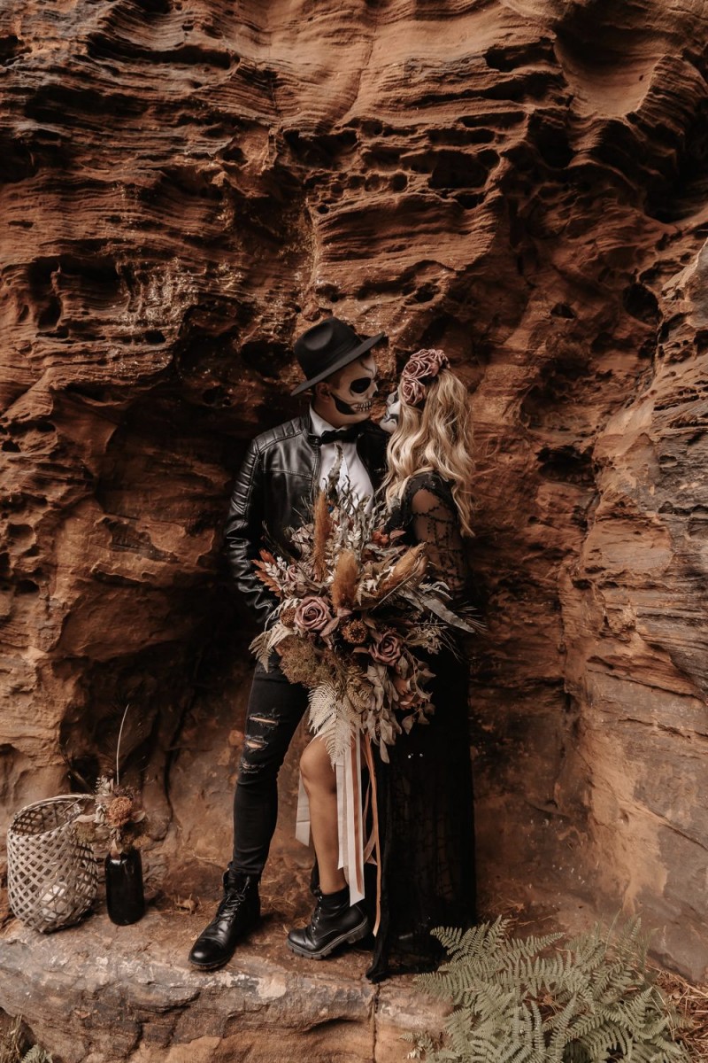 Hochzeitsfotografin Cathy Kohlenberg schnappte sich für diese Halloween Hochzeitsinspiration Natalie & Marcel, die als reisebegeistertes Paar bekannt sind, und führte sie in einen abgelegenen Wald. Dieser erinnert mit seinem lehmigen Felsgestein und den herbstlichen Brauntönen jedoch viel mehr an eine trockene Wüstenlandschaft. Und in dieser tollen Location begann das düstere Spektakel! Ganz im Brauch des mexikanischen Dia de los Muertos schminkte Hair & Makeup Artist Verena Kolks von Puderglück den beiden den angesagten Sugar Skull. Natalie bekam dazu einen opulenten Blumenhaarreif mit großblütigen Edelrosen im Farbton Lila-Flieder, der ihr gewelltes blondes Haar krönte. Mystisch und etwas düster zugleich – herrlich! Ein elegantes schwarzes Kleid mit transparentem Stoff, feinen Pailletten und hohem Schlitz über dem kurzen Unterkleid, ihre langen schwarzen Nägel sowie die derben schwarzen Boots machten ihren Halloween-Look einfach perfekt. Passend zu ihrer tollen Flowercrown zauberte Sandra Jonas von Flores ihr einen wilden, ausladenden Brautstrauß mit Rosen in Lila-Flieder, Pampasgras, gebleichtem Farn und Ruscus, Laub, Pfauenfedern und Banksia. Marcel trägt zu seinem Skelett-Makeup eine zerrissene Jeans in Schwarz, ebenfalls derbe schwarze Boots, ein weißes Hemd mit schwarzer Fliege und eine coole Lederjacke sowie einen schwarzen Hut. Ein geniales und ziemlich heißes Halloween-Brautpaar wie ich finde! Romantisch wurde es bei dieser Inspiration aber auch! Bei einem kleinen Elopement-Setting, bestehend aus großen Stumpenkerzen, hohen Kerzenständern und heruntergebrannten Stabkerzen in Weinflaschen, sowie großen schwarzen Bodenvasen, gefüllt mit Trockenblumen, feierten die beiden unter freiem Himmel ihre Liebe und lasen sich ihre Ehegelübde vor. „Bis dass der Tod uns scheidet“ – sowohl die Ehegelübde als auch die ganze Hochzeitspapeterie im Halloweenstil, kreiert von Miss Evangeline Hochzeitspapeterie, ist mit weißen, grau-braunen und orangenen Details ein absoluter Hingucker! Neben dem feinen Setting für das Elopement, kreierte Stefanie Dahmen eine große Hochzeitstafel, dessen Dekoration in der Farbkombination aus Grau, Schwarz-Braun und Weiß jeden Moodyfan zum Strahlen bringen dürfte. Herbstliche Züge durch getrocknete und schwarzgefärbte Hortensien und Eukalyptus, schwarz-weiß bemalte Kürbisse und allerlei Kerzen und Teelichter in Schwarz, Silber und dunklem Grau treffen auf eine schwarze Hochzeitstorte im Halloween-Look, die mit herbstlichen Trockenblumen geschmückt und von verzierten Macarons in einem zarten Orange umgeben ist. Diese sowie die schwarzen Cupcakes, die auf dem feinen schwarzen Geschirr samt schwarzen Platztellern neben den bemalten Kürbissen glänzten, zauberte The Baker’s Wife.