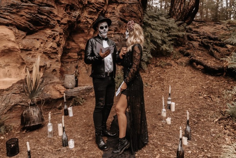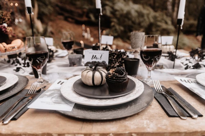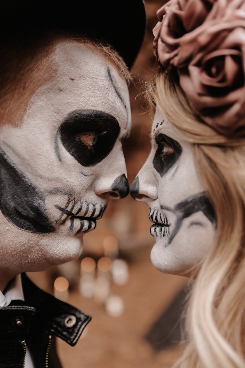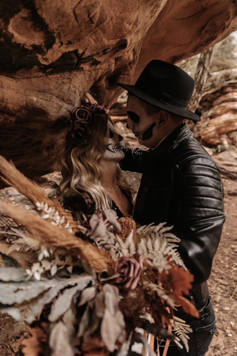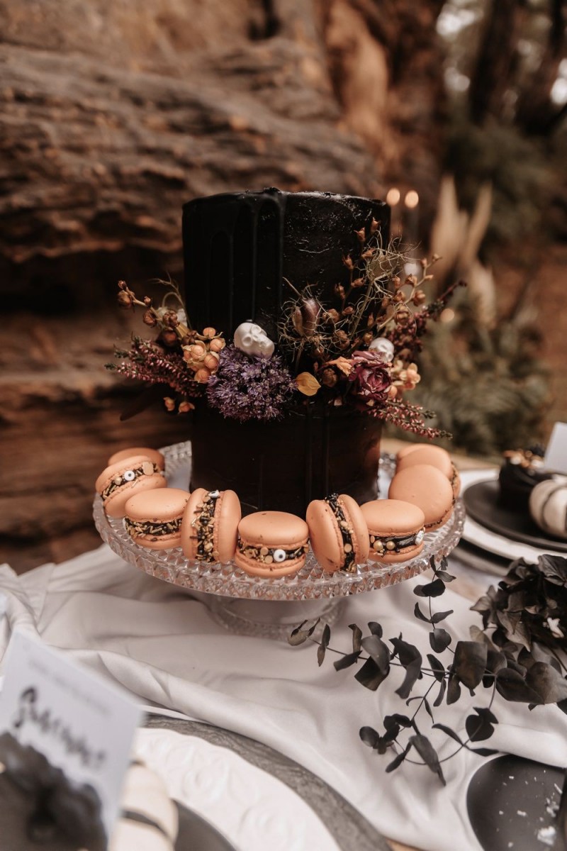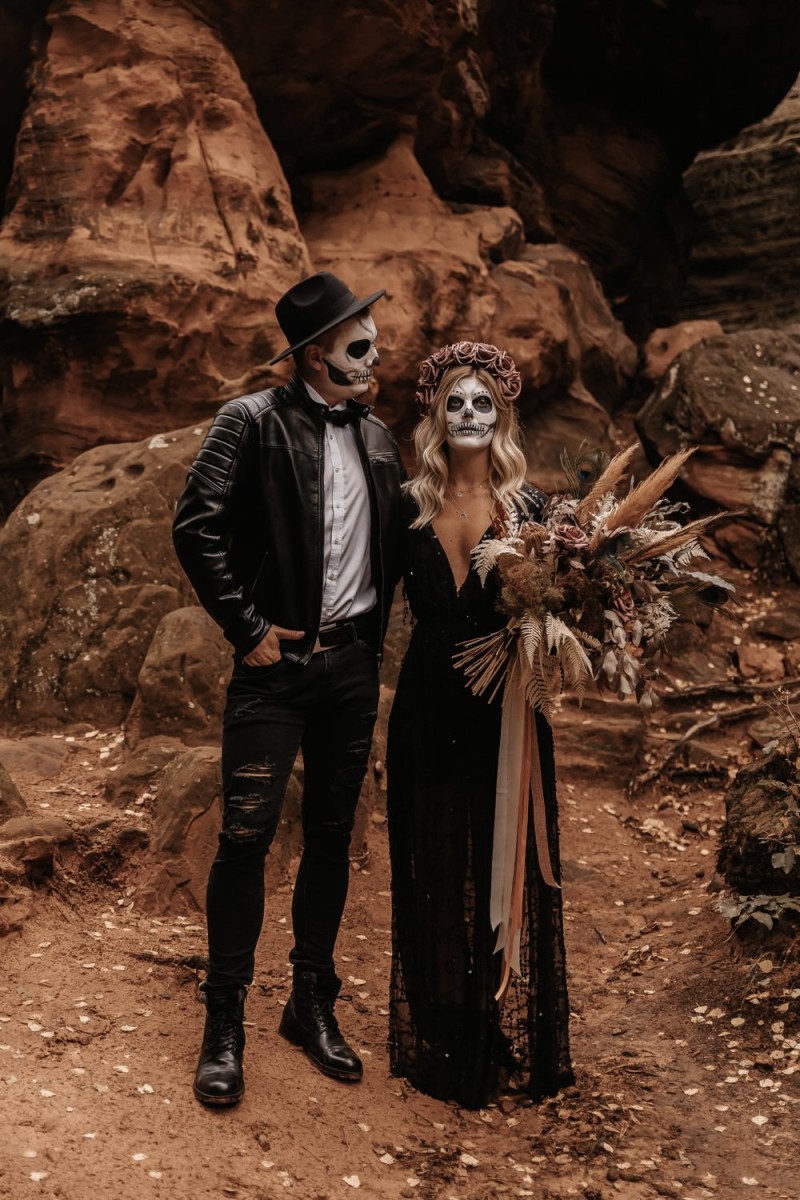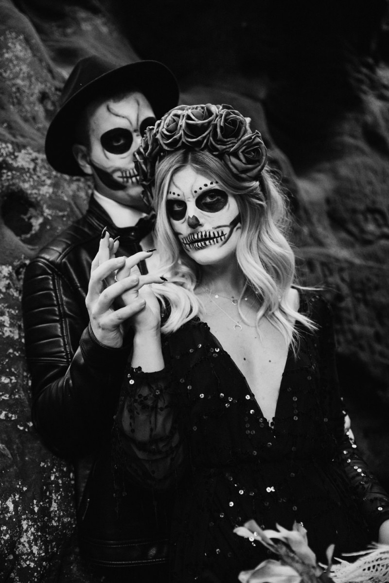 Hochzeitsfotografin Cathy Kohlenberg schnappte sich für diese Halloween Hochzeitsinspiration Natalie & Marcel, die als reisebegeistertes Paar bekannt sind, und führte sie in einen abgelegenen Wald. Dieser erinnert mit seinem lehmigen Felsgestein und den herbstlichen Brauntönen jedoch viel mehr an eine trockene Wüstenlandschaft. Und in dieser tollen Location begann das düstere Spektakel! Ganz im Brauch des mexikanischen Dia de los Muertos schminkte Hair & Makeup Artist Verena Kolks von Puderglück den beiden den angesagten Sugar Skull. Natalie bekam dazu einen opulenten Blumenhaarreif mit großblütigen Edelrosen im Farbton Lila-Flieder, der ihr gewelltes blondes Haar krönte. Mystisch und etwas düster zugleich – herrlich! Ein elegantes schwarzes Kleid mit transparentem Stoff, feinen Pailletten und hohem Schlitz über dem kurzen Unterkleid, ihre langen schwarzen Nägel sowie die derben schwarzen Boots machten ihren Halloween-Look einfach perfekt. Passend zu ihrer tollen Flowercrown zauberte Sandra Jonas von Flores ihr einen wilden, ausladenden Brautstrauß mit Rosen in Lila-Flieder, Pampasgras, gebleichtem Farn und Ruscus, Laub, Pfauenfedern und Banksia. Marcel trägt zu seinem Skelett-Makeup eine zerrissene Jeans in Schwarz, ebenfalls derbe schwarze Boots, ein weißes Hemd mit schwarzer Fliege und eine coole Lederjacke sowie einen schwarzen Hut. Ein geniales und ziemlich heißes Halloween-Brautpaar wie ich finde! Romantisch wurde es bei dieser Inspiration aber auch! Bei einem kleinen Elopement-Setting, bestehend aus großen Stumpenkerzen, hohen Kerzenständern und heruntergebrannten Stabkerzen in Weinflaschen, sowie großen schwarzen Bodenvasen, gefüllt mit Trockenblumen, feierten die beiden unter freiem Himmel ihre Liebe und lasen sich ihre Ehegelübde vor. „Bis dass der Tod uns scheidet“ – sowohl die Ehegelübde als auch die ganze Hochzeitspapeterie im Halloweenstil, kreiert von Miss Evangeline Hochzeitspapeterie, ist mit weißen, grau-braunen und orangenen Details ein absoluter Hingucker! Neben dem feinen Setting für das Elopement, kreierte Stefanie Dahmen eine große Hochzeitstafel, dessen Dekoration in der Farbkombination aus Grau, Schwarz-Braun und Weiß jeden Moodyfan zum Strahlen bringen dürfte. Herbstliche Züge durch getrocknete und schwarzgefärbte Hortensien und Eukalyptus, schwarz-weiß bemalte Kürbisse und allerlei Kerzen und Teelichter in Schwarz, Silber und dunklem Grau treffen auf eine schwarze Hochzeitstorte im Halloween-Look, die mit herbstlichen Trockenblumen geschmückt und von verzierten Macarons in einem zarten Orange umgeben ist. Diese sowie die schwarzen Cupcakes, die auf dem feinen schwarzen Geschirr samt schwarzen Platztellern neben den bemalten Kürbissen glänzten, zauberte The Baker’s Wife.