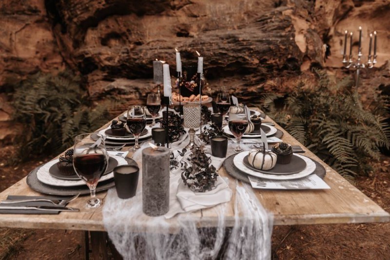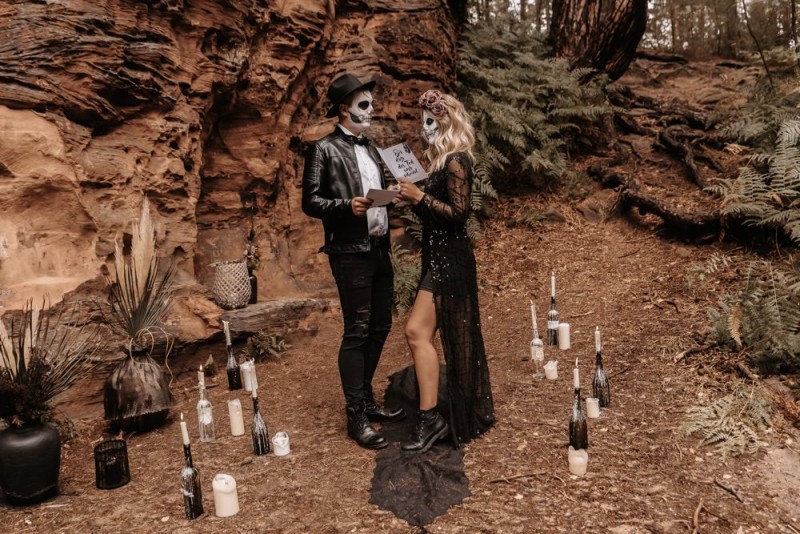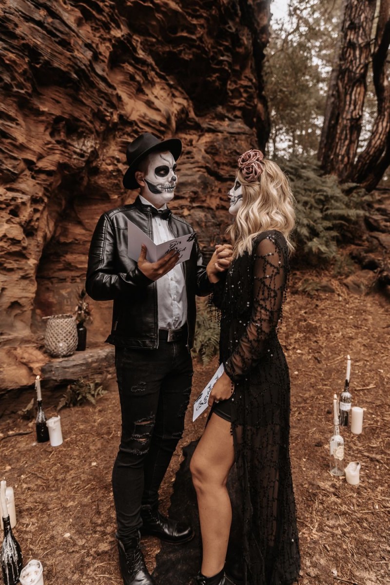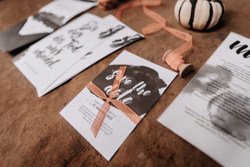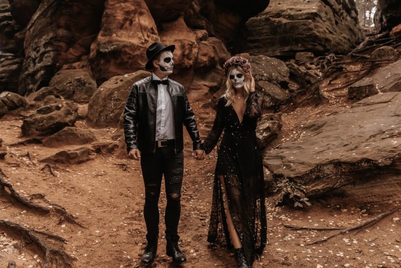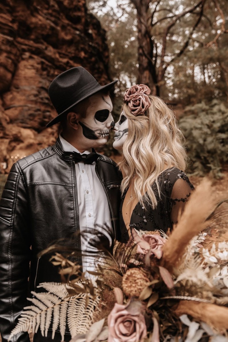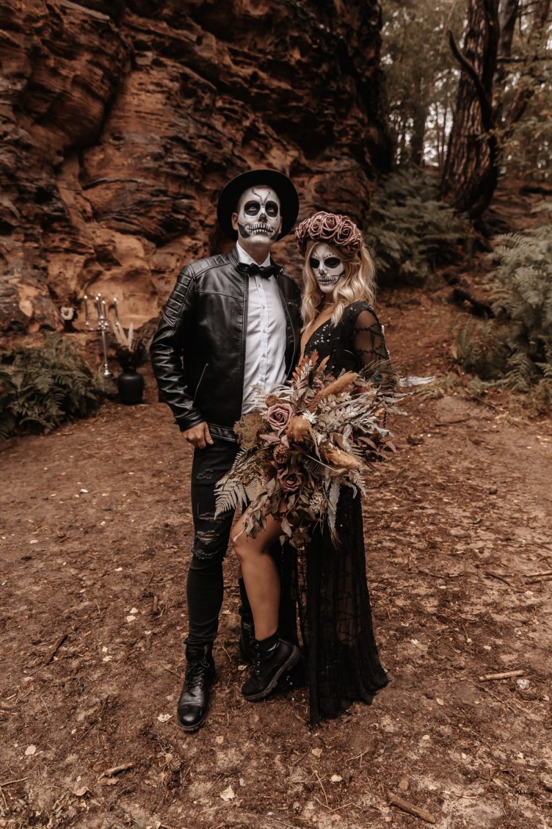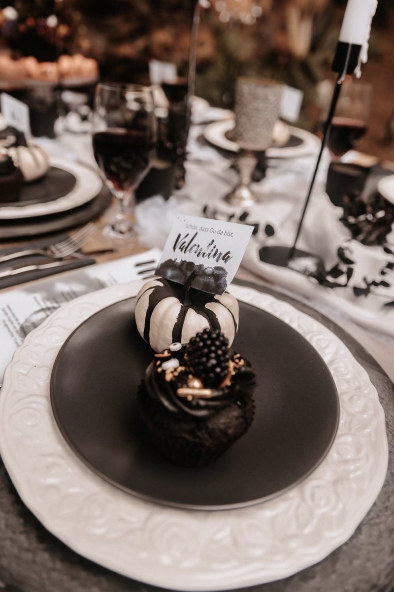 Hochzeitsfotografin Cathy Kohlenberg schnappte sich für diese Halloween Hochzeitsinspiration Natalie & Marcel, die als reisebegeistertes Paar bekannt sind, und führte sie in einen abgelegenen Wald. Dieser erinnert mit seinem lehmigen Felsgestein und den herbstlichen Brauntönen jedoch viel mehr an eine trockene Wüstenlandschaft. Und in dieser tollen Location begann das düstere Spektakel! Ganz im Brauch des mexikanischen Dia de los Muertos schminkte Hair & Makeup Artist Verena Kolks von Puderglück den beiden den angesagten Sugar Skull. Natalie bekam dazu einen opulenten Blumenhaarreif mit großblütigen Edelrosen im Farbton Lila-Flieder, der ihr gewelltes blondes Haar krönte. Mystisch und etwas düster zugleich – herrlich! Ein elegantes schwarzes Kleid mit transparentem Stoff, feinen Pailletten und hohem Schlitz über dem kurzen Unterkleid, ihre langen schwarzen Nägel sowie die derben schwarzen Boots machten ihren Halloween-Look einfach perfekt. Passend zu ihrer tollen Flowercrown zauberte Sandra Jonas von Flores ihr einen wilden, ausladenden Brautstrauß mit Rosen in Lila-Flieder, Pampasgras, gebleichtem Farn und Ruscus, Laub, Pfauenfedern und Banksia. Marcel trägt zu seinem Skelett-Makeup eine zerrissene Jeans in Schwarz, ebenfalls derbe schwarze Boots, ein weißes Hemd mit schwarzer Fliege und eine coole Lederjacke sowie einen schwarzen Hut. Ein geniales und ziemlich heißes Halloween-Brautpaar wie ich finde! Romantisch wurde es bei dieser Inspiration aber auch! Bei einem kleinen Elopement-Setting, bestehend aus großen Stumpenkerzen, hohen Kerzenständern und heruntergebrannten Stabkerzen in Weinflaschen, sowie großen schwarzen Bodenvasen, gefüllt mit Trockenblumen, feierten die beiden unter freiem Himmel ihre Liebe und lasen sich ihre Ehegelübde vor. „Bis dass der Tod uns scheidet“ – sowohl die Ehegelübde als auch die ganze Hochzeitspapeterie im Halloweenstil, kreiert von Miss Evangeline Hochzeitspapeterie, ist mit weißen, grau-braunen und orangenen Details ein absoluter Hingucker! Neben dem feinen Setting für das Elopement, kreierte Stefanie Dahmen eine große Hochzeitstafel, dessen Dekoration in der Farbkombination aus Grau, Schwarz-Braun und Weiß jeden Moodyfan zum Strahlen bringen dürfte. Herbstliche Züge durch getrocknete und schwarzgefärbte Hortensien und Eukalyptus, schwarz-weiß bemalte Kürbisse und allerlei Kerzen und Teelichter in Schwarz, Silber und dunklem Grau treffen auf eine schwarze Hochzeitstorte im Halloween-Look, die mit herbstlichen Trockenblumen geschmückt und von verzierten Macarons in einem zarten Orange umgeben ist. Diese sowie die schwarzen Cupcakes, die auf dem feinen schwarzen Geschirr samt schwarzen Platztellern neben den bemalten Kürbissen glänzten, zauberte The Baker’s Wife.