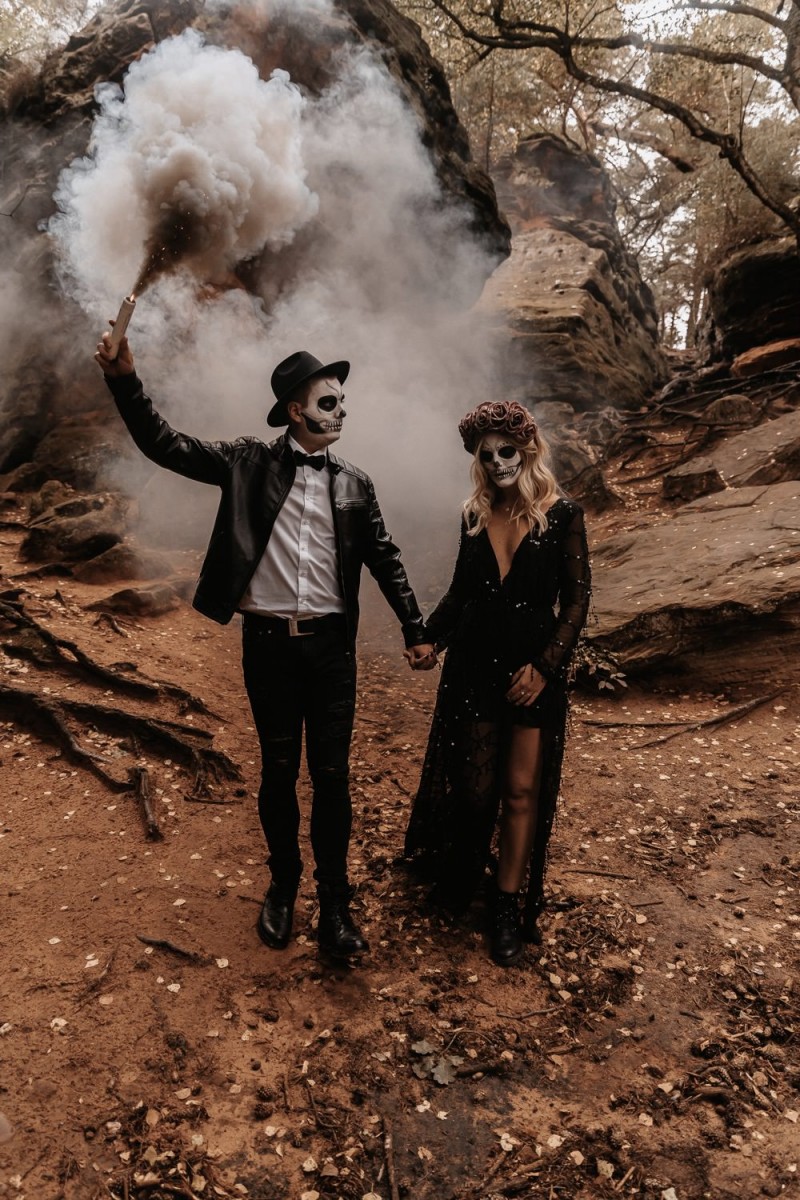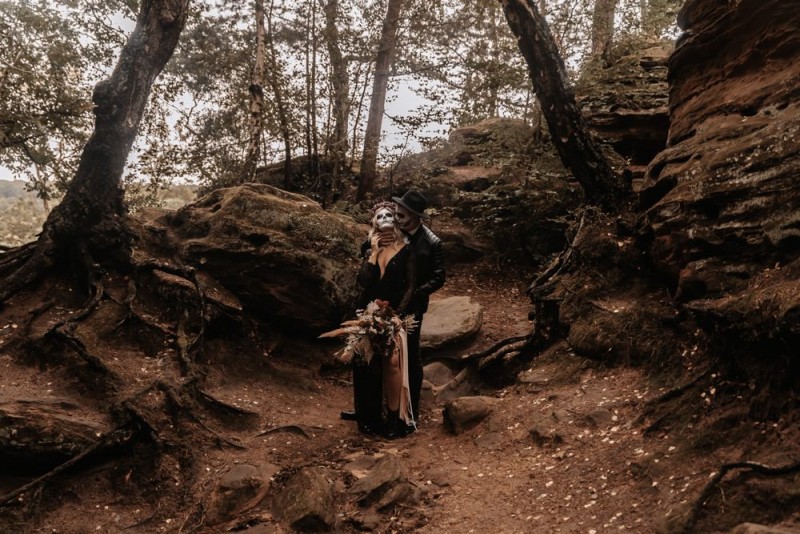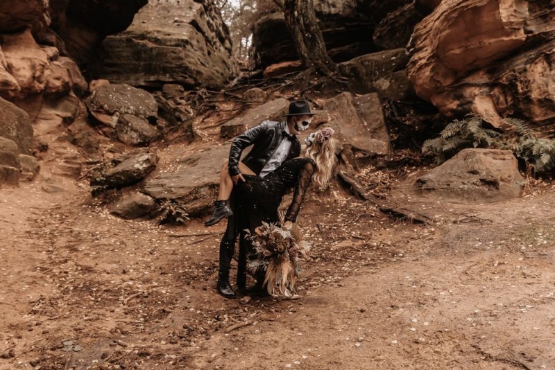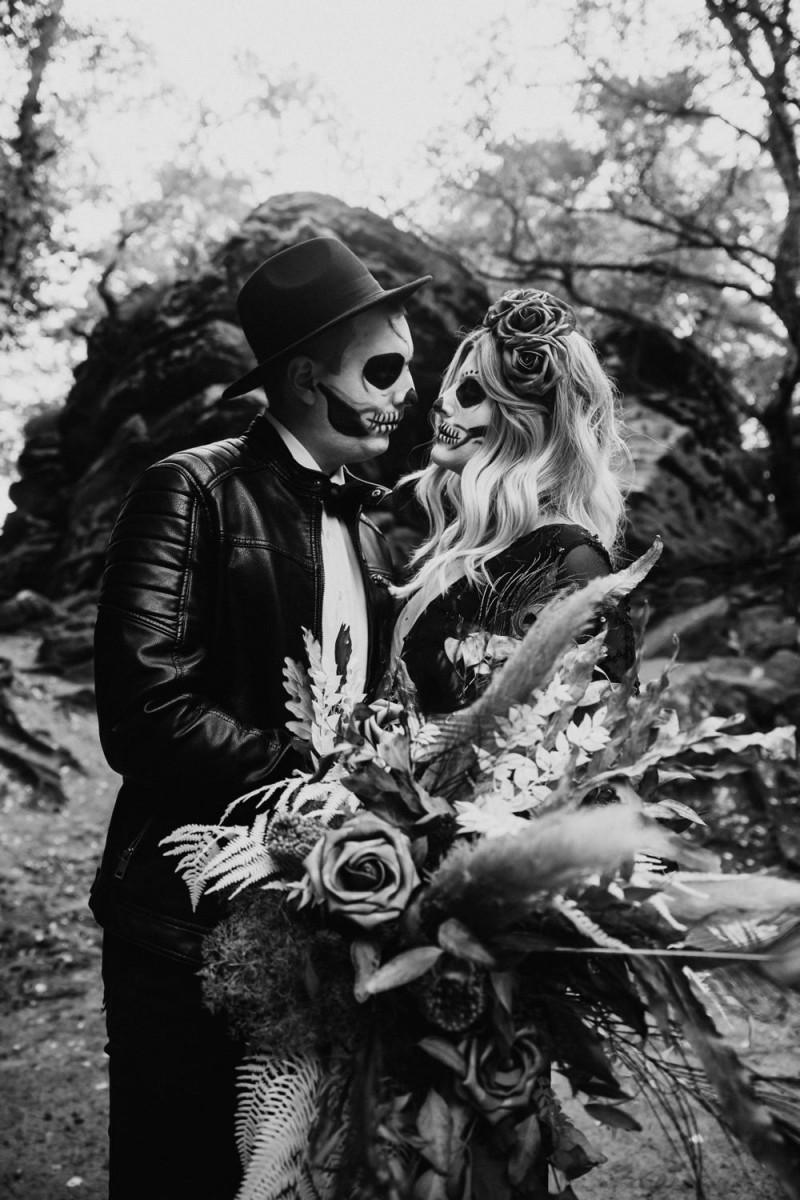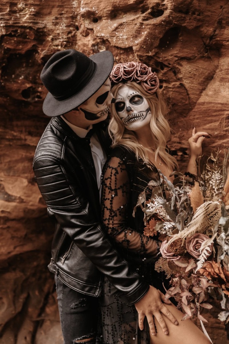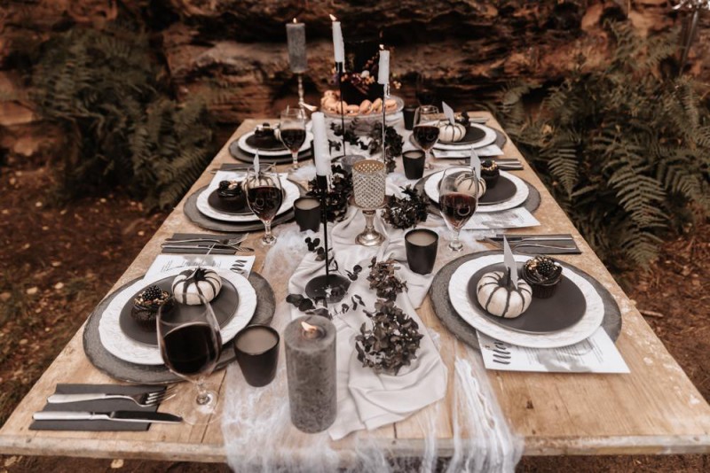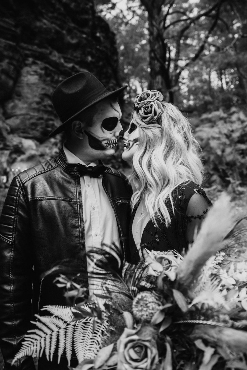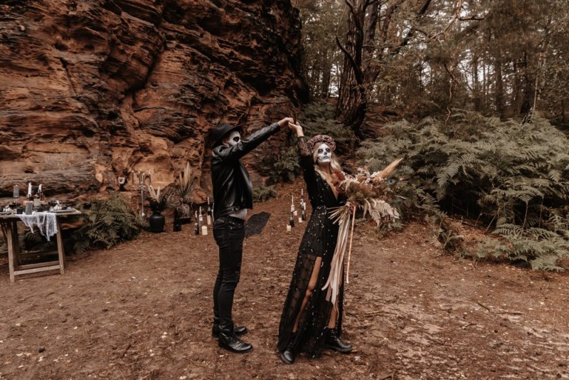 Hochzeitsfotografin Cathy Kohlenberg schnappte sich für diese Halloween Hochzeitsinspiration Natalie & Marcel, die als reisebegeistertes Paar bekannt sind, und führte sie in einen abgelegenen Wald. Dieser erinnert mit seinem lehmigen Felsgestein und den herbstlichen Brauntönen jedoch viel mehr an eine trockene Wüstenlandschaft. Und in dieser tollen Location begann das düstere Spektakel! Ganz im Brauch des mexikanischen Dia de los Muertos schminkte Hair & Makeup Artist Verena Kolks von Puderglück den beiden den angesagten Sugar Skull. Natalie bekam dazu einen opulenten Blumenhaarreif mit großblütigen Edelrosen im Farbton Lila-Flieder, der ihr gewelltes blondes Haar krönte. Mystisch und etwas düster zugleich – herrlich! Ein elegantes schwarzes Kleid mit transparentem Stoff, feinen Pailletten und hohem Schlitz über dem kurzen Unterkleid, ihre langen schwarzen Nägel sowie die derben schwarzen Boots machten ihren Halloween-Look einfach perfekt. Passend zu ihrer tollen Flowercrown zauberte Sandra Jonas von Flores ihr einen wilden, ausladenden Brautstrauß mit Rosen in Lila-Flieder, Pampasgras, gebleichtem Farn und Ruscus, Laub, Pfauenfedern und Banksia. Marcel trägt zu seinem Skelett-Makeup eine zerrissene Jeans in Schwarz, ebenfalls derbe schwarze Boots, ein weißes Hemd mit schwarzer Fliege und eine coole Lederjacke sowie einen schwarzen Hut. Ein geniales und ziemlich heißes Halloween-Brautpaar wie ich finde! Romantisch wurde es bei dieser Inspiration aber auch! Bei einem kleinen Elopement-Setting, bestehend aus großen Stumpenkerzen, hohen Kerzenständern und heruntergebrannten Stabkerzen in Weinflaschen, sowie großen schwarzen Bodenvasen, gefüllt mit Trockenblumen, feierten die beiden unter freiem Himmel ihre Liebe und lasen sich ihre Ehegelübde vor. „Bis dass der Tod uns scheidet“ – sowohl die Ehegelübde als auch die ganze Hochzeitspapeterie im Halloweenstil, kreiert von Miss Evangeline Hochzeitspapeterie, ist mit weißen, grau-braunen und orangenen Details ein absoluter Hingucker! Neben dem feinen Setting für das Elopement, kreierte Stefanie Dahmen eine große Hochzeitstafel, dessen Dekoration in der Farbkombination aus Grau, Schwarz-Braun und Weiß jeden Moodyfan zum Strahlen bringen dürfte. Herbstliche Züge durch getrocknete und schwarzgefärbte Hortensien und Eukalyptus, schwarz-weiß bemalte Kürbisse und allerlei Kerzen und Teelichter in Schwarz, Silber und dunklem Grau treffen auf eine schwarze Hochzeitstorte im Halloween-Look, die mit herbstlichen Trockenblumen geschmückt und von verzierten Macarons in einem zarten Orange umgeben ist. Diese sowie die schwarzen Cupcakes, die auf dem feinen schwarzen Geschirr samt schwarzen Platztellern neben den bemalten Kürbissen glänzten, zauberte The Baker’s Wife.