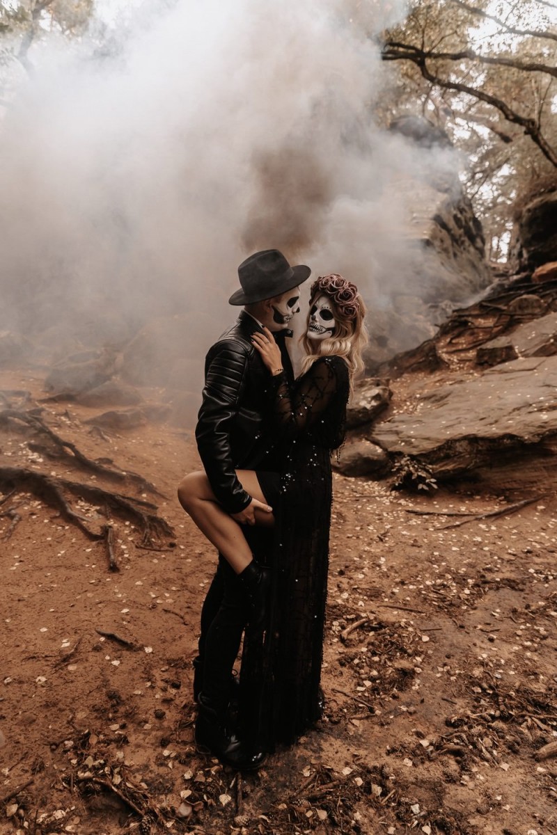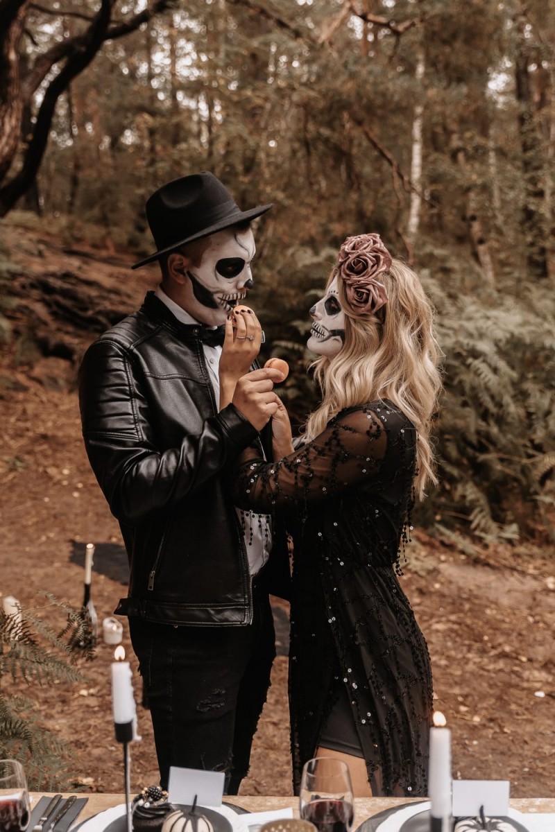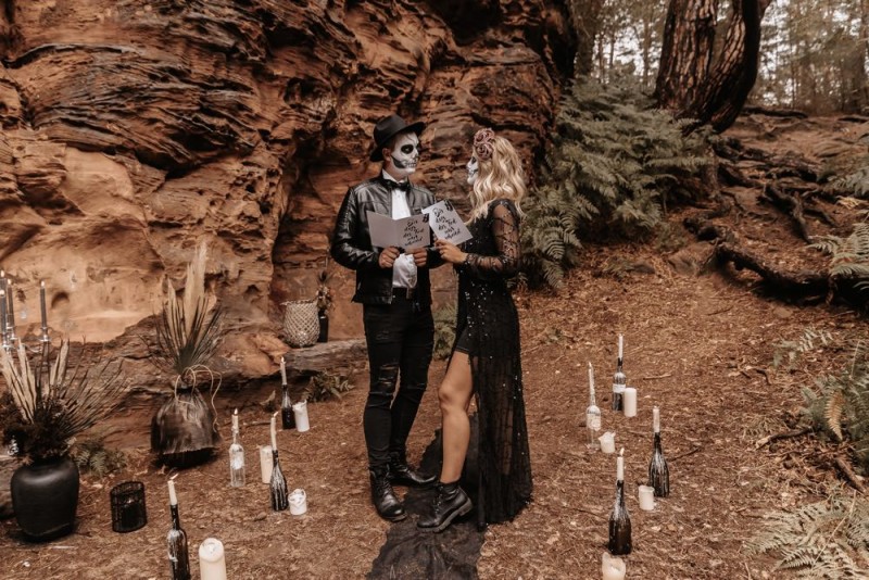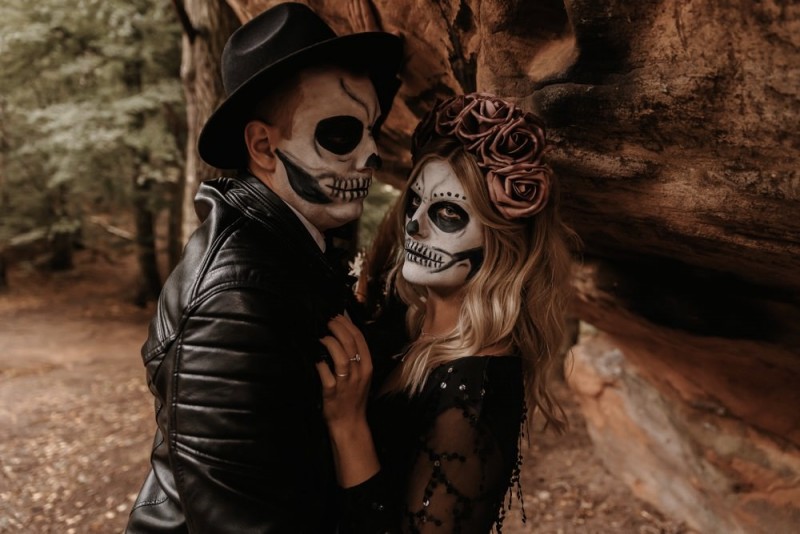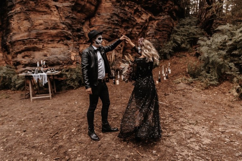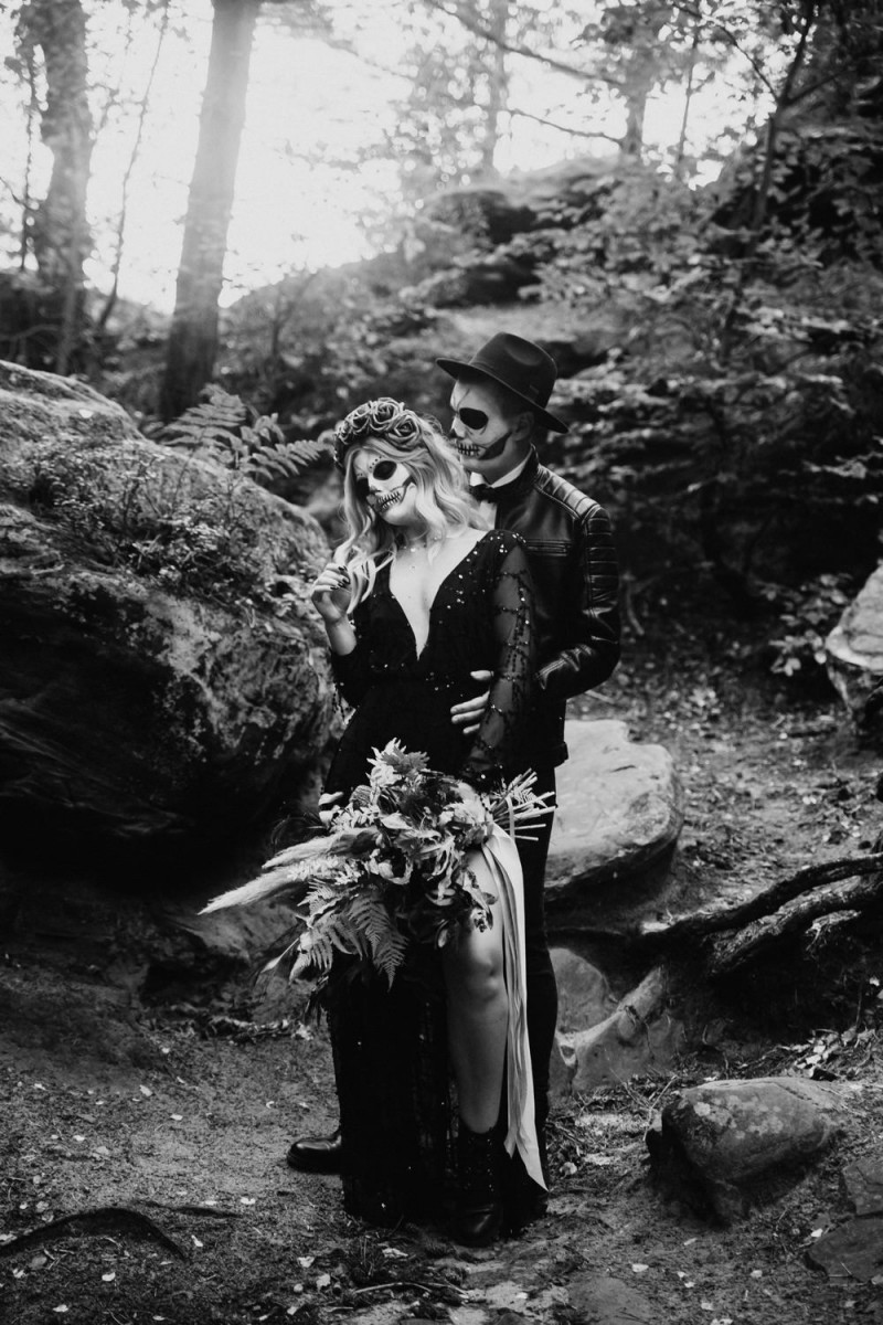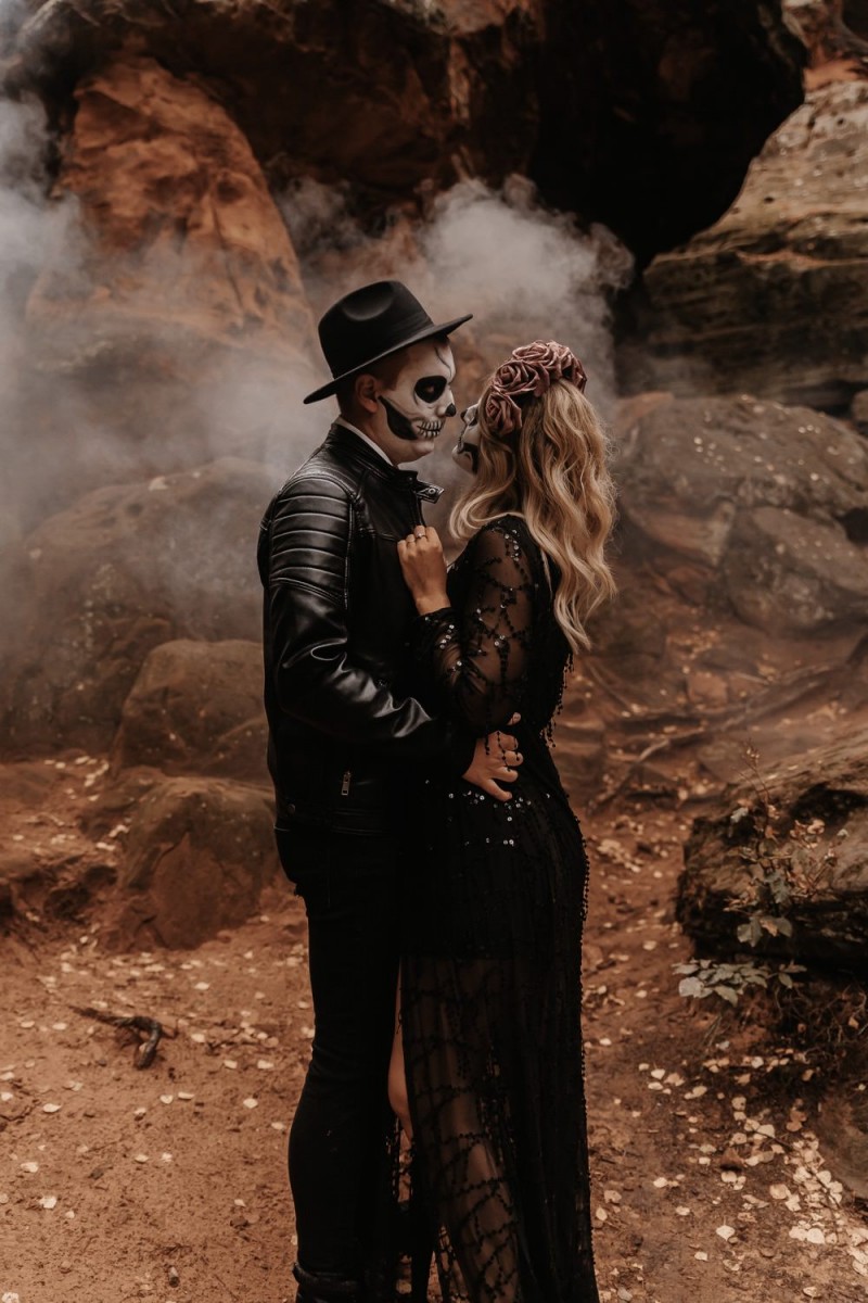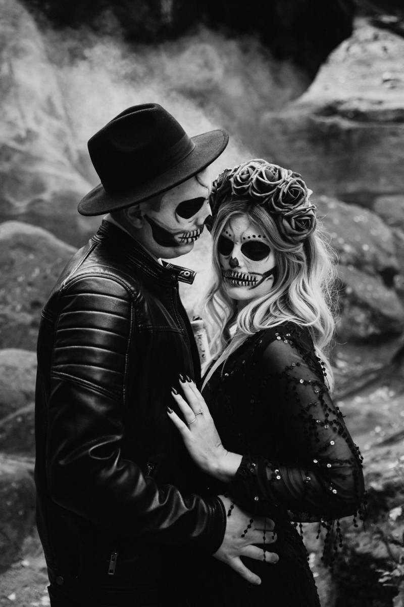 Hochzeitsfotografin Cathy Kohlenberg schnappte sich für diese Halloween Hochzeitsinspiration Natalie & Marcel, die als reisebegeistertes Paar bekannt sind, und führte sie in einen abgelegenen Wald. Dieser erinnert mit seinem lehmigen Felsgestein und den herbstlichen Brauntönen jedoch viel mehr an eine trockene Wüstenlandschaft. Und in dieser tollen Location begann das düstere Spektakel! Ganz im Brauch des mexikanischen Dia de los Muertos schminkte Hair & Makeup Artist Verena Kolks von Puderglück den beiden den angesagten Sugar Skull. Natalie bekam dazu einen opulenten Blumenhaarreif mit großblütigen Edelrosen im Farbton Lila-Flieder, der ihr gewelltes blondes Haar krönte. Mystisch und etwas düster zugleich – herrlich! Ein elegantes schwarzes Kleid mit transparentem Stoff, feinen Pailletten und hohem Schlitz über dem kurzen Unterkleid, ihre langen schwarzen Nägel sowie die derben schwarzen Boots machten ihren Halloween-Look einfach perfekt. Passend zu ihrer tollen Flowercrown zauberte Sandra Jonas von Flores ihr einen wilden, ausladenden Brautstrauß mit Rosen in Lila-Flieder, Pampasgras, gebleichtem Farn und Ruscus, Laub, Pfauenfedern und Banksia. Marcel trägt zu seinem Skelett-Makeup eine zerrissene Jeans in Schwarz, ebenfalls derbe schwarze Boots, ein weißes Hemd mit schwarzer Fliege und eine coole Lederjacke sowie einen schwarzen Hut. Ein geniales und ziemlich heißes Halloween-Brautpaar wie ich finde! Romantisch wurde es bei dieser Inspiration aber auch! Bei einem kleinen Elopement-Setting, bestehend aus großen Stumpenkerzen, hohen Kerzenständern und heruntergebrannten Stabkerzen in Weinflaschen, sowie großen schwarzen Bodenvasen, gefüllt mit Trockenblumen, feierten die beiden unter freiem Himmel ihre Liebe und lasen sich ihre Ehegelübde vor. „Bis dass der Tod uns scheidet“ – sowohl die Ehegelübde als auch die ganze Hochzeitspapeterie im Halloweenstil, kreiert von Miss Evangeline Hochzeitspapeterie, ist mit weißen, grau-braunen und orangenen Details ein absoluter Hingucker! Neben dem feinen Setting für das Elopement, kreierte Stefanie Dahmen eine große Hochzeitstafel, dessen Dekoration in der Farbkombination aus Grau, Schwarz-Braun und Weiß jeden Moodyfan zum Strahlen bringen dürfte. Herbstliche Züge durch getrocknete und schwarzgefärbte Hortensien und Eukalyptus, schwarz-weiß bemalte Kürbisse und allerlei Kerzen und Teelichter in Schwarz, Silber und dunklem Grau treffen auf eine schwarze Hochzeitstorte im Halloween-Look, die mit herbstlichen Trockenblumen geschmückt und von verzierten Macarons in einem zarten Orange umgeben ist. Diese sowie die schwarzen Cupcakes, die auf dem feinen schwarzen Geschirr samt schwarzen Platztellern neben den bemalten Kürbissen glänzten, zauberte The Baker’s Wife.