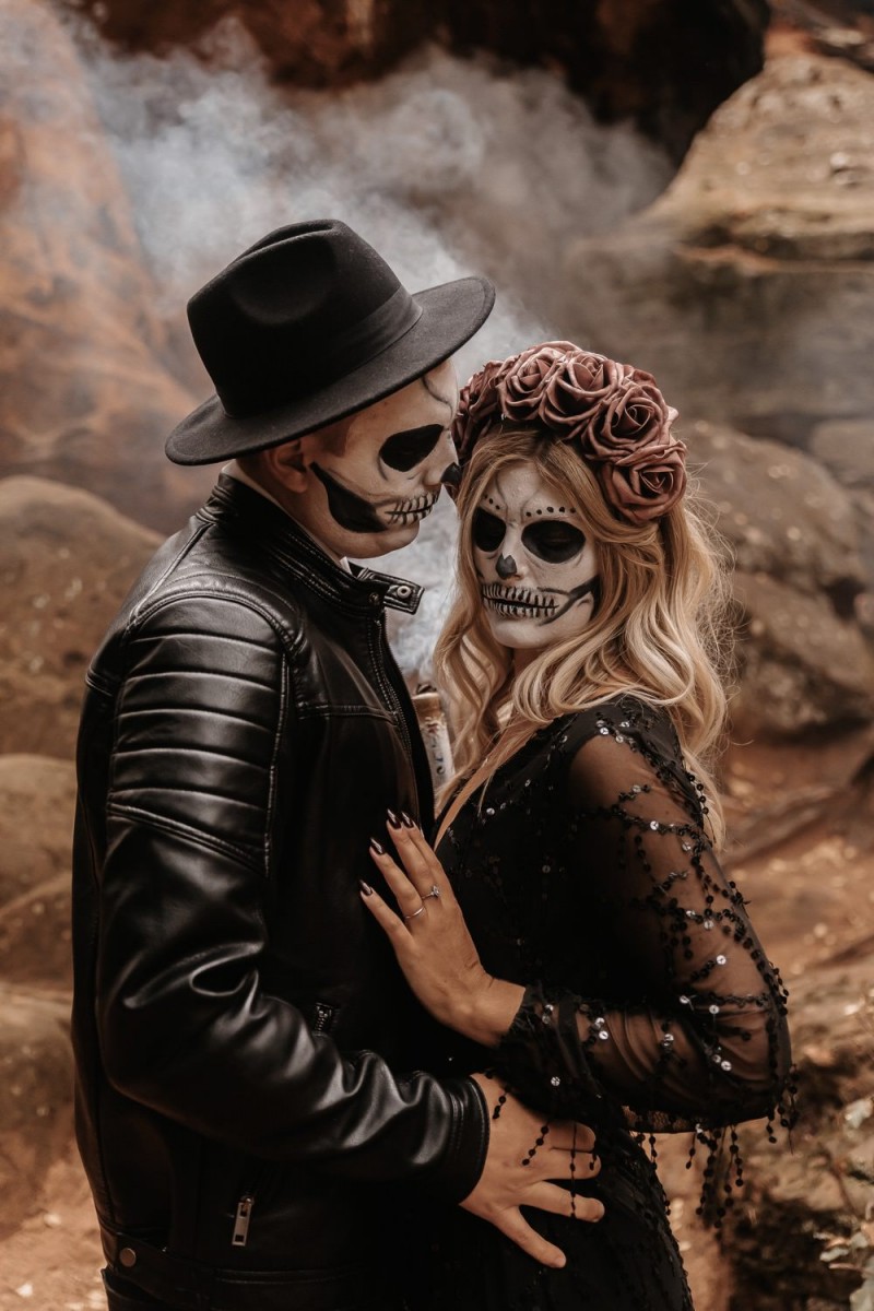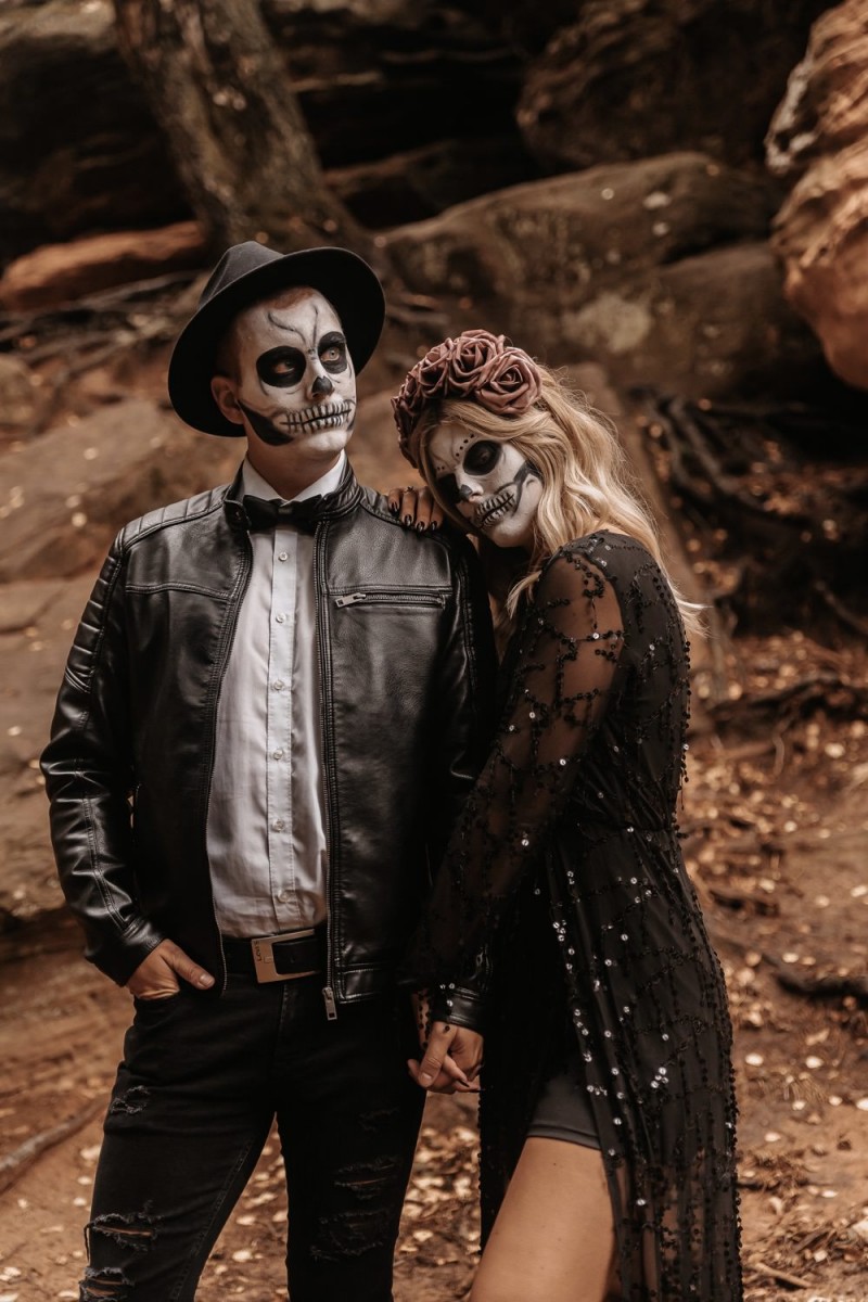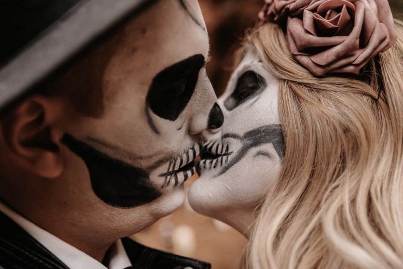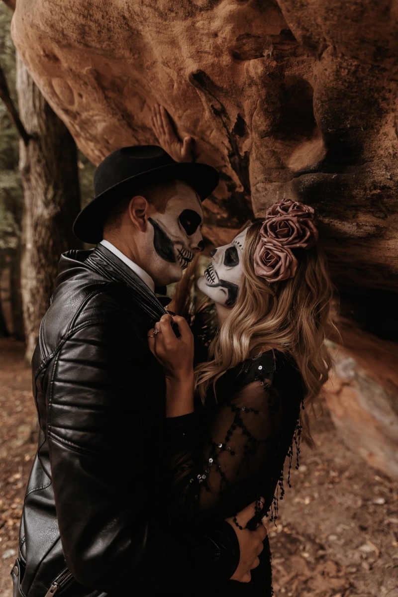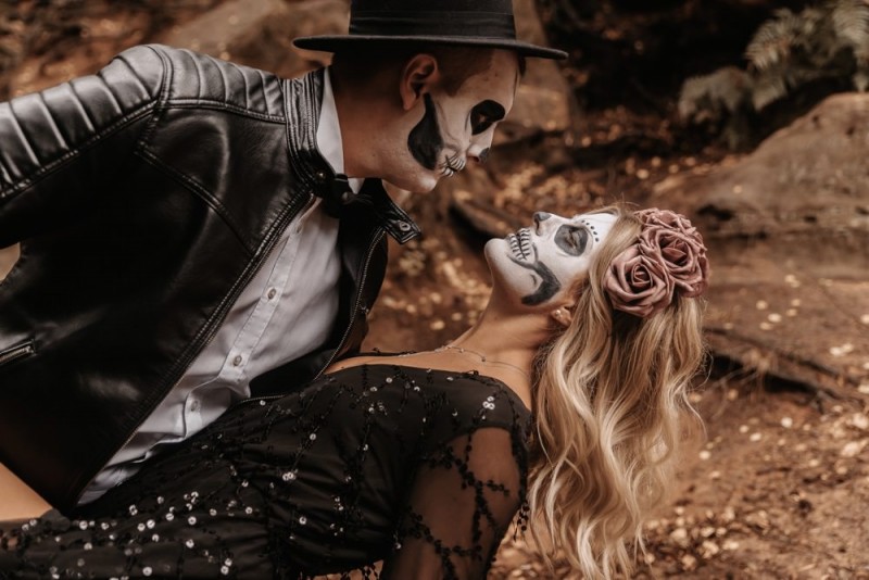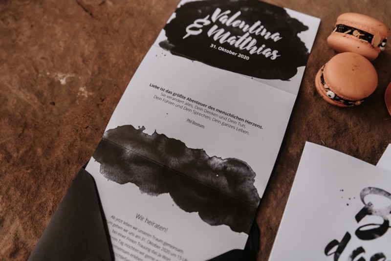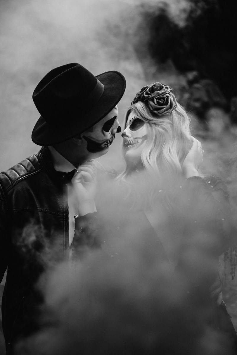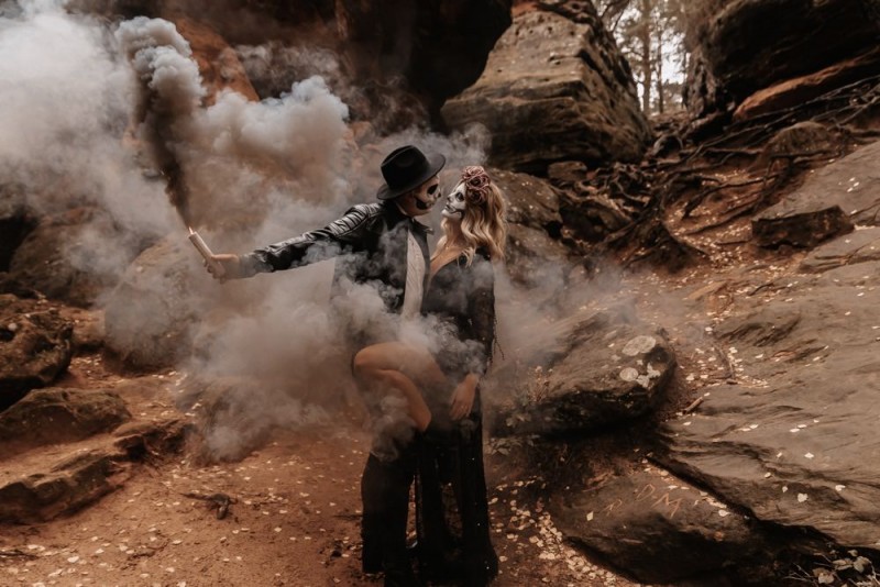 Hochzeitsfotografin Cathy Kohlenberg schnappte sich für diese Halloween Hochzeitsinspiration Natalie & Marcel, die als reisebegeistertes Paar bekannt sind, und führte sie in einen abgelegenen Wald. Dieser erinnert mit seinem lehmigen Felsgestein und den herbstlichen Brauntönen jedoch viel mehr an eine trockene Wüstenlandschaft. Und in dieser tollen Location begann das düstere Spektakel! Ganz im Brauch des mexikanischen Dia de los Muertos schminkte Hair & Makeup Artist Verena Kolks von Puderglück den beiden den angesagten Sugar Skull. Natalie bekam dazu einen opulenten Blumenhaarreif mit großblütigen Edelrosen im Farbton Lila-Flieder, der ihr gewelltes blondes Haar krönte. Mystisch und etwas düster zugleich – herrlich! Ein elegantes schwarzes Kleid mit transparentem Stoff, feinen Pailletten und hohem Schlitz über dem kurzen Unterkleid, ihre langen schwarzen Nägel sowie die derben schwarzen Boots machten ihren Halloween-Look einfach perfekt. Passend zu ihrer tollen Flowercrown zauberte Sandra Jonas von Flores ihr einen wilden, ausladenden Brautstrauß mit Rosen in Lila-Flieder, Pampasgras, gebleichtem Farn und Ruscus, Laub, Pfauenfedern und Banksia. Marcel trägt zu seinem Skelett-Makeup eine zerrissene Jeans in Schwarz, ebenfalls derbe schwarze Boots, ein weißes Hemd mit schwarzer Fliege und eine coole Lederjacke sowie einen schwarzen Hut. Ein geniales und ziemlich heißes Halloween-Brautpaar wie ich finde! Romantisch wurde es bei dieser Inspiration aber auch! Bei einem kleinen Elopement-Setting, bestehend aus großen Stumpenkerzen, hohen Kerzenständern und heruntergebrannten Stabkerzen in Weinflaschen, sowie großen schwarzen Bodenvasen, gefüllt mit Trockenblumen, feierten die beiden unter freiem Himmel ihre Liebe und lasen sich ihre Ehegelübde vor. „Bis dass der Tod uns scheidet“ – sowohl die Ehegelübde als auch die ganze Hochzeitspapeterie im Halloweenstil, kreiert von Miss Evangeline Hochzeitspapeterie, ist mit weißen, grau-braunen und orangenen Details ein absoluter Hingucker! Neben dem feinen Setting für das Elopement, kreierte Stefanie Dahmen eine große Hochzeitstafel, dessen Dekoration in der Farbkombination aus Grau, Schwarz-Braun und Weiß jeden Moodyfan zum Strahlen bringen dürfte. Herbstliche Züge durch getrocknete und schwarzgefärbte Hortensien und Eukalyptus, schwarz-weiß bemalte Kürbisse und allerlei Kerzen und Teelichter in Schwarz, Silber und dunklem Grau treffen auf eine schwarze Hochzeitstorte im Halloween-Look, die mit herbstlichen Trockenblumen geschmückt und von verzierten Macarons in einem zarten Orange umgeben ist. Diese sowie die schwarzen Cupcakes, die auf dem feinen schwarzen Geschirr samt schwarzen Platztellern neben den bemalten Kürbissen glänzten, zauberte The Baker’s Wife.