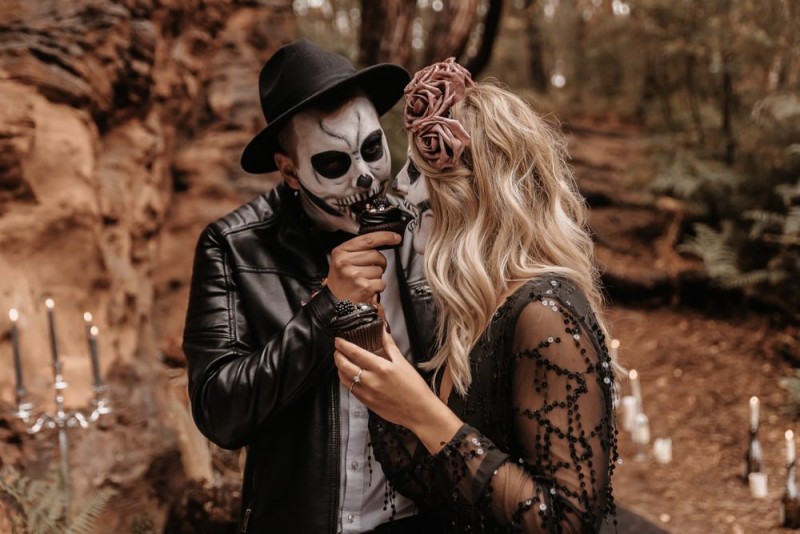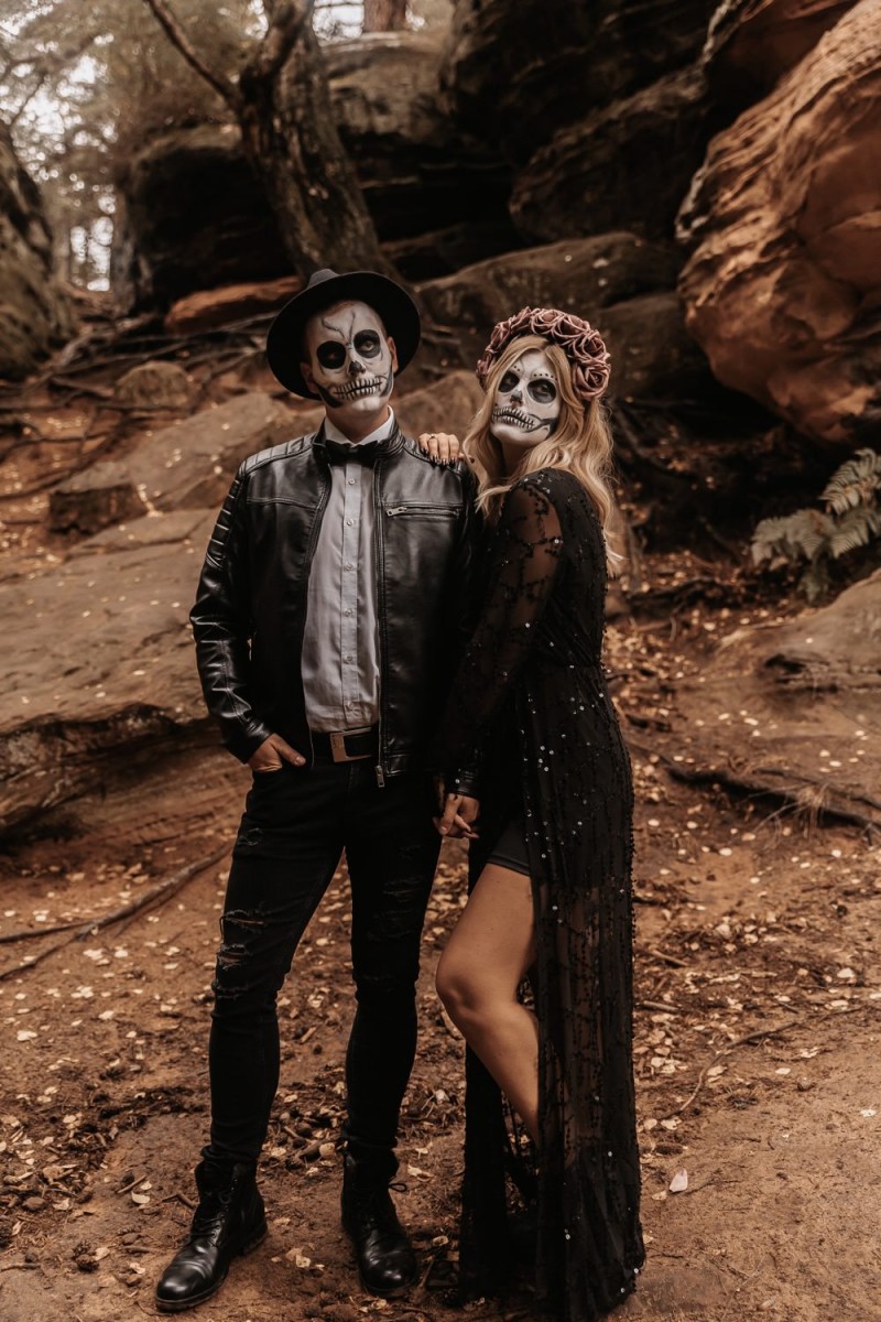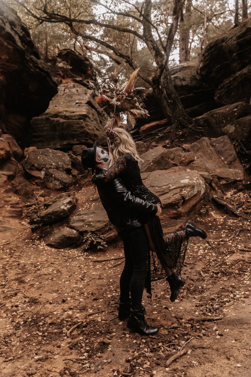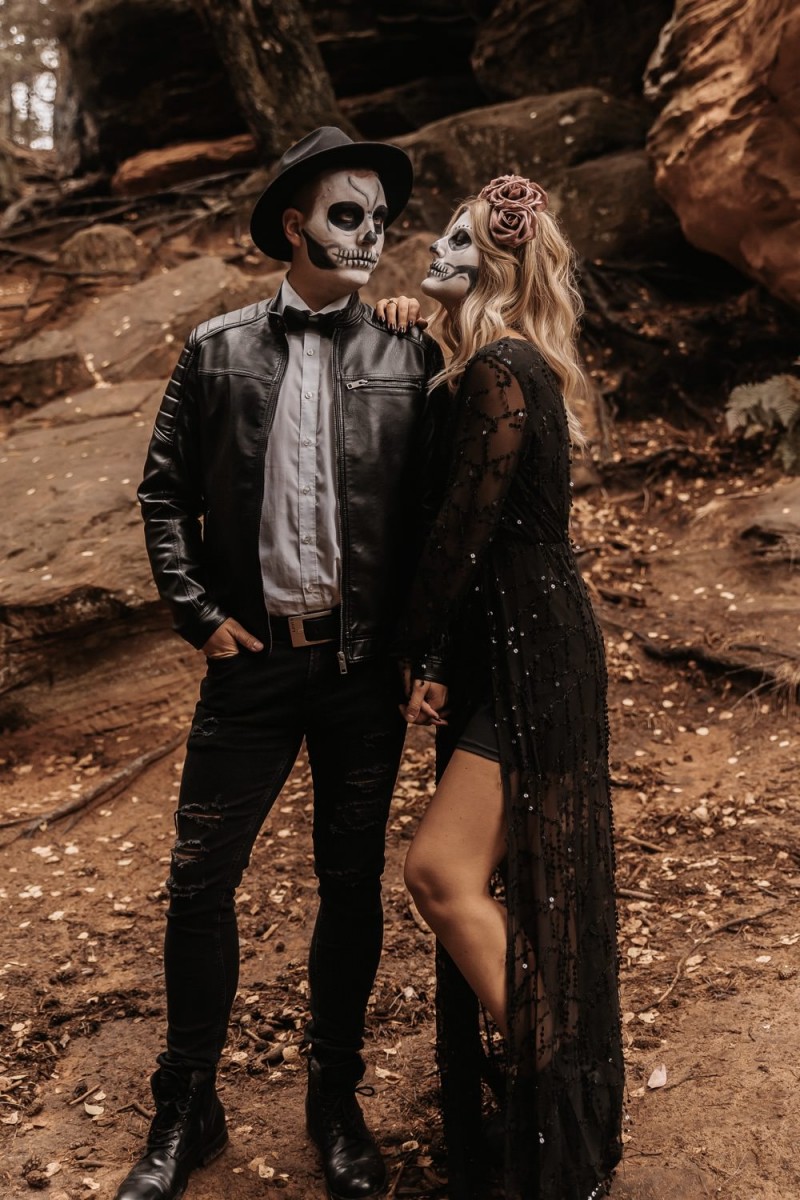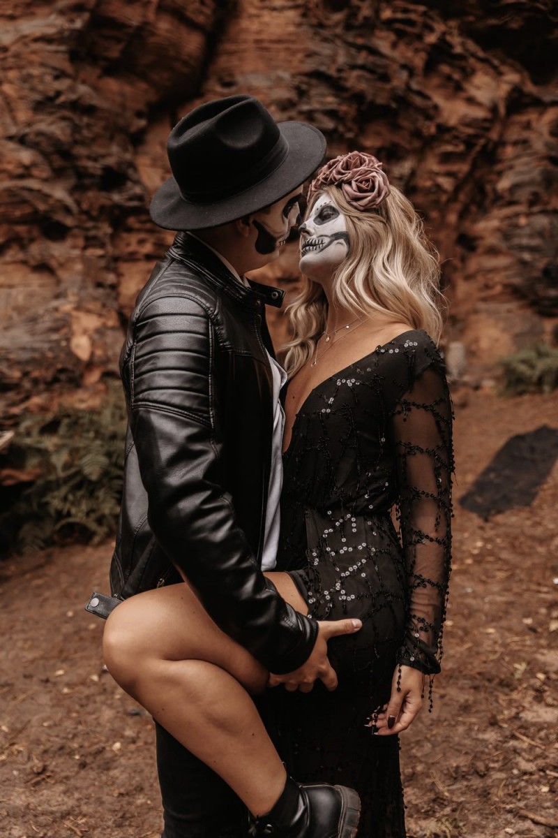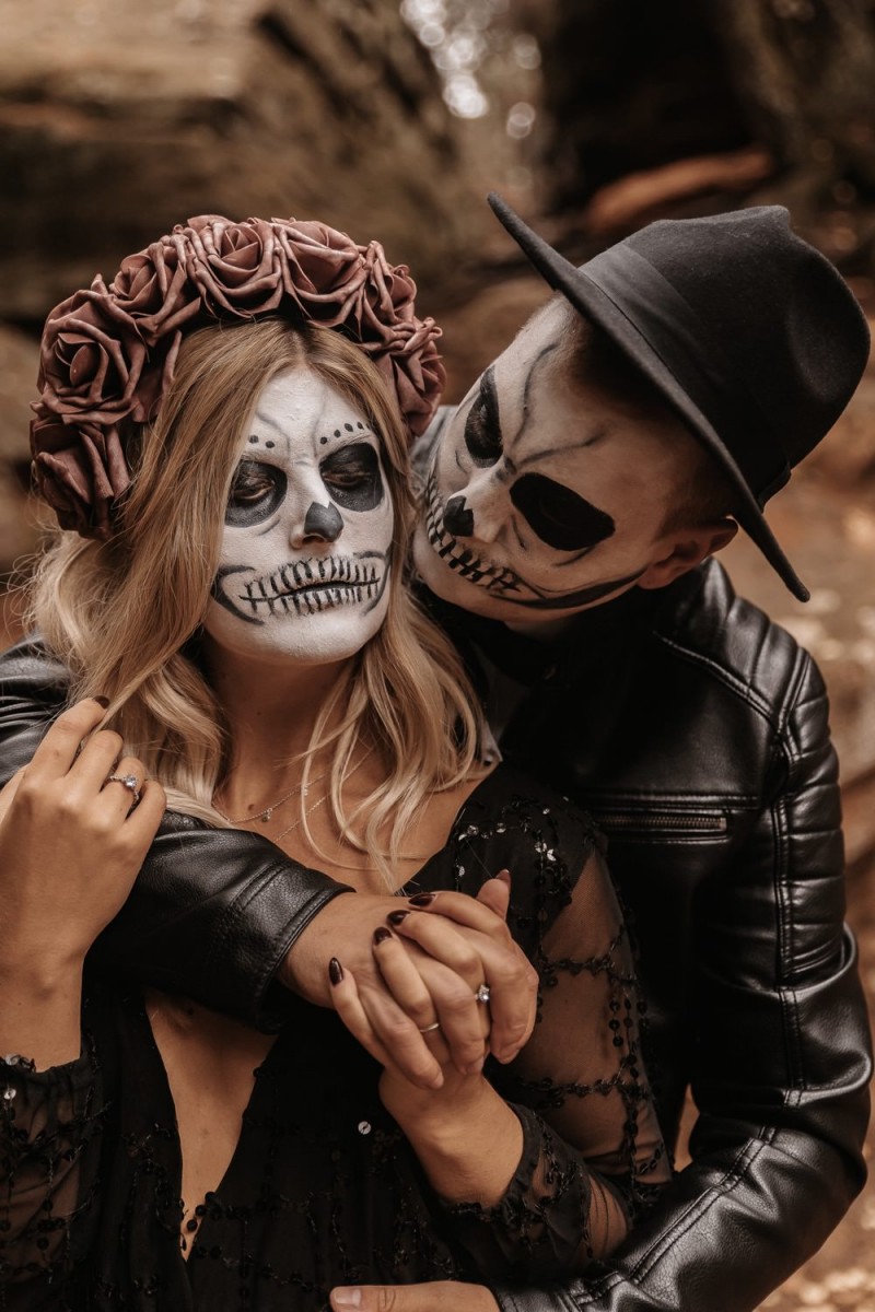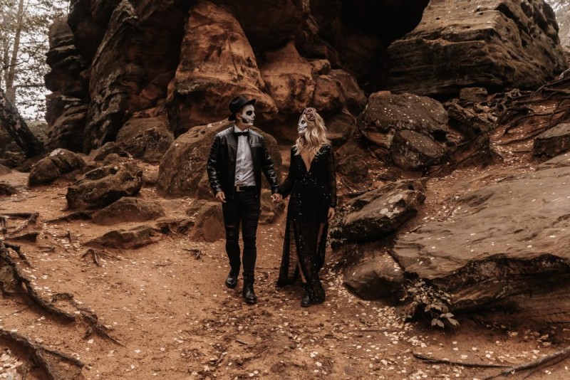 Hochzeitsfotografin Cathy Kohlenberg schnappte sich für diese Halloween Hochzeitsinspiration Natalie & Marcel, die als reisebegeistertes Paar bekannt sind, und führte sie in einen abgelegenen Wald. Dieser erinnert mit seinem lehmigen Felsgestein und den herbstlichen Brauntönen jedoch viel mehr an eine trockene Wüstenlandschaft. Und in dieser tollen Location begann das düstere Spektakel! Ganz im Brauch des mexikanischen Dia de los Muertos schminkte Hair & Makeup Artist Verena Kolks von Puderglück den beiden den angesagten Sugar Skull. Natalie bekam dazu einen opulenten Blumenhaarreif mit großblütigen Edelrosen im Farbton Lila-Flieder, der ihr gewelltes blondes Haar krönte. Mystisch und etwas düster zugleich – herrlich! Ein elegantes schwarzes Kleid mit transparentem Stoff, feinen Pailletten und hohem Schlitz über dem kurzen Unterkleid, ihre langen schwarzen Nägel sowie die derben schwarzen Boots machten ihren Halloween-Look einfach perfekt. Passend zu ihrer tollen Flowercrown zauberte Sandra Jonas von Flores ihr einen wilden, ausladenden Brautstrauß mit Rosen in Lila-Flieder, Pampasgras, gebleichtem Farn und Ruscus, Laub, Pfauenfedern und Banksia. Marcel trägt zu seinem Skelett-Makeup eine zerrissene Jeans in Schwarz, ebenfalls derbe schwarze Boots, ein weißes Hemd mit schwarzer Fliege und eine coole Lederjacke sowie einen schwarzen Hut. Ein geniales und ziemlich heißes Halloween-Brautpaar wie ich finde! Romantisch wurde es bei dieser Inspiration aber auch! Bei einem kleinen Elopement-Setting, bestehend aus großen Stumpenkerzen, hohen Kerzenständern und heruntergebrannten Stabkerzen in Weinflaschen, sowie großen schwarzen Bodenvasen, gefüllt mit Trockenblumen, feierten die beiden unter freiem Himmel ihre Liebe und lasen sich ihre Ehegelübde vor. „Bis dass der Tod uns scheidet“ – sowohl die Ehegelübde als auch die ganze Hochzeitspapeterie im Halloweenstil, kreiert von Miss Evangeline Hochzeitspapeterie, ist mit weißen, grau-braunen und orangenen Details ein absoluter Hingucker! Neben dem feinen Setting für das Elopement, kreierte Stefanie Dahmen eine große Hochzeitstafel, dessen Dekoration in der Farbkombination aus Grau, Schwarz-Braun und Weiß jeden Moodyfan zum Strahlen bringen dürfte. Herbstliche Züge durch getrocknete und schwarzgefärbte Hortensien und Eukalyptus, schwarz-weiß bemalte Kürbisse und allerlei Kerzen und Teelichter in Schwarz, Silber und dunklem Grau treffen auf eine schwarze Hochzeitstorte im Halloween-Look, die mit herbstlichen Trockenblumen geschmückt und von verzierten Macarons in einem zarten Orange umgeben ist. Diese sowie die schwarzen Cupcakes, die auf dem feinen schwarzen Geschirr samt schwarzen Platztellern neben den bemalten Kürbissen glänzten, zauberte The Baker’s Wife.