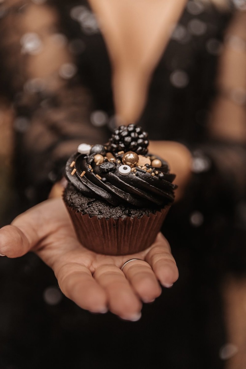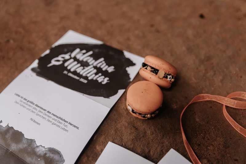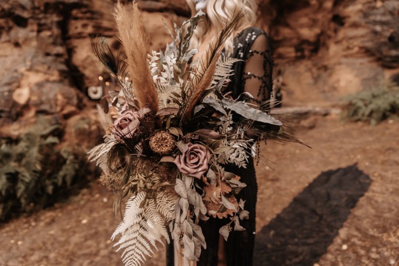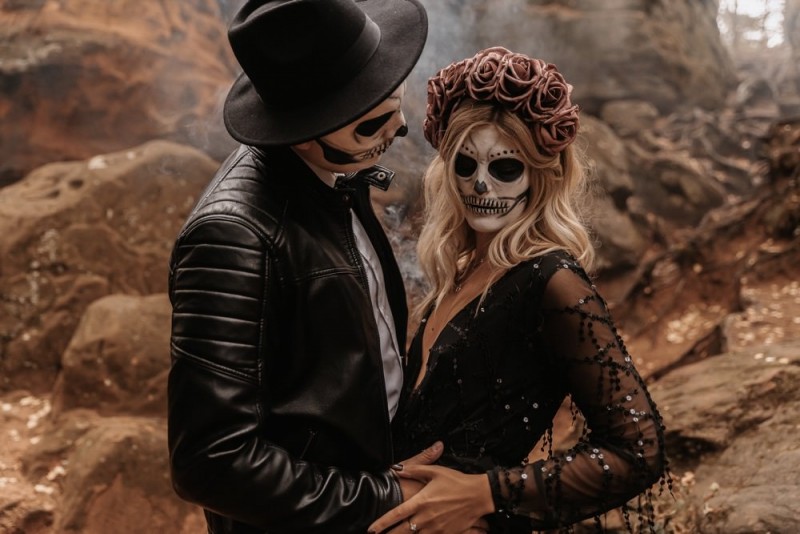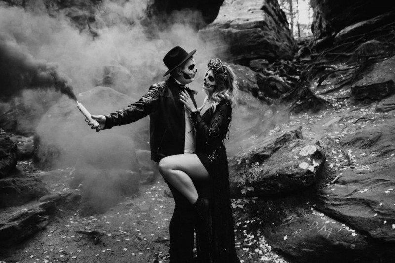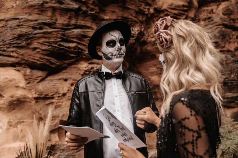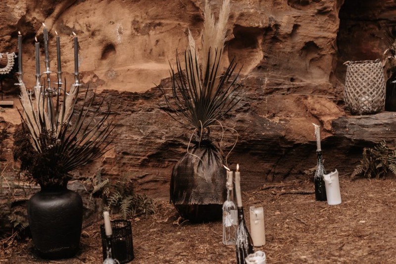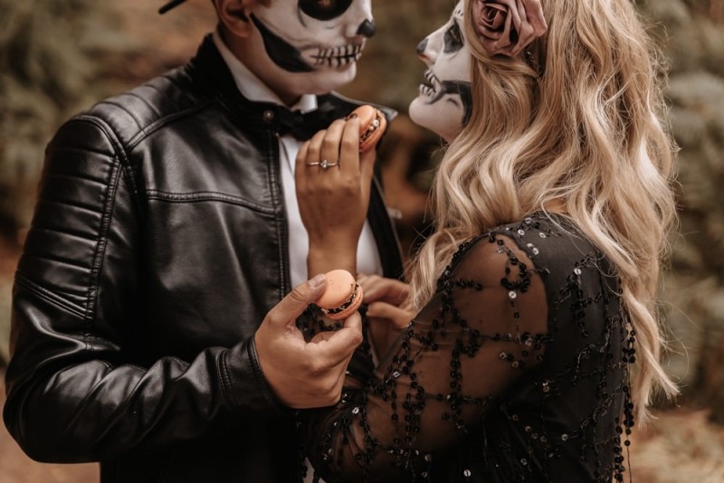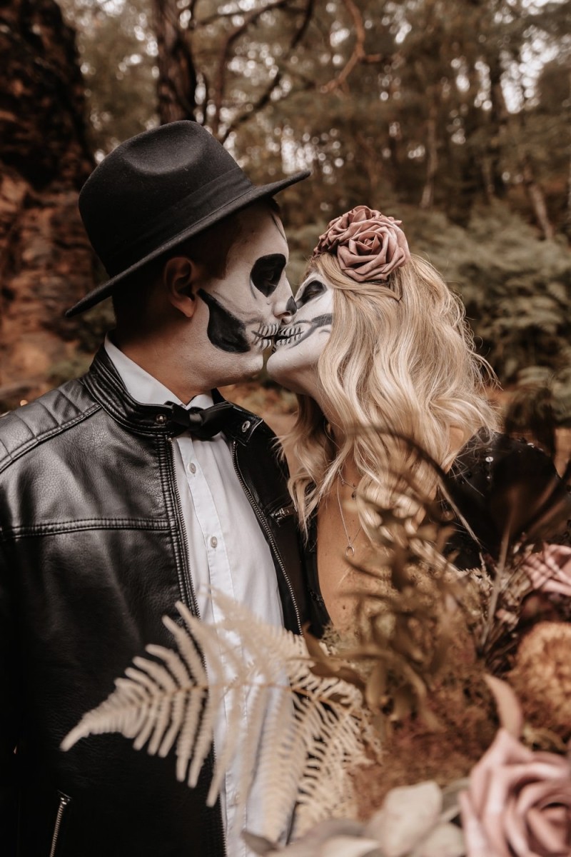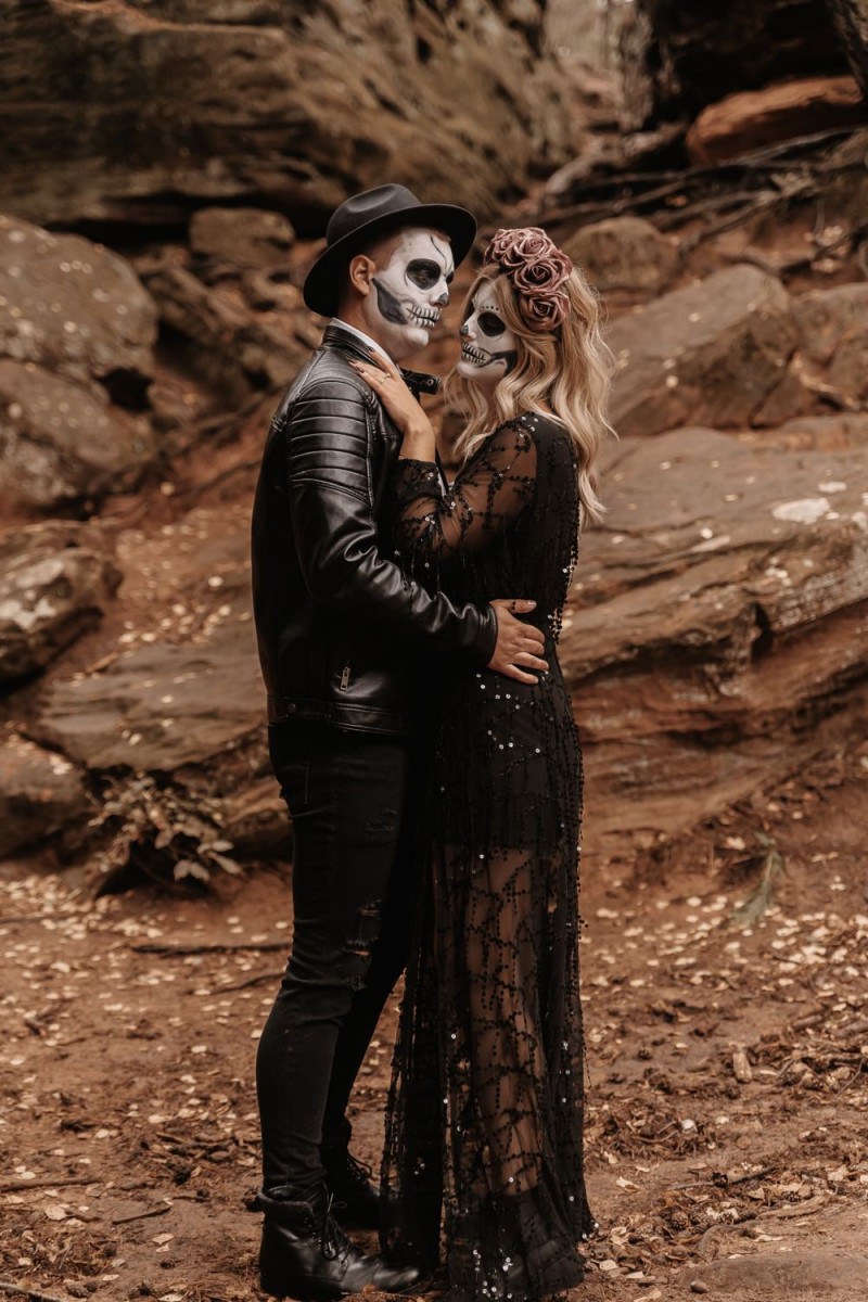 Hochzeitsfotografin Cathy Kohlenberg schnappte sich für diese Halloween Hochzeitsinspiration Natalie & Marcel, die als reisebegeistertes Paar bekannt sind, und führte sie in einen abgelegenen Wald. Dieser erinnert mit seinem lehmigen Felsgestein und den herbstlichen Brauntönen jedoch viel mehr an eine trockene Wüstenlandschaft. Und in dieser tollen Location begann das düstere Spektakel! Ganz im Brauch des mexikanischen Dia de los Muertos schminkte Hair & Makeup Artist Verena Kolks von Puderglück den beiden den angesagten Sugar Skull. Natalie bekam dazu einen opulenten Blumenhaarreif mit großblütigen Edelrosen im Farbton Lila-Flieder, der ihr gewelltes blondes Haar krönte. Mystisch und etwas düster zugleich – herrlich! Ein elegantes schwarzes Kleid mit transparentem Stoff, feinen Pailletten und hohem Schlitz über dem kurzen Unterkleid, ihre langen schwarzen Nägel sowie die derben schwarzen Boots machten ihren Halloween-Look einfach perfekt. Passend zu ihrer tollen Flowercrown zauberte Sandra Jonas von Flores ihr einen wilden, ausladenden Brautstrauß mit Rosen in Lila-Flieder, Pampasgras, gebleichtem Farn und Ruscus, Laub, Pfauenfedern und Banksia. Marcel trägt zu seinem Skelett-Makeup eine zerrissene Jeans in Schwarz, ebenfalls derbe schwarze Boots, ein weißes Hemd mit schwarzer Fliege und eine coole Lederjacke sowie einen schwarzen Hut. Ein geniales und ziemlich heißes Halloween-Brautpaar wie ich finde! Romantisch wurde es bei dieser Inspiration aber auch! Bei einem kleinen Elopement-Setting, bestehend aus großen Stumpenkerzen, hohen Kerzenständern und heruntergebrannten Stabkerzen in Weinflaschen, sowie großen schwarzen Bodenvasen, gefüllt mit Trockenblumen, feierten die beiden unter freiem Himmel ihre Liebe und lasen sich ihre Ehegelübde vor. „Bis dass der Tod uns scheidet“ – sowohl die Ehegelübde als auch die ganze Hochzeitspapeterie im Halloweenstil, kreiert von Miss Evangeline Hochzeitspapeterie, ist mit weißen, grau-braunen und orangenen Details ein absoluter Hingucker! Neben dem feinen Setting für das Elopement, kreierte Stefanie Dahmen eine große Hochzeitstafel, dessen Dekoration in der Farbkombination aus Grau, Schwarz-Braun und Weiß jeden Moodyfan zum Strahlen bringen dürfte. Herbstliche Züge durch getrocknete und schwarzgefärbte Hortensien und Eukalyptus, schwarz-weiß bemalte Kürbisse und allerlei Kerzen und Teelichter in Schwarz, Silber und dunklem Grau treffen auf eine schwarze Hochzeitstorte im Halloween-Look, die mit herbstlichen Trockenblumen geschmückt und von verzierten Macarons in einem zarten Orange umgeben ist. Diese sowie die schwarzen Cupcakes, die auf dem feinen schwarzen Geschirr samt schwarzen Platztellern neben den bemalten Kürbissen glänzten, zauberte The Baker’s Wife.