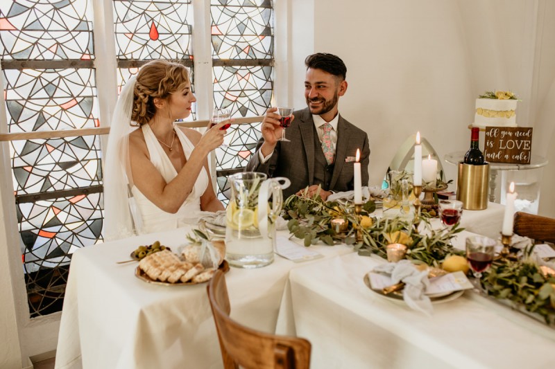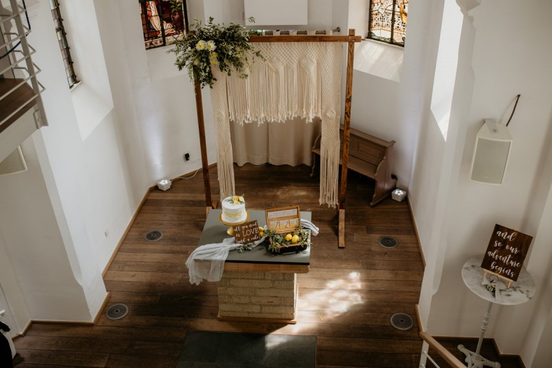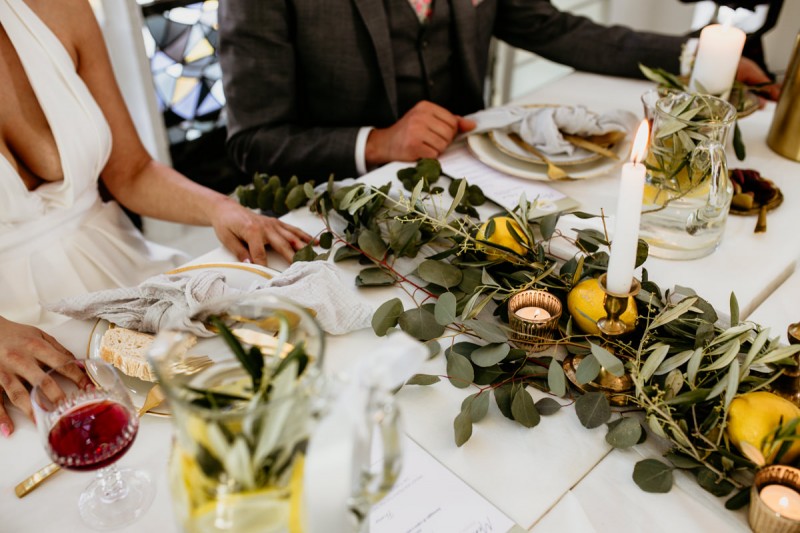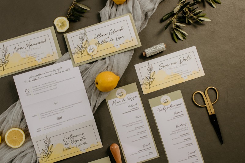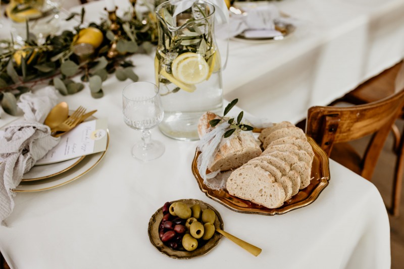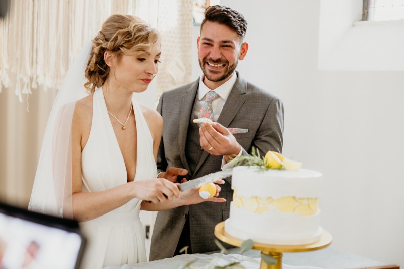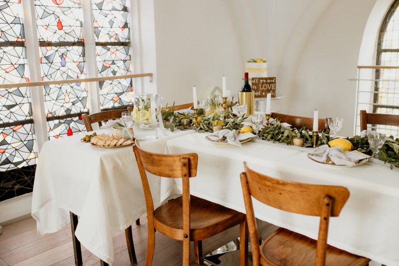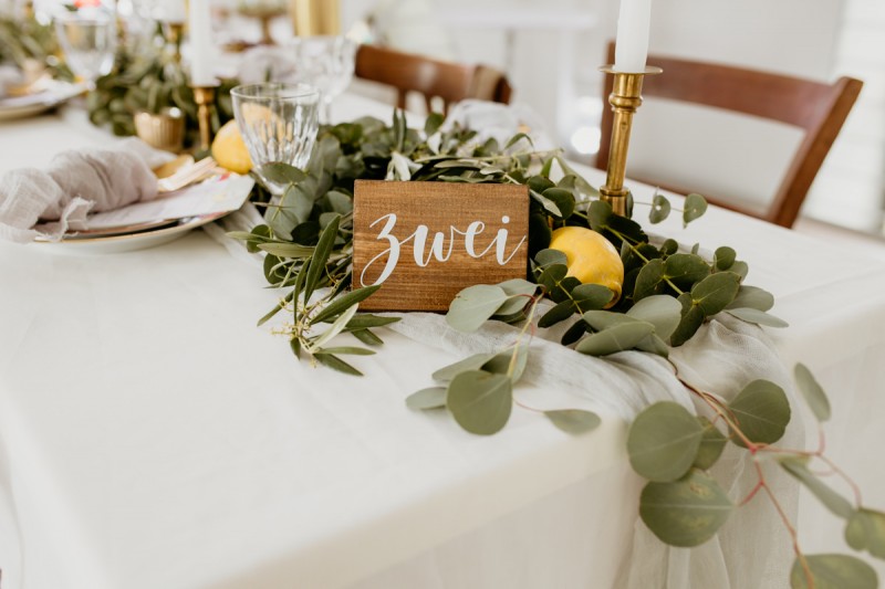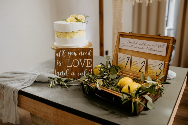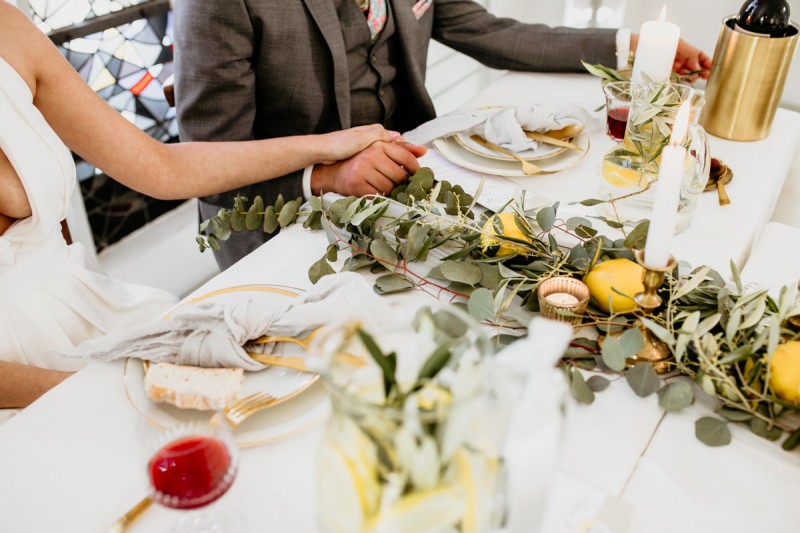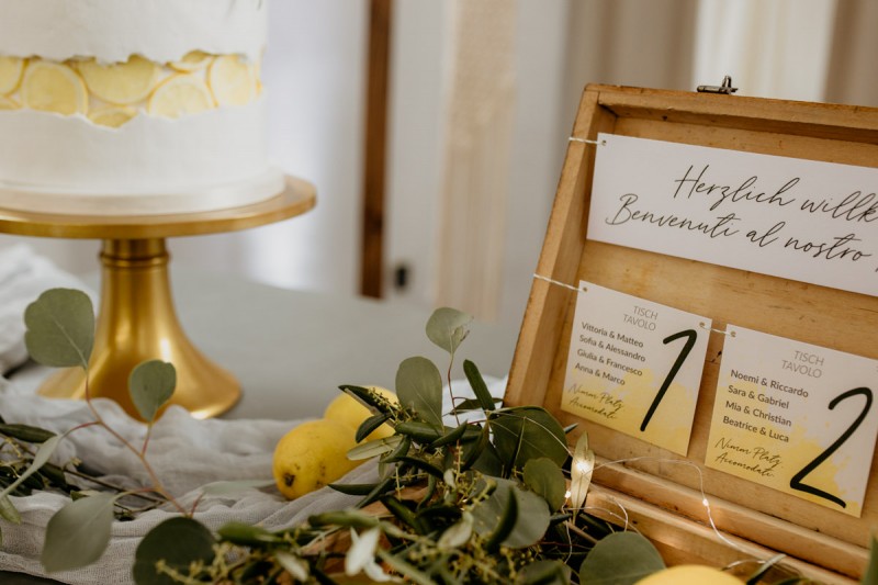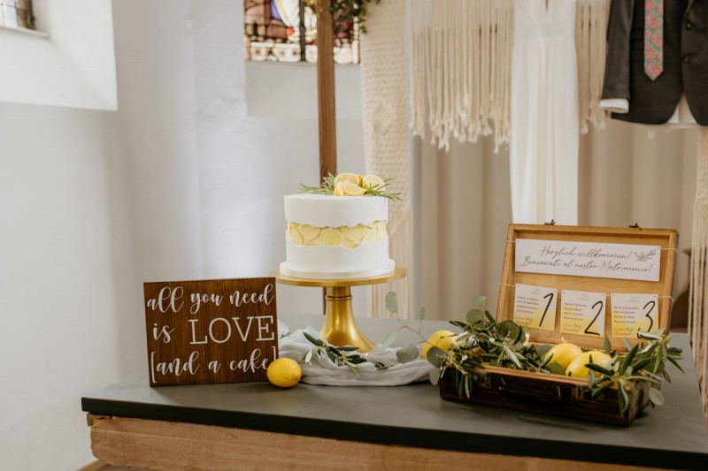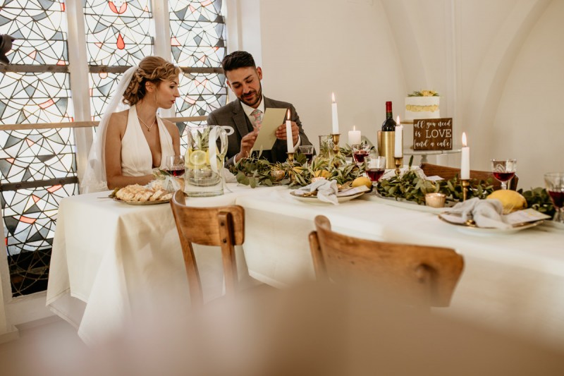 Die italienische Amalfiküste. Das rauschende Meer, silber-grüne Olivenbäume, sandig-steiniger Boden und duftende Zitronen. Ein Paradies in dem man bezaubernd heiraten kann. Passend zum Thema Corona muss man aber gar nicht nach Italien reisen um eine Hochzeit voller Italian Vibes zu feiern! Es reicht ein stimmiges Konzept, das alle Sinne anspricht, um sich die atemberaubende Destination Wedding nach Hause zu holen! Wie das aussehen kann, das könnt ihr in dieser feinen Inspiration einer italienischen Hochzeit für Zuhause entdecken! Hochzeitsfotografin Jana von JTS Fotografie hielt diese schöne Hochzeitsinspiration a la ‚A Destination Wedding needs no Destination‘, gemeinsam mit Herzrasenfilm, fotografisch für uns fest. Kreiert wurde sie im Herzen NRW‘s, in der Eventkapelle Köln. Hier wurde in den Farben Zitronengelb, luftigem Weiß und rustikalem Grün eine wahre Hommage an die Amalfiküste kreiert. Zitronen und Olivenzweige umspielen auf der langen Tafel das feine Geschirr mit goldenem Rand und das goldene Besteck von Tischleihendeckdich. Rustikale Züge erfährt das Setting durch die schönen Holzstühle von NIMMPLATZ und die beschrifteten Holzschilder von With Love by Tina. Eines dieser schönen Hochzeitschilder kündigt auch die Hochzeitstorte von Zuckersüß und Rosarot an. Ein Fault Line Cake mit Zitronendekoration und köstlicher Vanille-Zitronenfüllung. Ein wirklich besonderer Look, der durch die Kombination mit Rosmarinzweigen kaum lauter La Dolce Vita rufe könnte. Eine wunderschöne Vorschau auf all diese feinen Details liefert schon die liebevoll gestaltete Hochzeitspapeterie von Lieblingsschnipsel, die den Gästen offensichtlich nicht zu viel versprach. Natürlich gab es auch bei dieser Inspiration ein bezauberndes Brautpaar, das diese schönen Details genießen durfte. Und noch mehr! Mit einem feinen Traubogen, ebenfalls von NIMMPLATZ, der mit Blumen und einem Makramee dekoriert wurde, wurde in der schönen Kapelle eine Freie Trauung von Ein Nenner: Liebe gehalten. Das Brautpaar Anna & Hassan kam zu dieser in einem coolen Oldtimer angefahren. Anna trug einen modernen Jumpsuit und einen romantischen Schleier, denen das Secondhand Brautmodengeschäft Froschkönigin eine zweite Chance gab. Ein wirklich grandioser Twist aus Moderne und Tradition! Das Brautmakeup kreierte Nadine Lazreg passend zu einer italienischen Hochzeit im dramatischen Look. Das hochgesteckte Haar war sowohl elegant, als auch perfekt gewählt für den doppelreihigen Schleier. Ihr Brautstrauß von Stielecht Floristik, die im Übrigen die gesamte Floristik dieser Inspiration kreierten, ist dagegen etwas zurückhaltender und romantischer. Er hält neben zartem Grün auch weiße Pfingstrosen bereit. Ihr gutaussehender Bräutigam trug einen grauen Anzug mit floralen Akzenten in der Krawatte und seinem Einstecktuch von Herrenbude. So feierten sie diese besondere Hochzeit und ihre freie Trauung im italienischen Stil. Bevor ich euch jetzt zum Genießen der Bilder entlasse gibt es noch eine Besonderheit, die mich total fasziniert. Die Goldwerkstatt entwarf für diese Inspiration, neben der zarten Halskette der Braut, die hübschen Eheringe, die in der feinen Ringbox von Tischleihendeckdich zu finden sind. Sie haben sowohl eine matte Seite als auch eine glänzende Seite, zwischen denen man Tag für Tag auf’s Neue wählen kann. Was für eine coole Idee! So und nun seid ihr alle herzlich eingeladen all diese Details selbst zu entdecken und euch auf eine ausgelassene Hochzeit an der Amalfiküste zu träumen!
