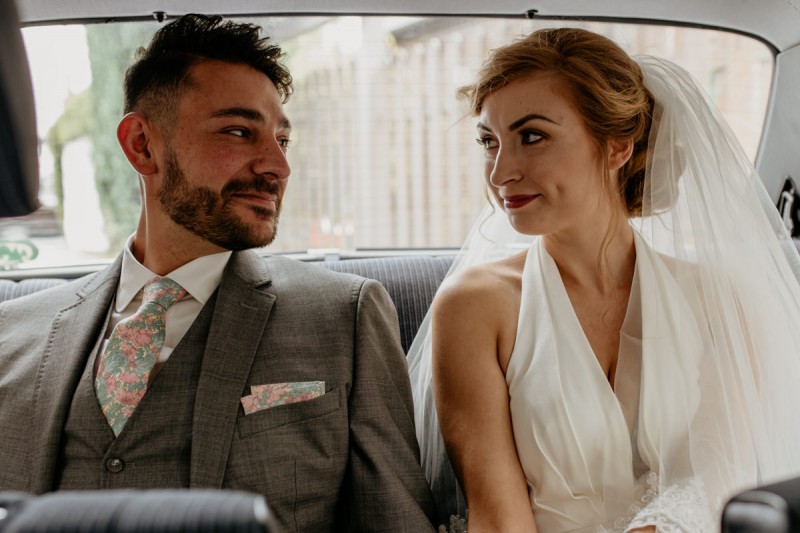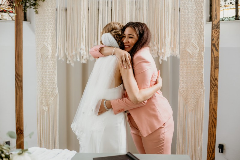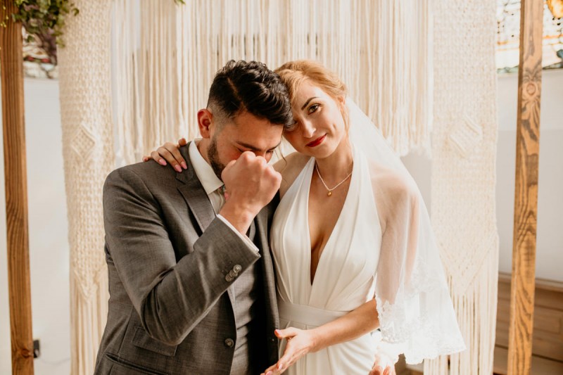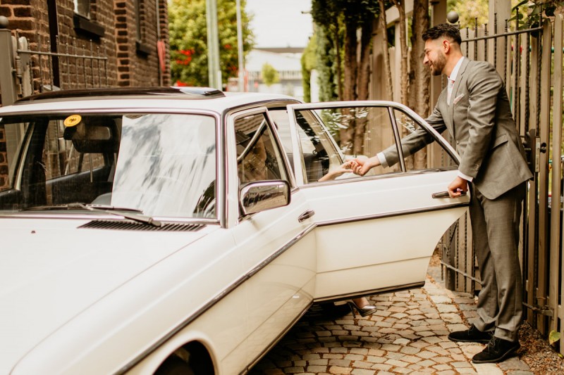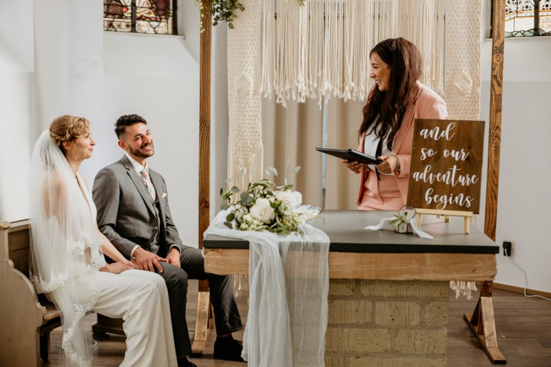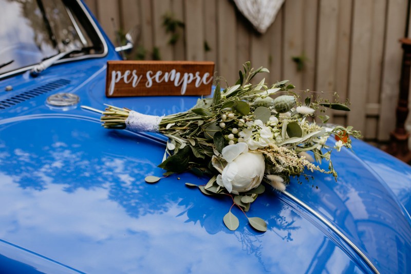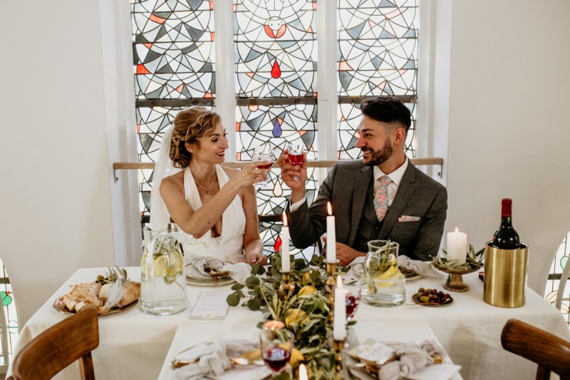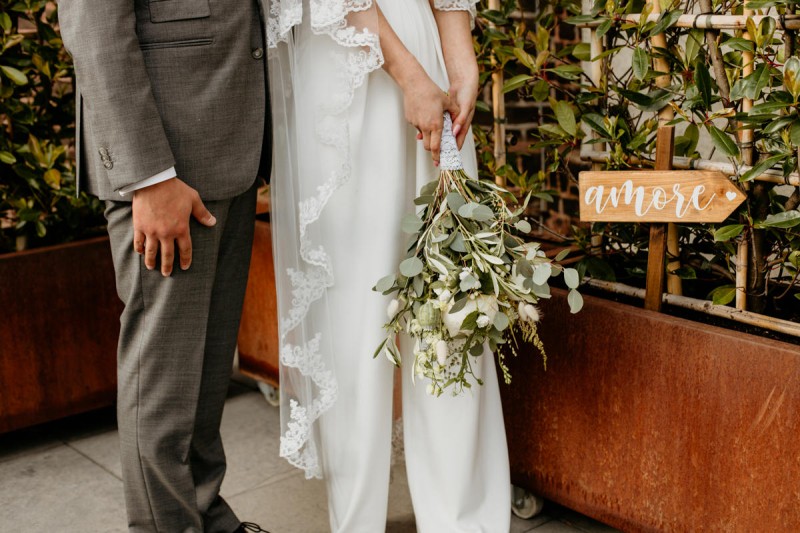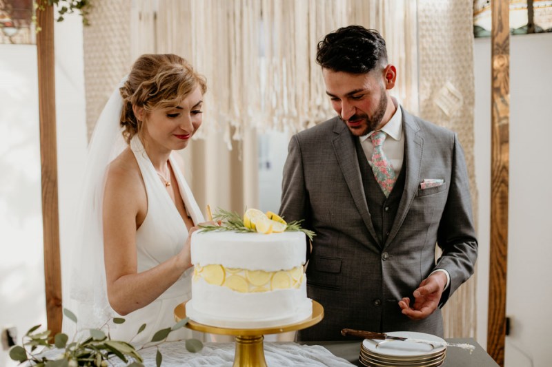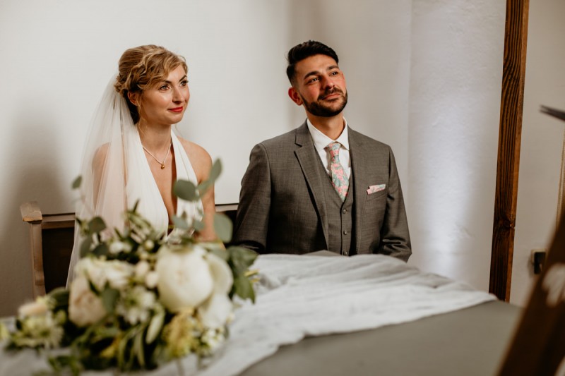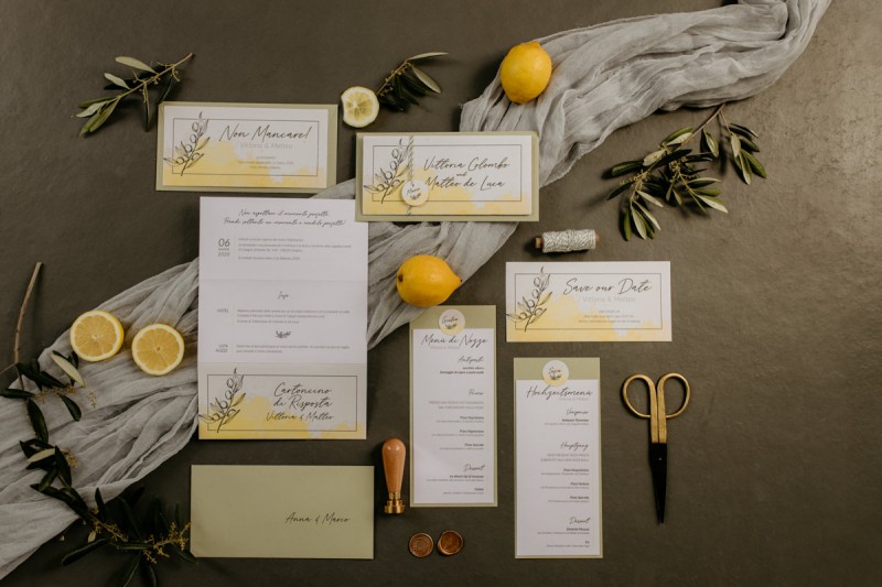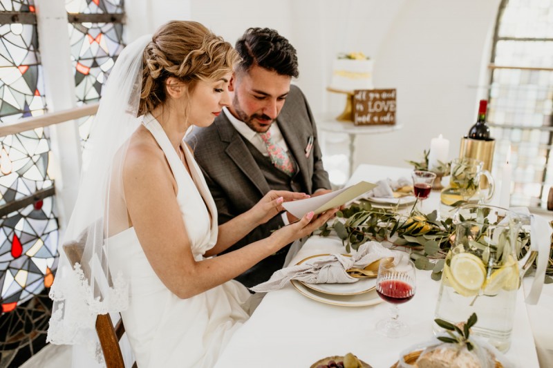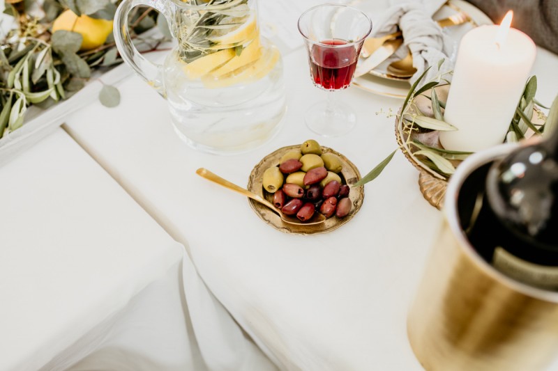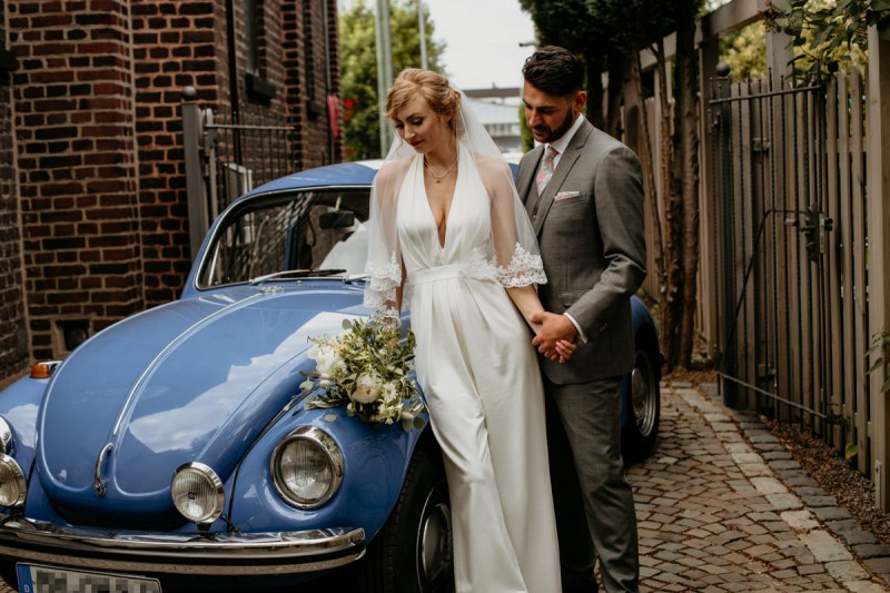 Die italienische Amalfiküste. Das rauschende Meer, silber-grüne Olivenbäume, sandig-steiniger Boden und duftende Zitronen. Ein Paradies in dem man bezaubernd heiraten kann. Passend zum Thema Corona muss man aber gar nicht nach Italien reisen um eine Hochzeit voller Italian Vibes zu feiern! Es reicht ein stimmiges Konzept, das alle Sinne anspricht, um sich die atemberaubende Destination Wedding nach Hause zu holen! Wie das aussehen kann, das könnt ihr in dieser feinen Inspiration einer italienischen Hochzeit für Zuhause entdecken! Hochzeitsfotografin Jana von JTS Fotografie hielt diese schöne Hochzeitsinspiration a la ‚A Destination Wedding needs no Destination‘, gemeinsam mit Herzrasenfilm, fotografisch für uns fest. Kreiert wurde sie im Herzen NRW‘s, in der Eventkapelle Köln. Hier wurde in den Farben Zitronengelb, luftigem Weiß und rustikalem Grün eine wahre Hommage an die Amalfiküste kreiert. Zitronen und Olivenzweige umspielen auf der langen Tafel das feine Geschirr mit goldenem Rand und das goldene Besteck von Tischleihendeckdich. Rustikale Züge erfährt das Setting durch die schönen Holzstühle von NIMMPLATZ und die beschrifteten Holzschilder von With Love by Tina. Eines dieser schönen Hochzeitschilder kündigt auch die Hochzeitstorte von Zuckersüß und Rosarot an. Ein Fault Line Cake mit Zitronendekoration und köstlicher Vanille-Zitronenfüllung. Ein wirklich besonderer Look, der durch die Kombination mit Rosmarinzweigen kaum lauter La Dolce Vita rufe könnte. Eine wunderschöne Vorschau auf all diese feinen Details liefert schon die liebevoll gestaltete Hochzeitspapeterie von Lieblingsschnipsel, die den Gästen offensichtlich nicht zu viel versprach. Natürlich gab es auch bei dieser Inspiration ein bezauberndes Brautpaar, das diese schönen Details genießen durfte. Und noch mehr! Mit einem feinen Traubogen, ebenfalls von NIMMPLATZ, der mit Blumen und einem Makramee dekoriert wurde, wurde in der schönen Kapelle eine Freie Trauung von Ein Nenner: Liebe gehalten. Das Brautpaar Anna & Hassan kam zu dieser in einem coolen Oldtimer angefahren. Anna trug einen modernen Jumpsuit und einen romantischen Schleier, denen das Secondhand Brautmodengeschäft Froschkönigin eine zweite Chance gab. Ein wirklich grandioser Twist aus Moderne und Tradition! Das Brautmakeup kreierte Nadine Lazreg passend zu einer italienischen Hochzeit im dramatischen Look. Das hochgesteckte Haar war sowohl elegant, als auch perfekt gewählt für den doppelreihigen Schleier. Ihr Brautstrauß von Stielecht Floristik, die im Übrigen die gesamte Floristik dieser Inspiration kreierten, ist dagegen etwas zurückhaltender und romantischer. Er hält neben zartem Grün auch weiße Pfingstrosen bereit. Ihr gutaussehender Bräutigam trug einen grauen Anzug mit floralen Akzenten in der Krawatte und seinem Einstecktuch von Herrenbude. So feierten sie diese besondere Hochzeit und ihre freie Trauung im italienischen Stil. Bevor ich euch jetzt zum Genießen der Bilder entlasse gibt es noch eine Besonderheit, die mich total fasziniert. Die Goldwerkstatt entwarf für diese Inspiration, neben der zarten Halskette der Braut, die hübschen Eheringe, die in der feinen Ringbox von Tischleihendeckdich zu finden sind. Sie haben sowohl eine matte Seite als auch eine glänzende Seite, zwischen denen man Tag für Tag auf’s Neue wählen kann. Was für eine coole Idee! So und nun seid ihr alle herzlich eingeladen all diese Details selbst zu entdecken und euch auf eine ausgelassene Hochzeit an der Amalfiküste zu träumen!