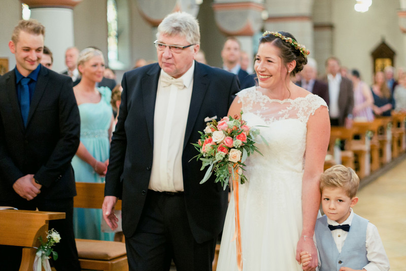 Am 26. Juli 2017 gaben sich Pia & Matthias bei einer kirchlichen Trauung in der Katholischen Pfarrkirche Maria Magdalena, das Ja-Wort. Umgeben von all ihren Freunden und der ganzen Familie, die alle an diesem besonderen Tag mitwirkten, feierten sie eine wunderschöne Sommerhochzeit. So ist die grandiose Dekoration, natürlich & leicht mit Kupferelementen, eine wirklich tolle DIY-Hochzeitsinspiration! Oder um es mit den Worten der Braut zu sagen: „Es war einfach wunderschön. Wenn ich zurück denke, bin ich unseren beiden Familien und Trauzeuginnen unendlich dankbar. Sie haben uns so sehr unterstützt und alles umgesetzt, was wir uns in den Kopf gesetzt haben. Die ganze Dekoration war selbst gemacht und hätte ohne ihre Hilfe nicht geklappt.” Fotografiert hat diesen emotionalen Tag die liebe Julia von Julia Walter Fotografie. Das bezaubernde Brautkleid ist ein Kleid von Justin Alexanderaus der Linie Sweetheart. Das hübsche Hair & Makeup der Braut zauberte Laura Böhnlein von DieTolle, welches perfekt ergänzt wird durch die Flowercrown und den Brautstrauß von Pusteblume. Der Bräutigam trägt einen Anzug von Bernd Puderbach mit den perfekten Accessoires von Der feine Herr. In der Hochzeitlocation, dem Bürgerhaus Mörsbach, sorgte die Metzgerei Schmidt für das Wohl des Brautpaares und ihrer Gäste. Und zu guter Letzt, das Hochzeitsauto, welches auch eine tolle Fotolocation für das Brautshooting ist, hat das Brautpaar bei der Oldtimervermietung Westerwald gemietet. Jetzt wünsche ich euch ganz viel Freude bei dieser wunderschönen Sommerhochzeit!