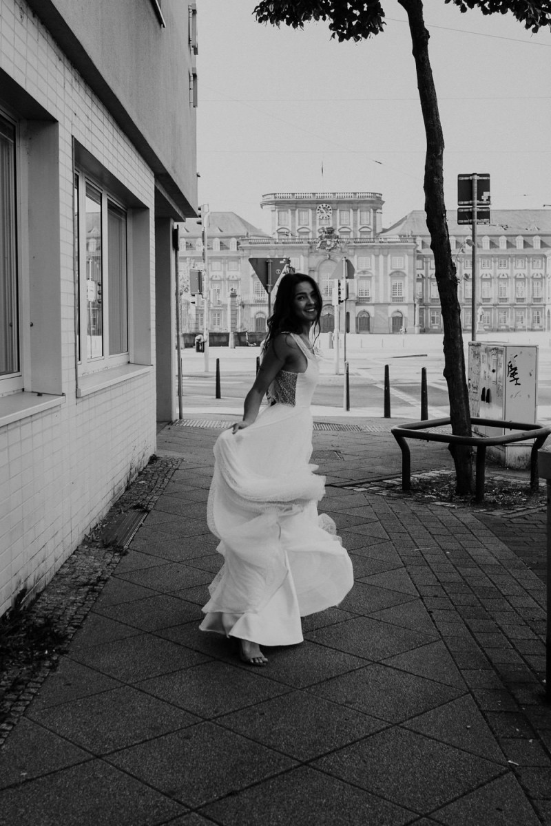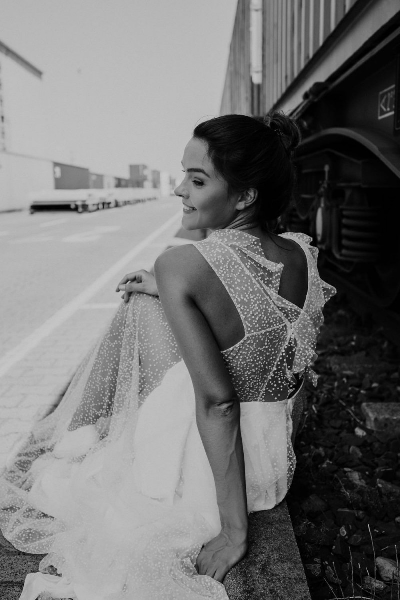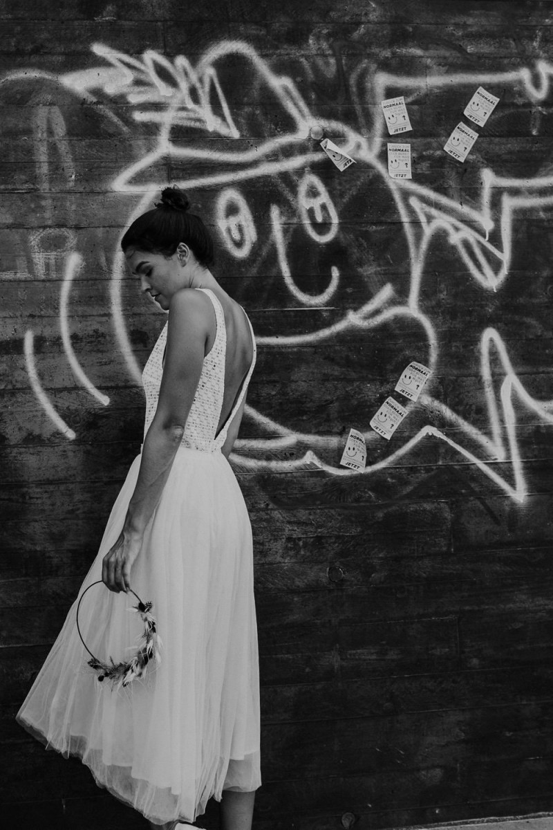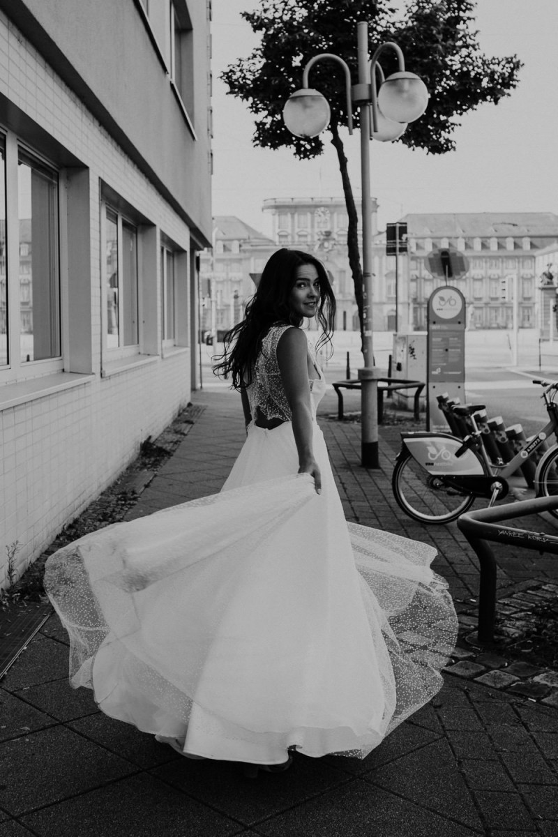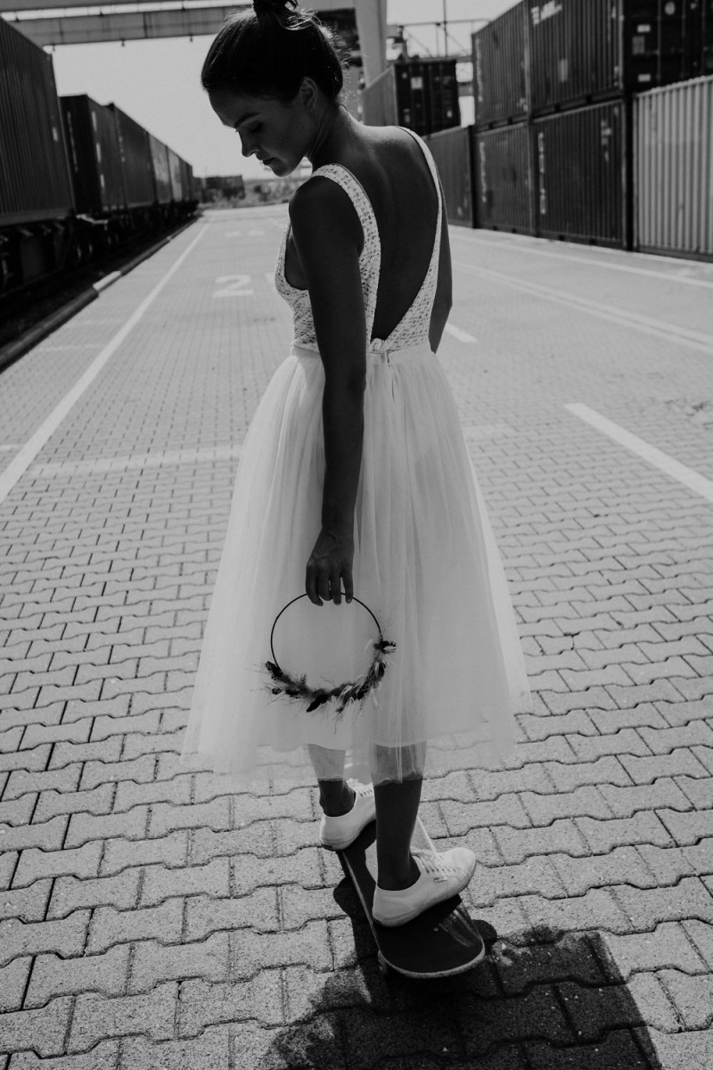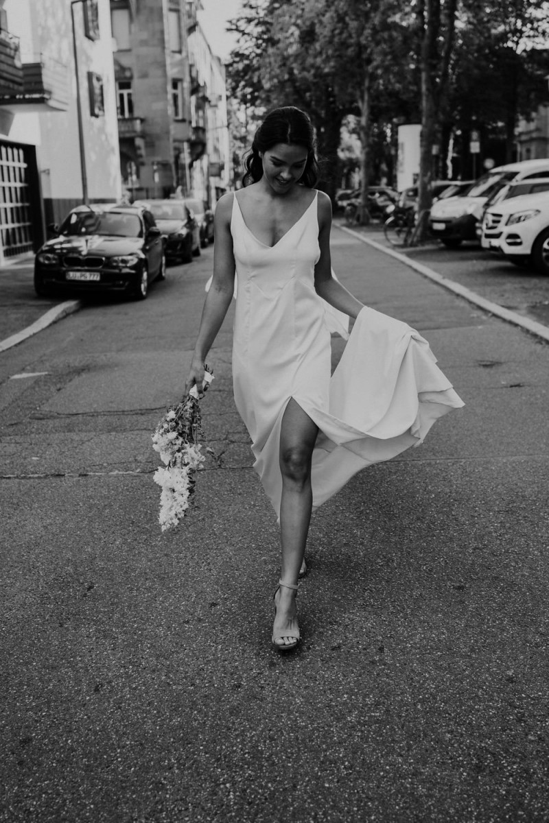 Diese Hochzeitsinspiration ist etwas sehr besonderes. Sie ist die erste Inspiration auf dem Blog, die ausschließlich schwarz-weiß Fotografien enthält. Wie grandios euch dieses Special dennoch für eure Hochzeit inspirieren kann, seht ihr in diesem wundervollen Bridal Editorial im modernen Stil. Fotografiert von Hochzeitsfotografin ThuTrinh Photography , die von Cornelia Kindsvater fotografisch unterstützt wurde, erwarten euch gleich mehrere bezaubernde Brautlooks und Brautkleider. In den modernen Designs von Sandra Nymphius schlendert unsere coole Braut selbstbewusst und unaufhaltsam durch die Straßen von Mannheim. Sie ist vollkommen im Moment und voller Lebensfreude. Ob als tänzelnde Ballerina oder auf dem Skateboard mit ihren Chucks. Dabei trägt sie lange als auch kurze Brautkleider, sehr klare und gerade, als auch verspielte und blumige Designs von Sandra Nymphius. Immer mit dem Anspruch, der modernen Braut eine authentische und selbstsichere Stimme zu verleihen. Dank Hair & Makeup Artist Melanie Beauty gibt es dazu mehrere tolle Brautfrisuren. Und dank der lieben Vanessa von Blütenzauber fehlt auch die Inspiration für wundervolle Brautsträuße nicht. Dass gerade das Spiel von Licht und Schatten, die Inszenierung kleinster Details und die berührenden schwarz-weiß Fotografien dieser Inspiration so viel Leidenschaft und Inspirationsgehalt schenken, könnt ihr jetzt selbst entdecken. Ganz viel Freude euch mit diesem modernen, ausdrucksstarken und gefühlvollen Bridal Editorial!