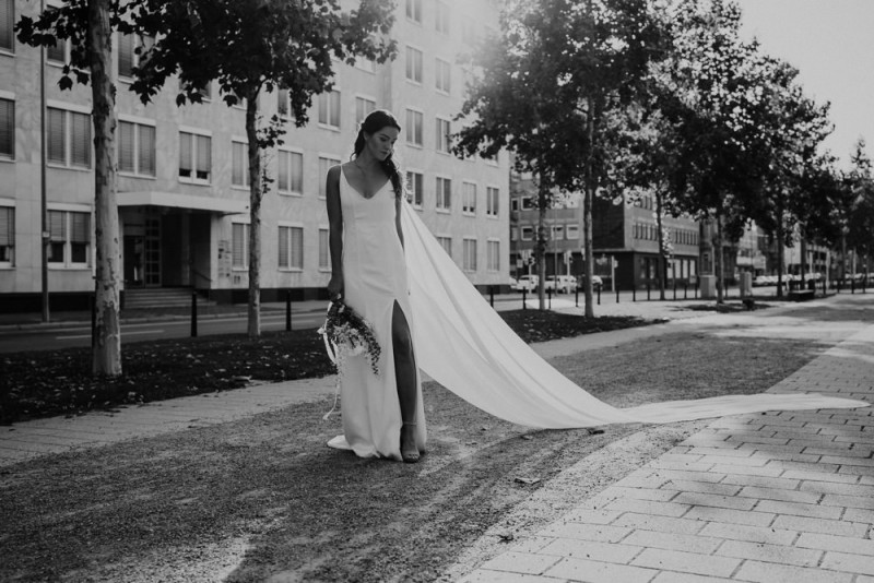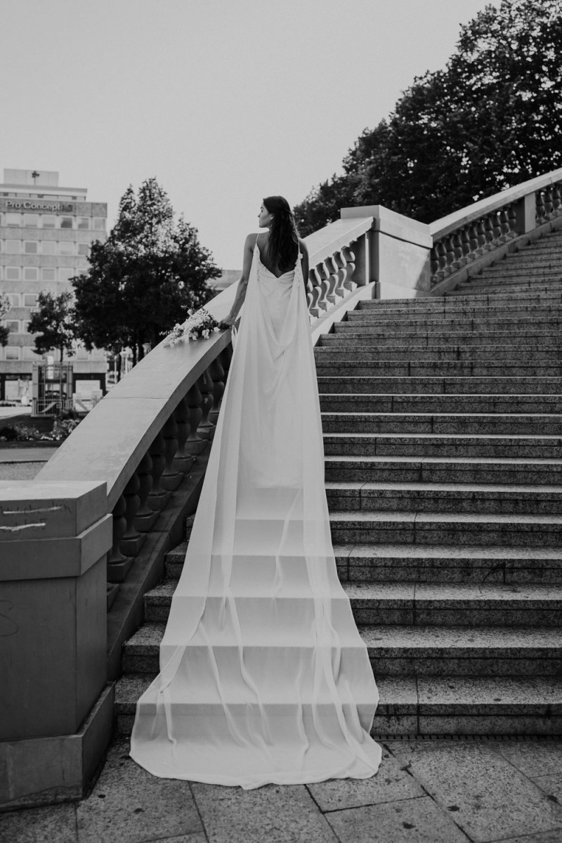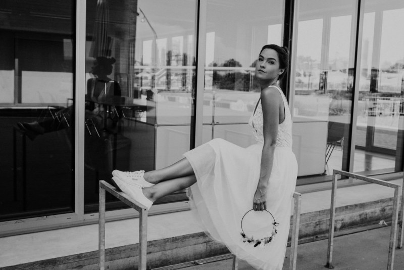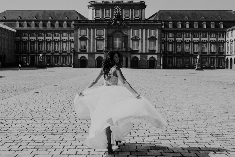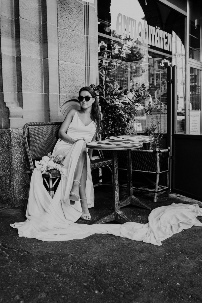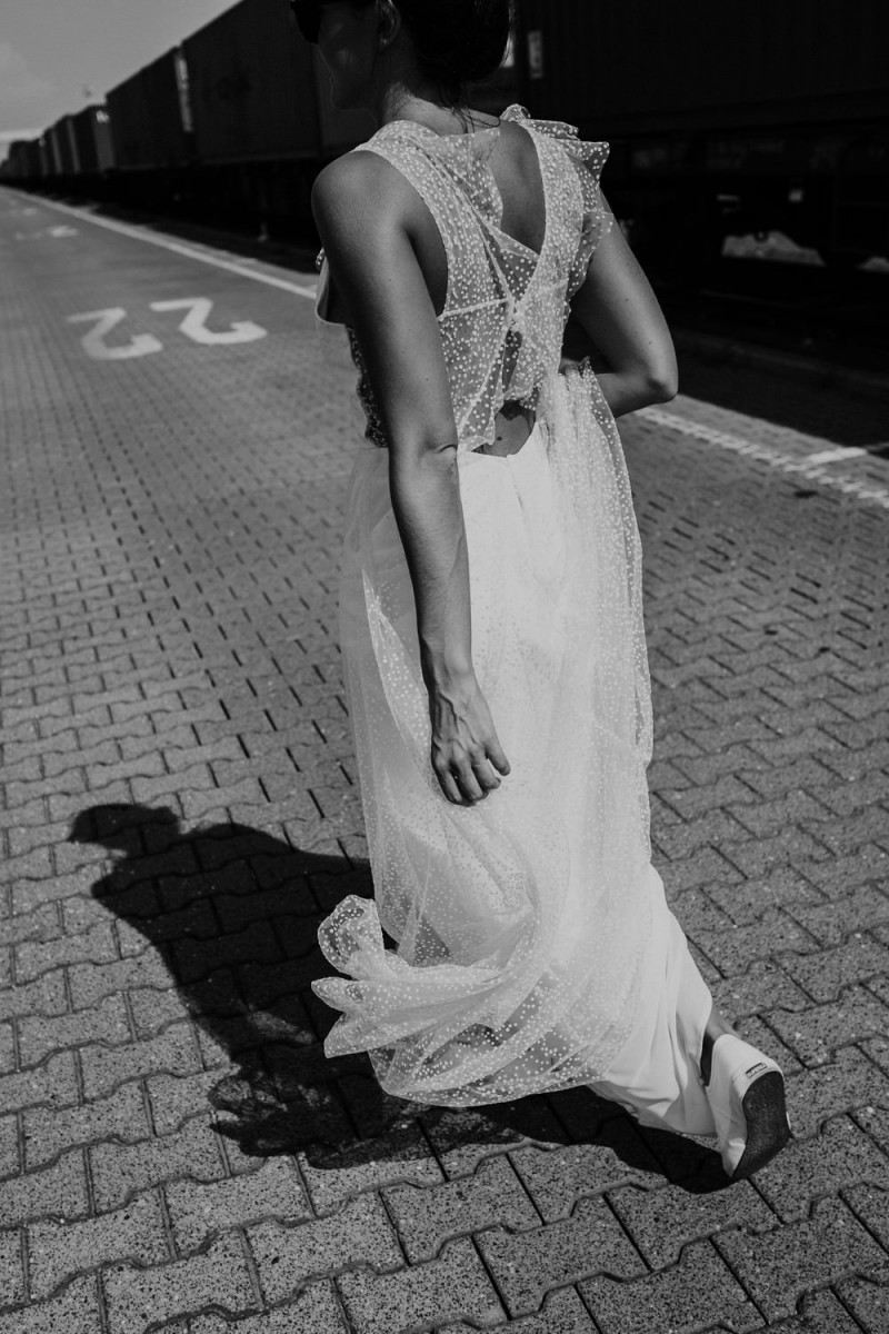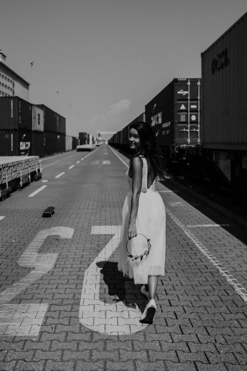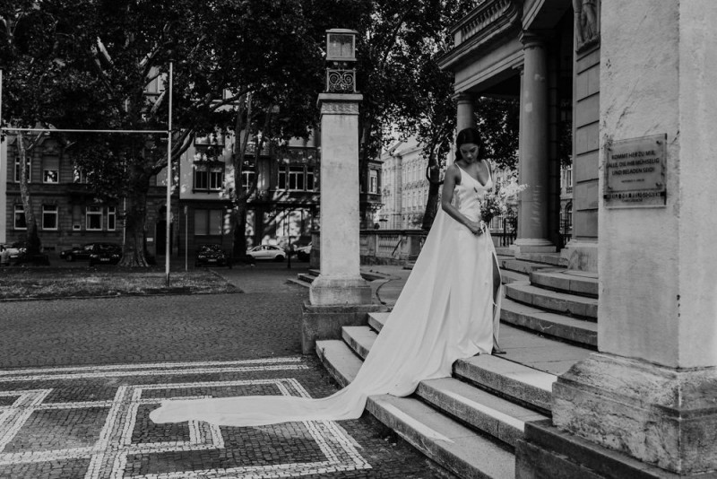 Diese Hochzeitsinspiration ist etwas sehr besonderes. Sie ist die erste Inspiration auf dem Blog, die ausschließlich schwarz-weiß Fotografien enthält. Wie grandios euch dieses Special dennoch für eure Hochzeit inspirieren kann, seht ihr in diesem wundervollen Bridal Editorial im modernen Stil. Fotografiert von Hochzeitsfotografin ThuTrinh Photography , die von Cornelia Kindsvater fotografisch unterstützt wurde, erwarten euch gleich mehrere bezaubernde Brautlooks und Brautkleider. In den modernen Designs von Sandra Nymphius schlendert unsere coole Braut selbstbewusst und unaufhaltsam durch die Straßen von Mannheim. Sie ist vollkommen im Moment und voller Lebensfreude. Ob als tänzelnde Ballerina oder auf dem Skateboard mit ihren Chucks. Dabei trägt sie lange als auch kurze Brautkleider, sehr klare und gerade, als auch verspielte und blumige Designs von Sandra Nymphius. Immer mit dem Anspruch, der modernen Braut eine authentische und selbstsichere Stimme zu verleihen. Dank Hair & Makeup Artist Melanie Beauty gibt es dazu mehrere tolle Brautfrisuren. Und dank der lieben Vanessa von Blütenzauber fehlt auch die Inspiration für wundervolle Brautsträuße nicht. Dass gerade das Spiel von Licht und Schatten, die Inszenierung kleinster Details und die berührenden schwarz-weiß Fotografien dieser Inspiration so viel Leidenschaft und Inspirationsgehalt schenken, könnt ihr jetzt selbst entdecken. Ganz viel Freude euch mit diesem modernen, ausdrucksstarken und gefühlvollen Bridal Editorial!