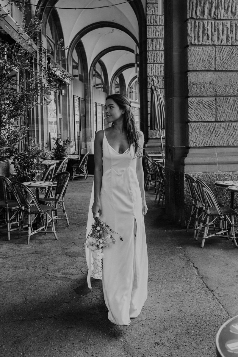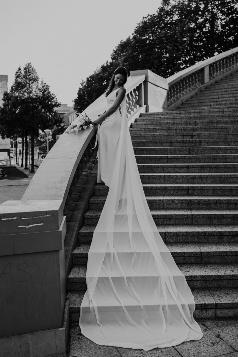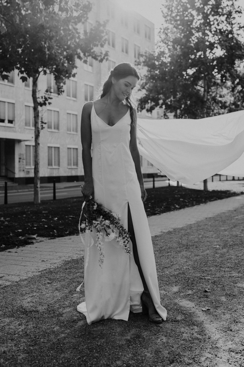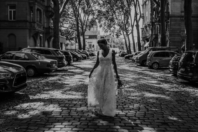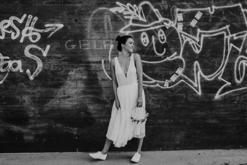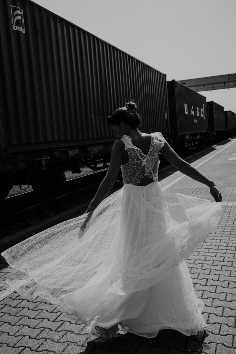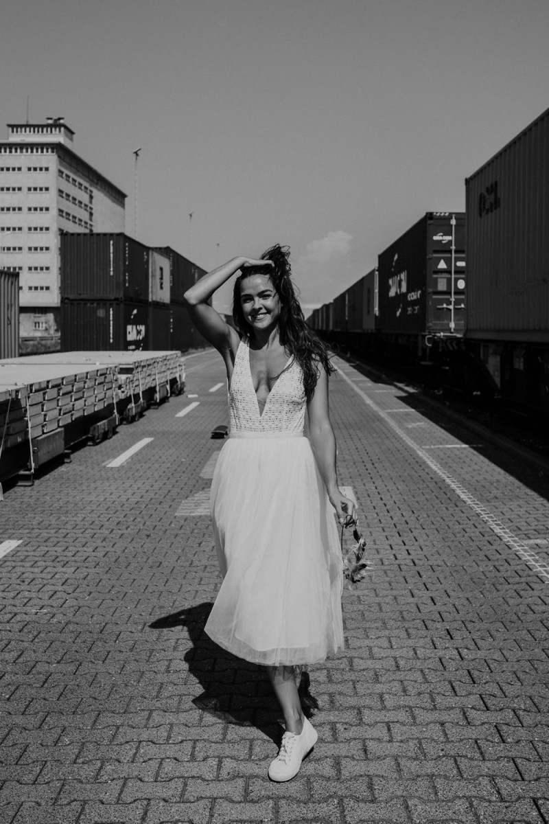 Diese Hochzeitsinspiration ist etwas sehr besonderes. Sie ist die erste Inspiration auf dem Blog, die ausschließlich schwarz-weiß Fotografien enthält. Wie grandios euch dieses Special dennoch für eure Hochzeit inspirieren kann, seht ihr in diesem wundervollen Bridal Editorial im modernen Stil. Fotografiert von Hochzeitsfotografin ThuTrinh Photography , die von Cornelia Kindsvater fotografisch unterstützt wurde, erwarten euch gleich mehrere bezaubernde Brautlooks und Brautkleider. In den modernen Designs von Sandra Nymphius schlendert unsere coole Braut selbstbewusst und unaufhaltsam durch die Straßen von Mannheim. Sie ist vollkommen im Moment und voller Lebensfreude. Ob als tänzelnde Ballerina oder auf dem Skateboard mit ihren Chucks. Dabei trägt sie lange als auch kurze Brautkleider, sehr klare und gerade, als auch verspielte und blumige Designs von Sandra Nymphius. Immer mit dem Anspruch, der modernen Braut eine authentische und selbstsichere Stimme zu verleihen. Dank Hair & Makeup Artist Melanie Beauty gibt es dazu mehrere tolle Brautfrisuren. Und dank der lieben Vanessa von Blütenzauber fehlt auch die Inspiration für wundervolle Brautsträuße nicht. Dass gerade das Spiel von Licht und Schatten, die Inszenierung kleinster Details und die berührenden schwarz-weiß Fotografien dieser Inspiration so viel Leidenschaft und Inspirationsgehalt schenken, könnt ihr jetzt selbst entdecken. Ganz viel Freude euch mit diesem modernen, ausdrucksstarken und gefühlvollen Bridal Editorial!