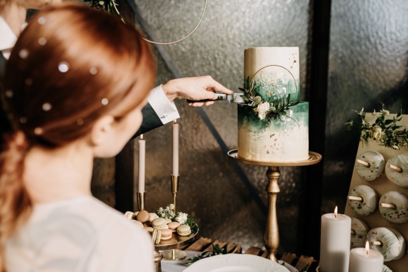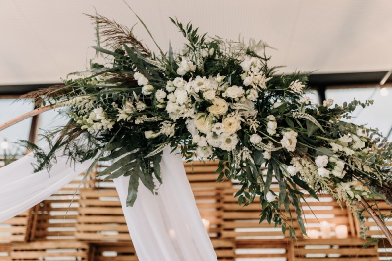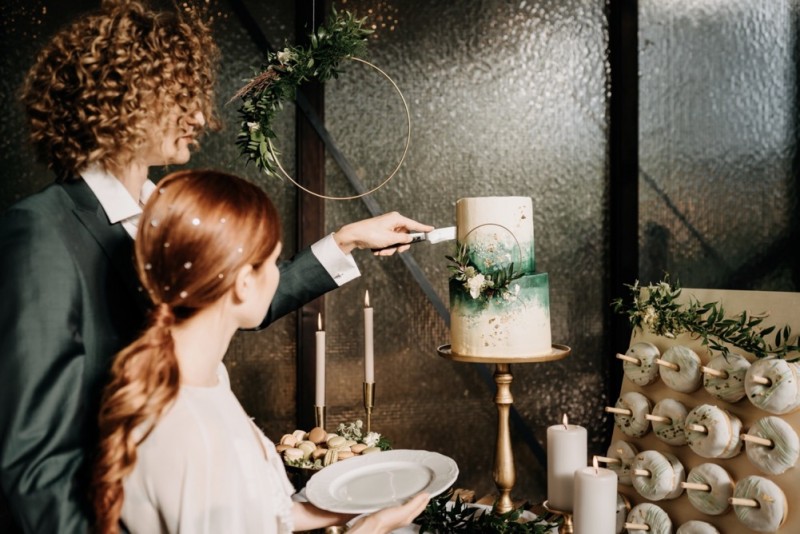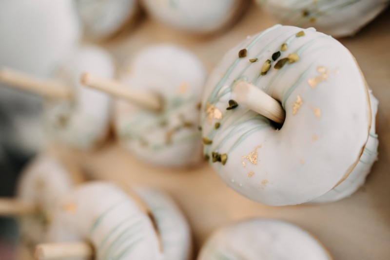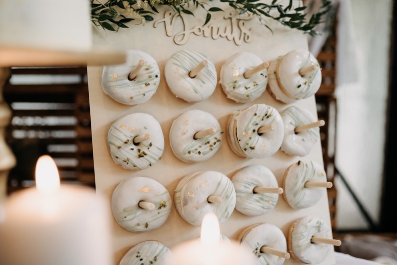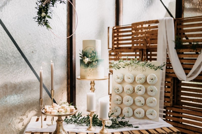 Dieses schöne und fließenden Konzept wurde auch beim opulenten Sweet Table perfekt umgesetzt! Unter weiteren Blumenringen findet sich hier, dank Sanelas Tortenwelt, eine grandiose Hochzeitstorte, die in weißen und grünen Farbverläufen, einem seitlichen Blumenring und ganz feinen Golddetails in der besonderen Struktur aufwartet. Zudem finden sich köstliche Macarons auf einem goldenen Tablett, sowie eine Donut Wall dessen saftige Donuts mit einem weiß-grünem Zuckerguss begeistern. Und auch hier umspielen viele kleine Blumenarrangements die Sweets des Sweet Tables.