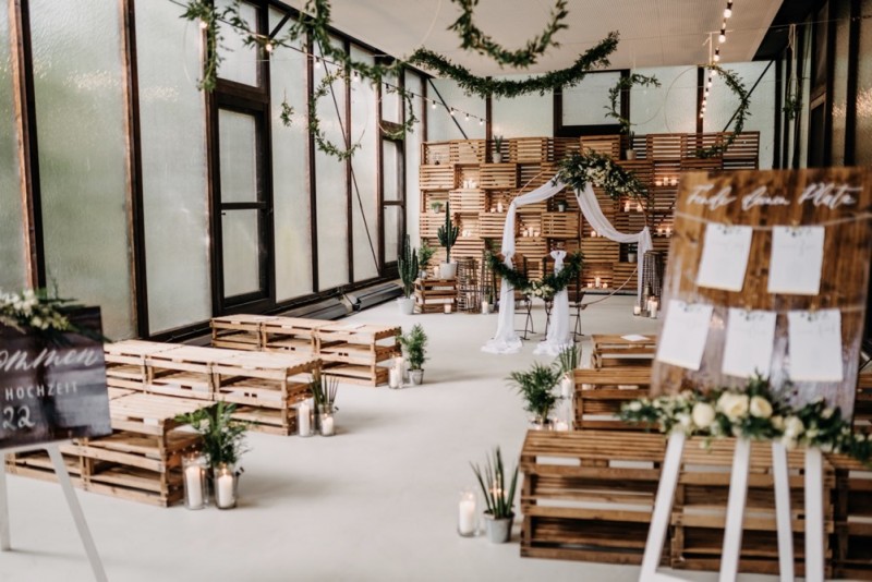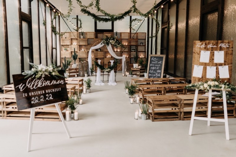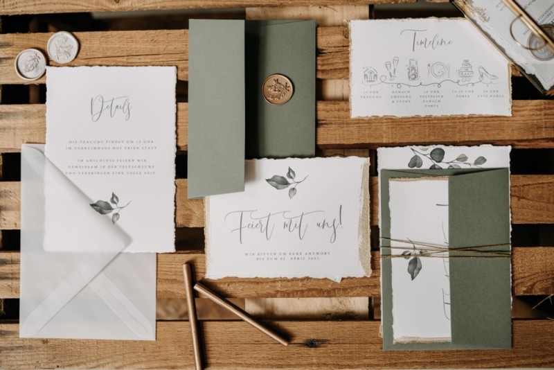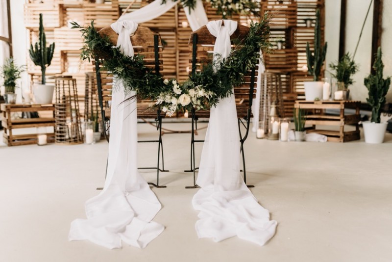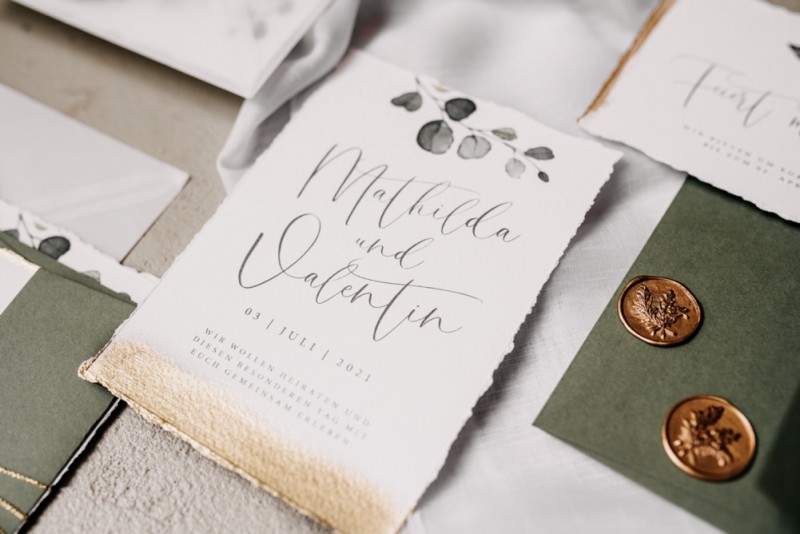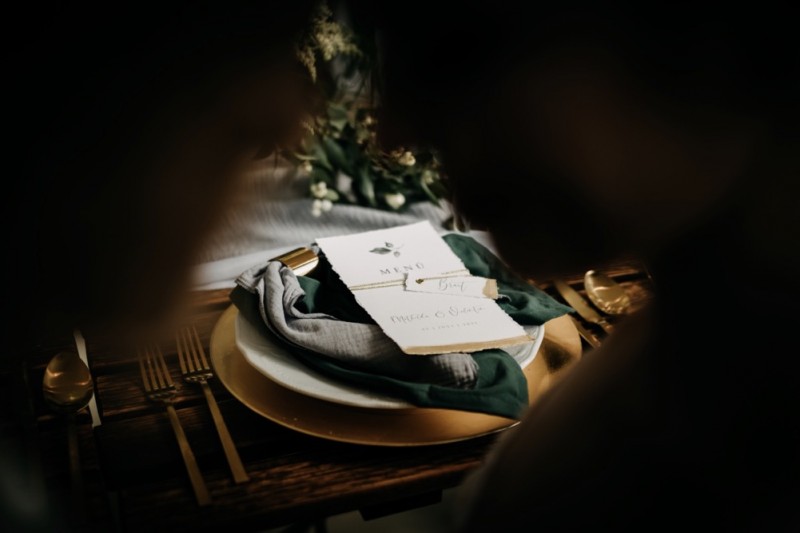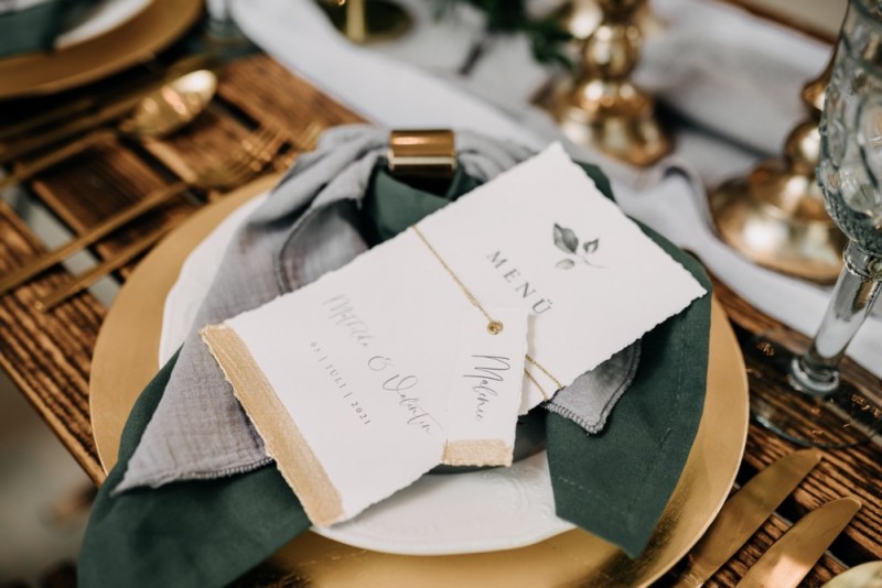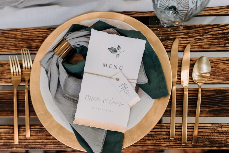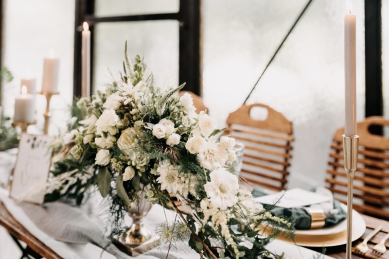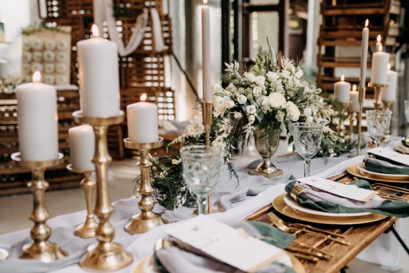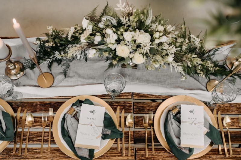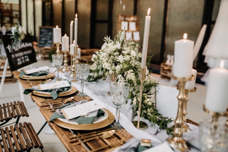 Christmas is coming! Gut, vielen fällt es verständlicher Weise in diesem Jahr etwas schwerer in Weihnachtstimmung zu kommen. Zumindest für die Winterstimmung dürfte diese wunderschöne Hochzeitsinspiration sorgen! Euch erwartet heute eine bezaubernde Inspiration für Winterhochzeiten in den schönen Farben Weiß, Gold und Grün. Fotografiert von Hochzeitsfotografin Lia Falke, geht es in der Hochzeitslocation, dem schönen Hof Frien, mit ganz viel warmem Holz los. Egal ob Tisch, Stühle, Sitzplan oder Sitzbänke, das herrlich dunkle Holz der Möbel erwärmt den gesamten Raum. Und in diesem Raum findet auch alles statt! Das Setting dieser Winterhochzeit vereint die große Tafel für das Hochzeitsessen, die freie Trauung mit Traubogen und Sitzbänken, sowie den opulenten Sweet Table, in einem einzigen großen Raum. Kristina von Hochzeitsglück gestaltete die Dekoration und Floristik dafür wie aus einem Guss. Goldene Akzente finden sich überall auf dem Tisch in Form von dicken und schmalen Kerzenständern, Vasen, Untertellern und Geschirr. Elegant und unglaublich harmonisch, da das Gold mit dem Holz der Möbel zu verschmelzen scheint. Goldene Rahmen für die Tischnummern und goldene Klammern für den Sitzplan halten die filigrane Hochzeitspapeterie von Papiervilla, die goldene als auch florale Akzente auf weißem sowie grünem Papier vereint. Der hier gewählte Eukalyptus findet sich am großen Willkommensschild, am Sitzplan und natürlich im großen Blumenbouquet auf dem Tisch wieder. Kombiniert wurden bei der gesamten Floristik ausschließlich grüne und weiße Blumen. Das Blumenbouquet des Tisches wurde auf einem grauen Stoff fließend als Centerpiece in Szene gesetzt und wirkt so aufregend aber auch einheitlich, durch die grauen Kerzen und die grauen Stoffservietten. Diese wurden wiederrum zu grünen Stoffservietten in einem goldenen Serviettenring vereint. Und so zieht sich diese wunderschöne Farb-, Material- und Blumenkombination durch den gesamten Raum. Von den schwebenden Blumenringen über dem Dinnersetting, über die Hochzeitspapeterie, bis hin zum ovalen Traubogen in Gold, der mit einer weißen Stoffbahn und blumengeschmückt vor den Holzbänken und den ebenfalls geschmückten Stühlen des Brautpaares brilliert. Und wo man auch hinsieht flackern unzählige Kerzen in Kerzenständern und Windlichtern. Eine harmonische, warme und kuschelige Stimmung für eine moderne Winterhochzeit an einem kühlen Wintertag.