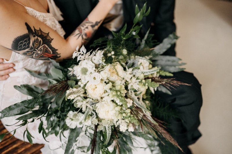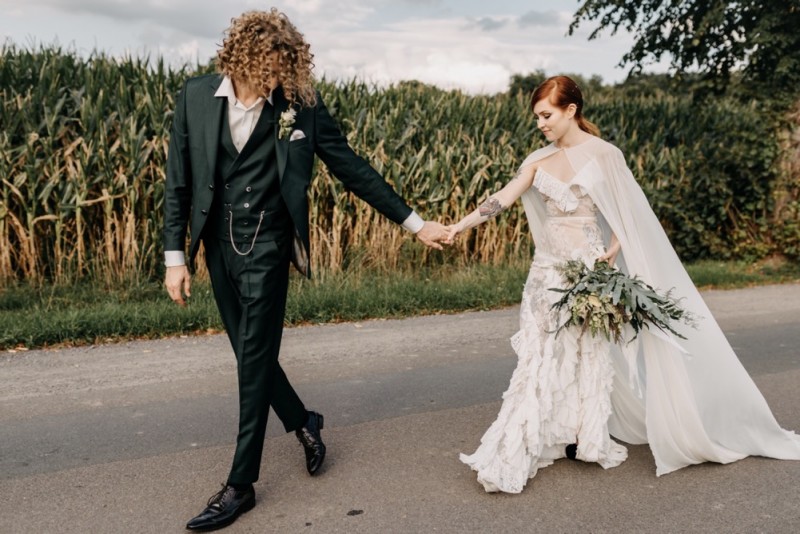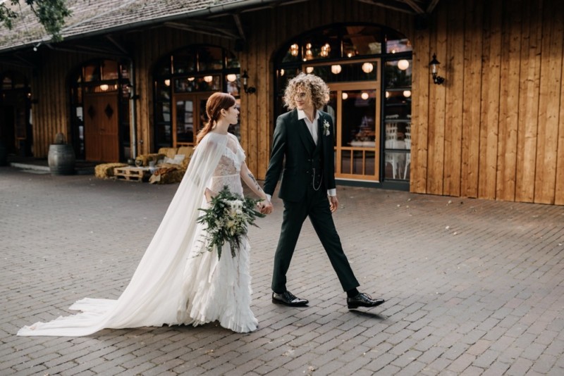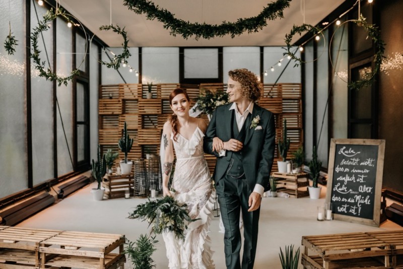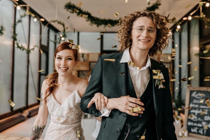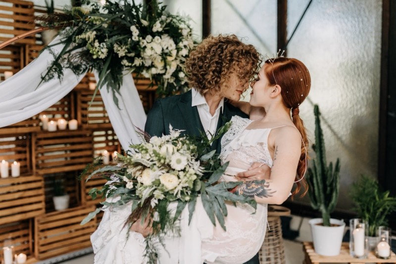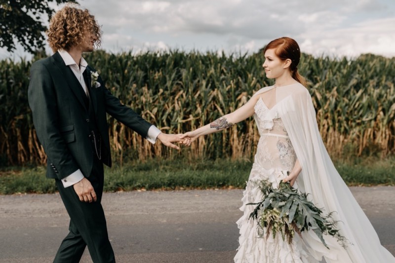 Das Brautpaar, das sich in diesem modernen Traum einer Winterhochzeit begeben durfte, heißt Marina & Basti. Marina trägt ein sehr heißes Brautkleid von Cosmopolka, das mit seiner transparenten Spitze, den feinen Spagetti-Trägern, dem zarten Volant über dem V-Ausschnitt und der langen Schleppe ein absoluter Hingucker ist! Nicht nur, weil es ihre tollen Tattoos zur Geltung bringt! Als passendes Accessoires trägt sie einen langen, semitransparenten Umhang, der ihrem Wow-Look das i-Tüpfelchen aufsetzt. Ihr kupferrotes Haar frisierte ihr Hair & Makeup Artist Sandra Priebe von Bride in Style zu einem tollen Zopf, dessen Längen eingedreht wurden. In ihrem Haar finden sich, perfekt für eine romantische Winterhochzeit, kleine Kristalle. Julia Rohlwing unterstütze Sandra beim Styling und kreierte das Makeup von Marina, passend zu ihrem verspielten und doch extravaganten Look, mit bronzefarbenen Smokey Eyes. Der Bräutigam wählte zu meiner großen Freude FARBE! Liebe Männer, traut euch! Es sieht so grandios aus! In einem dunkelgrünen Anzug, einem weißen Hemd mit offenem Kragen und einer doppelreihigen Weste vom Herrenausstatter LO&GO, ist Basti ebenfalls ein absoluter Hingucker! Die kleinen Details, wie das weiße Einstecktuch, die Ansteckblumen und die Taschenuhr runden den Look dabei perfekt ab.