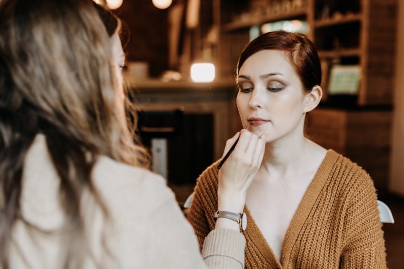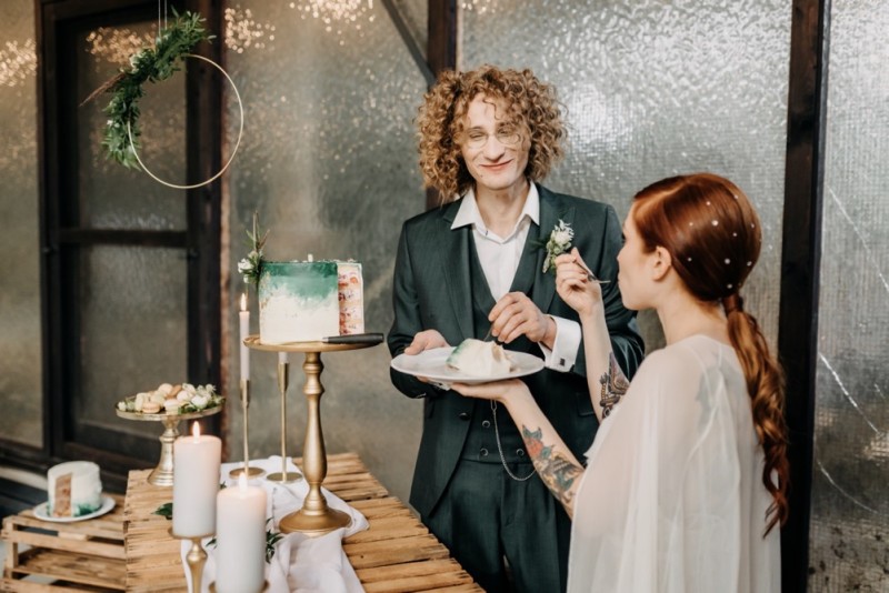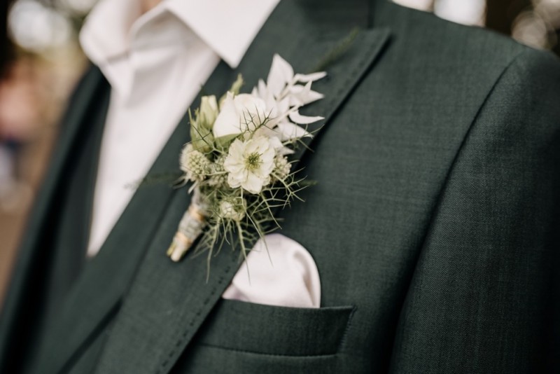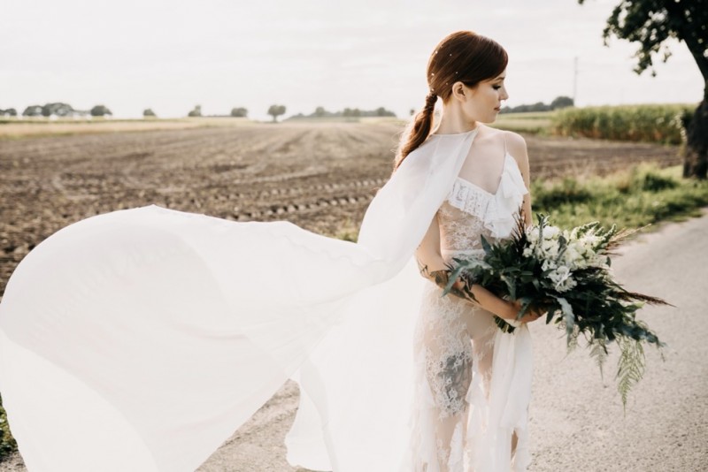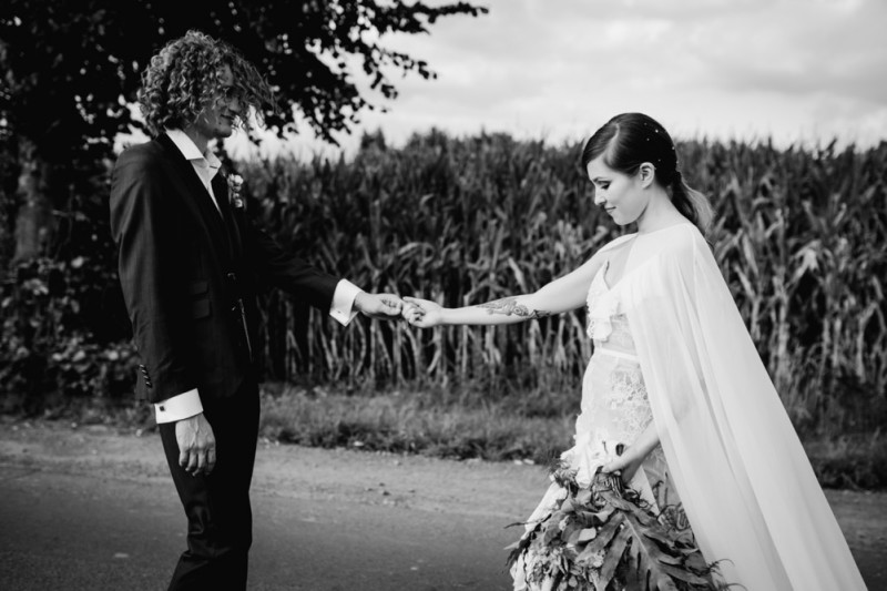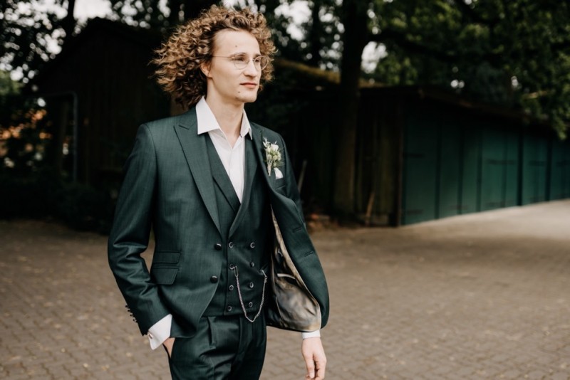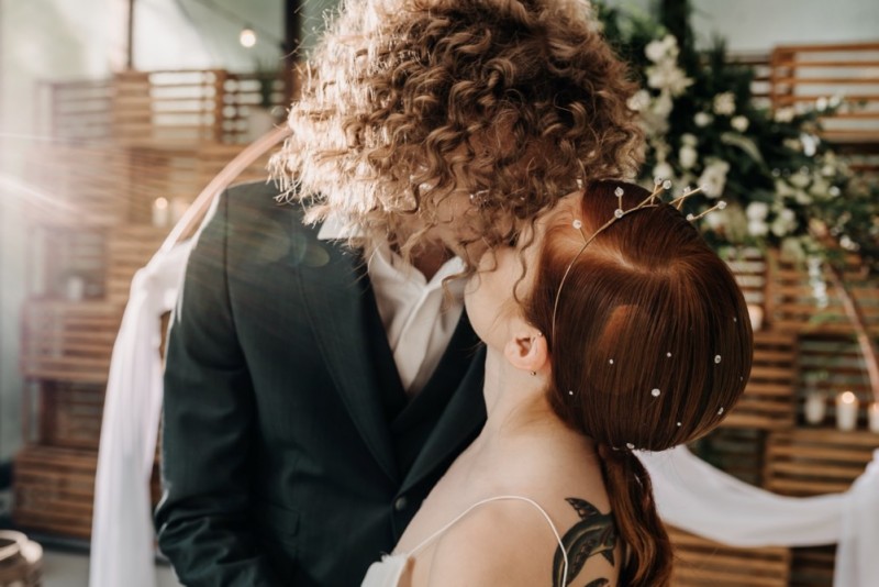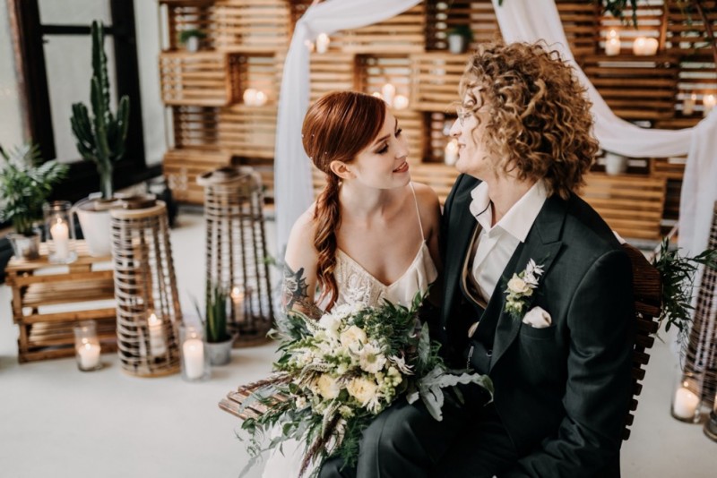 Das Brautpaar, das sich in diesem modernen Traum einer Winterhochzeit begeben durfte, heißt Marina & Basti. Marina trägt ein sehr heißes Brautkleid von Cosmopolka, das mit seiner transparenten Spitze, den feinen Spagetti-Trägern, dem zarten Volant über dem V-Ausschnitt und der langen Schleppe ein absoluter Hingucker ist! Nicht nur, weil es ihre tollen Tattoos zur Geltung bringt! Als passendes Accessoires trägt sie einen langen, semitransparenten Umhang, der ihrem Wow-Look das i-Tüpfelchen aufsetzt. Ihr kupferrotes Haar frisierte ihr Hair & Makeup Artist Sandra Priebe von Bride in Style zu einem tollen Zopf, dessen Längen eingedreht wurden. In ihrem Haar finden sich, perfekt für eine romantische Winterhochzeit, kleine Kristalle. Julia Rohlwing unterstütze Sandra beim Styling und kreierte das Makeup von Marina, passend zu ihrem verspielten und doch extravaganten Look, mit bronzefarbenen Smokey Eyes. Der Bräutigam wählte zu meiner großen Freude FARBE! Liebe Männer, traut euch! Es sieht so grandios aus! In einem dunkelgrünen Anzug, einem weißen Hemd mit offenem Kragen und einer doppelreihigen Weste vom Herrenausstatter LO&GO, ist Basti ebenfalls ein absoluter Hingucker! Die kleinen Details, wie das weiße Einstecktuch, die Ansteckblumen und die Taschenuhr runden den Look dabei perfekt ab.