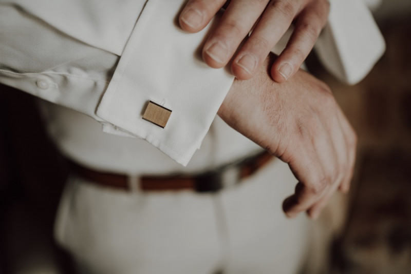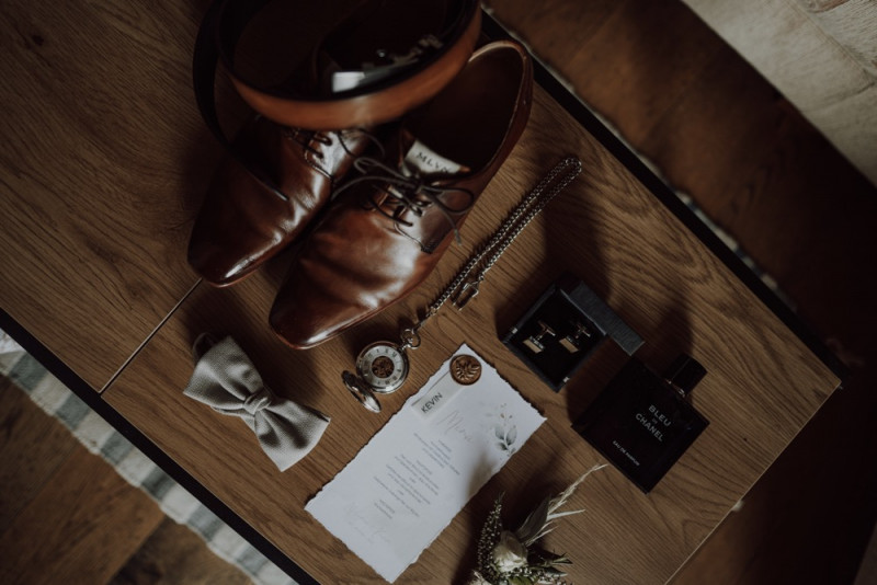 Der Hochzeitsmorgen begann wie er im Buche steht. Begleitet von den Hochzeitsfotografen von The CLICK. Wedding, startete das Brautpaar mit dem getrennten Getting Ready. Die Jungs machten sich gemeinsam, ganz entspannt bei einem kühlen Bier, im „Sauna-Zimmer“ des Hofs fertig. Kevin zog seinen schicken Hochzeitsanzug in Grau-Beige von René Schielin, samt passender Weste und Fliege, an. Braune Lederaccessoires, wie Gürtel und Schuhe, sowie Manschettenknöpfe im Holzdesign rundeten seinen eleganten aber natürlichen Bräutigam-Look perfekt ab, den on Top eine Boutonniere aus einer weißen Rose und Eukalyptus zierte.