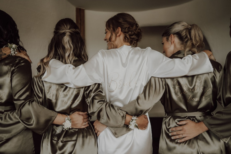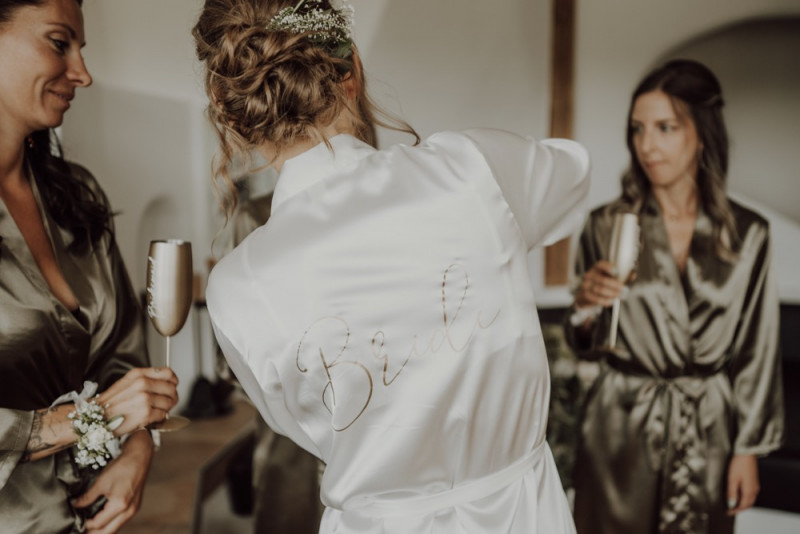 Zur gleichen Zeit lag für Melanie alles in der Hochzeitssuite bereit. Bei prickelndem Sekt aus personalisierten Sektflöten und in extra geplottete Morgenmäntel in Weiß und Olivegrün gehüllt, zelebrierte sie diesen einmaligen Morgen mit ihren Mädels, bevor sie in ihr atemberaubendes Hochzeitskleid der Marke Evie Young Bridal vom Brautatelier Ried schlüpfte, das zart fließend, mit dünnen Trägern, hochwertigen floralen Applikationen und langer Schleppe, ihre bezaubernde Silhouette umspielte. Metallic-goldene Sandaletten von Gucci  als Brautschuhe, eine beschriftete Jeans Jacke aus dem Shop vom GLOW Studio, ein üppiger Brautstrauß voller weißer Rosen und frischem Grün machten ihren wundervollen Brautlook zum absoluten Hingucker. Abgerundet durch ein sommerlich leichtes Hair & Makeup von Pilz und Pilz Frisöre Ried, einen langen Schleier in der lockeren Hochsteckfrisur und die wunderbare Begleitung ihrer bezaubernden Brautjungfern in grünen Brautjungfernkleidern der Marke Mimetik bcn, konnte der große Tag beginnen.
